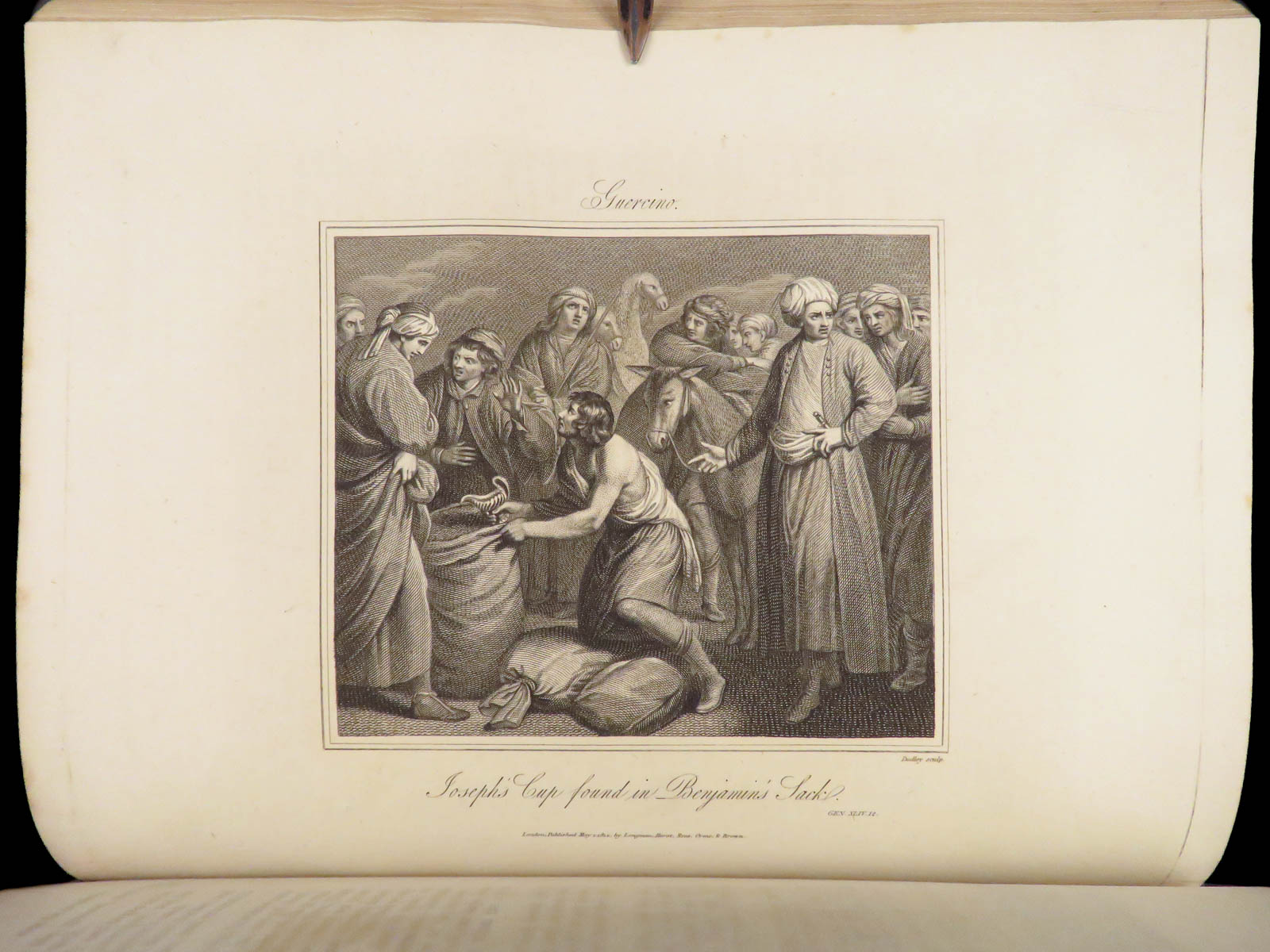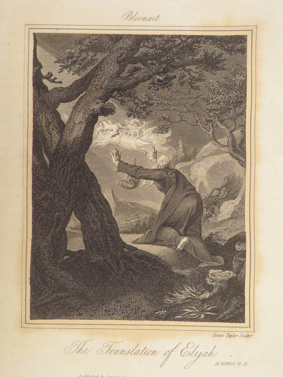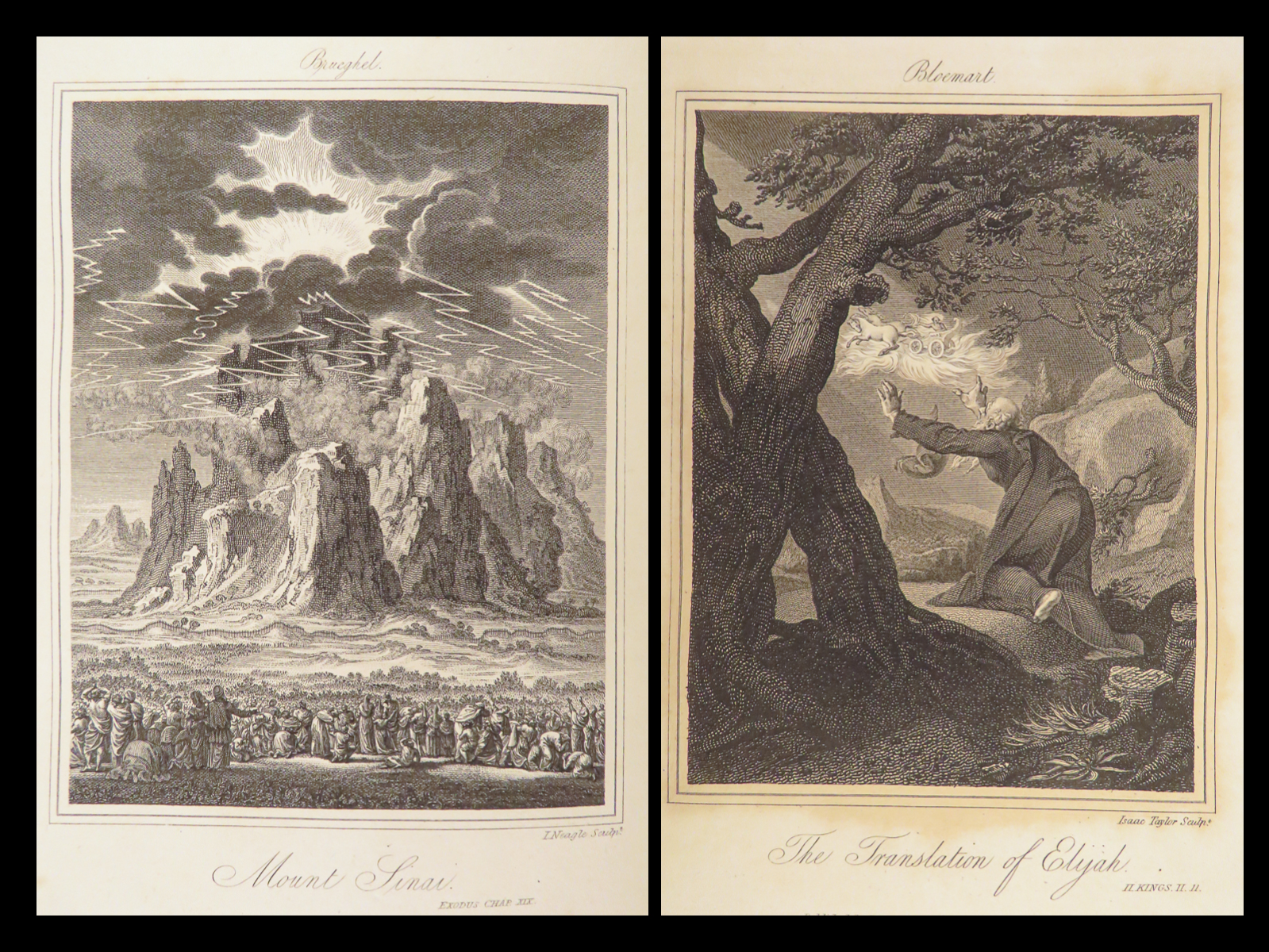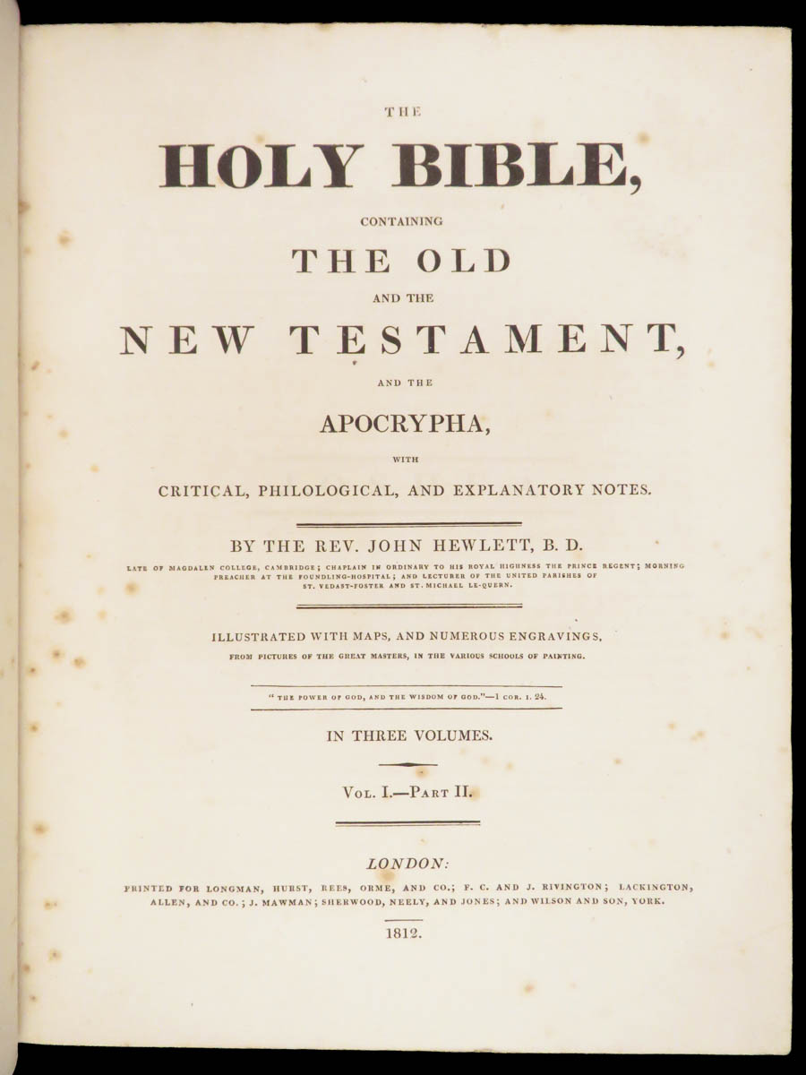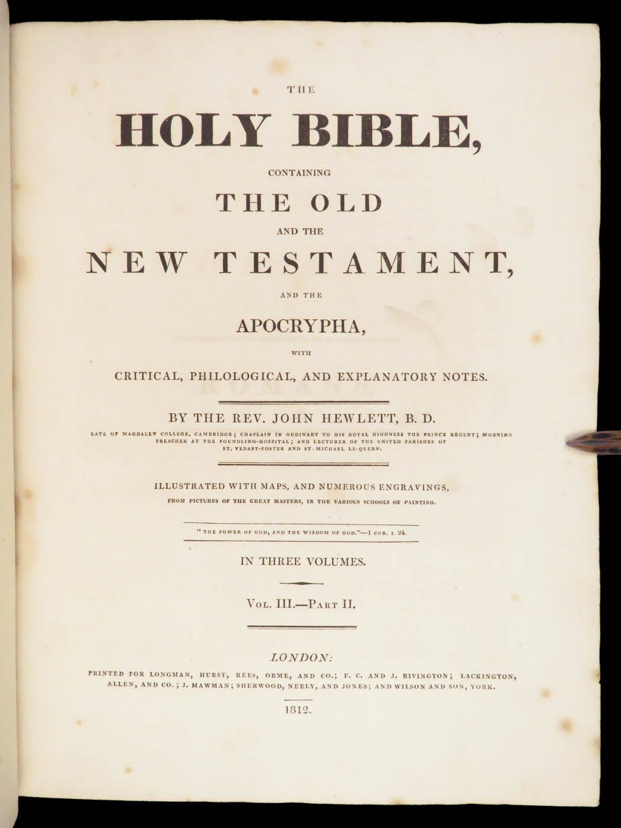The Holy Bible, containing the Old and the New Testament, and Apocrypha was published in London in 1812 in six huge volumes. Each volume features extensive notes and commentary by Hewlett, a known biblical editor of the early 19th century. The set includes 120 engraved plates, integrated across the biblical text and apocryphal books.