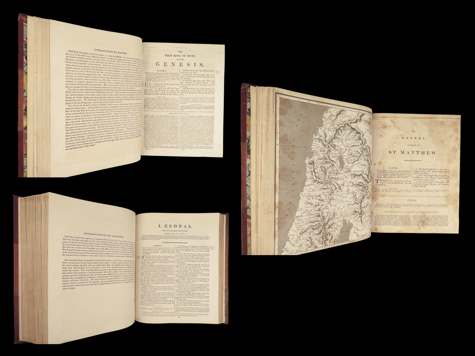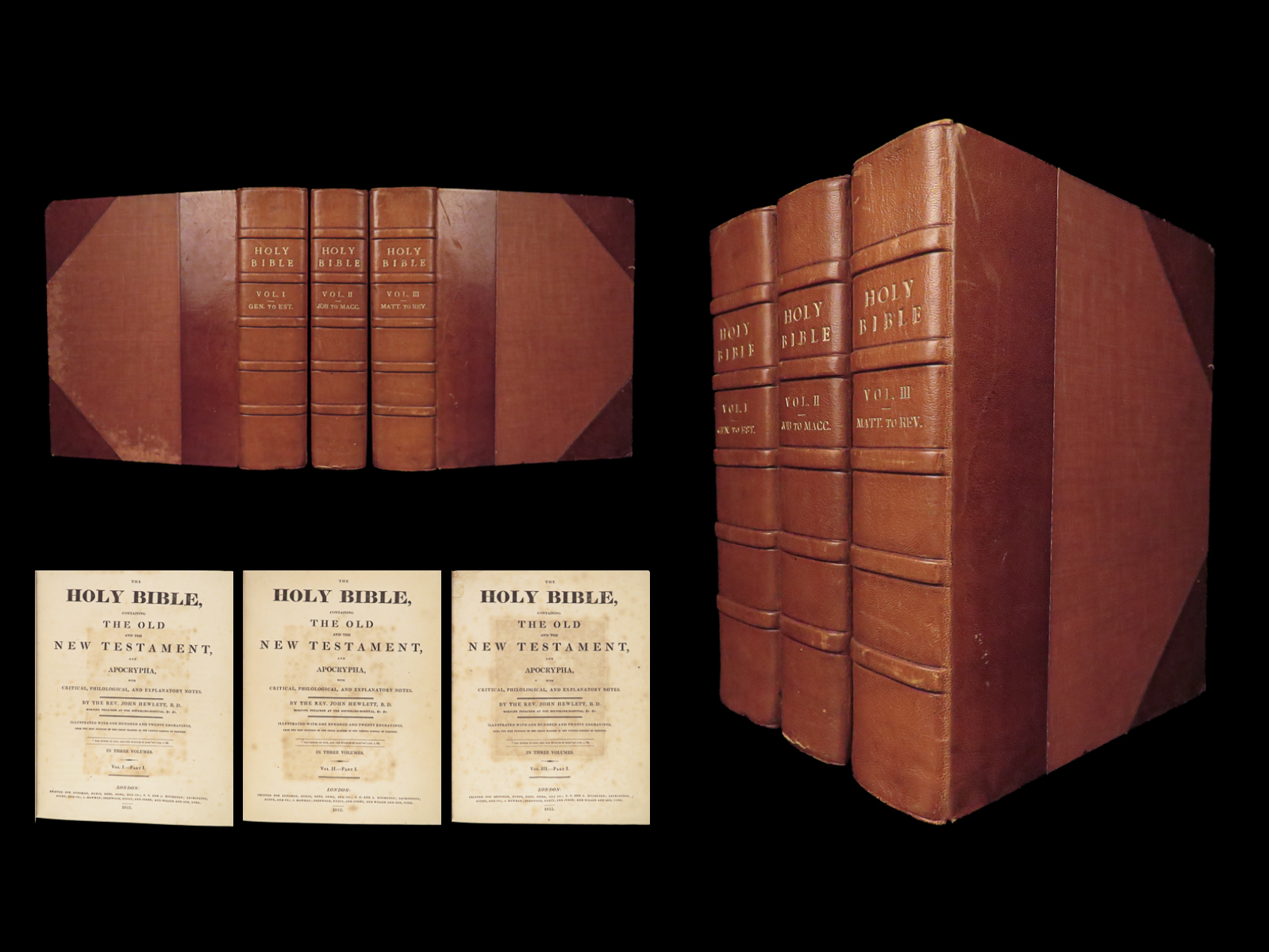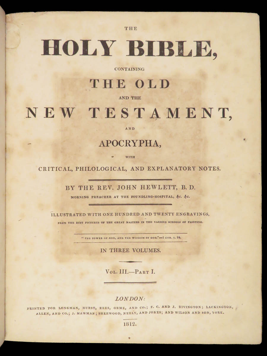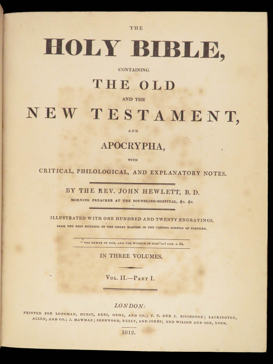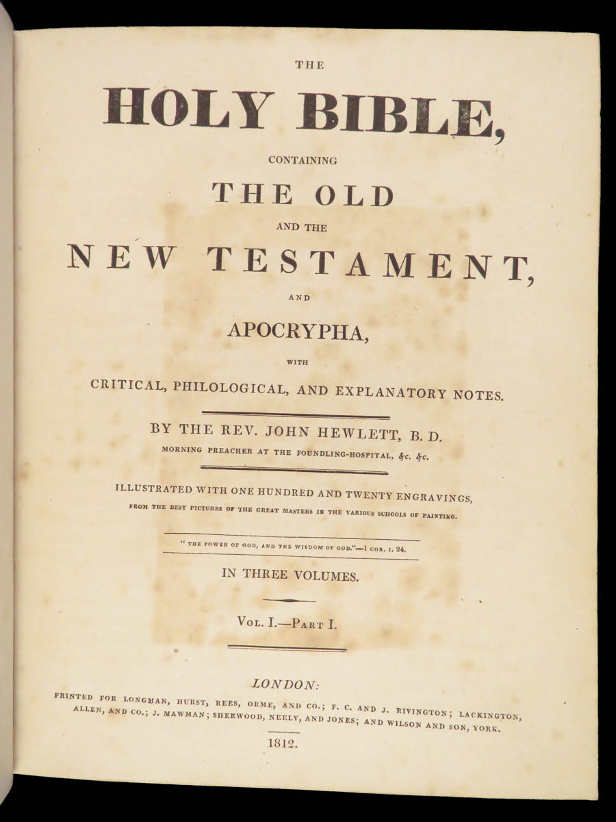 The Holy Bible, containing the Old and the New Testament, and Apocrypha was published in London in 1812 in three huge volumes. Each volume features extensive notes and commentary by Hewlett, a known biblical editor of the early 19th century. The set includes 120 engraved plates, integrated across the biblical text and apocryphal books.