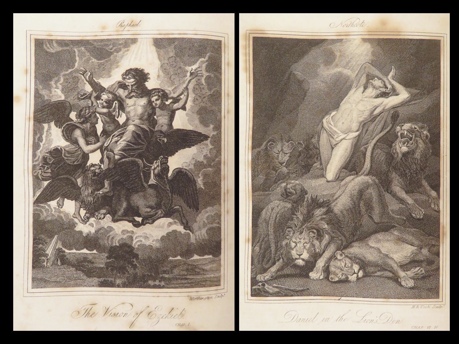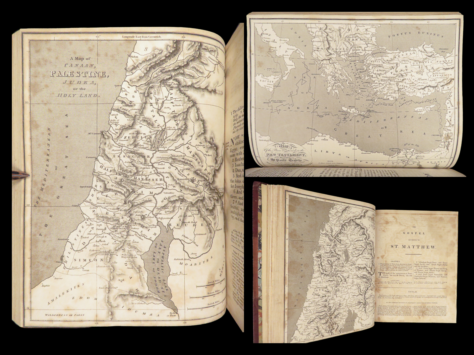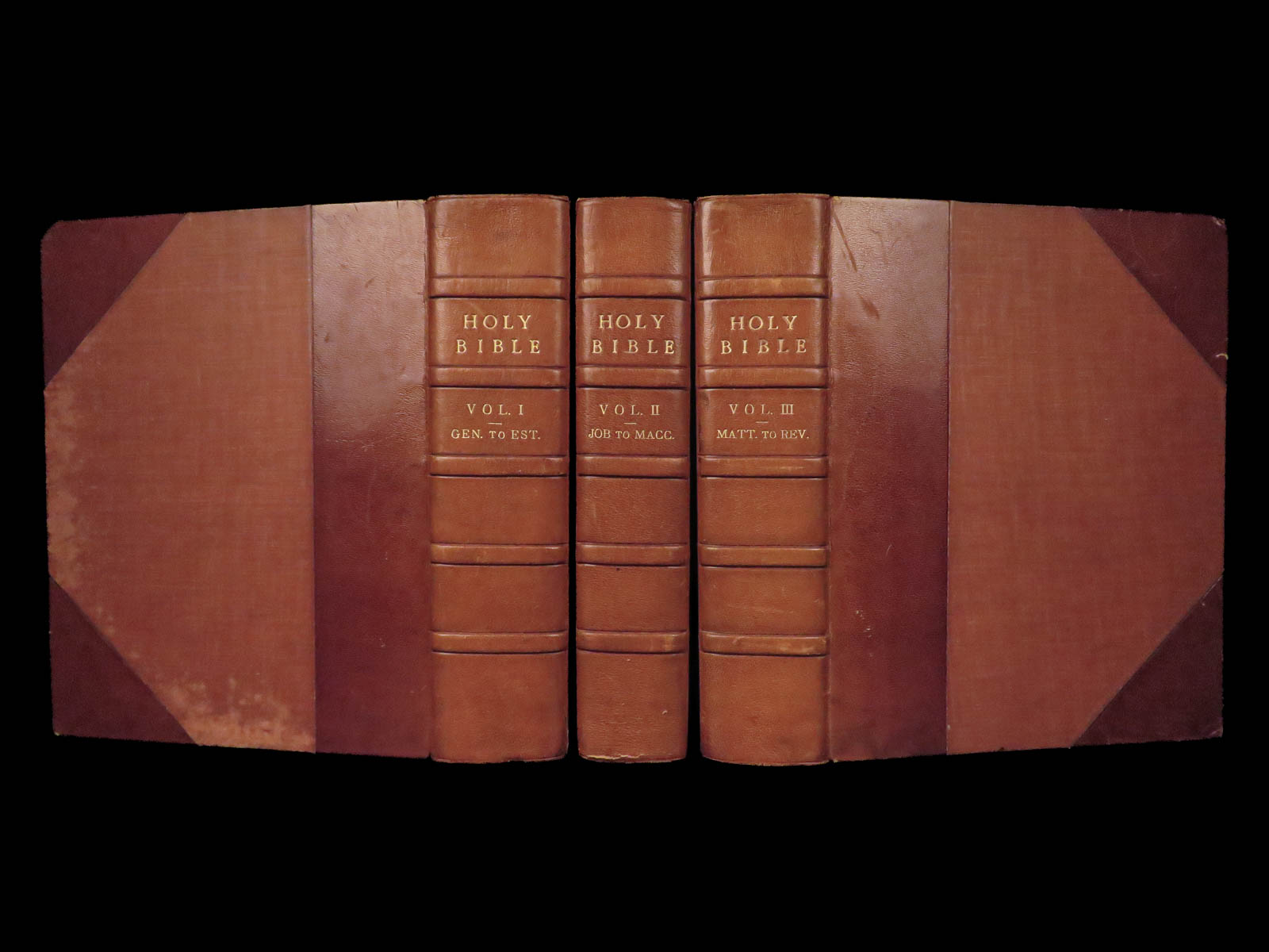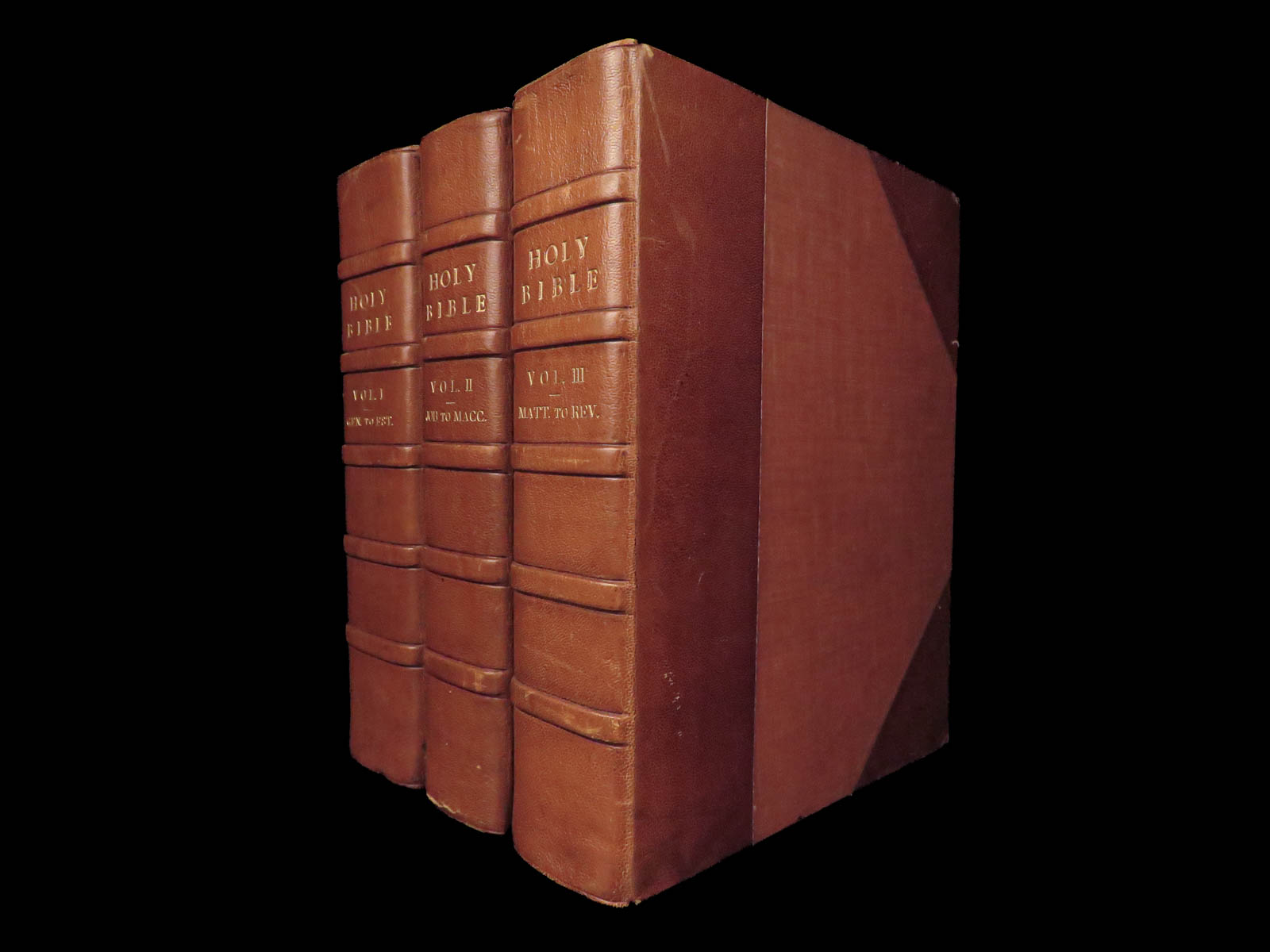 The Holy Bible, containing the Old and the New Testament, and Apocrypha was published in London in 1812 in three huge volumes. Each volume features extensive notes and commentary by Hewlett, a known biblical editor of the early 19th century. The set includes 120 engraved plates, integrated across the biblical text and apocryphal books.