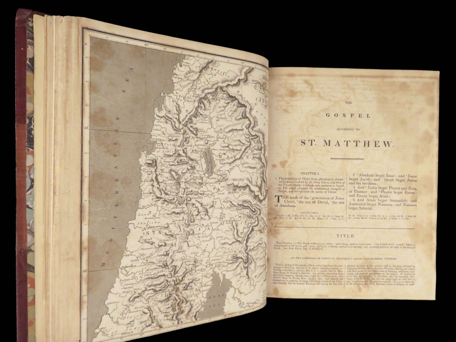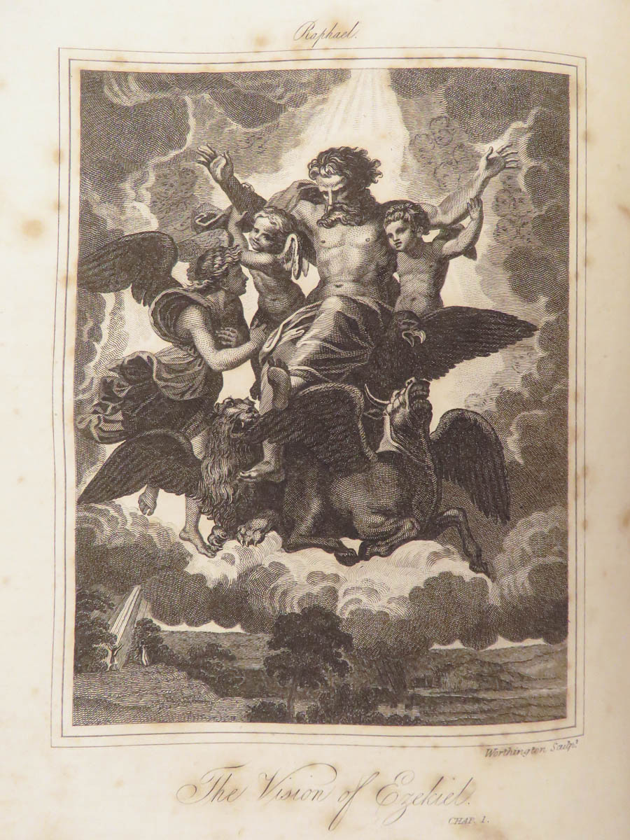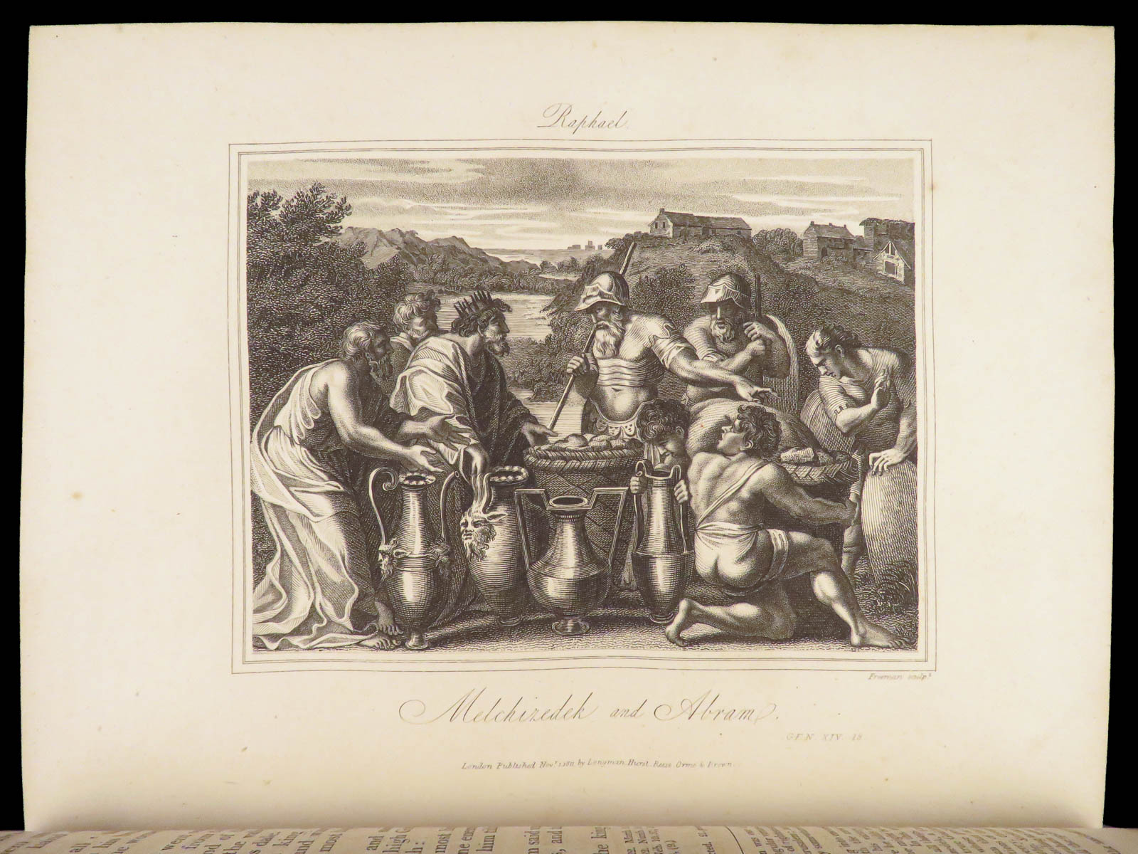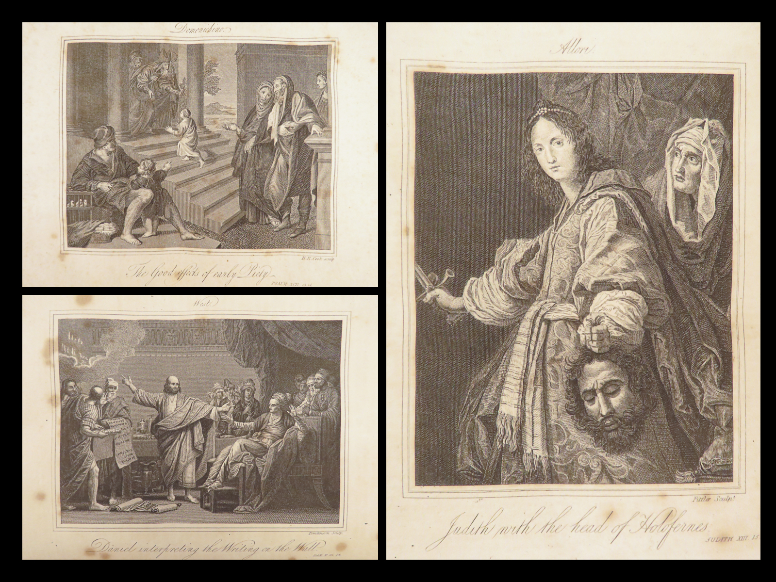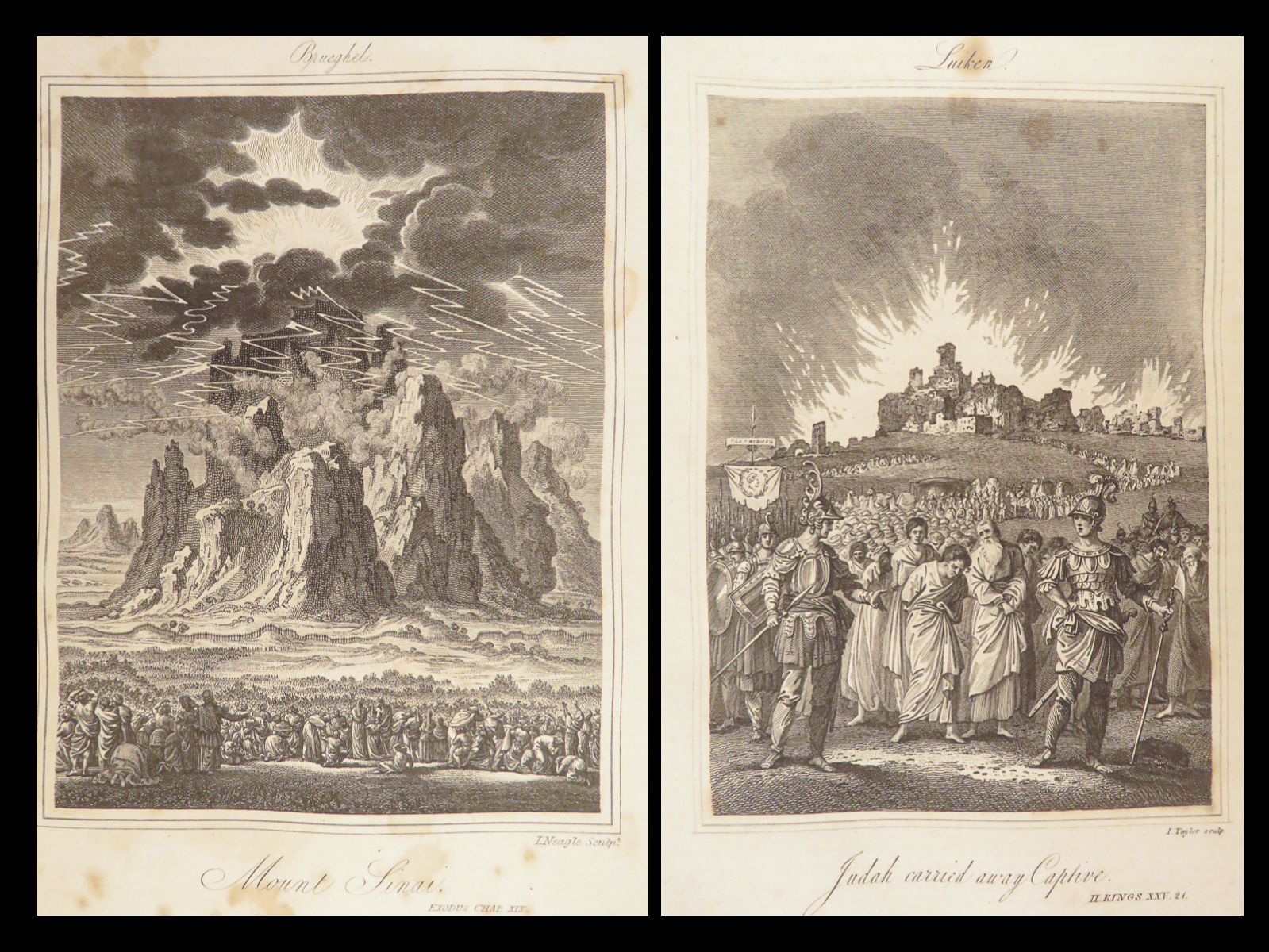 The Holy Bible, containing the Old and the New Testament, and Apocrypha was published in London in 1812 in three huge volumes. Each volume features extensive notes and commentary by Hewlett, a known biblical editor of the early 19th century. The set includes 120 engraved plates, integrated across the biblical text and apocryphal books.