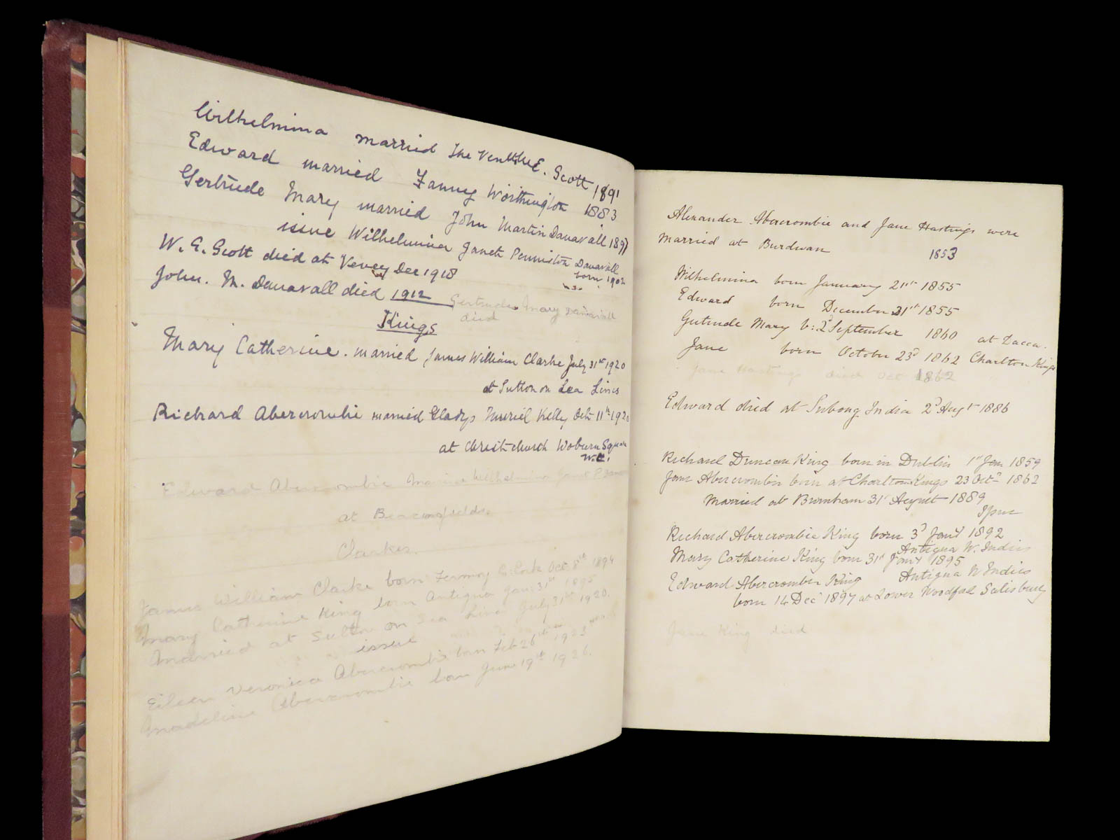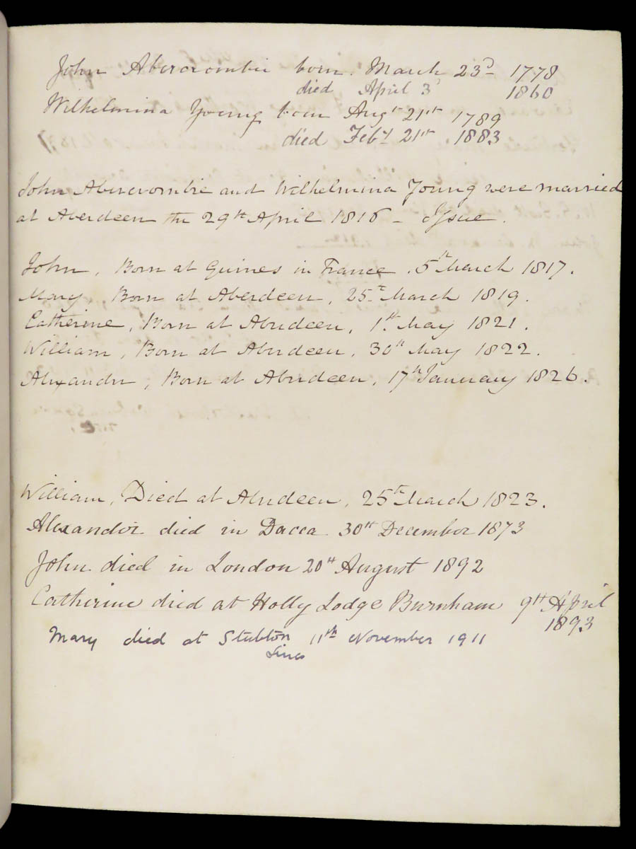- Provenance: significant family records handwritten in the front – numerous families including Wilhelmina, Worthington, Abercrombie, etc.
