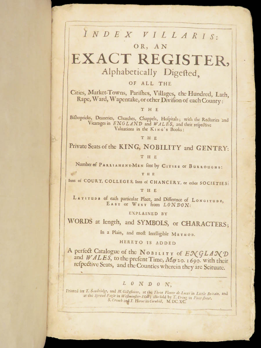 Index Villaris was first published in 1680 and was edited and republished in 1690 with numerous additions. This 1690 edition is leather bound; an impressive 17th-century piece of English topography.