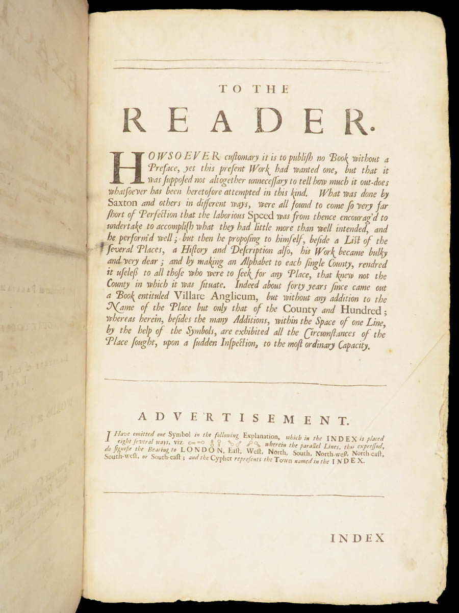 John Adams, not to be confused with the American founding father, was a 17th-century English lawyer who is best known for his topographical studies of England, Index Villaris or an Exact Register Alphabetically Digested. In 1677, he produced a map of England and Wales that many considered to be quite lacking. To satisfy those that were left off the map, Adams published an enormous Index that categorized and registered each city, town, village, and county in England and Wales.