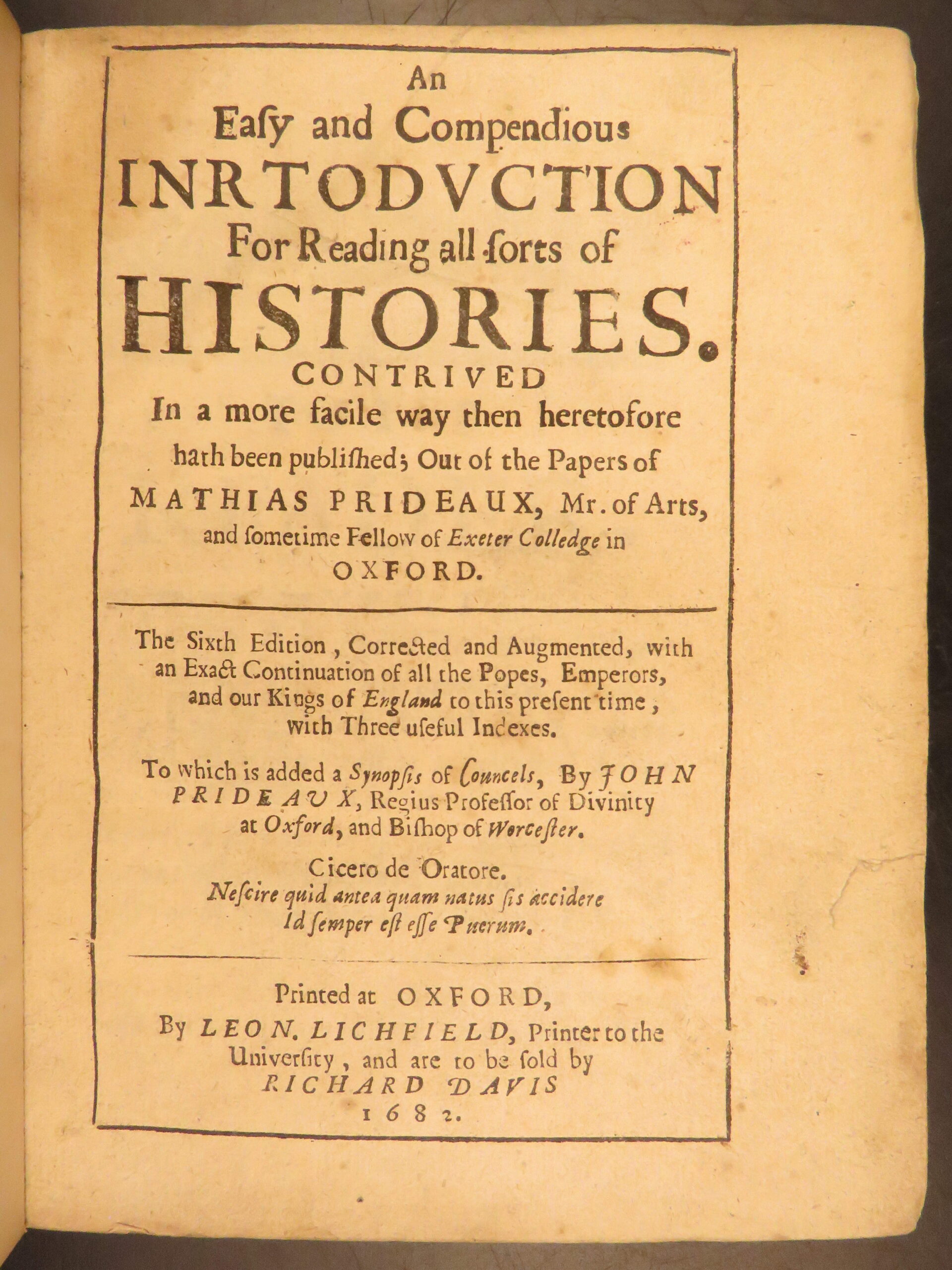 Matthias Prideaux’s 1682 Introduction to All Sorts of Histories, printed in Oxford, covers ancient, biblical, and religious history and includes John Prideaux’s Synopsis of Councels.