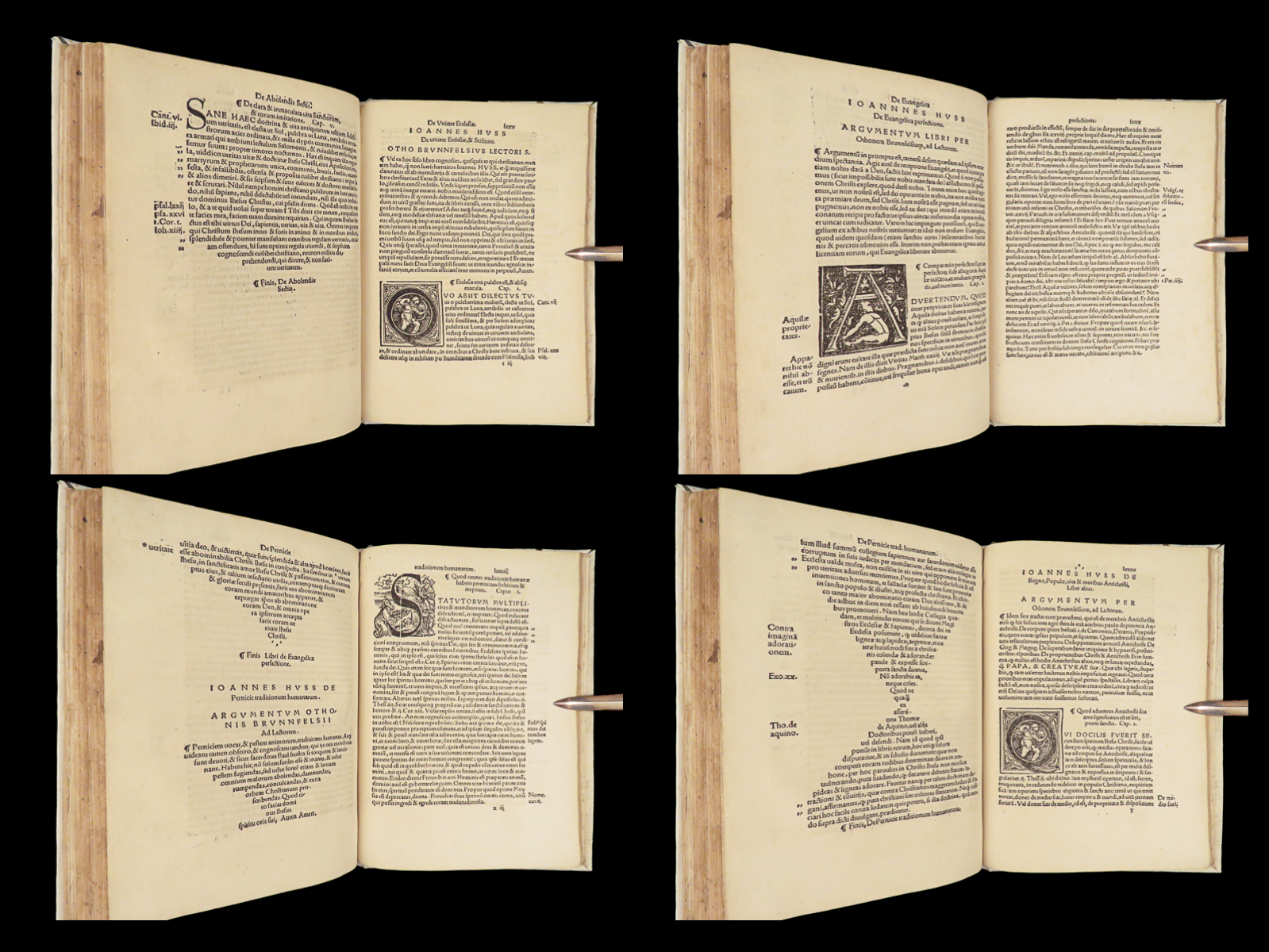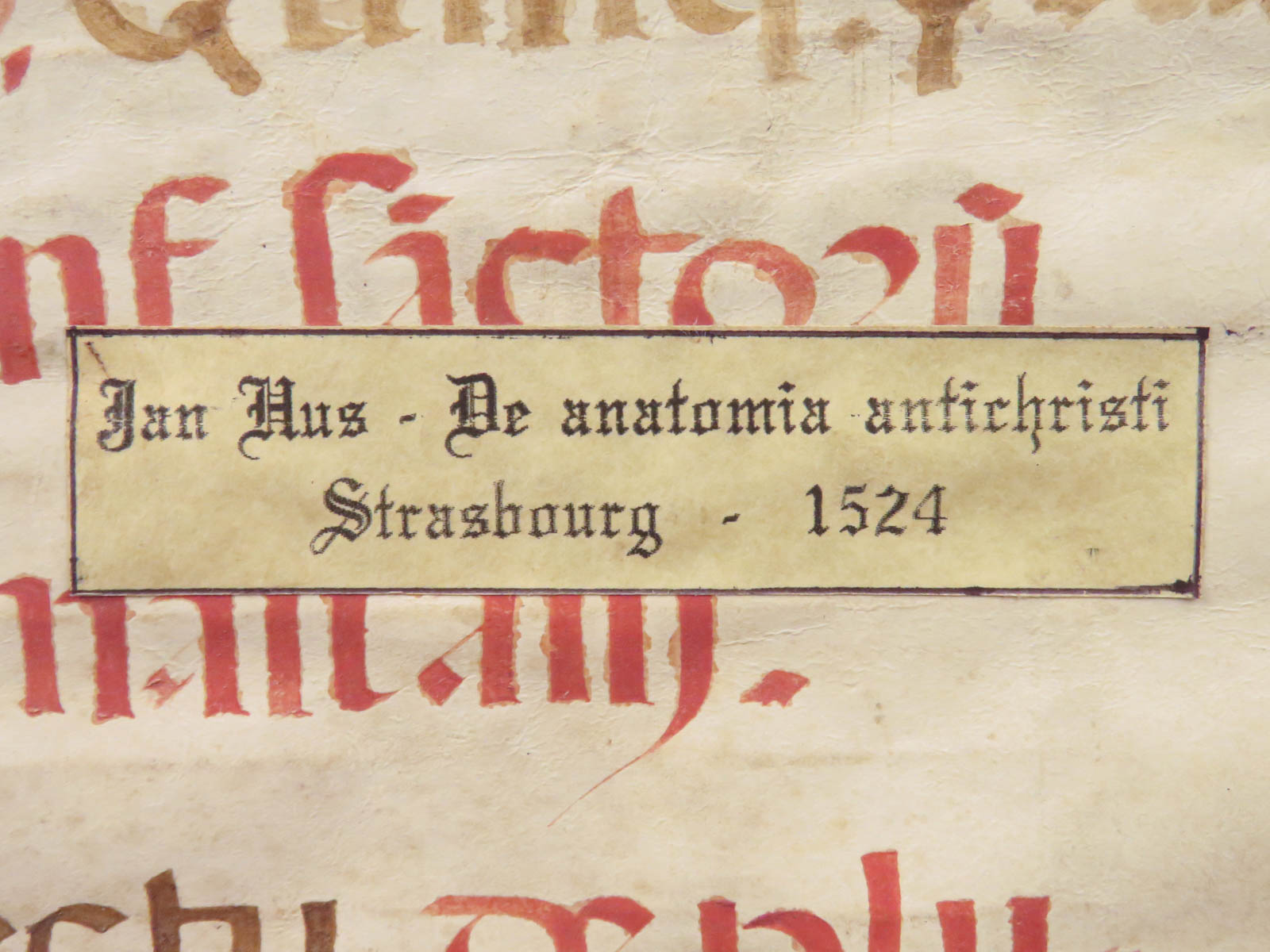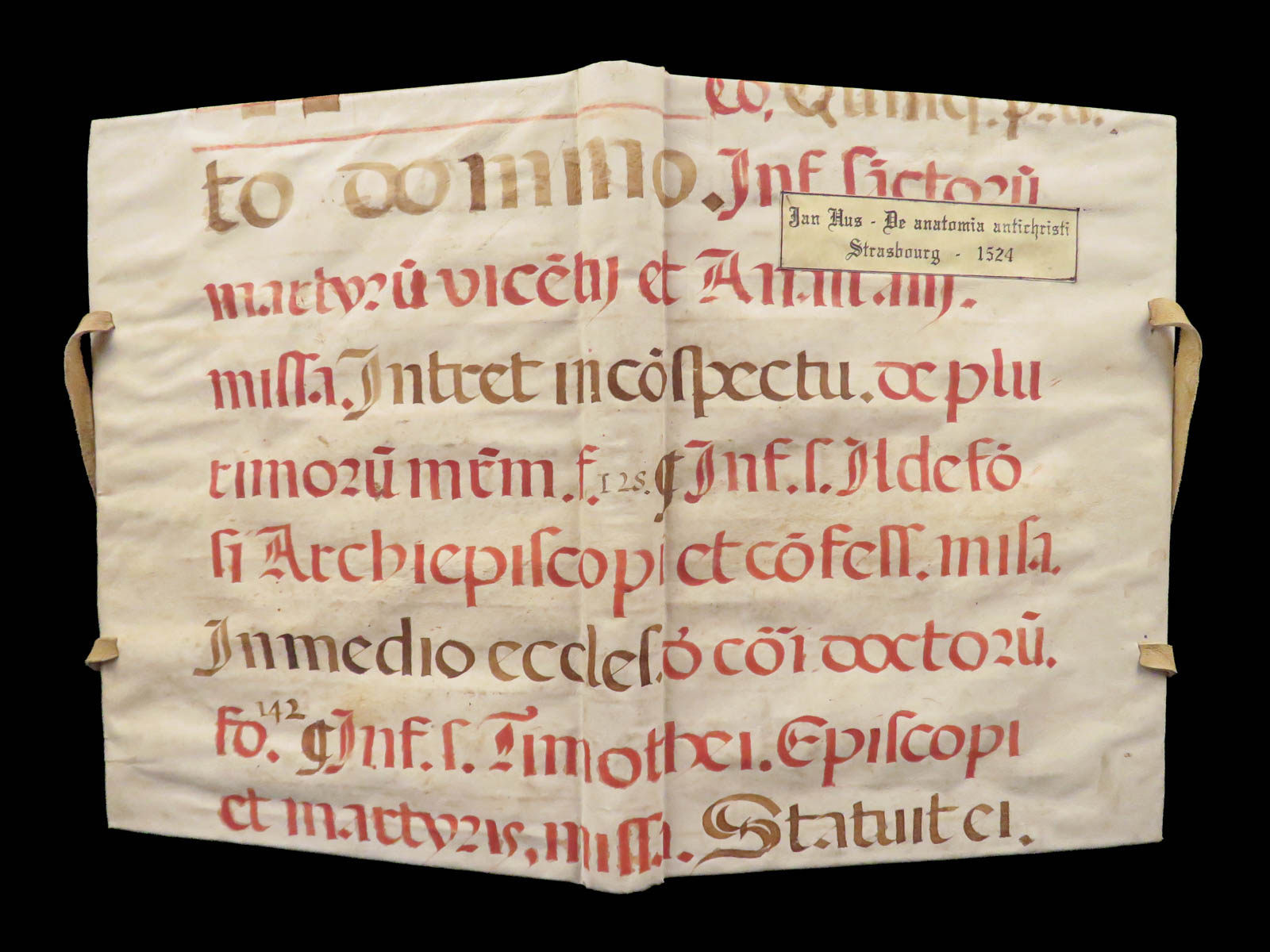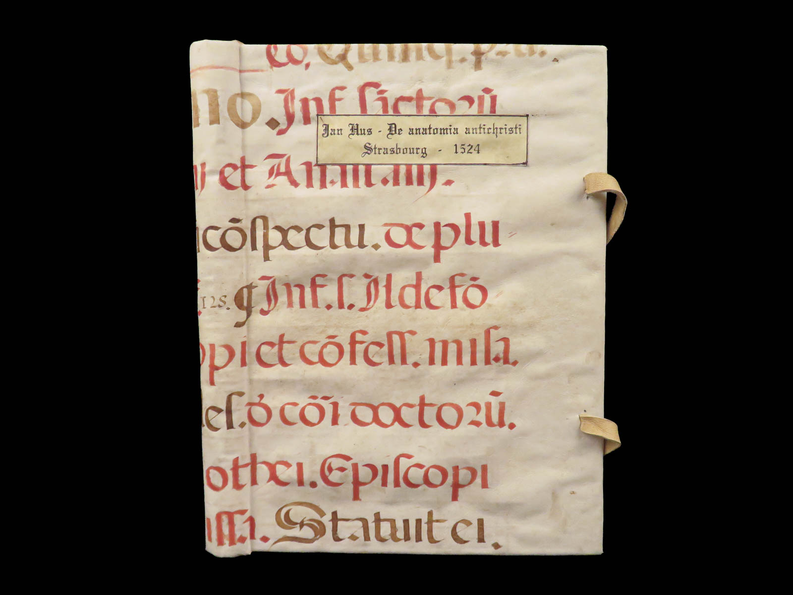 Joannes huss de anatomia antichristi, liber unus is am early Renaissance treatise connecting John Wycliffe, Jan Hus, and Martin Luther. This work, first published in 1524, adapts material from Matthias de Ianova’s Regulae Veteris et Novi Testamenti, a foundation of Hussite teaching, as well as the concept of papal Antichrist through the allegory of human anatomy. Included is Hus’s letter to Martin Luther urging the importance of his writings within the reform movement. Johann Schott produced this edition in Strassburg, a center of Reformation printing, and this particular example is notable for being bound in a period manuscript with leather ties.