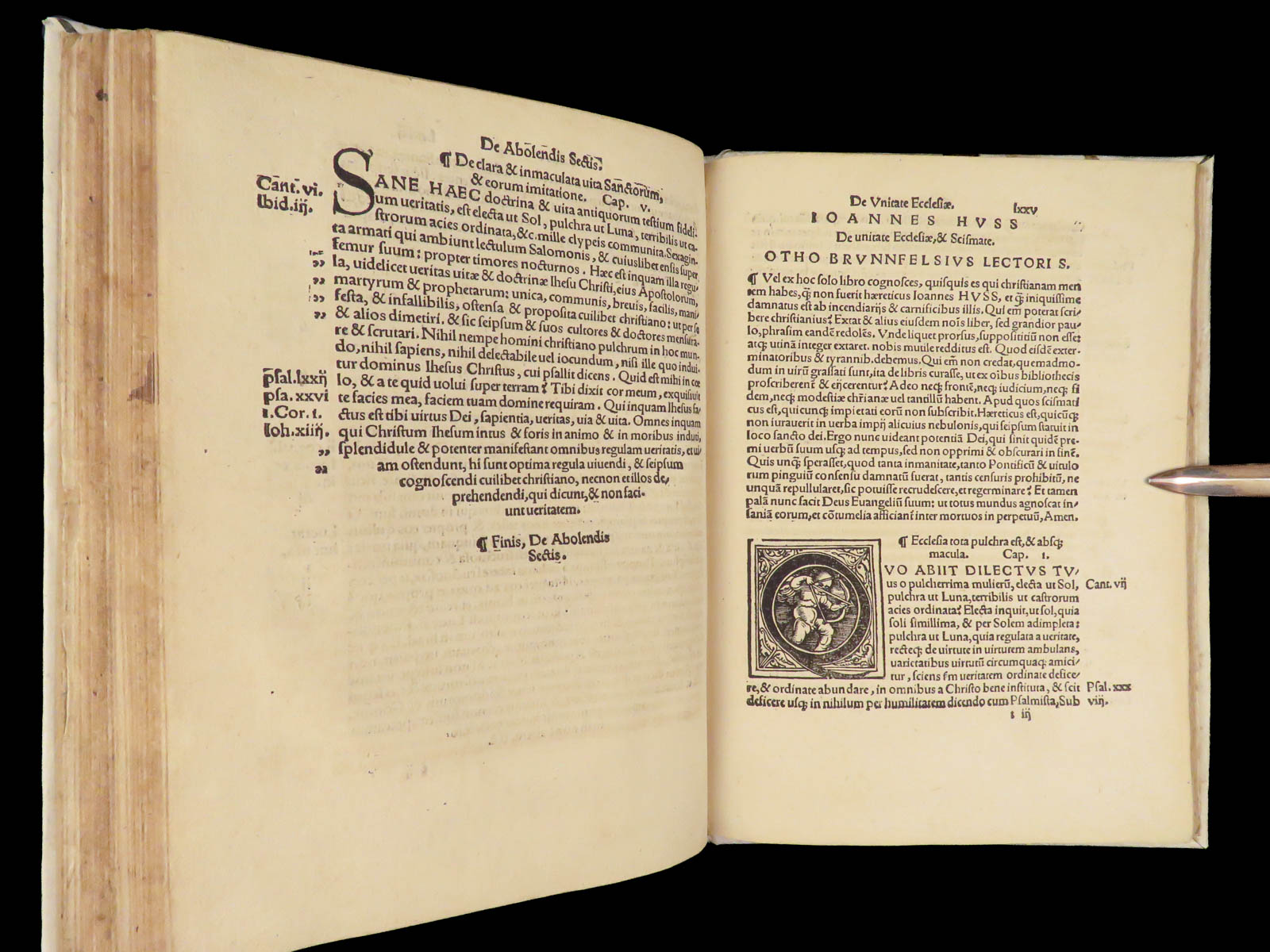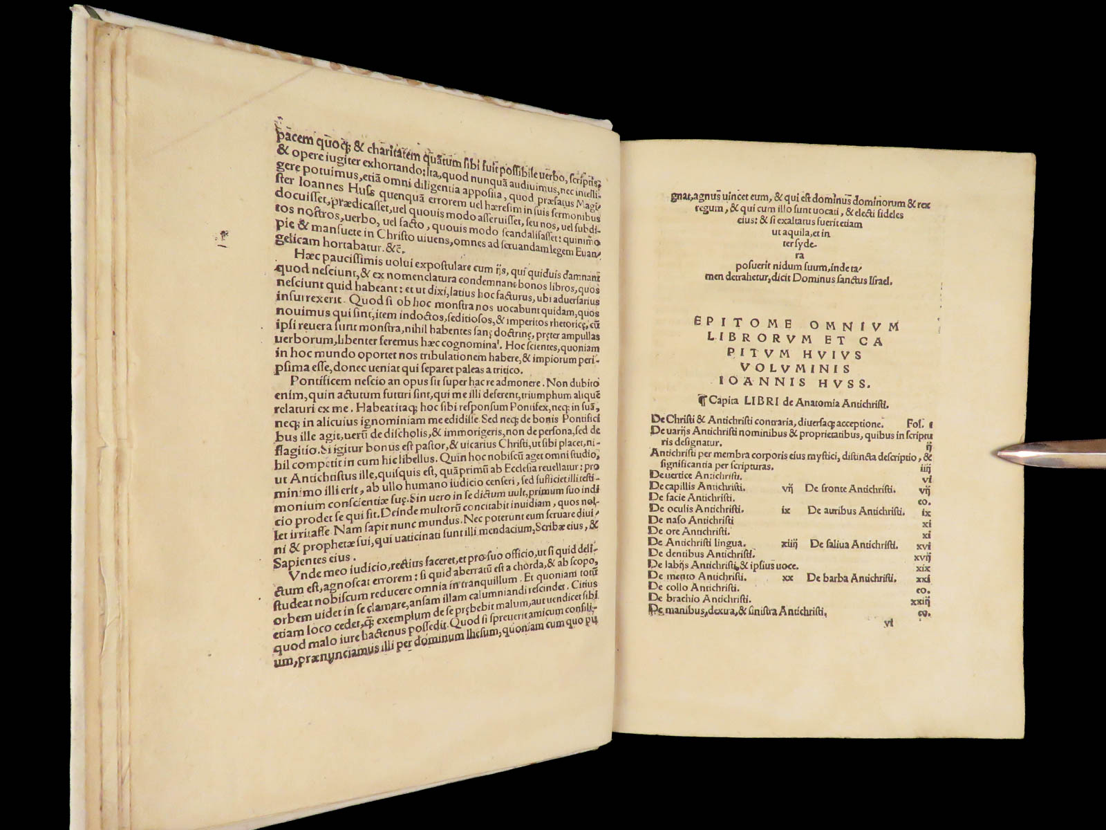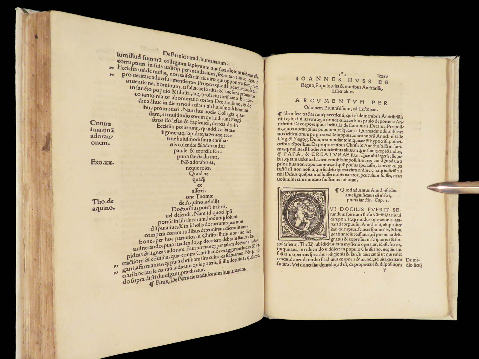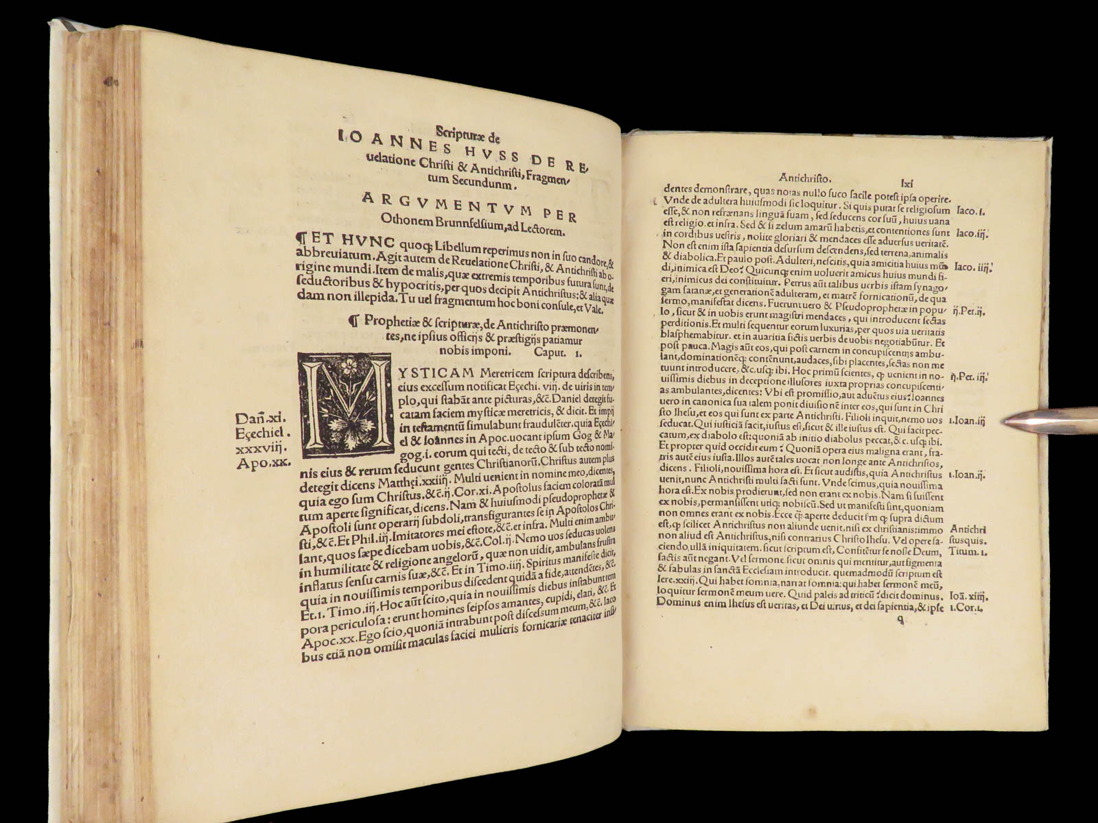 Joannes huss de anatomia antichristi, liber unus is am early Renaissance treatise connecting John Wycliffe, Jan Hus, and Martin Luther. This work, first published in 1524, adapts material from Matthias de Ianova’s Regulae Veteris et Novi Testamenti, a foundation of Hussite teaching, as well as the concept of papal Antichrist through the allegory of human anatomy. Included is Hus’s letter to Martin Luther urging the importance of his writings within the reform movement. Johann Schott produced this edition in Strassburg, a center of Reformation printing, and this particular example is notable for being bound in a period manuscript with leather ties.