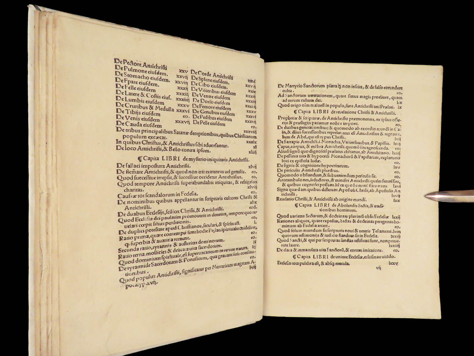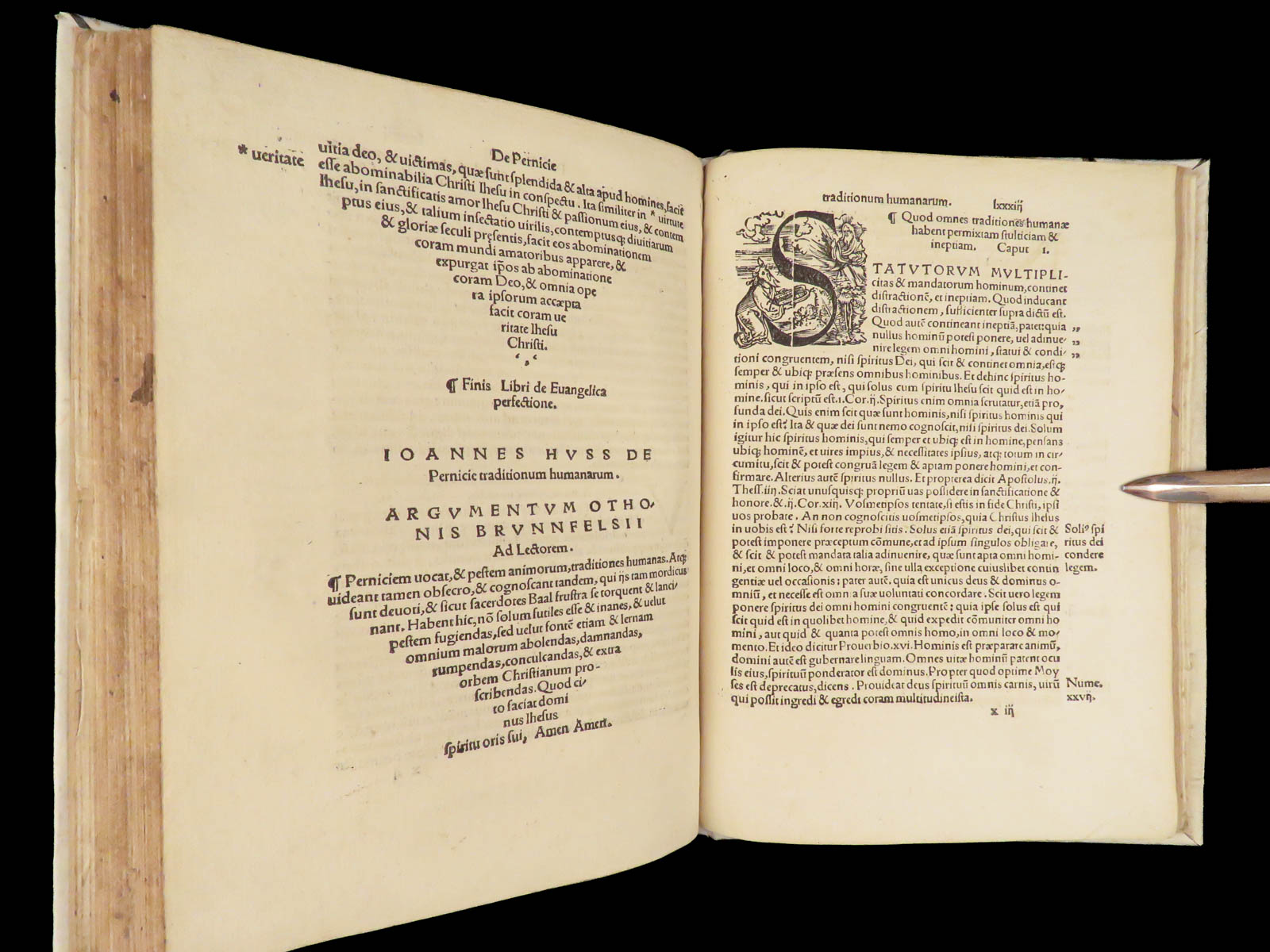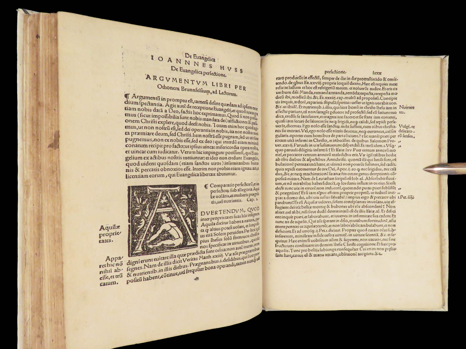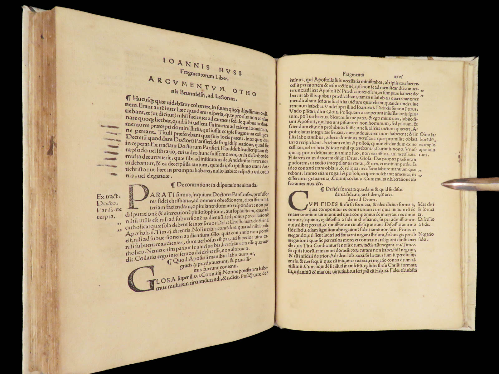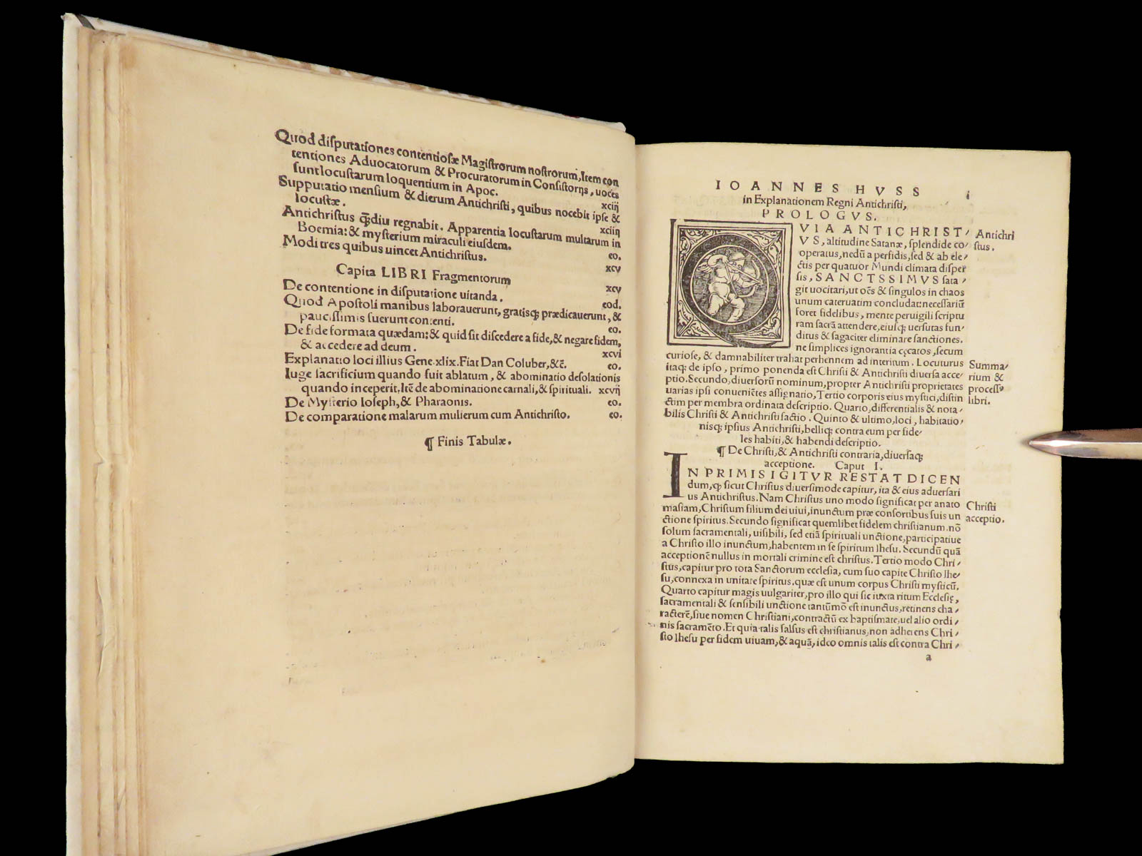 Joannes huss de anatomia antichristi, liber unus is am early Renaissance treatise connecting John Wycliffe, Jan Hus, and Martin Luther. This work, first published in 1524, adapts material from Matthias de Ianova’s Regulae Veteris et Novi Testamenti, a foundation of Hussite teaching, as well as the concept of papal Antichrist through the allegory of human anatomy. Included is Hus’s letter to Martin Luther urging the importance of his writings within the reform movement. Johann Schott produced this edition in Strassburg, a center of Reformation printing, and this particular example is notable for being bound in a period manuscript with leather ties.