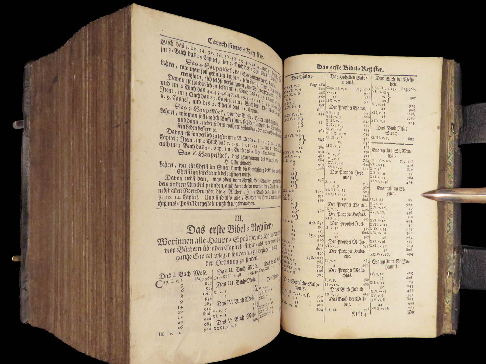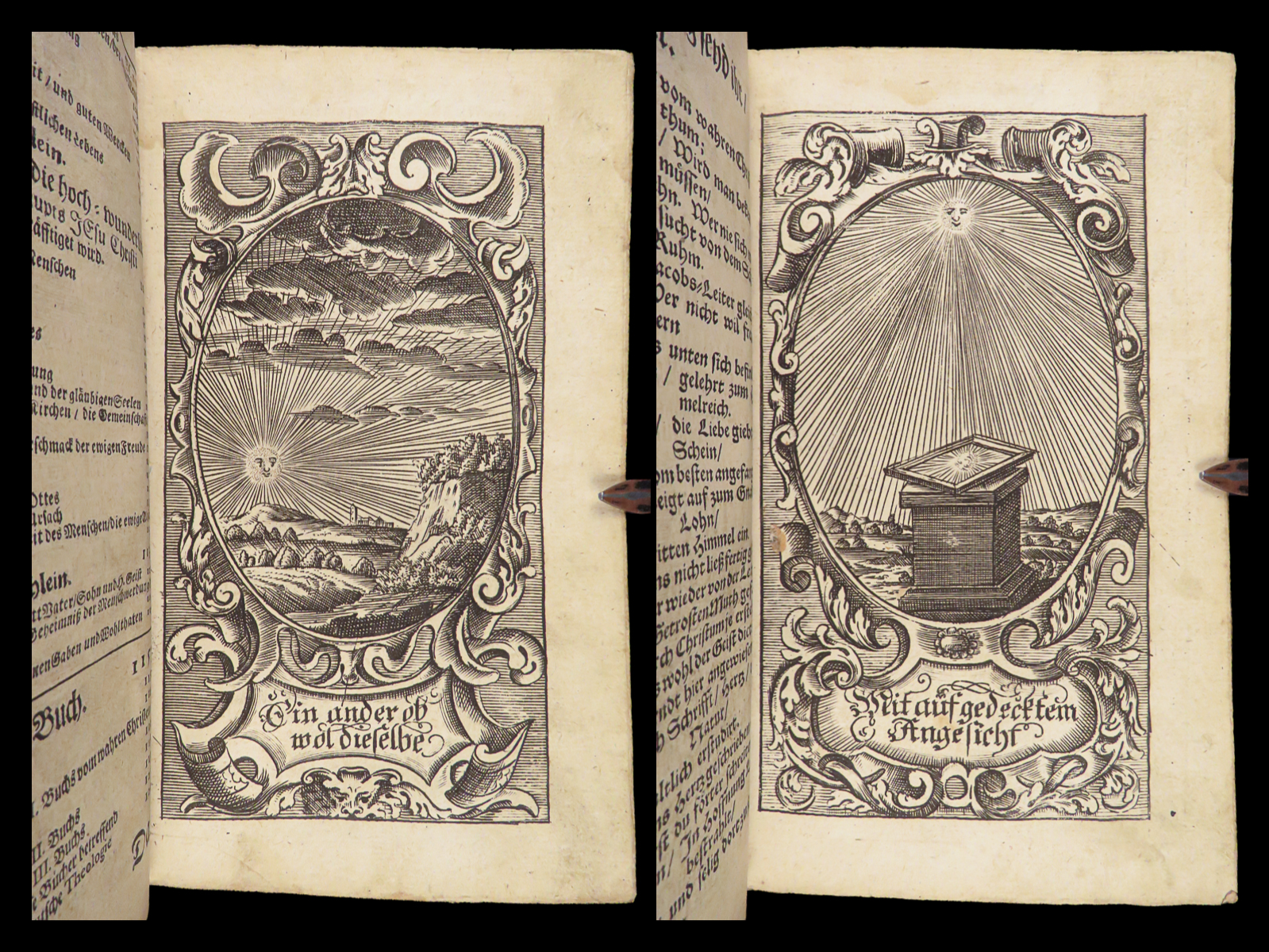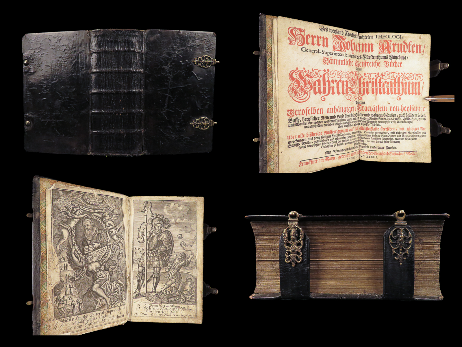 Johann Arndt’s Wahres Christentum, printed in Frankfurt in 1733, a landmark devotional of Pietism with 35 plates, original brass-clasped leather binding, and a striking double-page red and black title page.