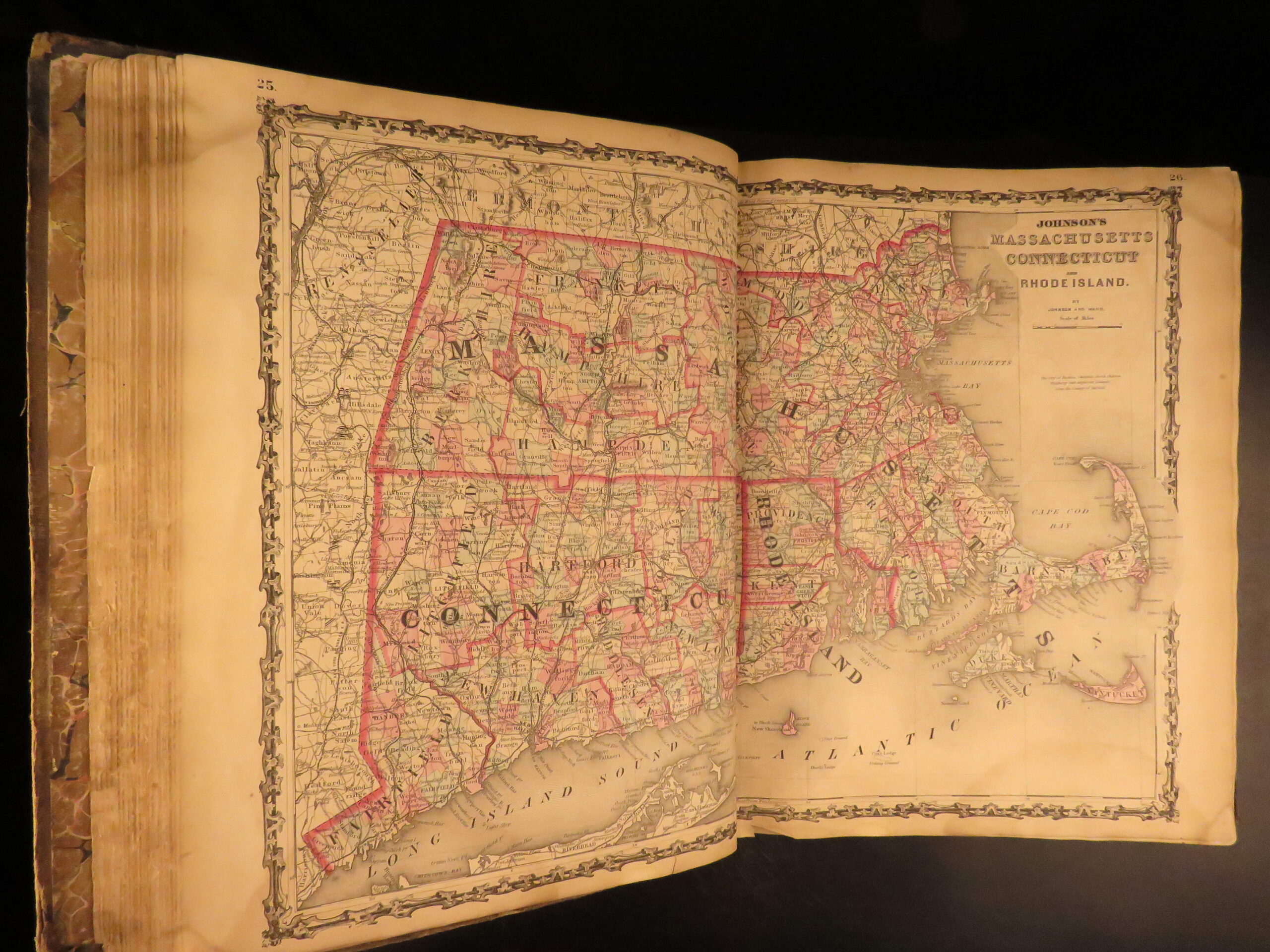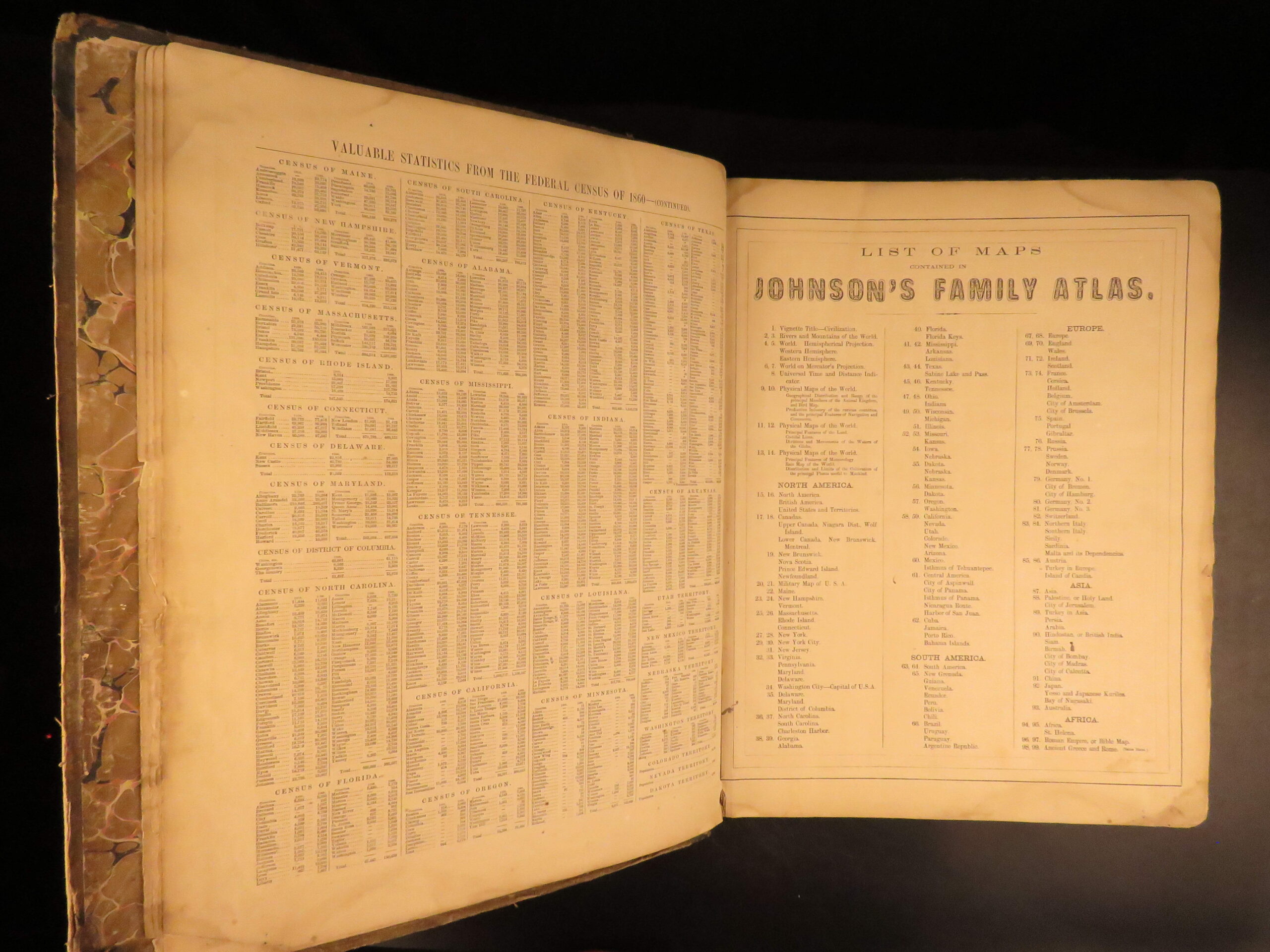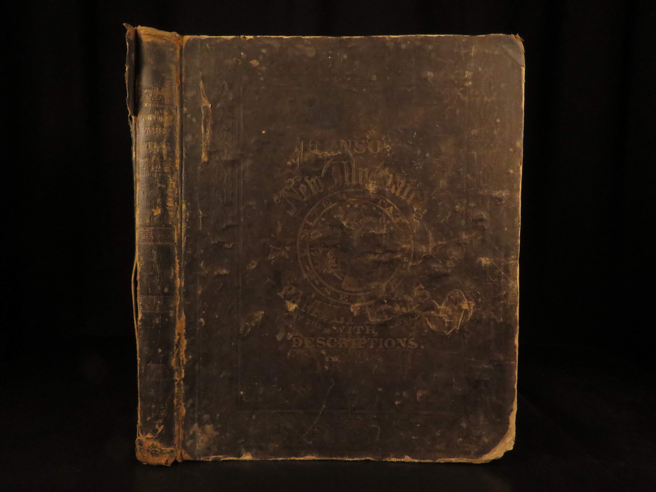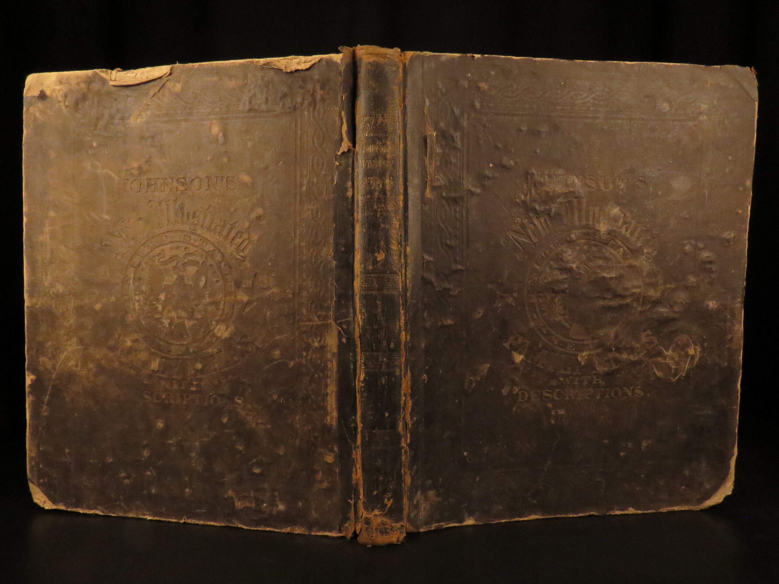 An incredible Civil War-era family atlas! This atlas consists of nearly 100 colored J.H. Colton maps of states, cities, United States, and countries of the world! Individual maps from this collection are highly sought after and can be found for sale for nearly $500 by themselves! The double-page illustration of the world maps is particularly fine. Alvin Johnson was a famous map publisher in the mid-19th-century.