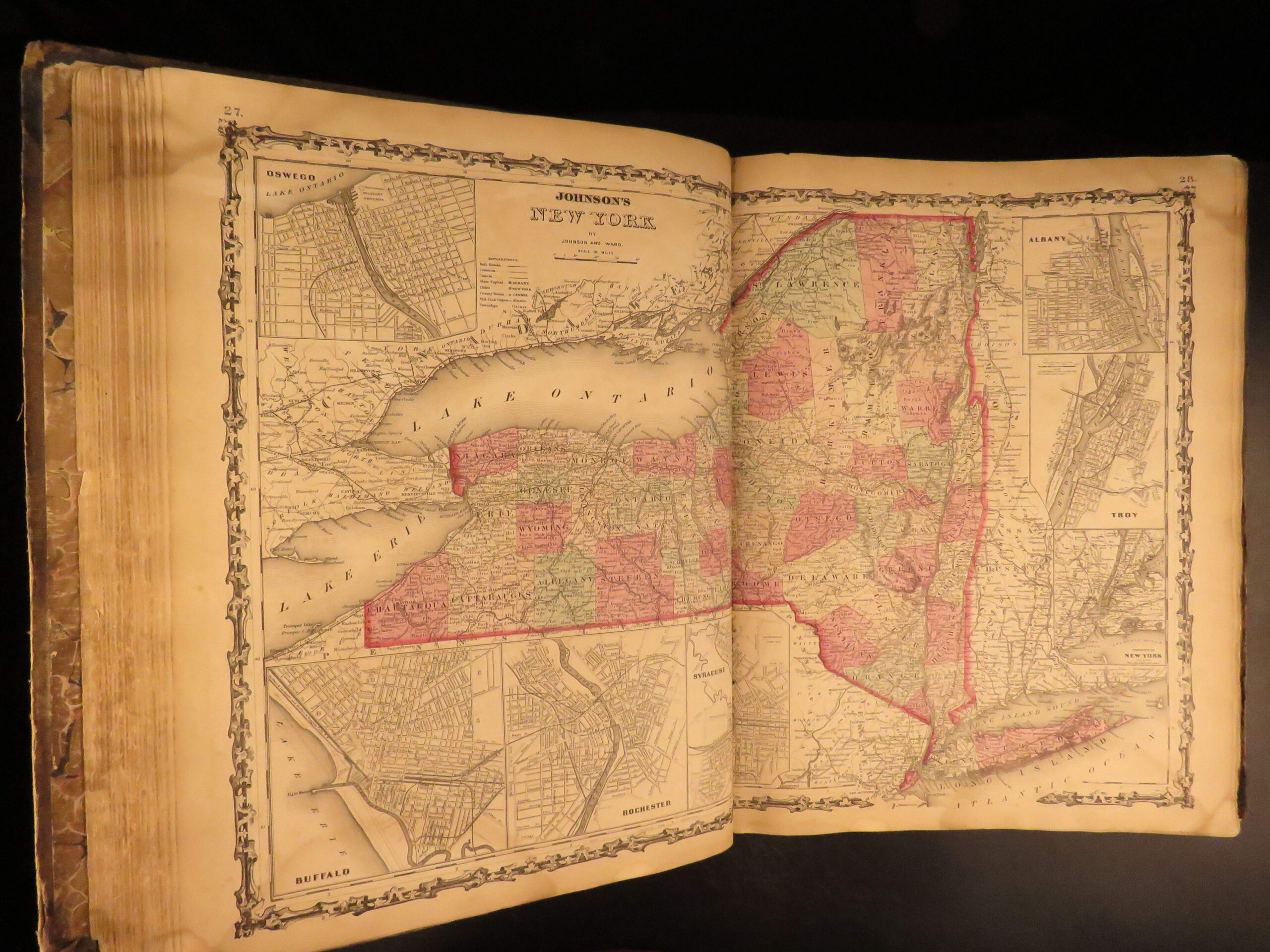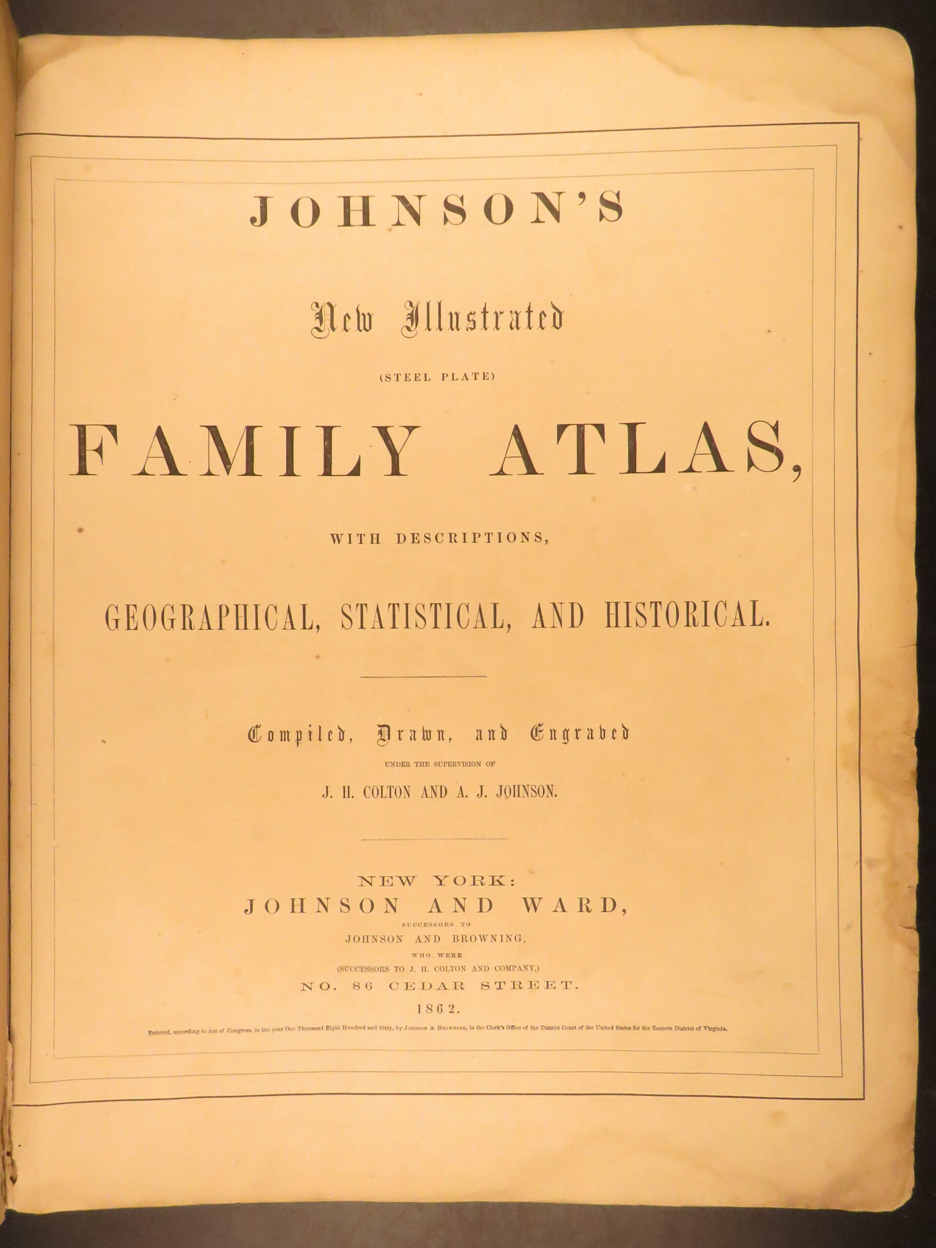 Johnson’s 1862 folio atlas includes 97 original hand-colored maps engraved by J.H. Colton, covering U.S. states, cities, and world regions with added physical and statistical texts.