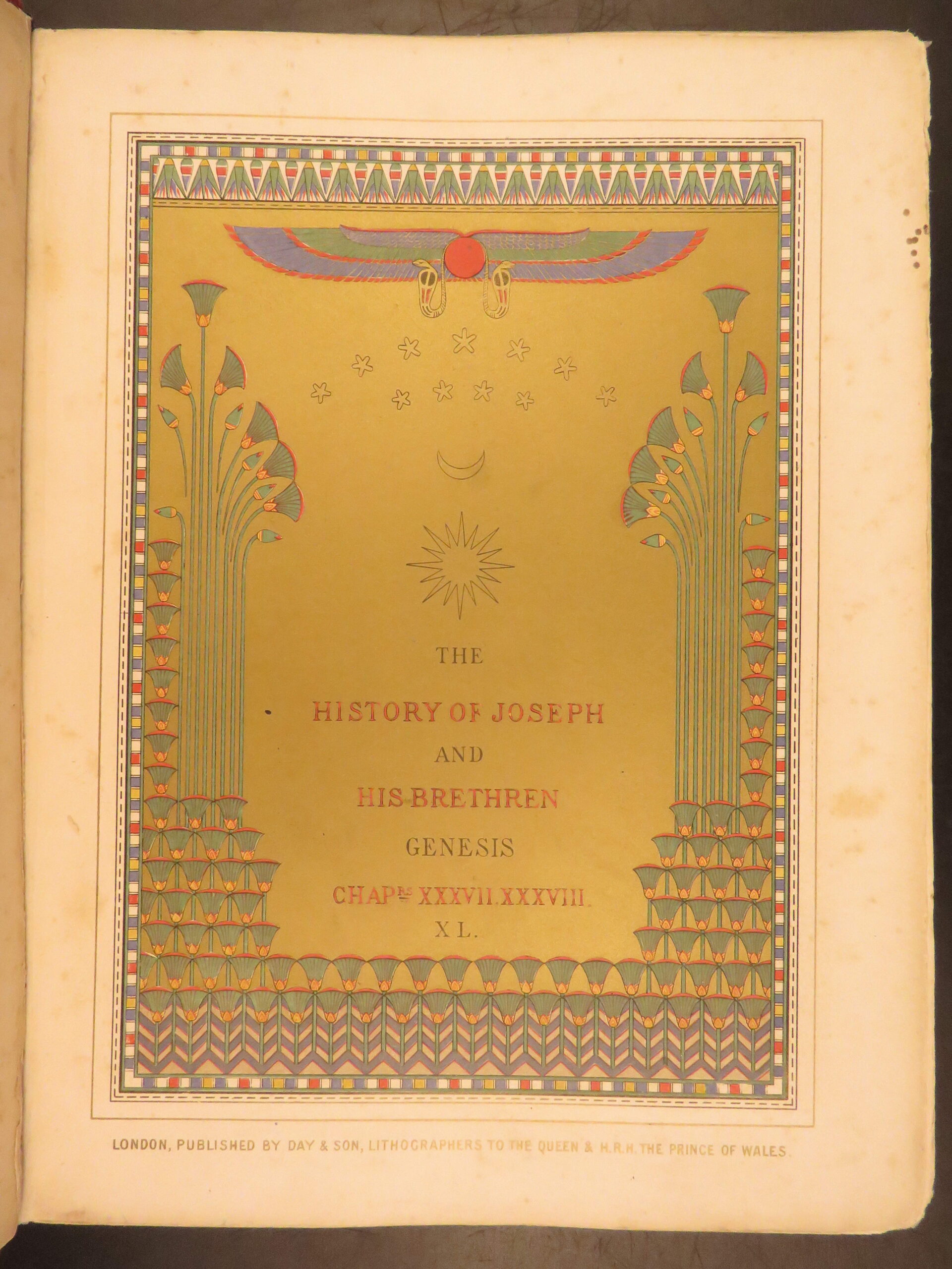 The history of Joseph and his brethren illuminated was printed around 1865 in London by Day and Son, known as lithographers to the Queen. This folio contains passages from Genesis chapters 37, 38, and 40, presented in chromolithograph engravings. The book included work by Owen Jones, Henry Warren, and Albert Henry Warren.