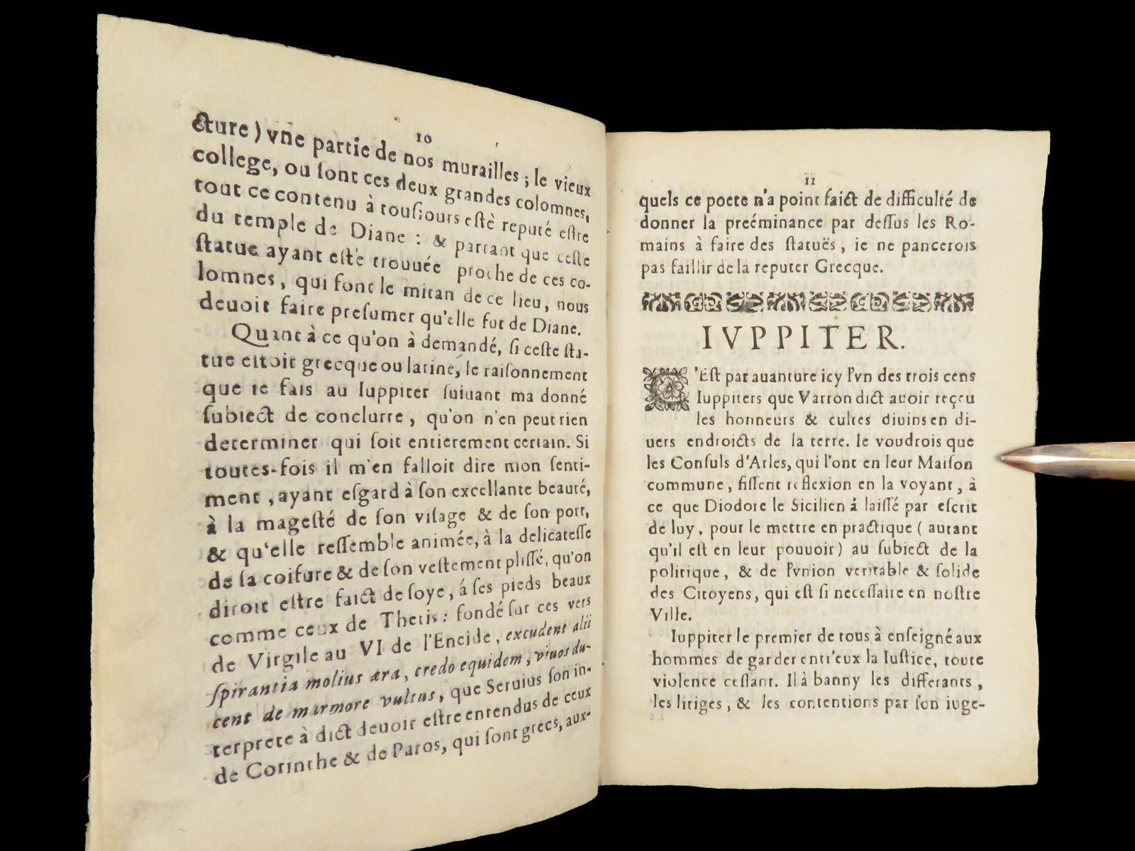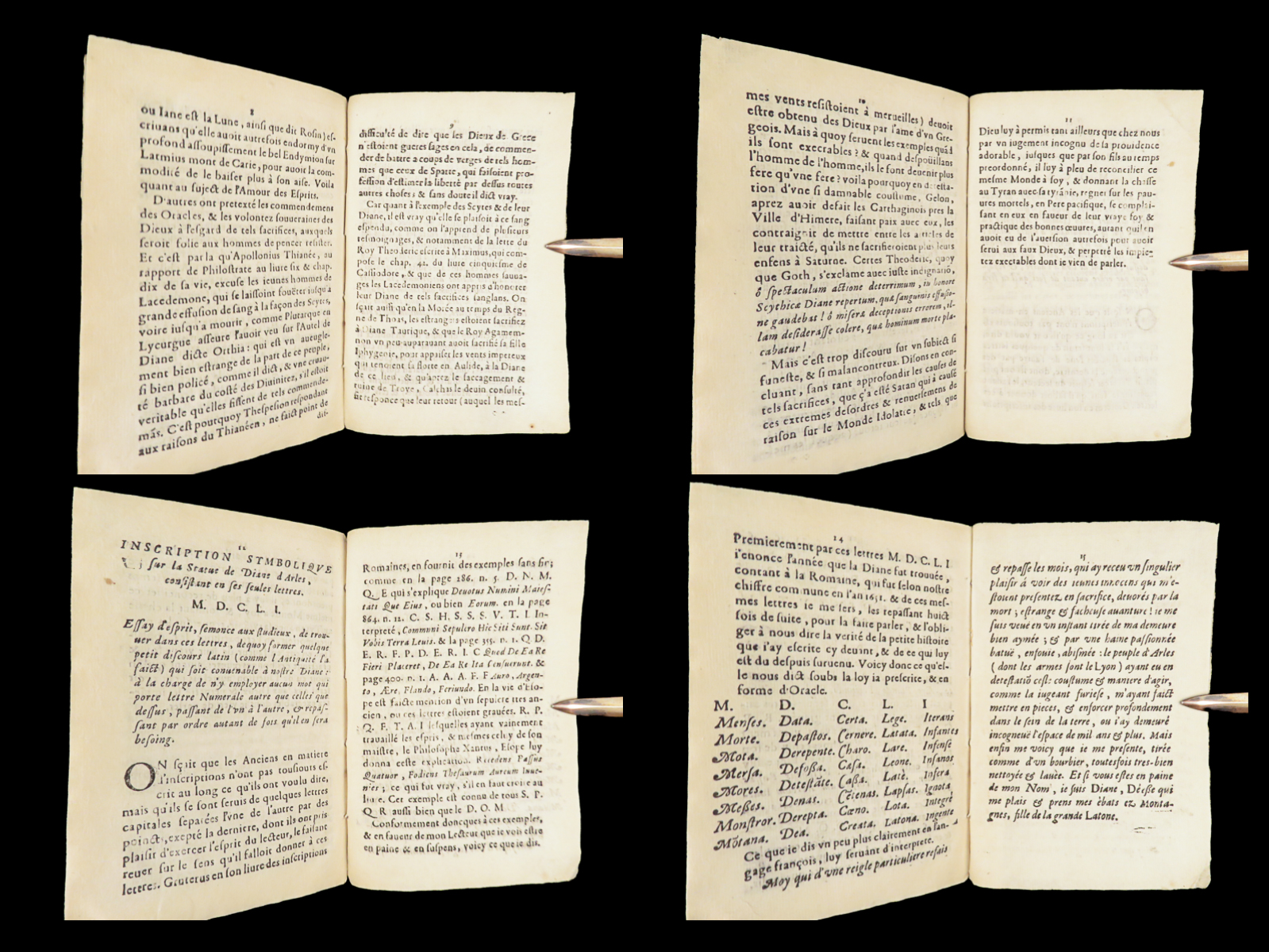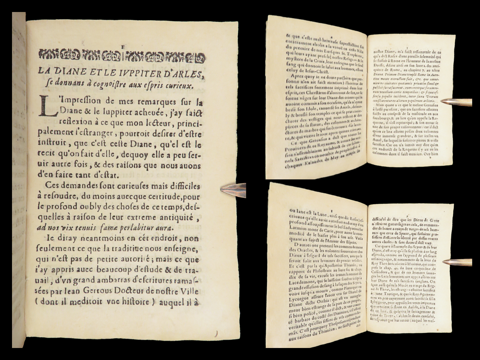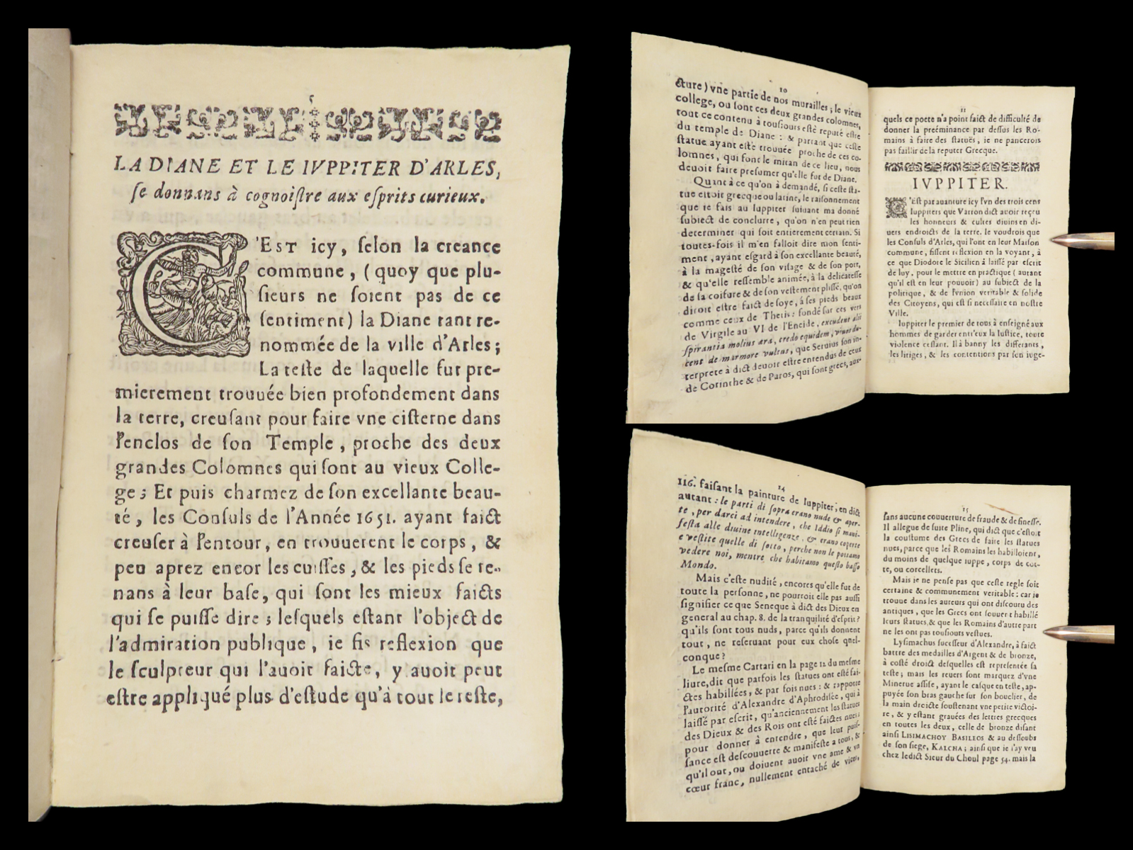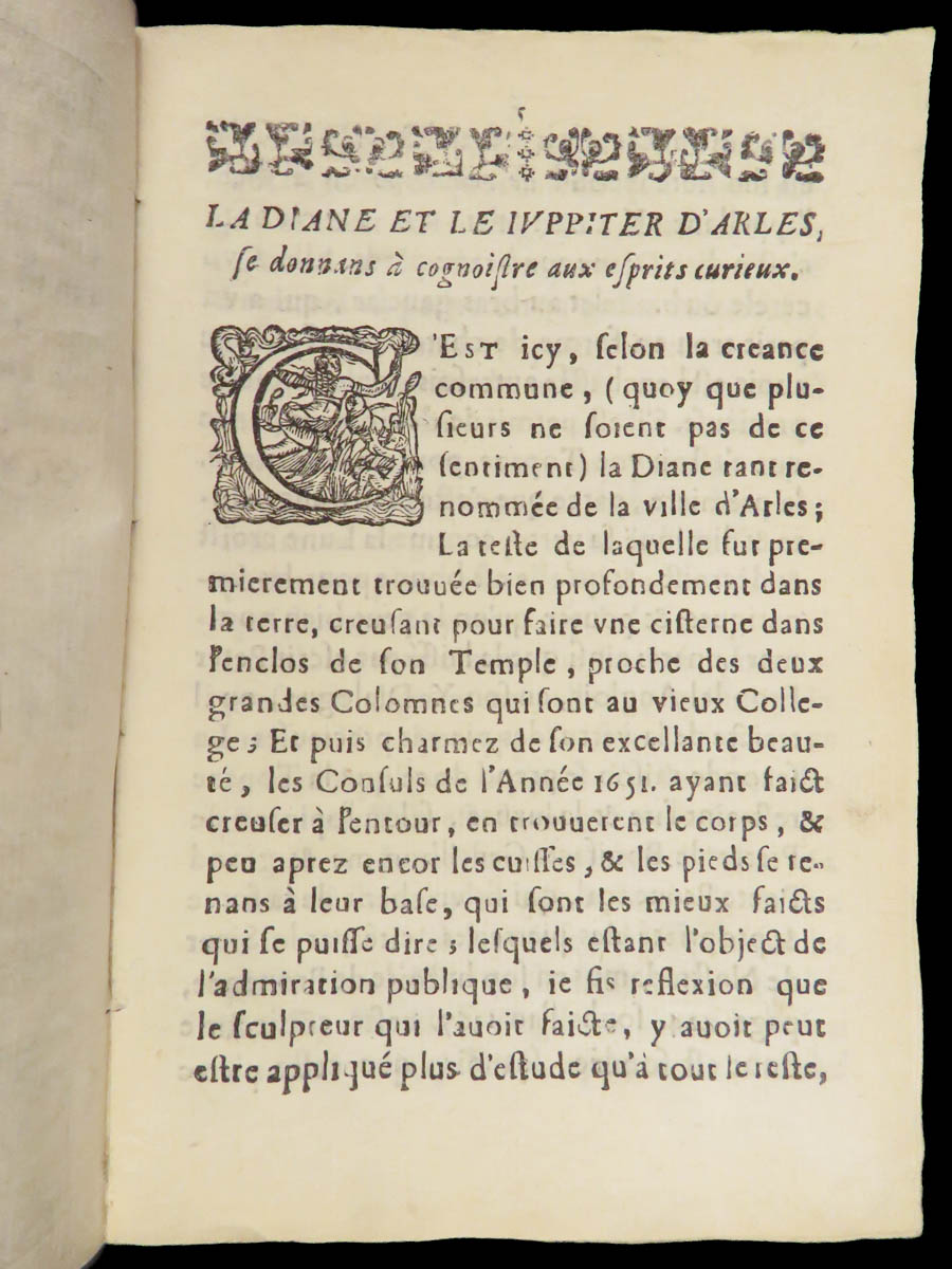 La Diane et le Iupiter d’Arles by François de Rebatu was printed in Arles in 1656. Rebatu, a royal adviser and poet, wrote this short work following the 1651 discovery of a Roman statue near the city’s ancient theatre. Scholars debated whether the figure represented Diana or Venus, though, reglardless, Rebatu took a hard stance, calling it a symbol of pagan worship and warning against celebrating such artifacts. He describes the idol as an object once linked to sacrifices, even claiming that children were once burned in its honor. This first edition captures both local reaction and religious sentiment of the time.