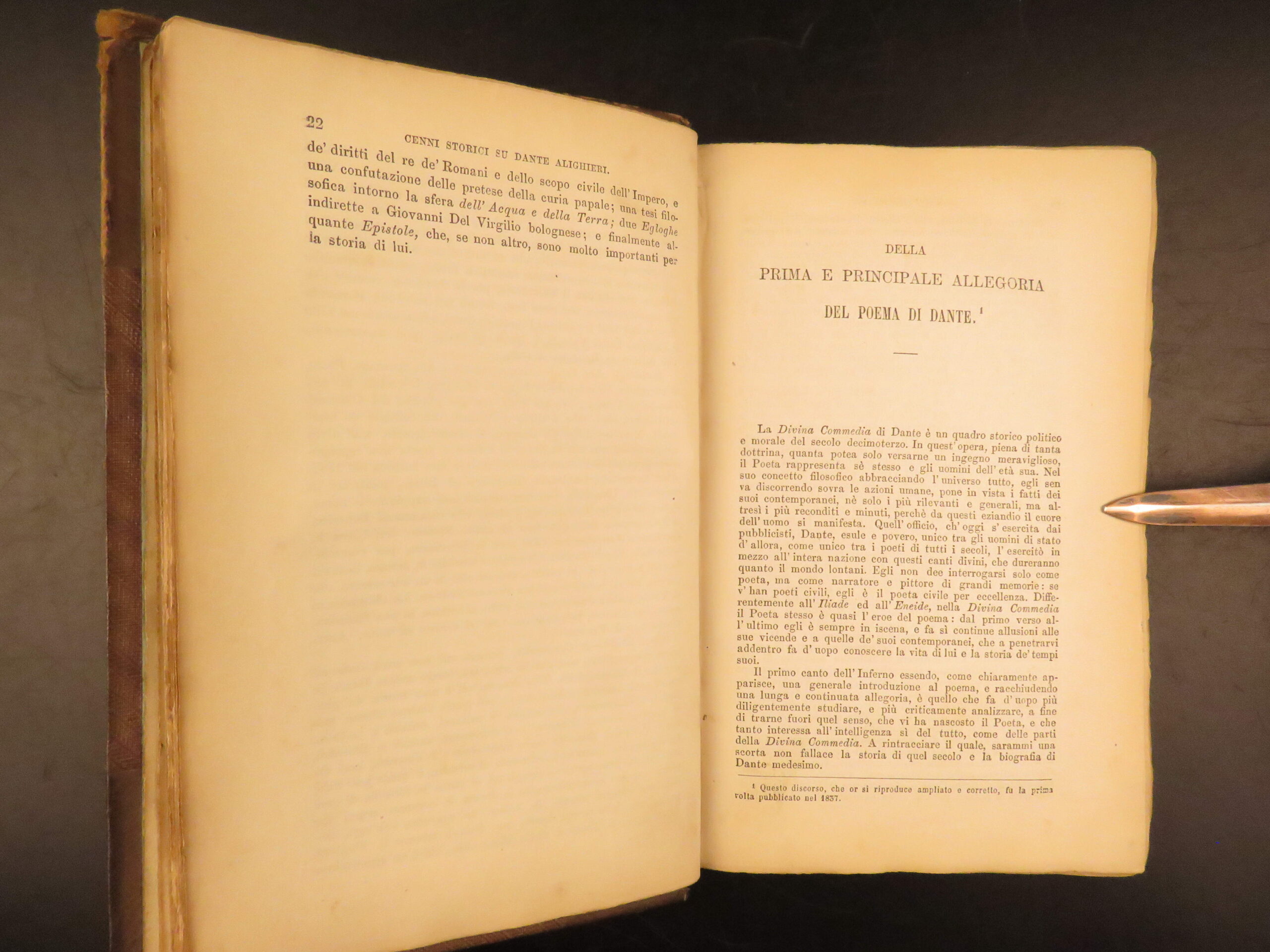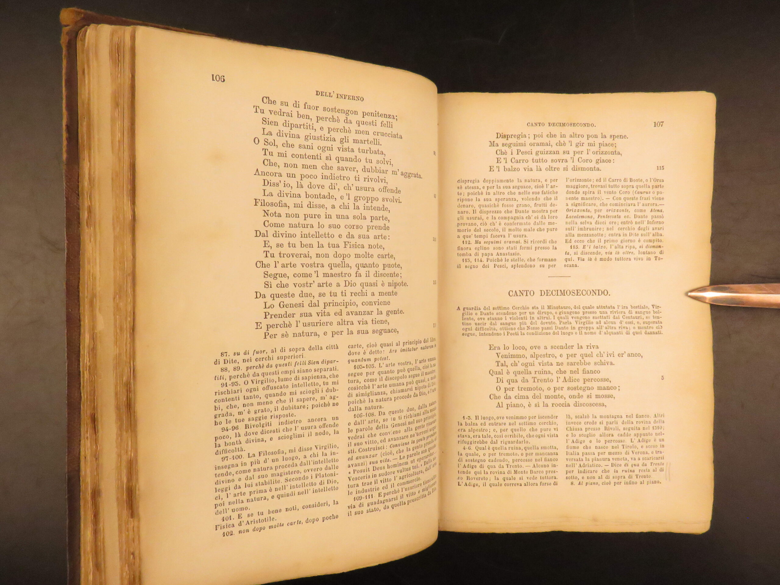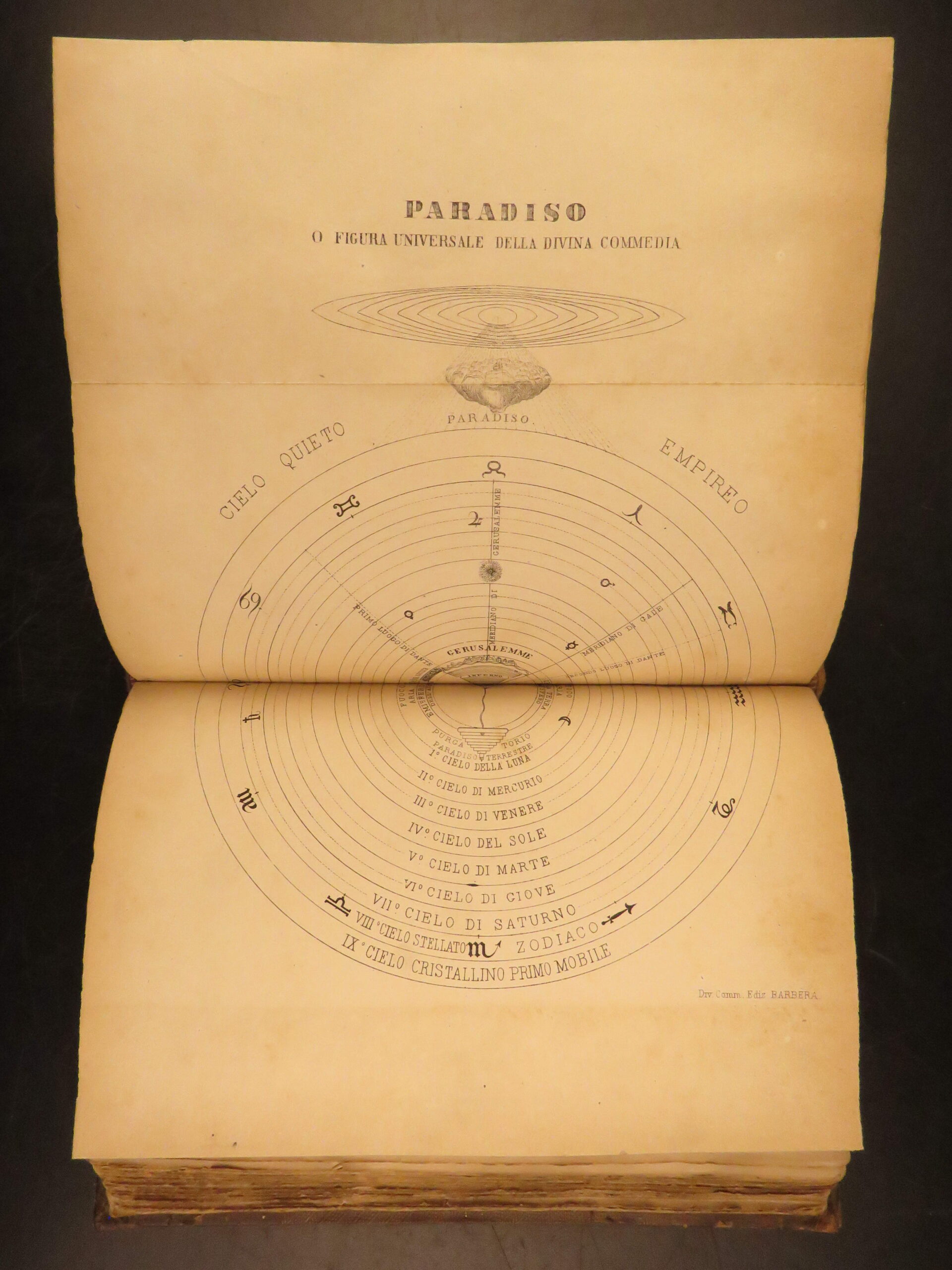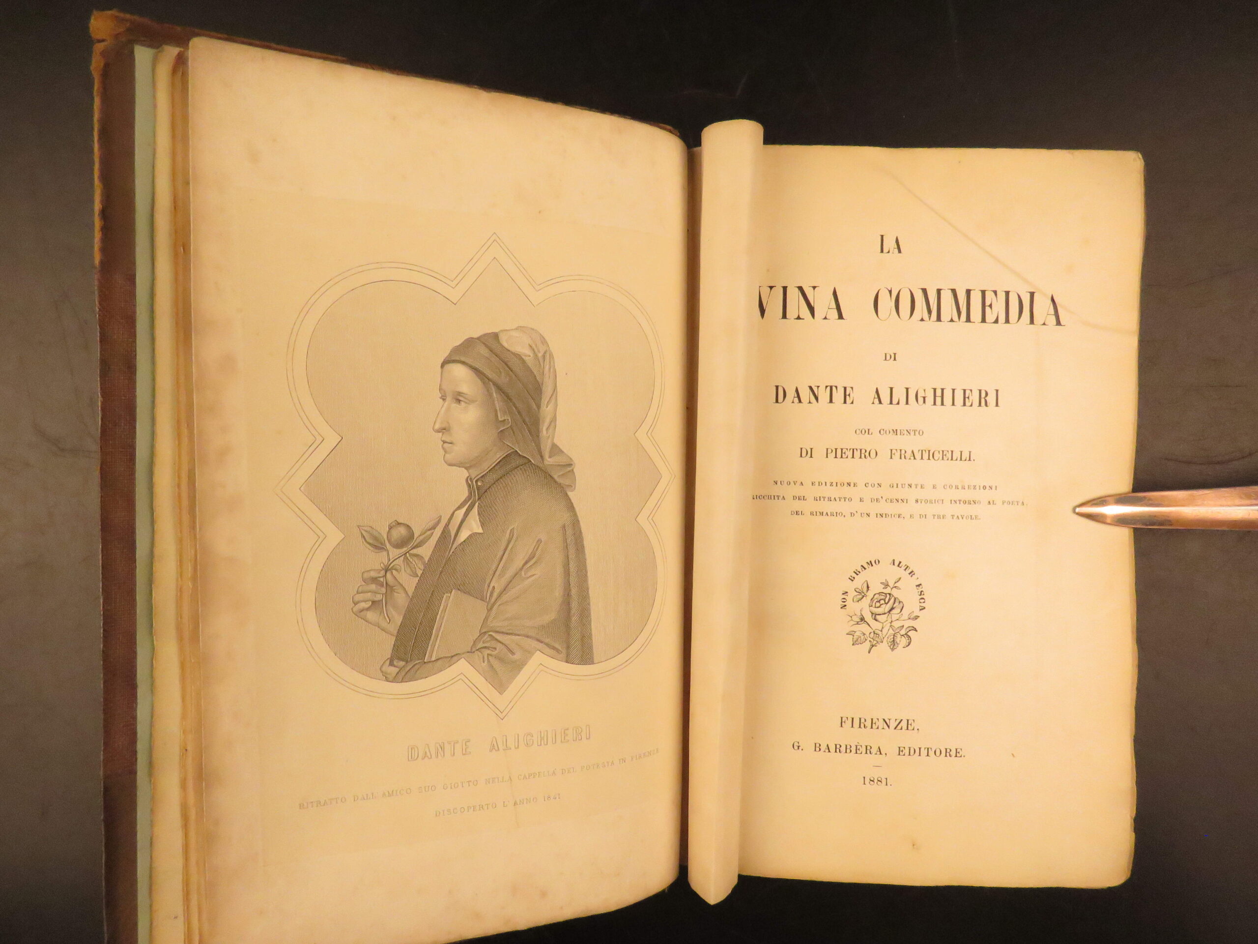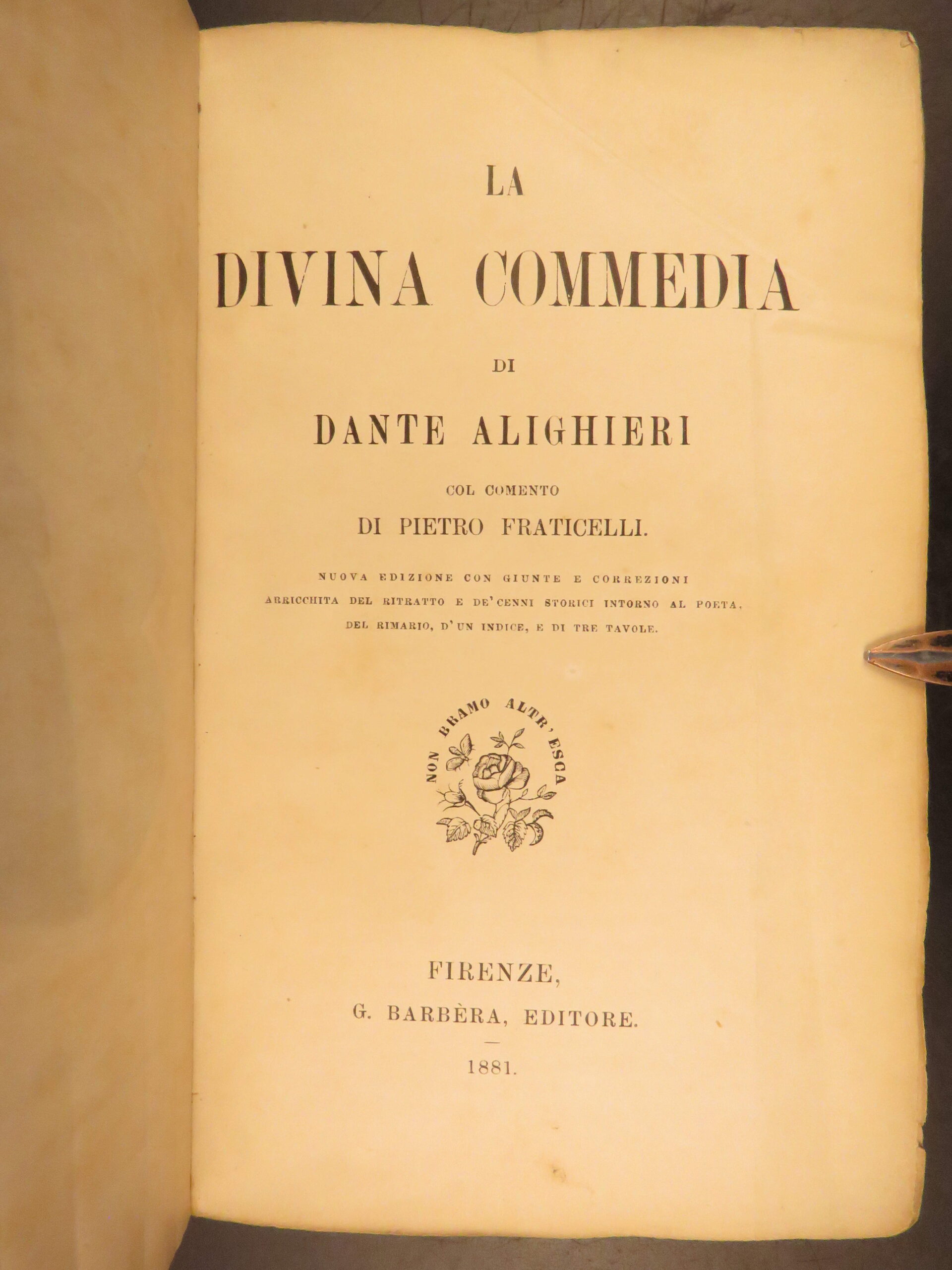 This post-Risorgimento edition of Dante’s La Divina Commedia, 1881 annotated Italian edition with commentary by Pietro Fraticelli, published by G. Barbera in Florence.