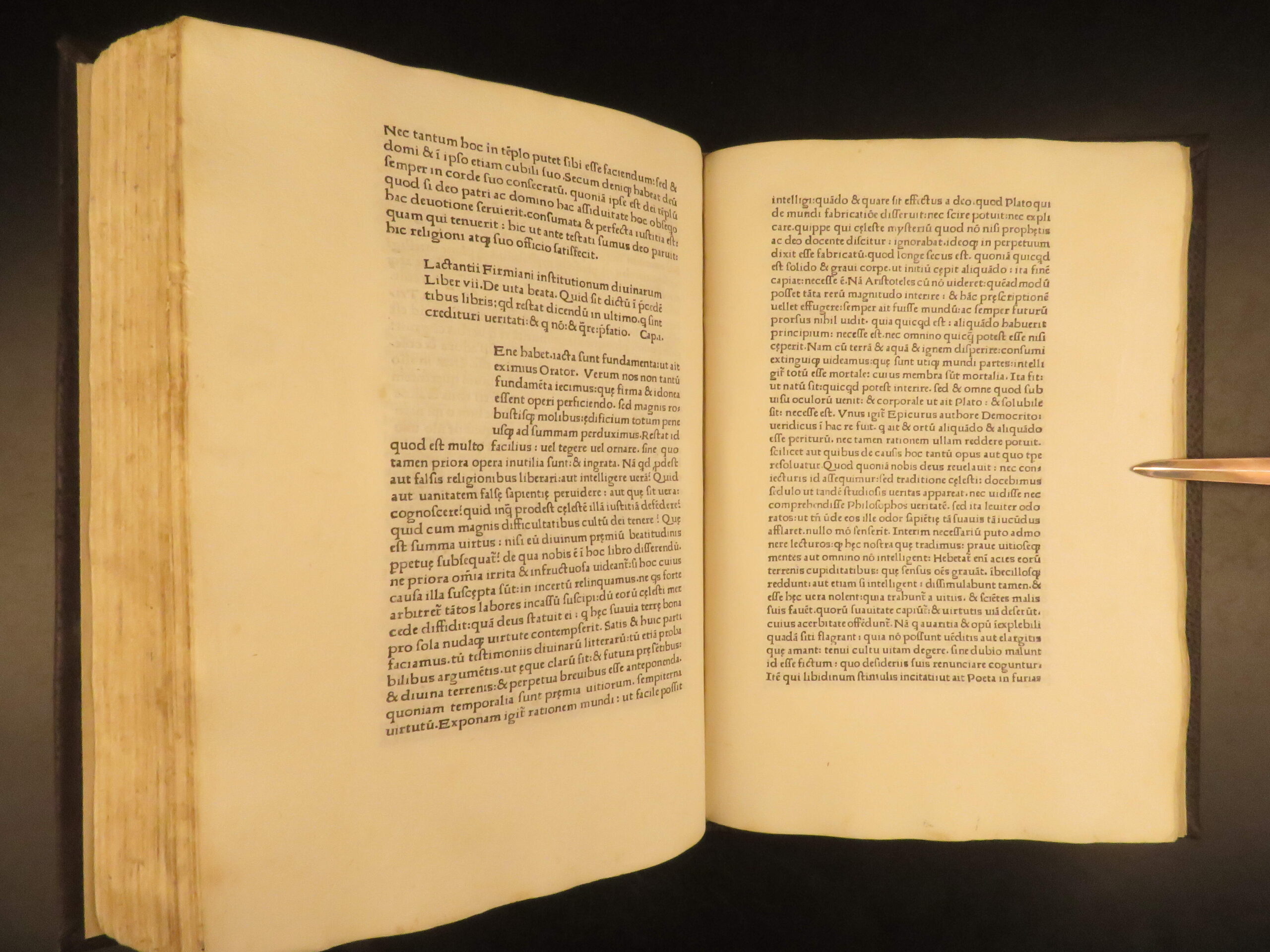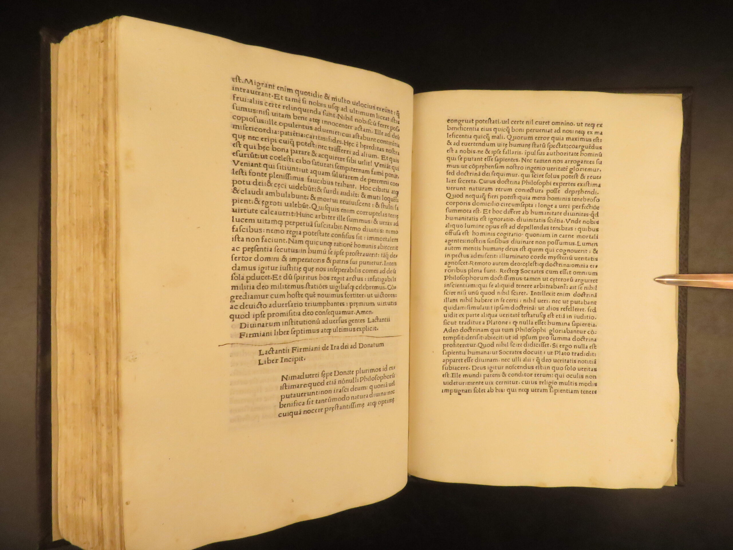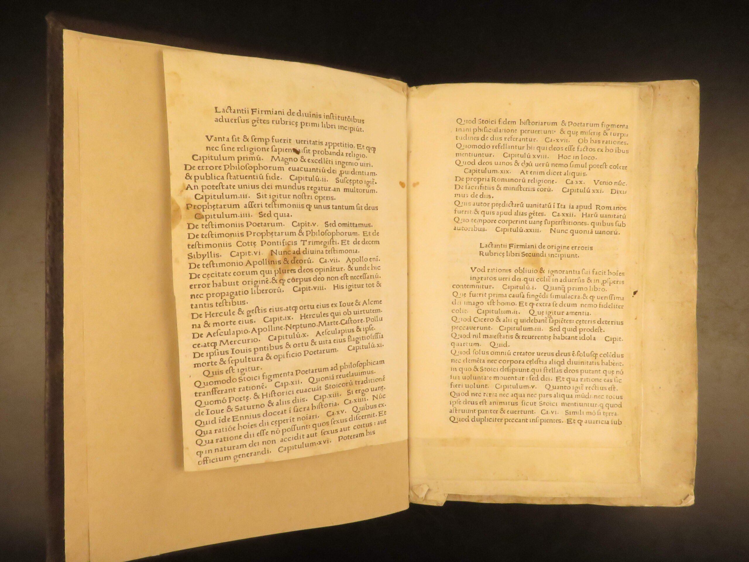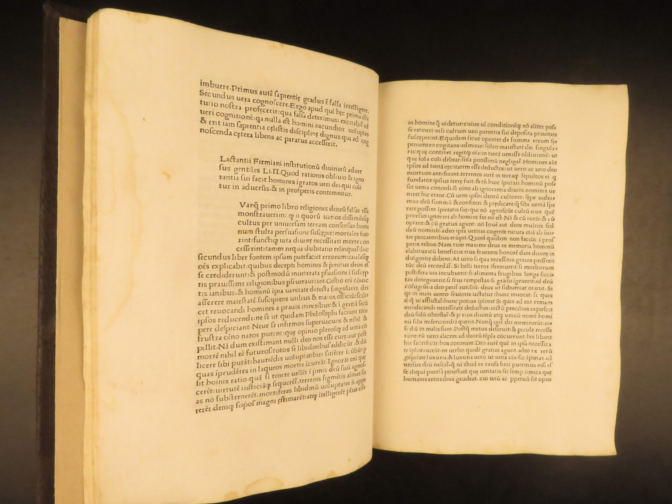 1474 Roman folio incunable of Lactantius’s Divinae Institutiones with De Ira Dei and De Opificio Dei, edited by Angelo Sabino, printed by Ulrich Han and Simon Cardella, 168 of 257 leaves present.