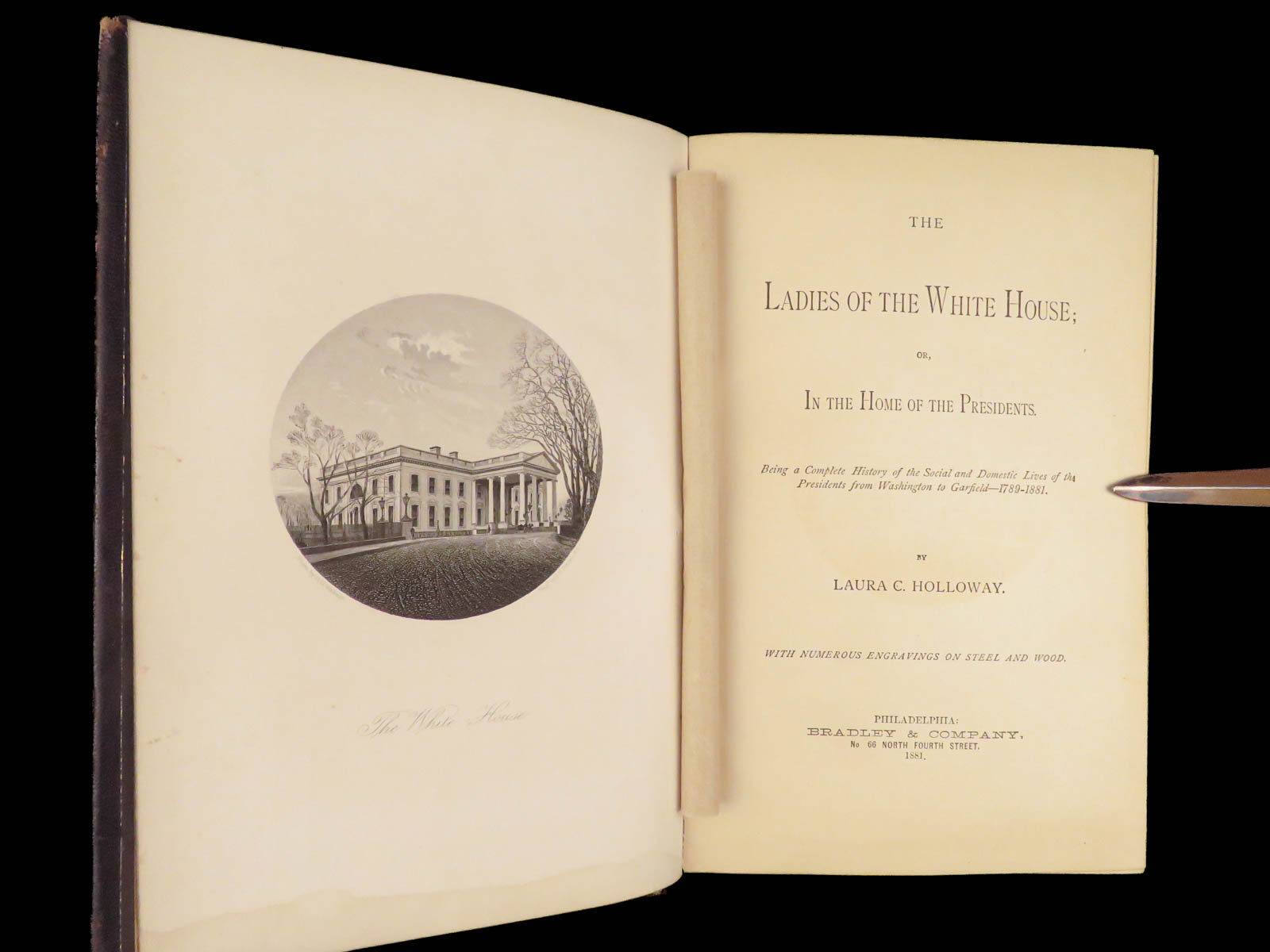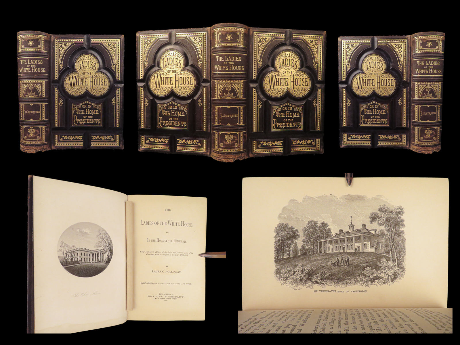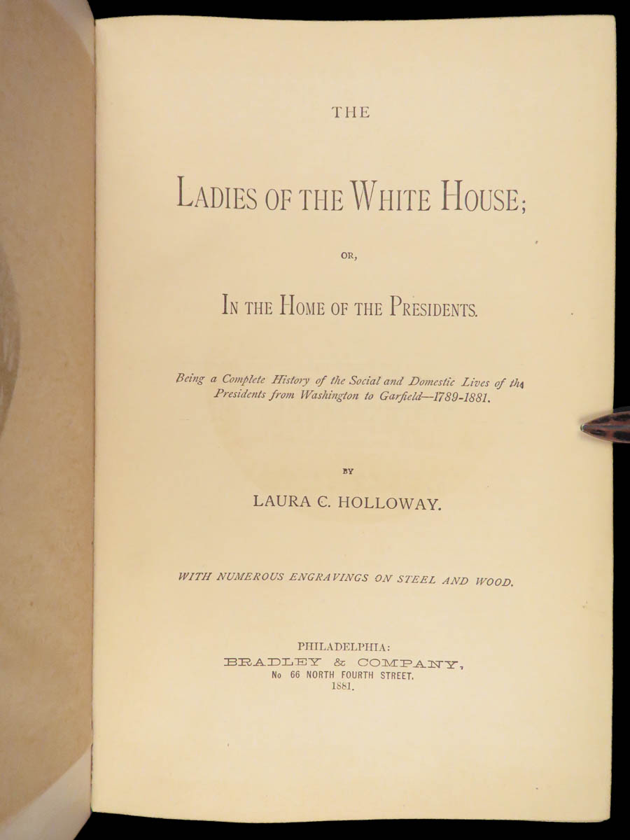 Laura Holloway’s The Ladies of the White House, published in 1881 by Bradley & Garretson in Philadelphia, documents the lives of American First Ladies from Martha Washington to Lucretia Garfield. With content that includes character sketches, domestic anecdotes, and personal correspondence, Holloway sought to familiarize 19th-century readers with the domestic and social influence of Presidents’ wives, with emphasis on their moral virtues and supportive roles as hostesses, advisors, and confidants to the Commander in Chief. Among historians and collectors, the work holds interest for its contribution to the perception of political spouses, especially within the context of postbellum American nationalism and admiration of traditional womanhood.