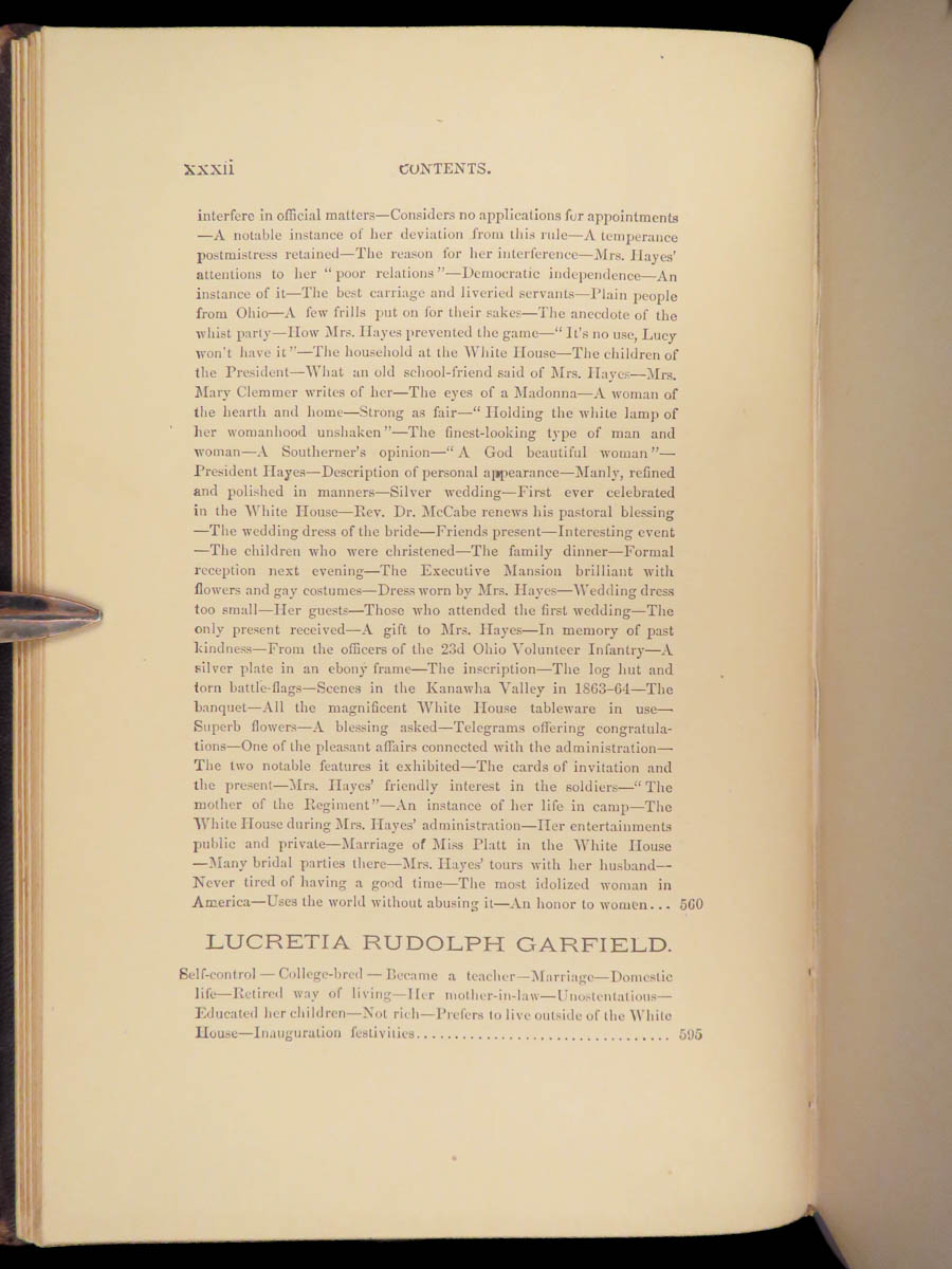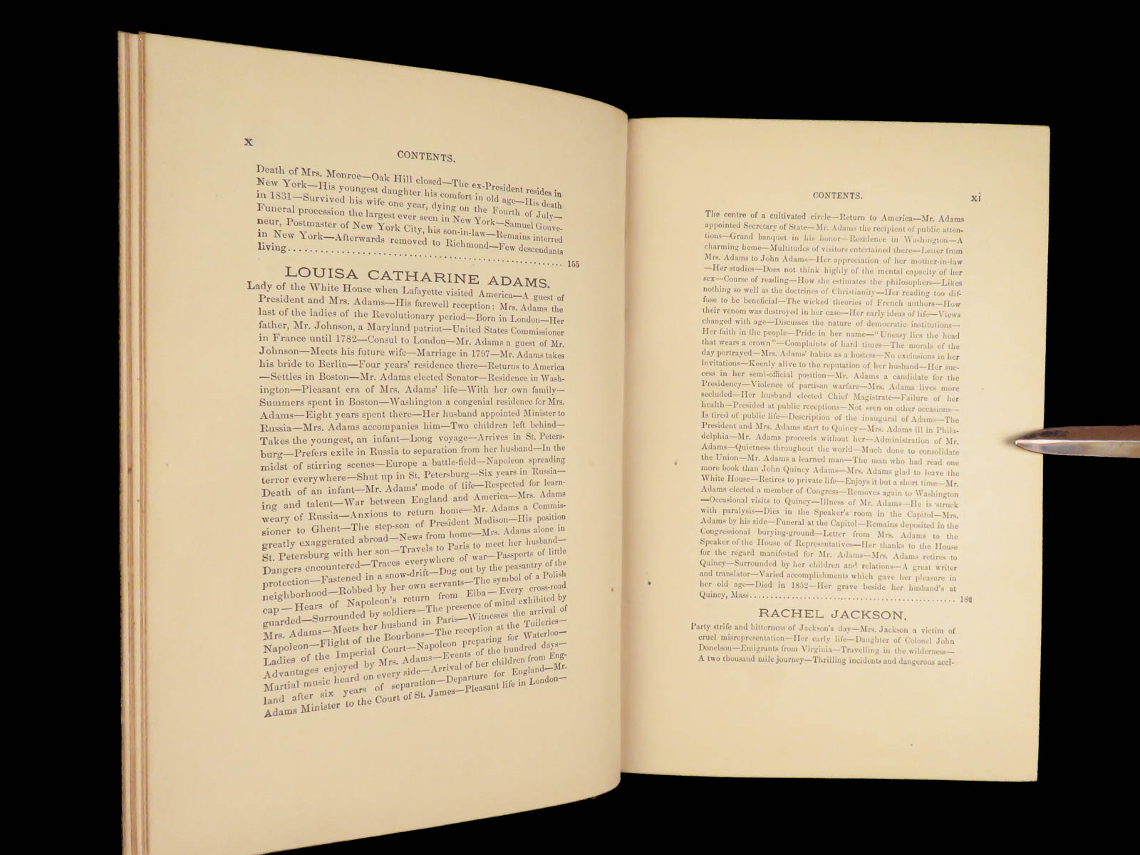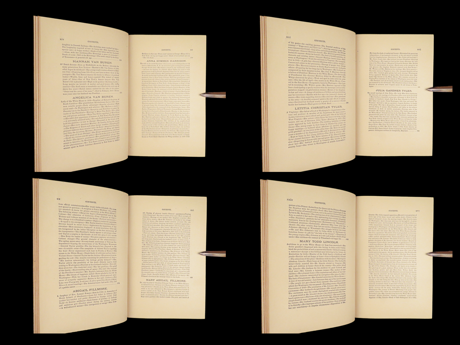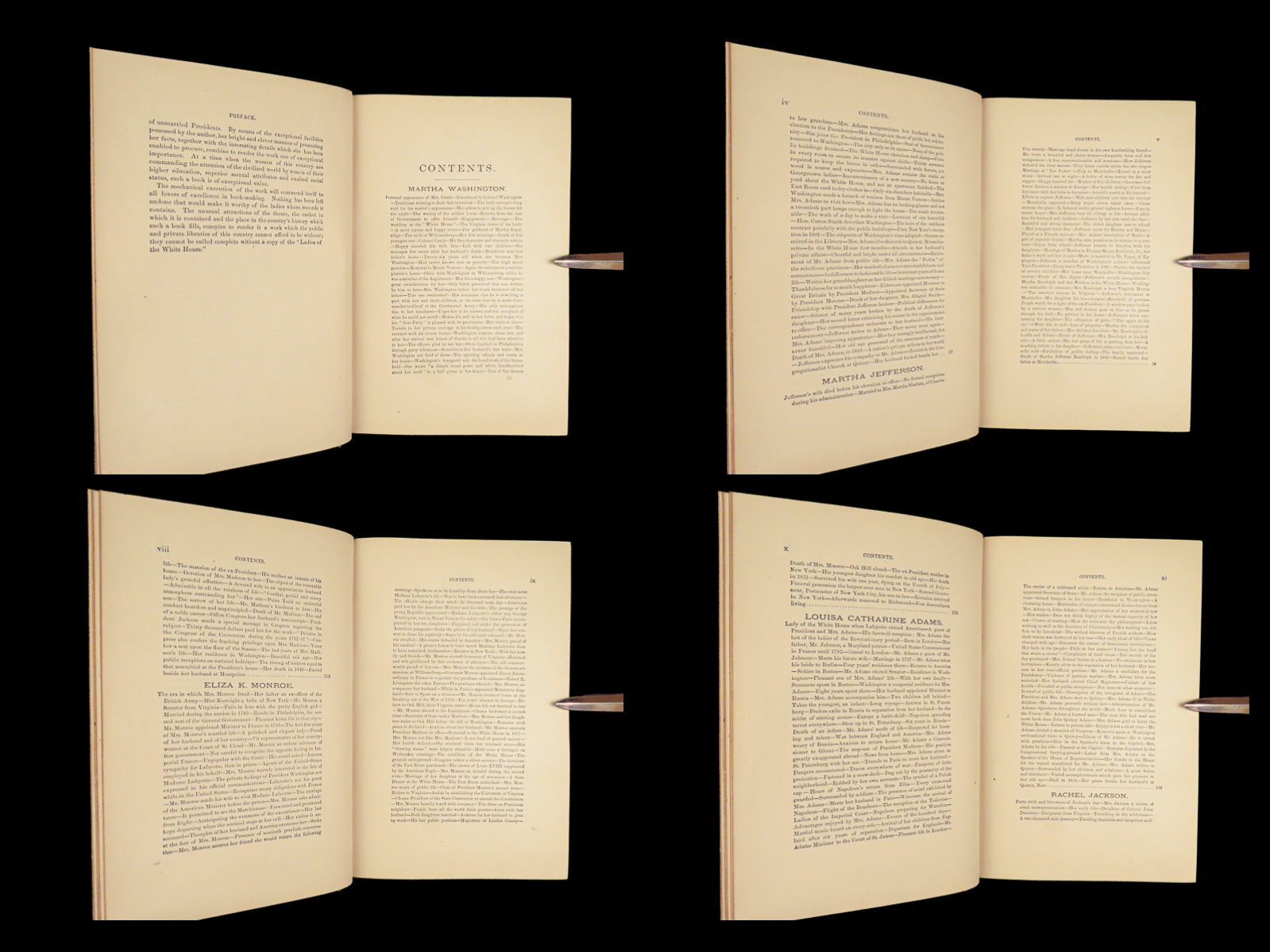 Laura Holloway’s The Ladies of the White House, published in 1881 by Bradley & Garretson in Philadelphia, documents the lives of American First Ladies from Martha Washington to Lucretia Garfield. With content that includes character sketches, domestic anecdotes, and personal correspondence, Holloway sought to familiarize 19th-century readers with the domestic and social influence of Presidents’ wives, with emphasis on their moral virtues and supportive roles as hostesses, advisors, and confidants to the Commander in Chief. Among historians and collectors, the work holds interest for its contribution to the perception of political spouses, especially within the context of postbellum American nationalism and admiration of traditional womanhood.