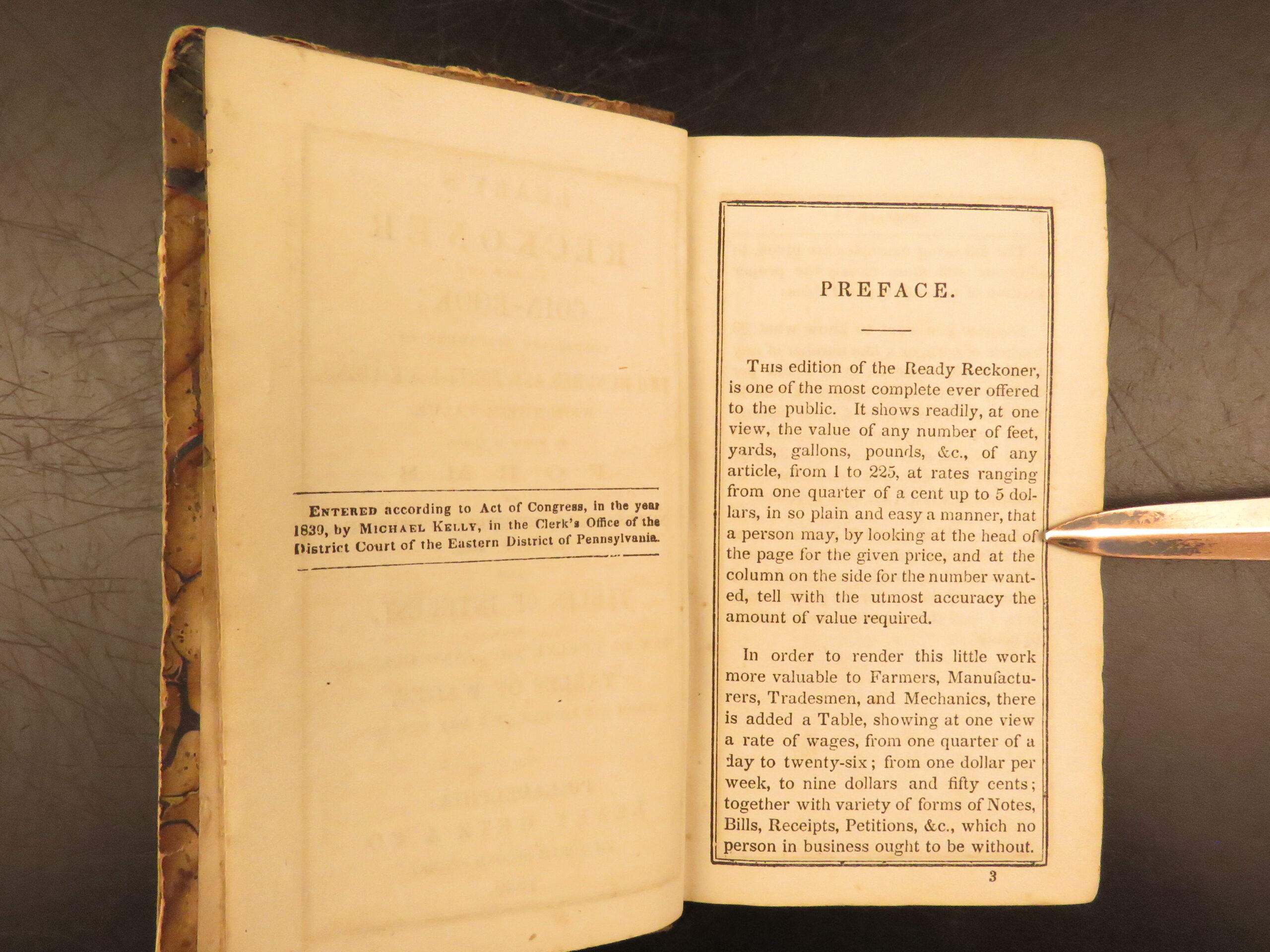 Leary’s Reckoner and Coin-Book was a 19th-century pocket merchant’s reference. This book, which was originally written by Michael Kelly in 1839 under the title Complete Ready Reckoner in Dollars and Cents contains tables for rapid dollar and cent calculations along with descriptions of 244 separate coins and their values. The illustrations of coins make this book highly desirable even today.