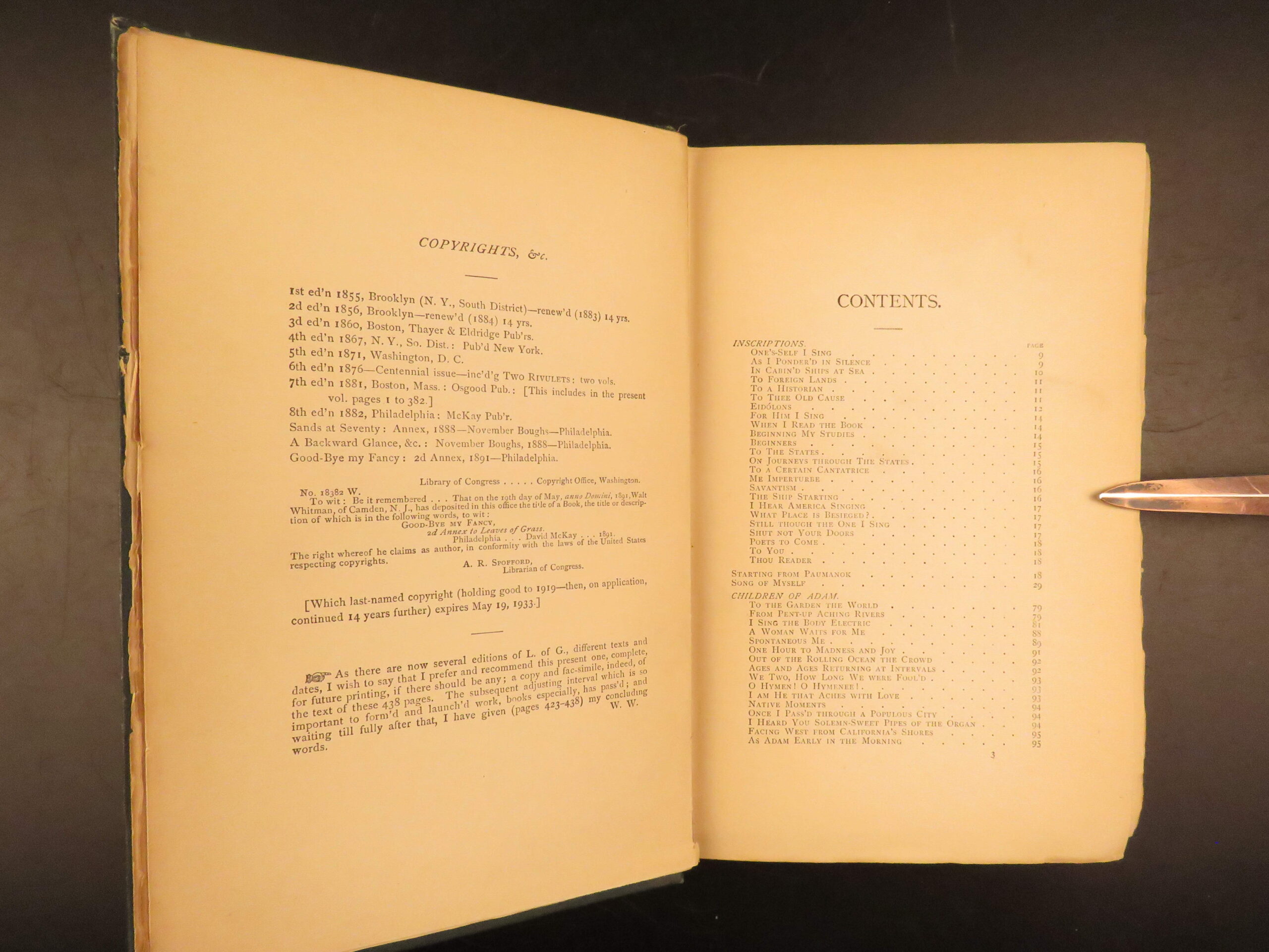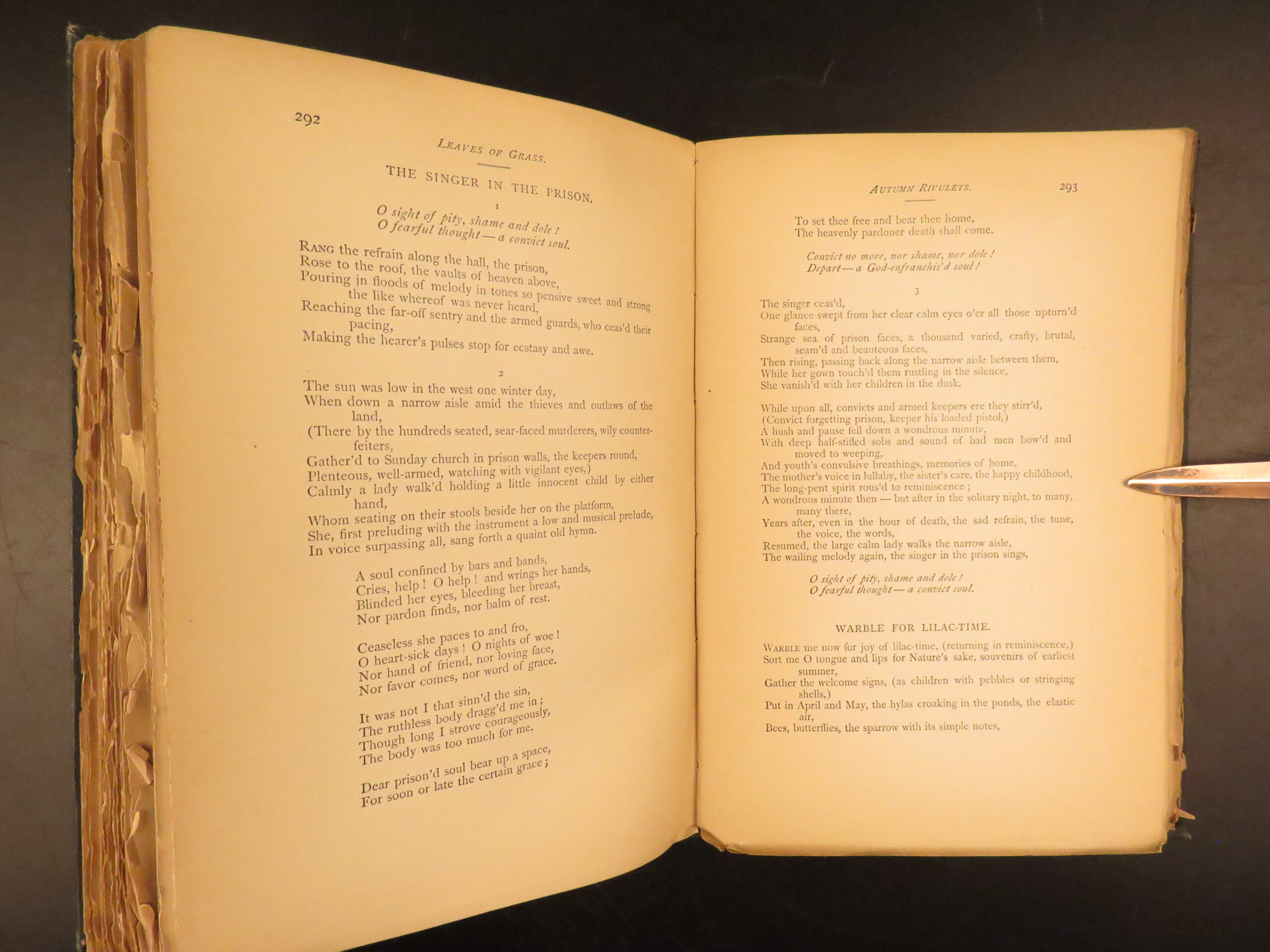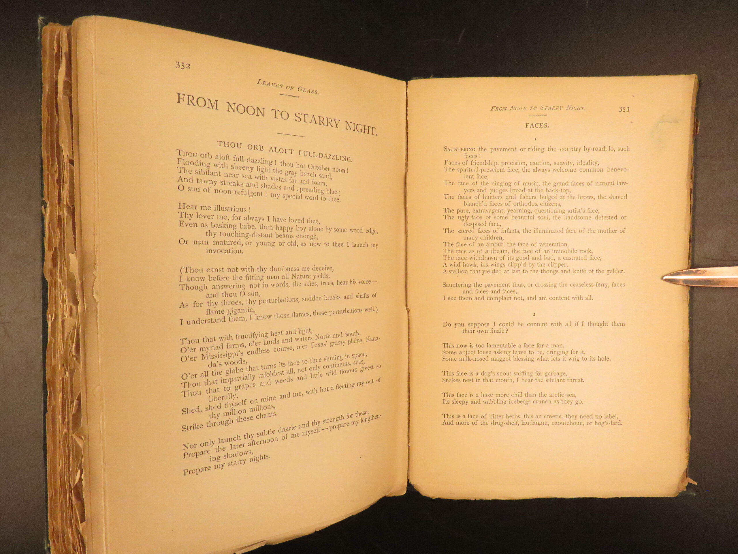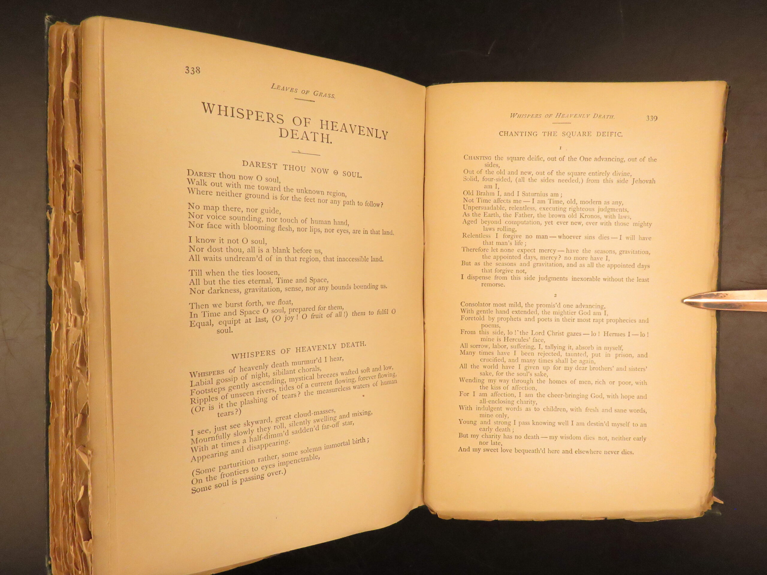 Walt Whitman is among the most influential poets in the American canon and is often called the father of free verse. His work, especially “Leaves of Grass”, was very controversial in its time due to its contents containing overt sexuality. This 1894 edition, is a rare reissue of the 1892 complete “Deathbed Edition” was printed with all of Whitman’s final changes. It is a piece that features some of Whitman’s most notable poems, including: