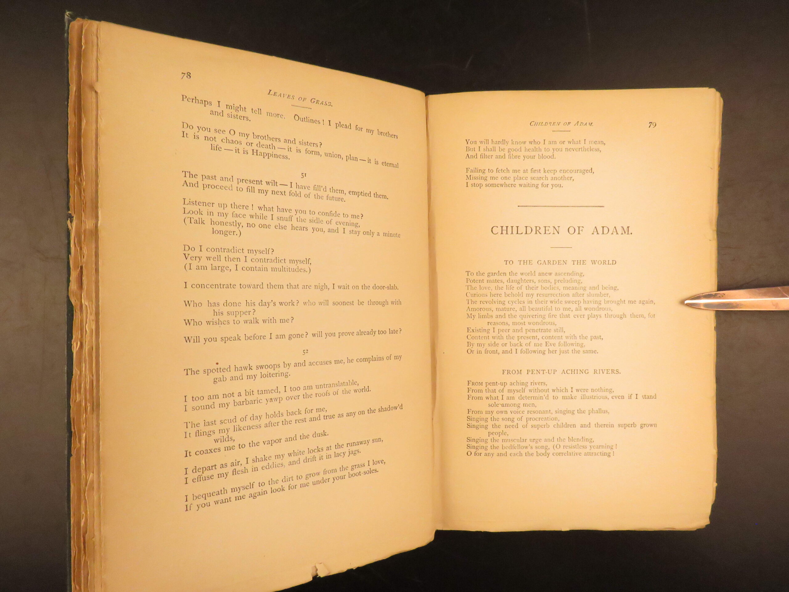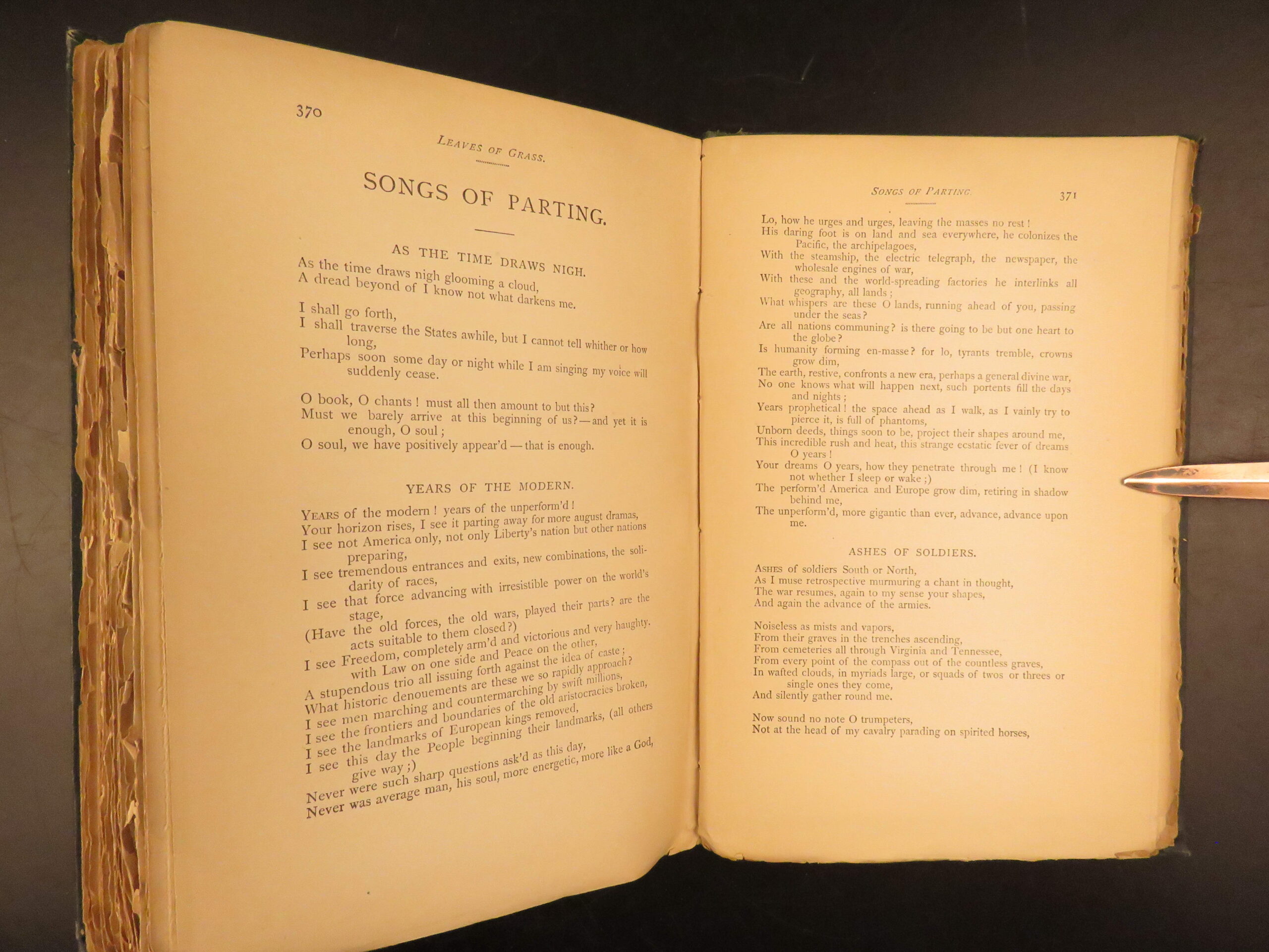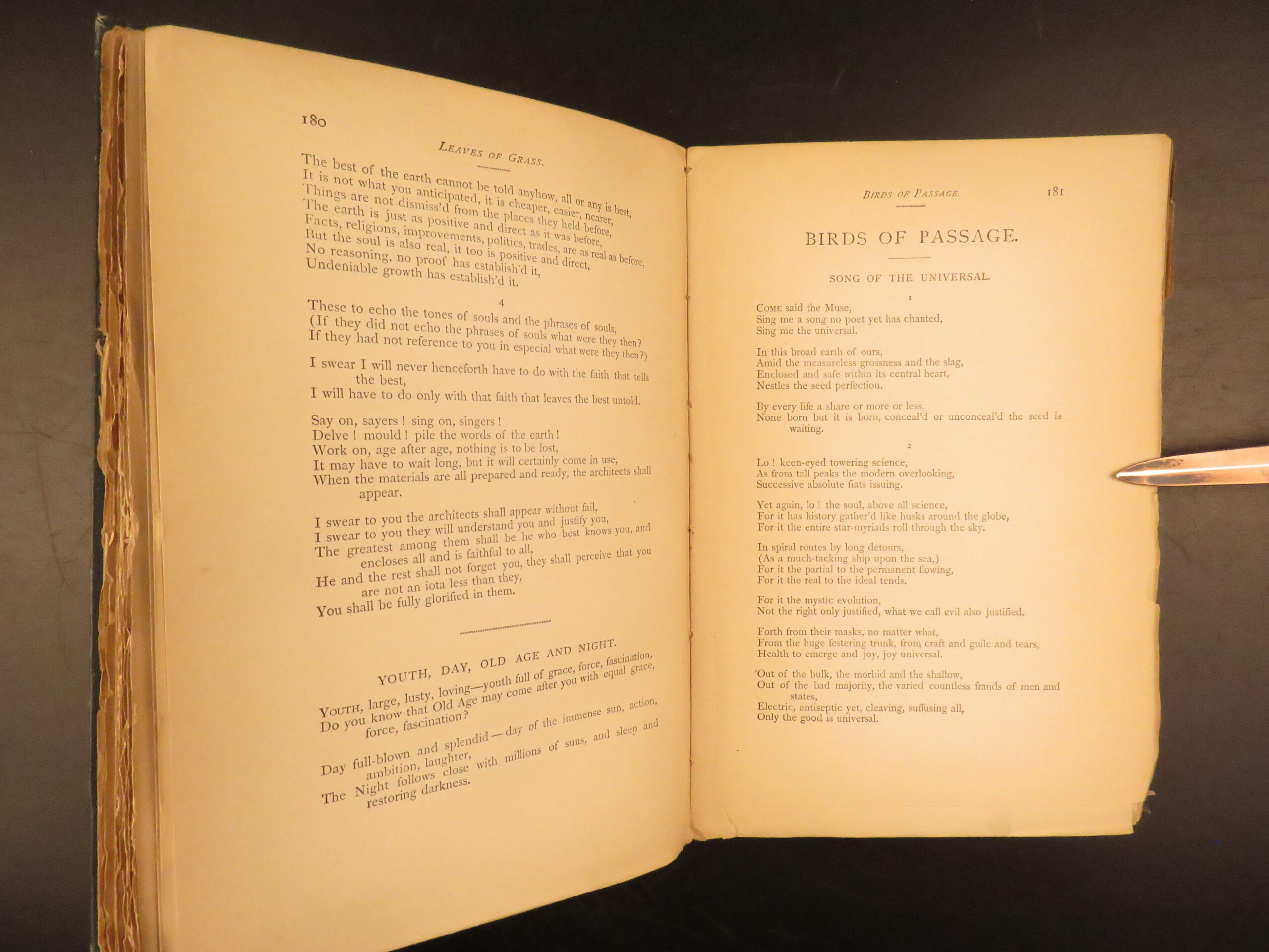 Walt Whitman is among the most influential poets in the American canon and is often called the father of free verse. His work, especially “Leaves of Grass”, was very controversial in its time due to its contents containing overt sexuality. This 1894 edition, is a rare reissue of the 1892 complete “Deathbed Edition” was printed with all of Whitman’s final changes. It is a piece that features some of Whitman’s most notable poems, including: