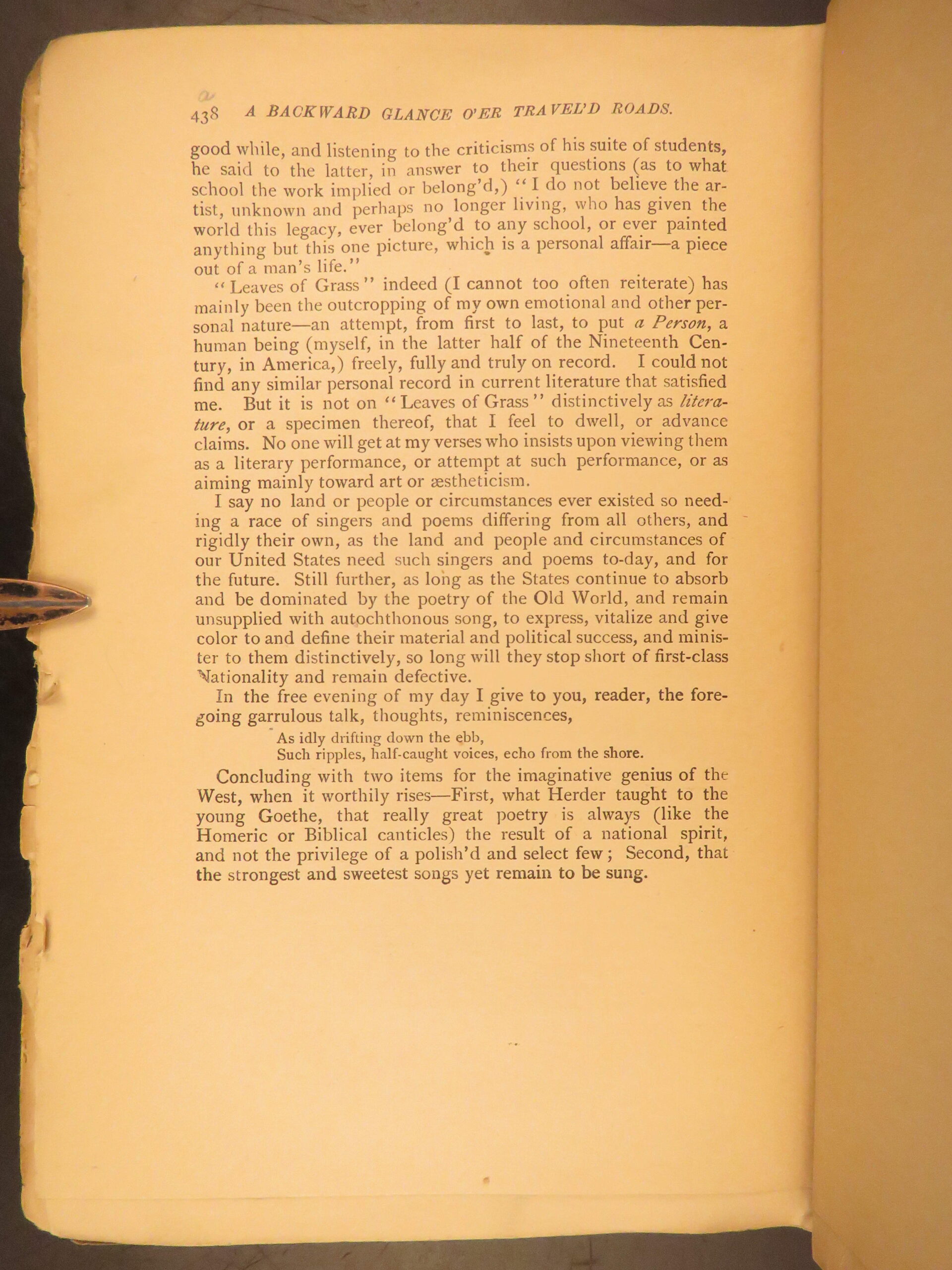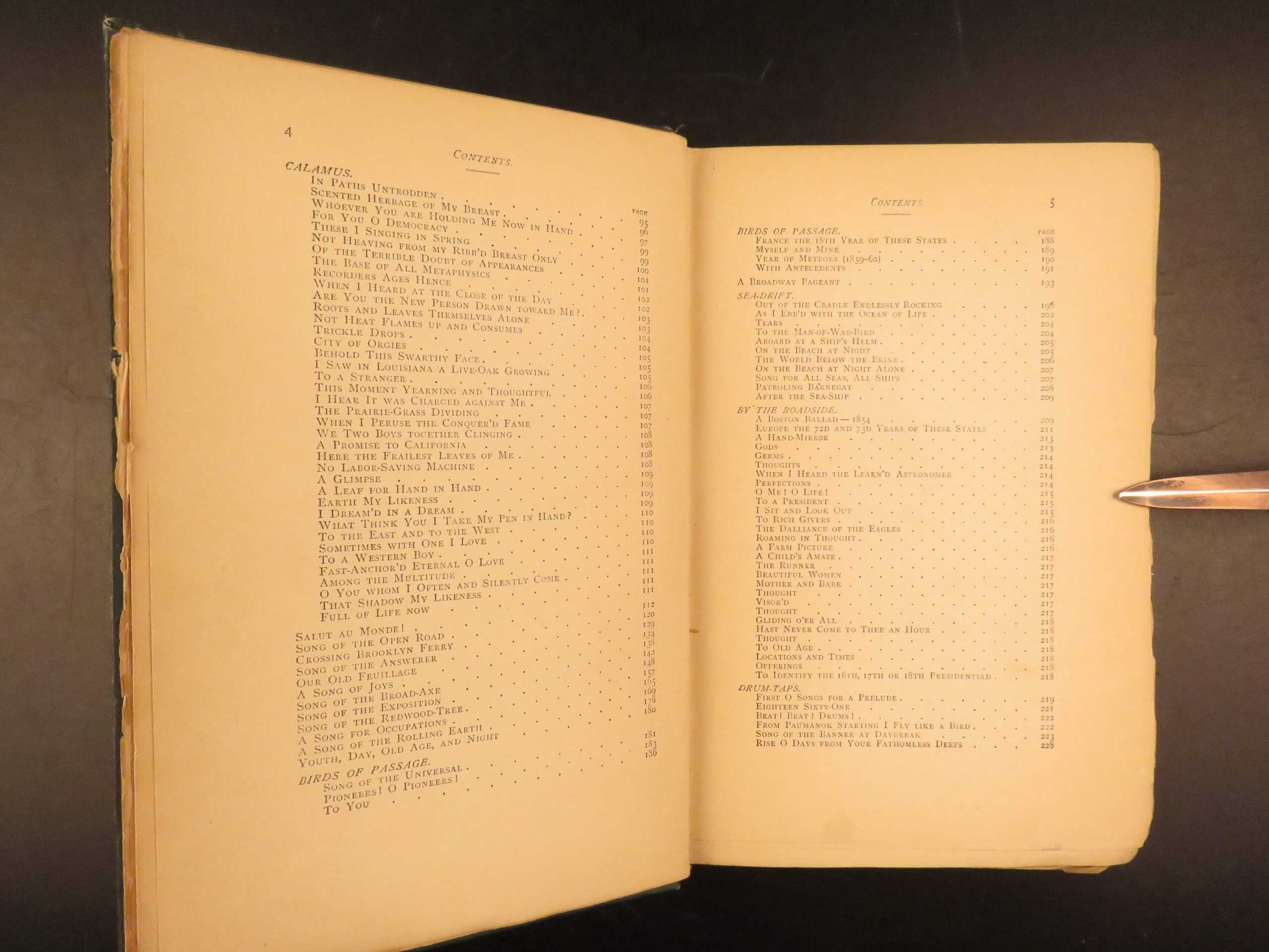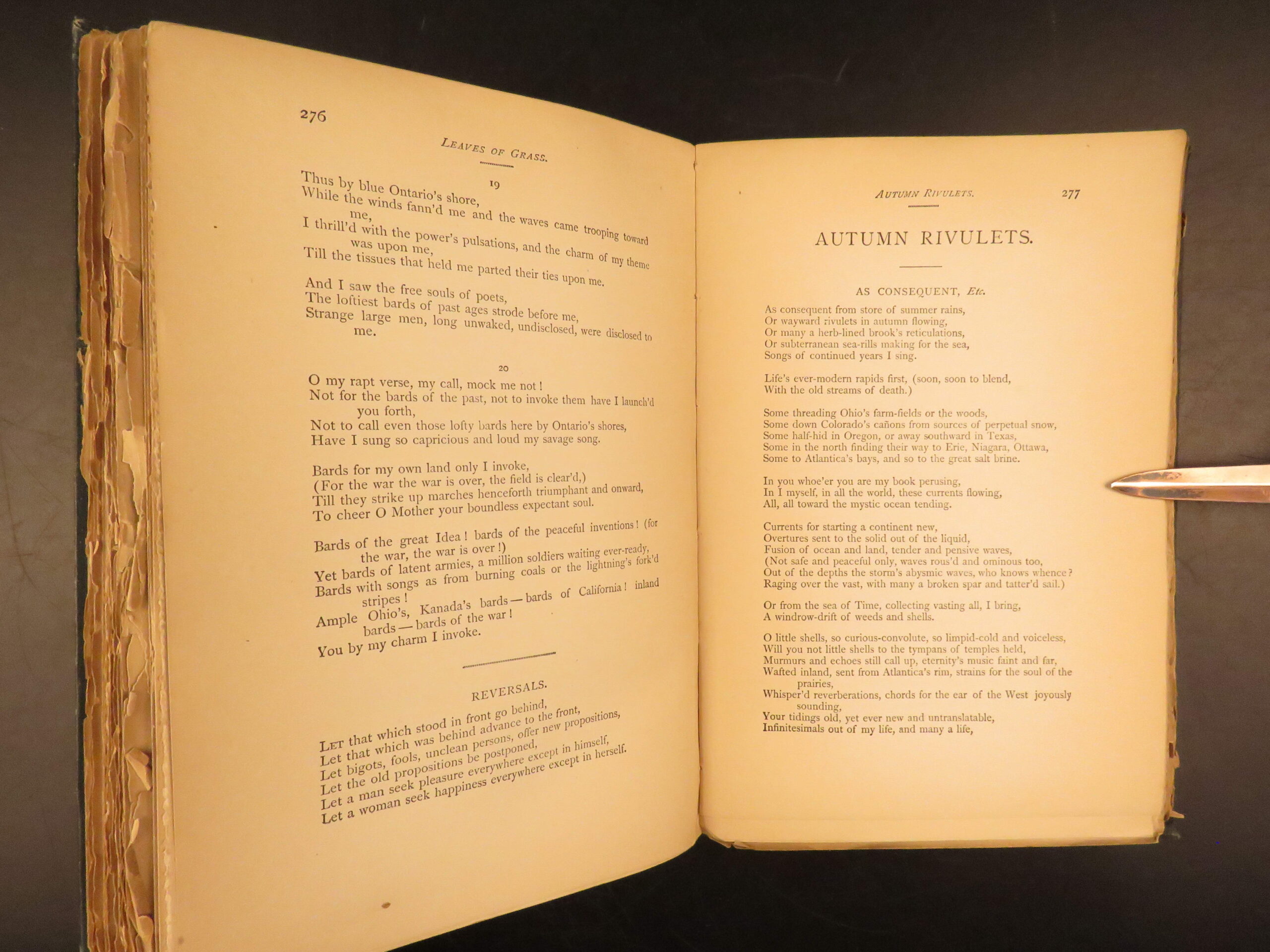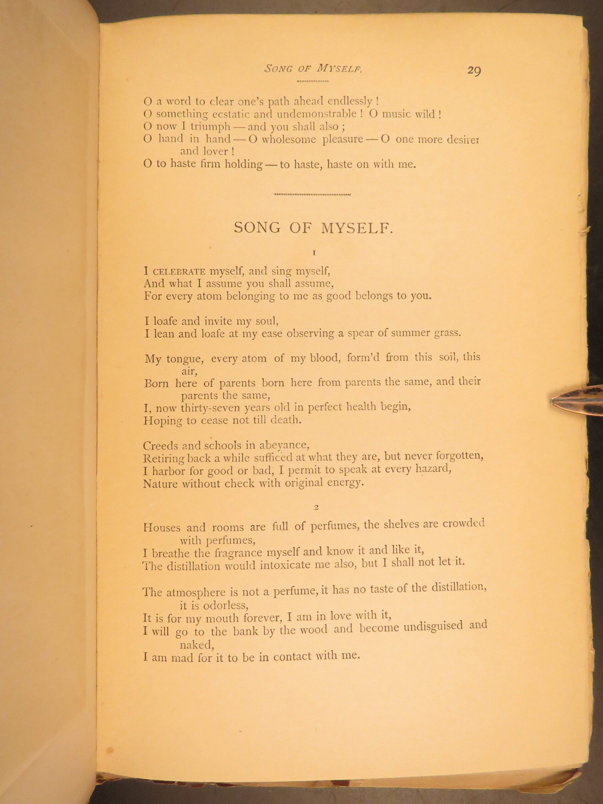 Walt Whitman is among the most influential poets in the American canon and is often called the father of free verse. His work, especially “Leaves of Grass”, was very controversial in its time due to its contents containing overt sexuality. This 1894 edition, is a rare reissue of the 1892 complete “Deathbed Edition” was printed with all of Whitman’s final changes. It is a piece that features some of Whitman’s most notable poems, including: