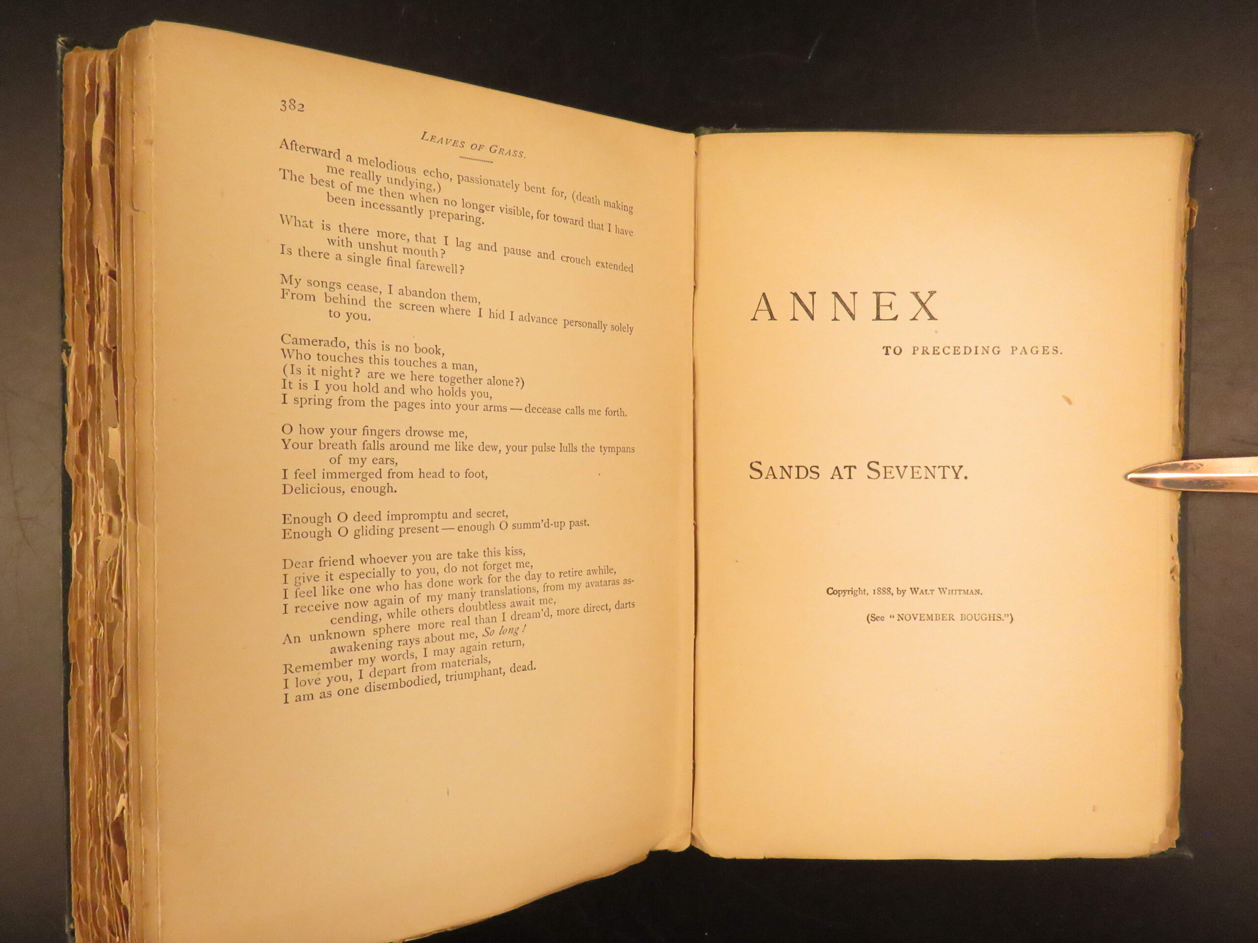 Walt Whitman, Leaves of Grass, 1894, reissue of the “deathbed” text with late annexes; original green hardcover with uncut edges.