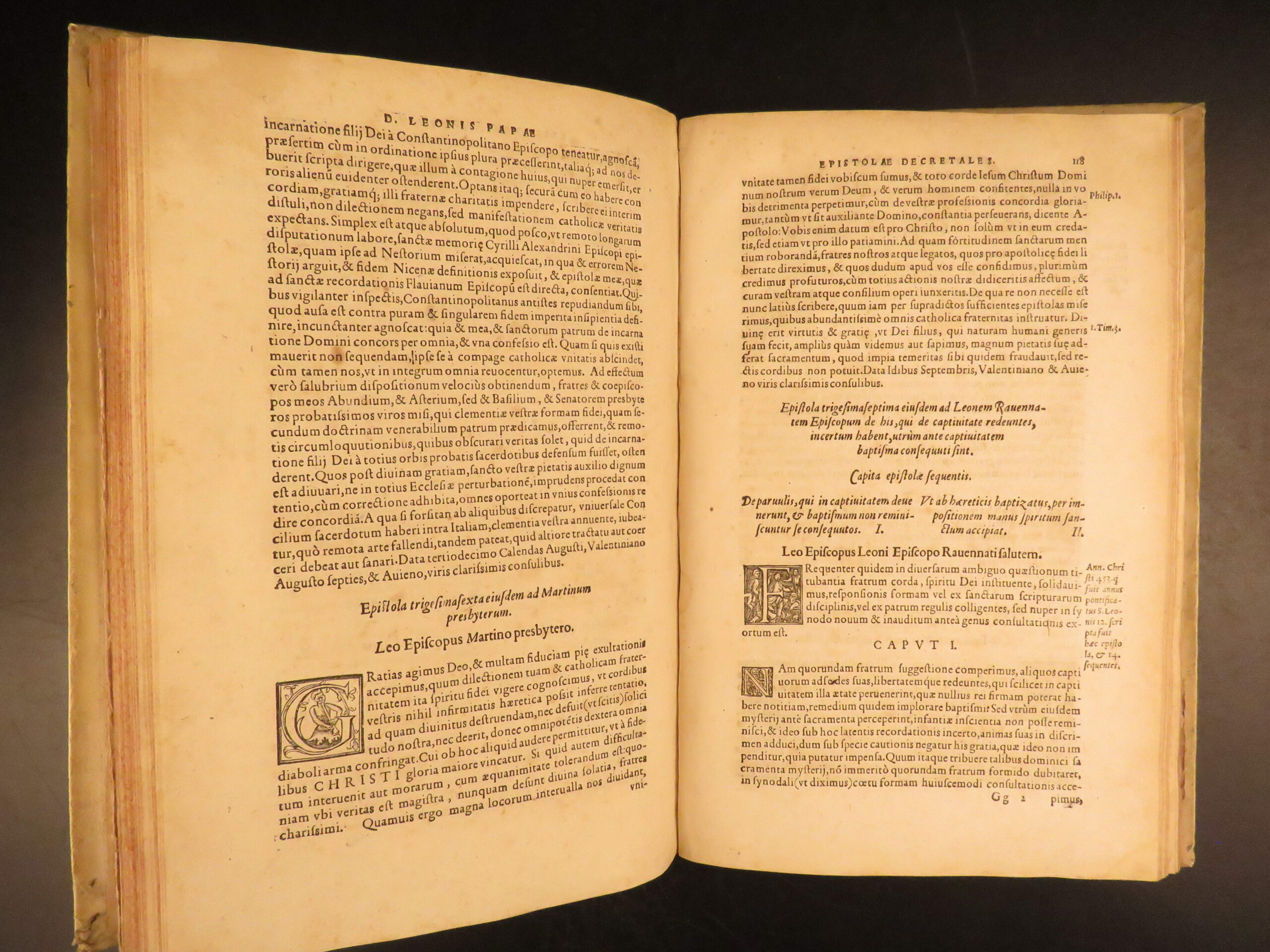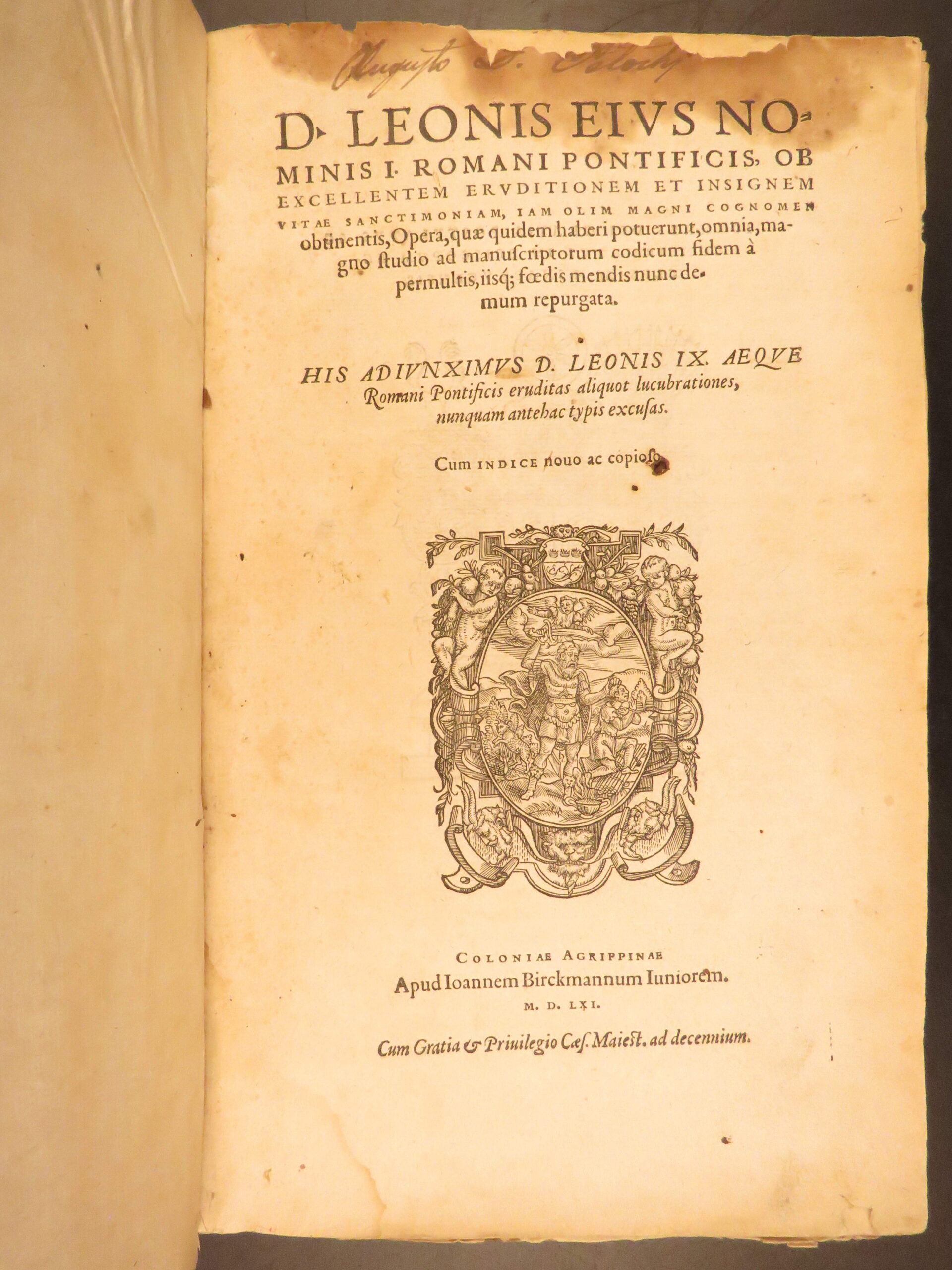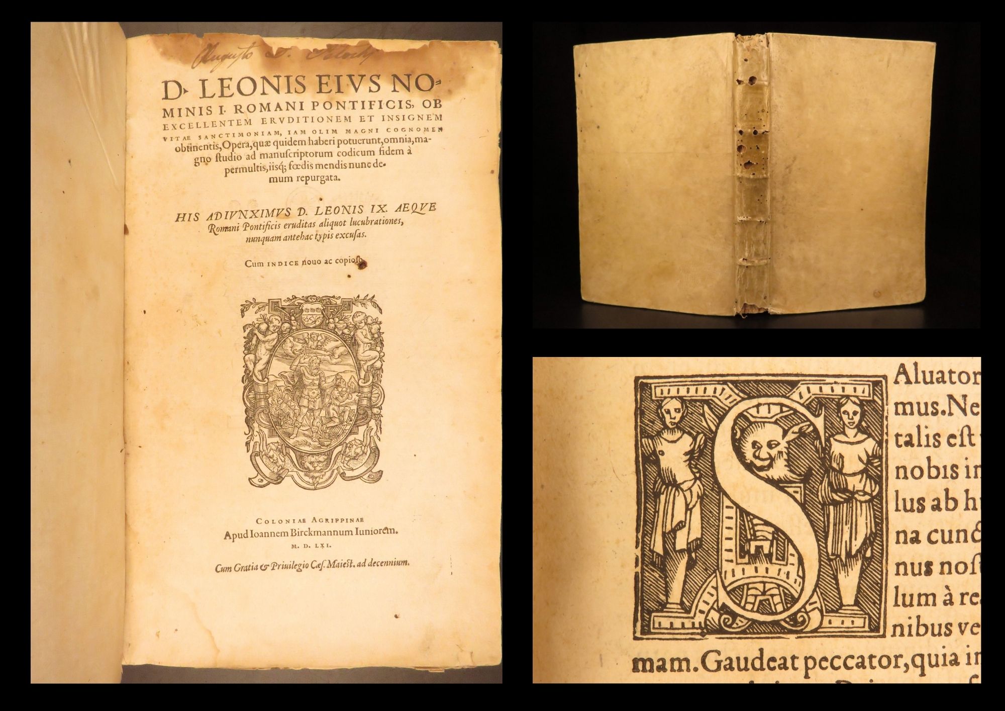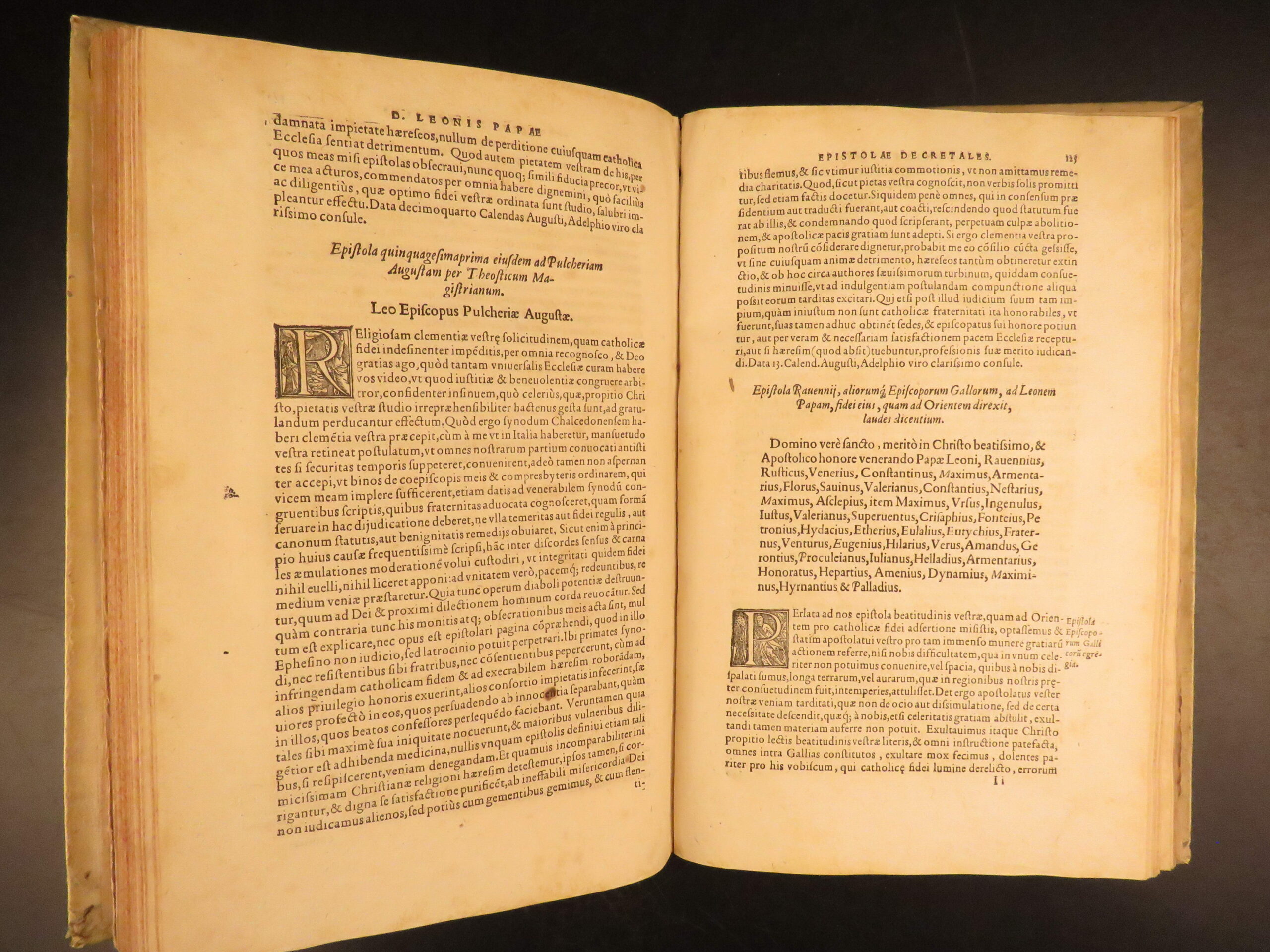 The works of Pope Leo I, edited by Laurentius Surius, was published in 1561. This collection of works is one of the foundational works of Roman Catholic theology and doctrine. These 5th-century letters and writings include the famous Tome to Flavian, correspondence on the Manichaean heresy, decrees from the Council of Chalcedon, as well as countless other letters and treatises. Note the original full-vellum binding for this impressive folio.