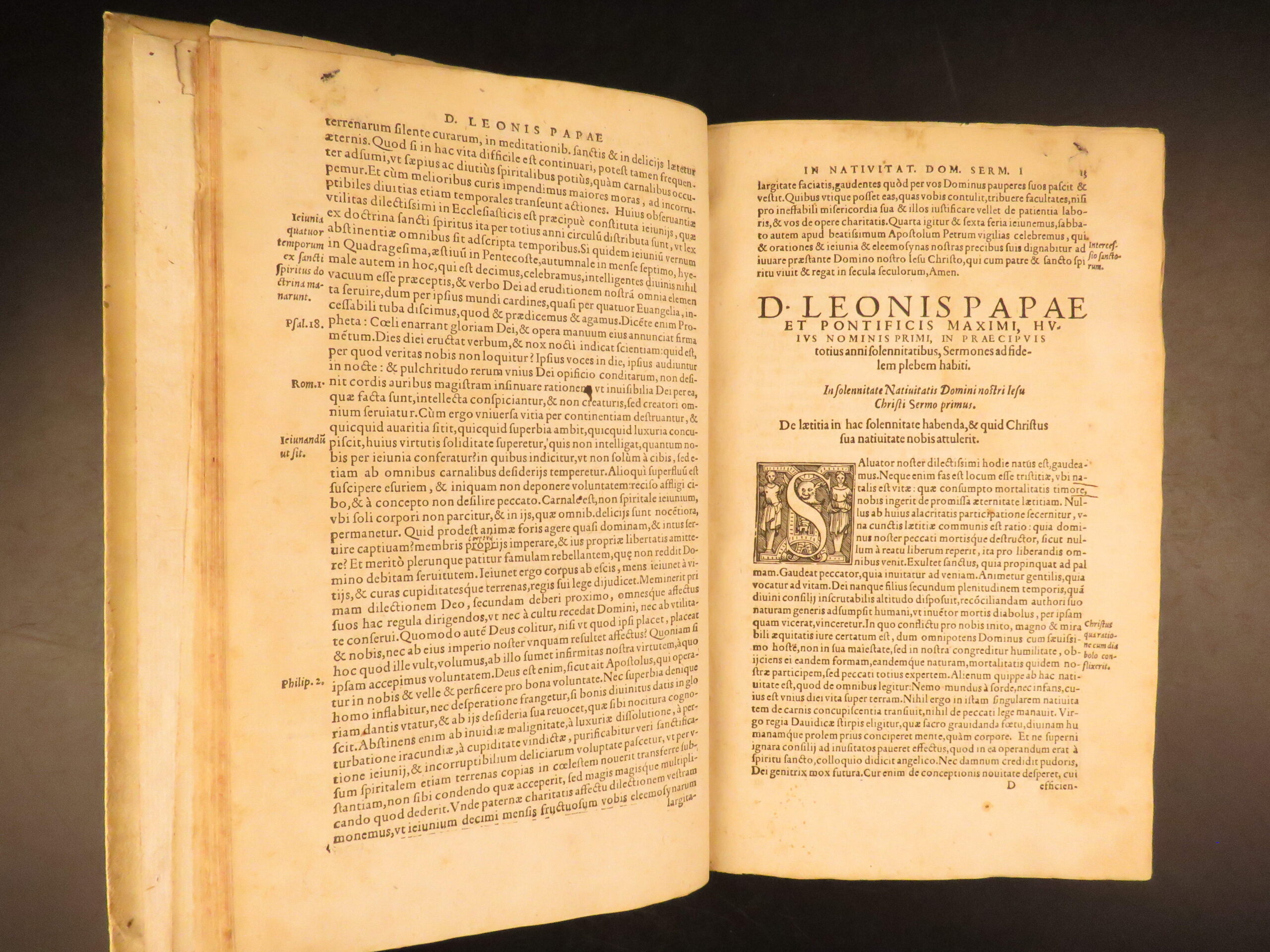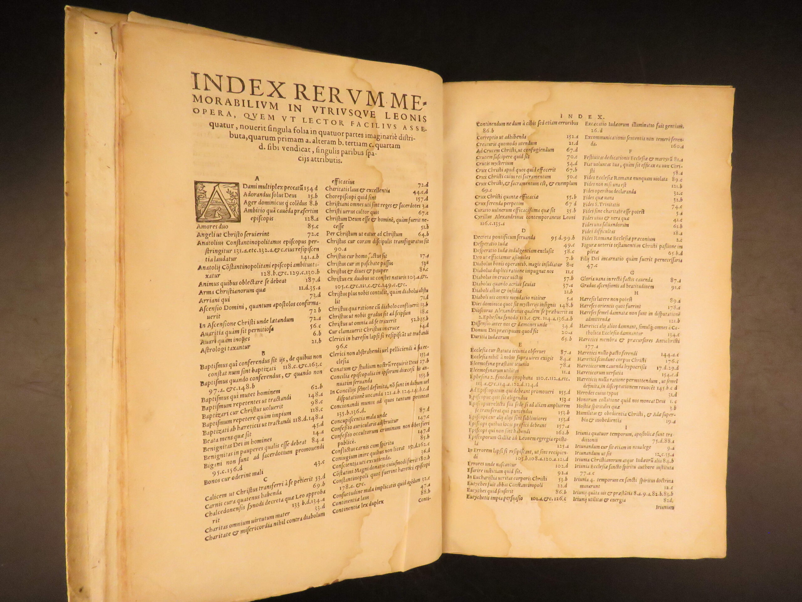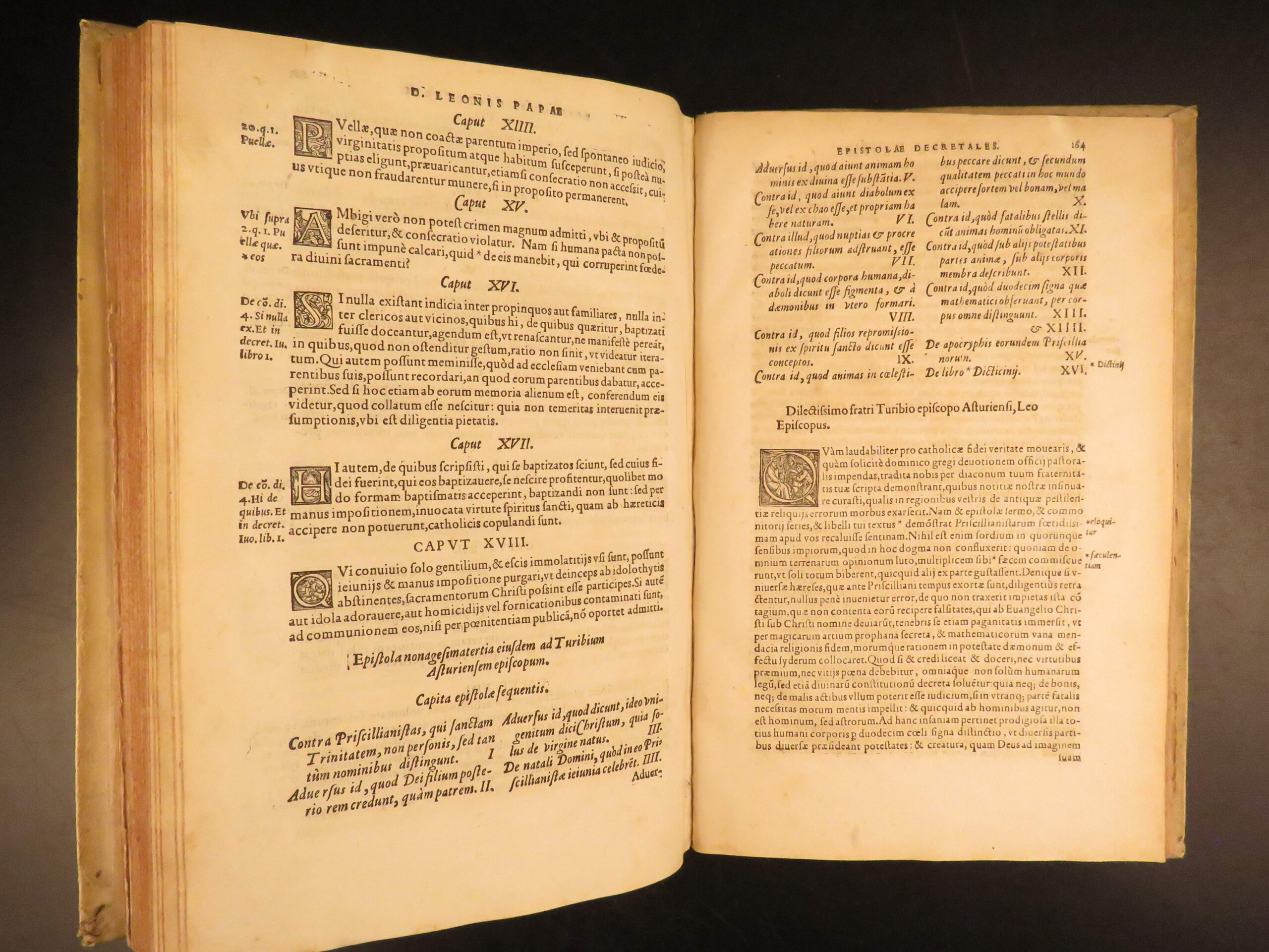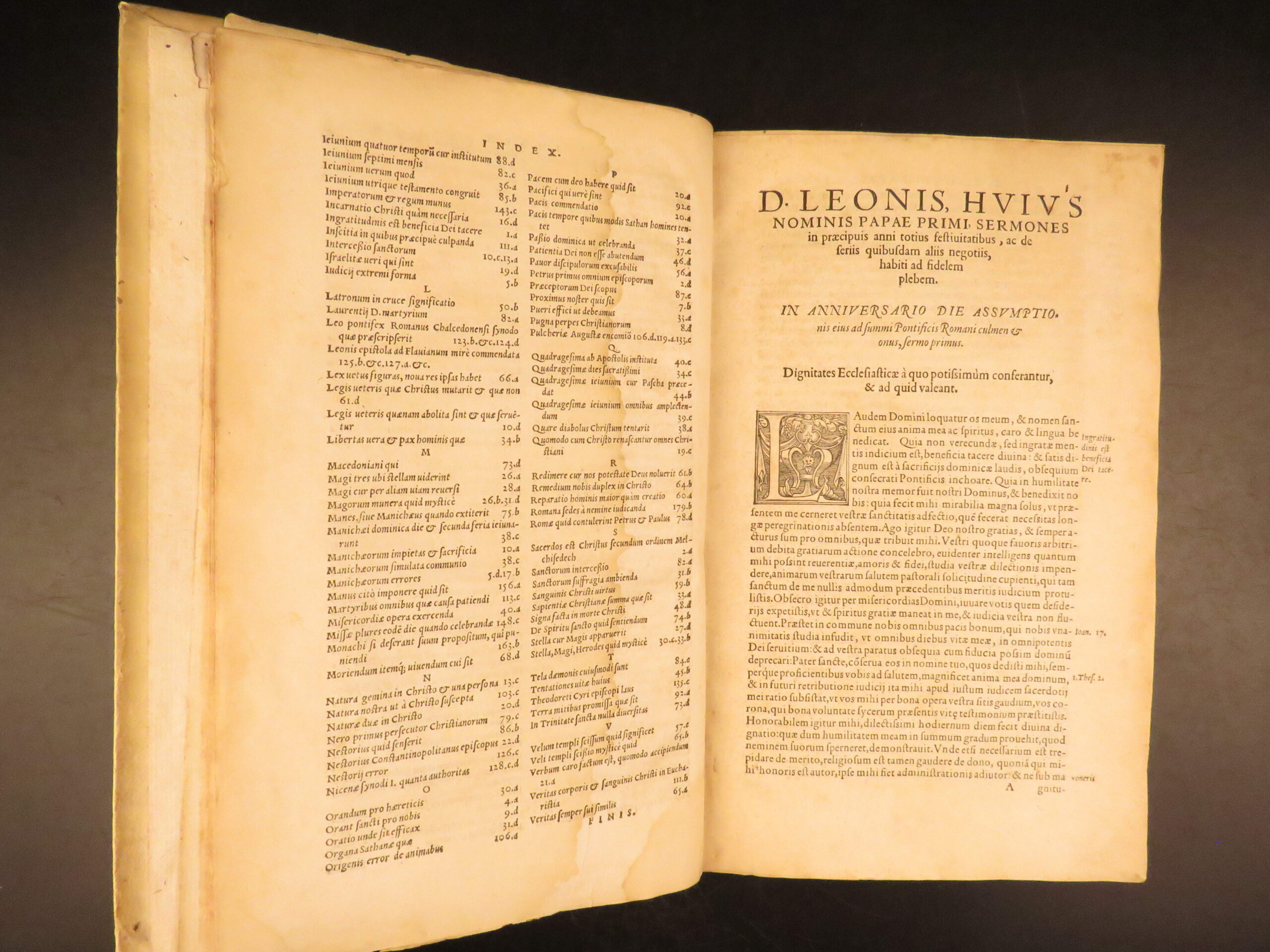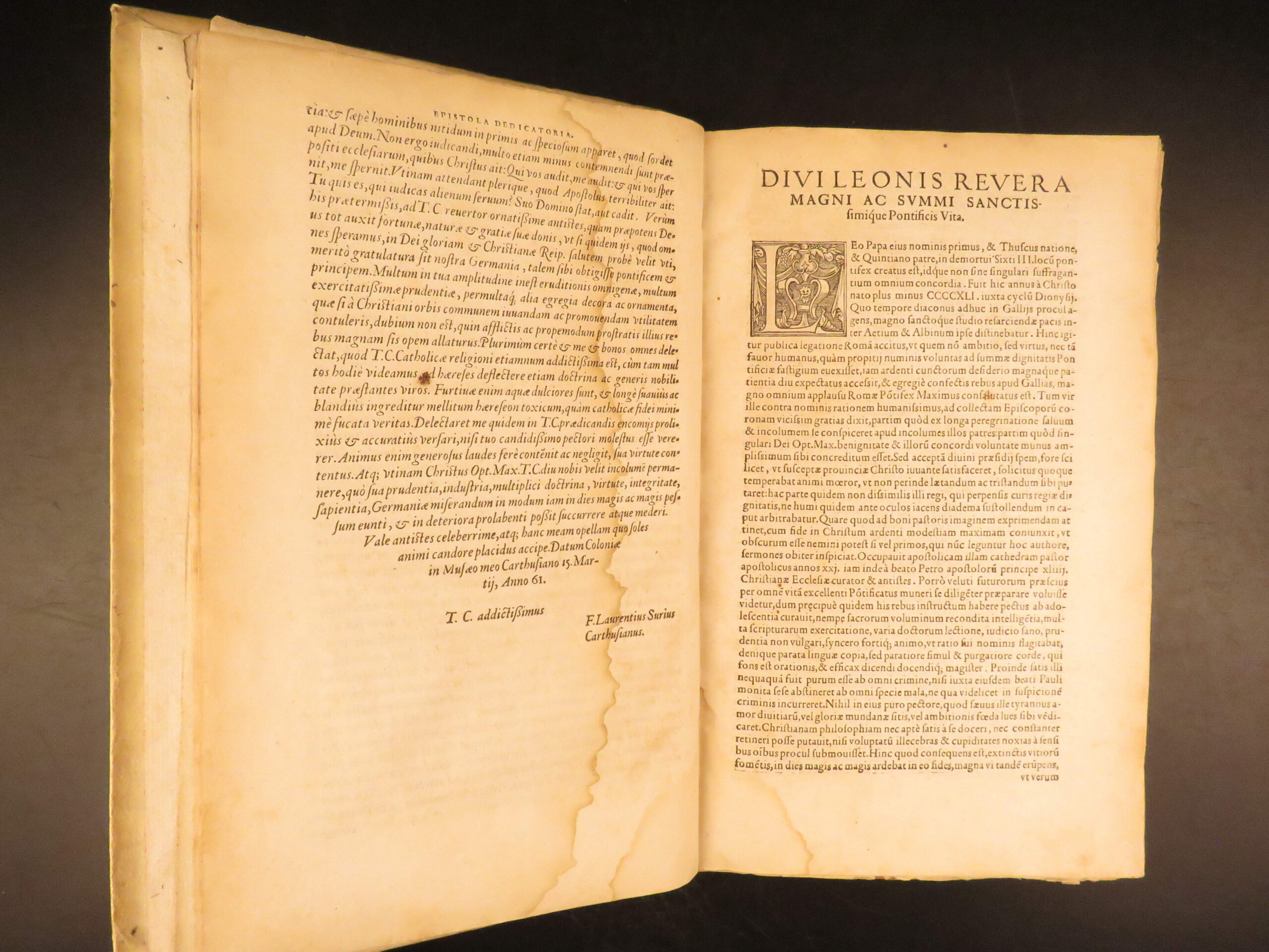 The works of Pope Leo I, edited by Laurentius Surius, was published in 1561. This collection of works is one of the foundational works of Roman Catholic theology and doctrine. These 5th-century letters and writings include the famous Tome to Flavian, correspondence on the Manichaean heresy, decrees from the Council of Chalcedon, as well as countless other letters and treatises. Note the original full-vellum binding for this impressive folio.