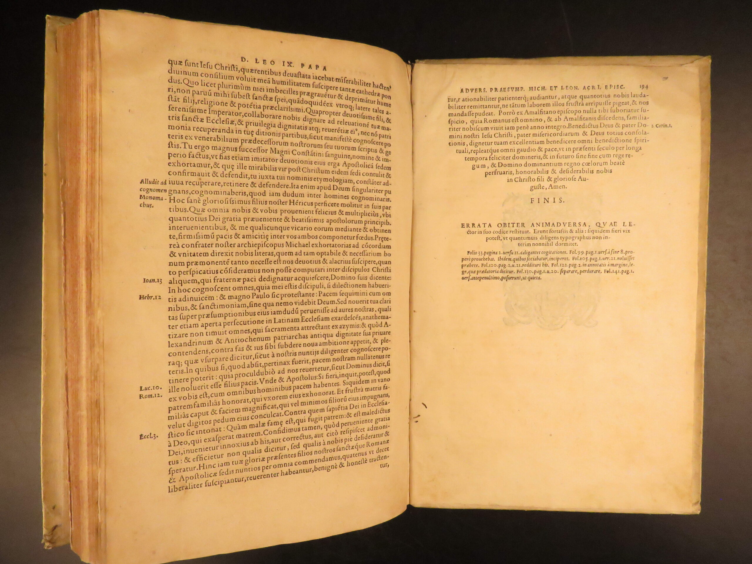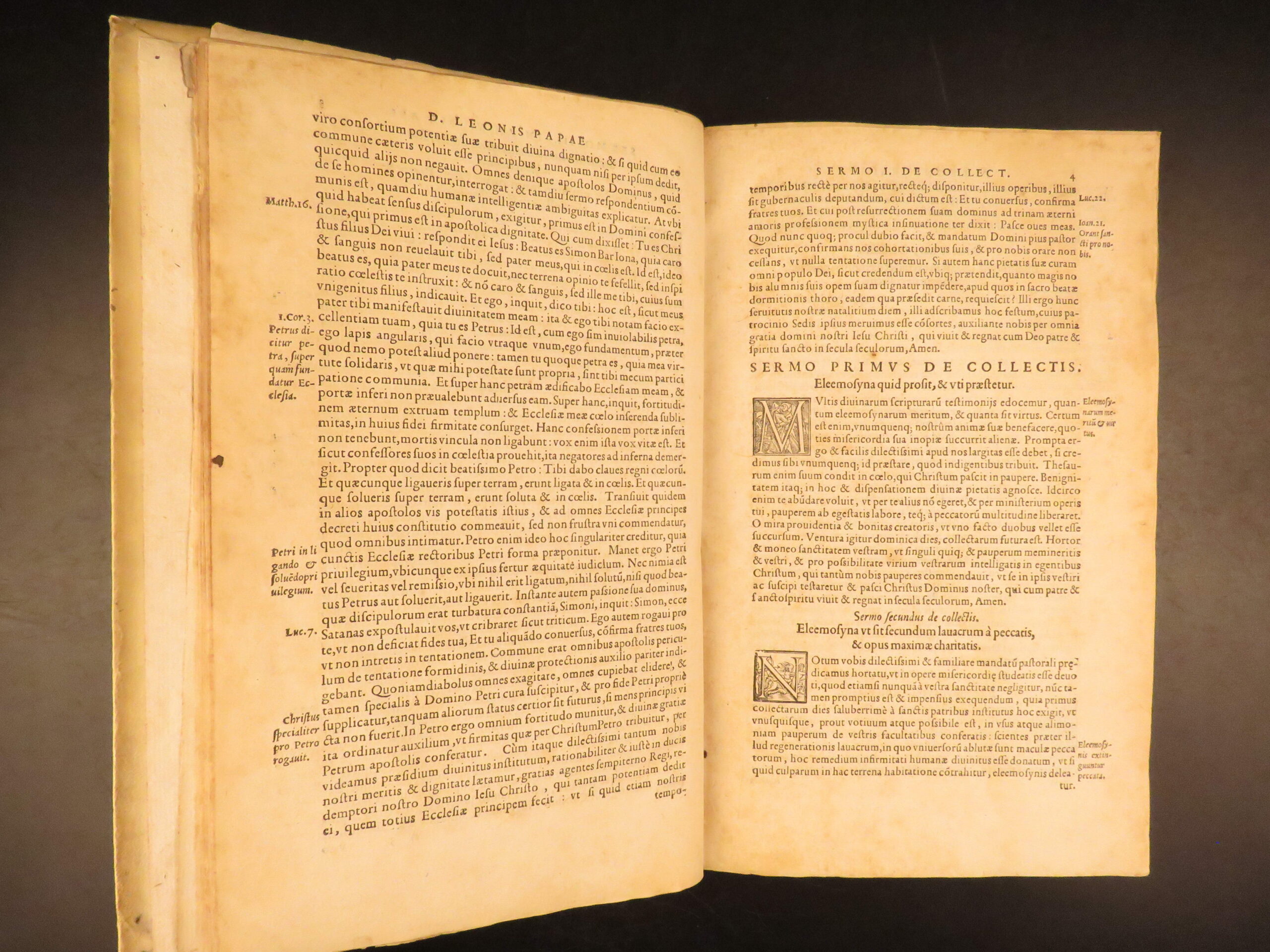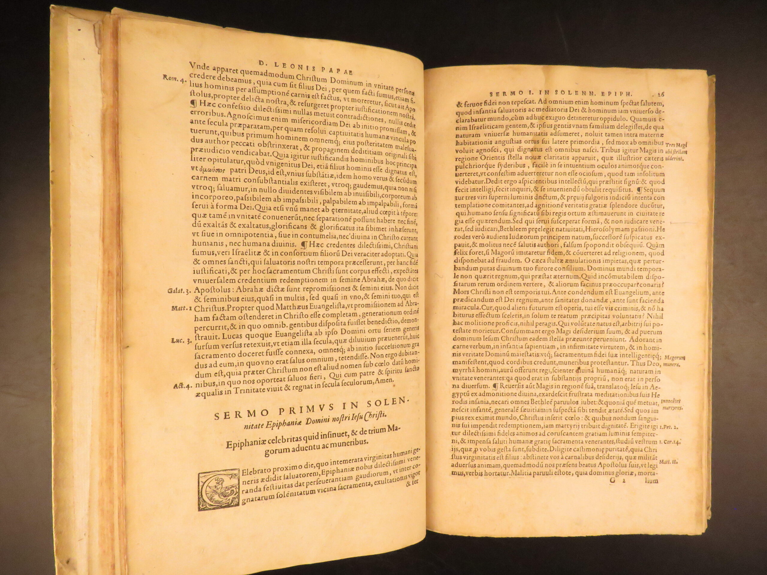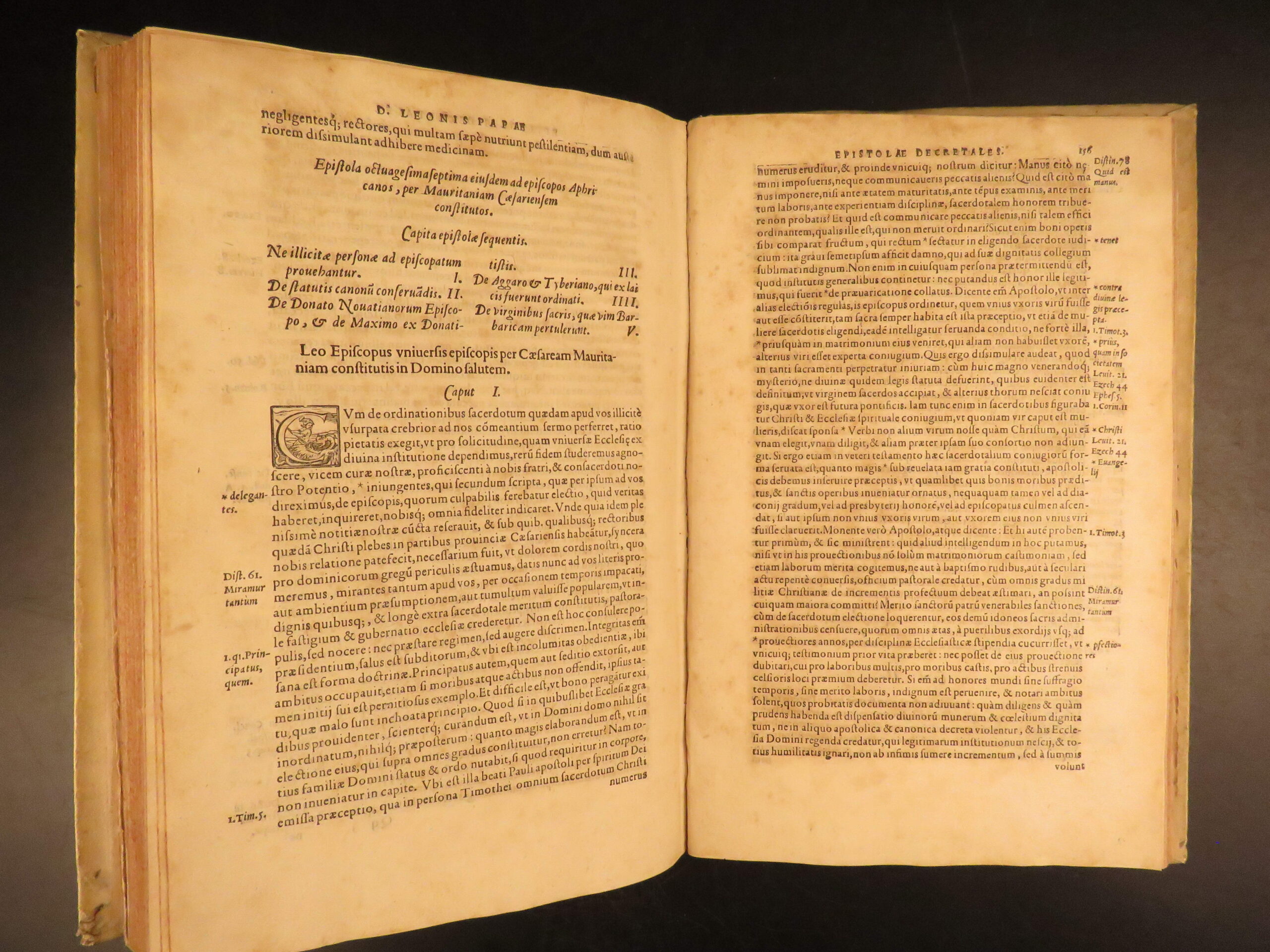The works of Pope Leo I, edited by Laurentius Surius, was published in 1561. This collection of works is one of the foundational works of Roman Catholic theology and doctrine. These 5th-century letters and writings include the famous Tome to Flavian, correspondence on the Manichaean heresy, decrees from the Council of Chalcedon, as well as countless other letters and treatises. Note the original full-vellum binding for this impressive folio.