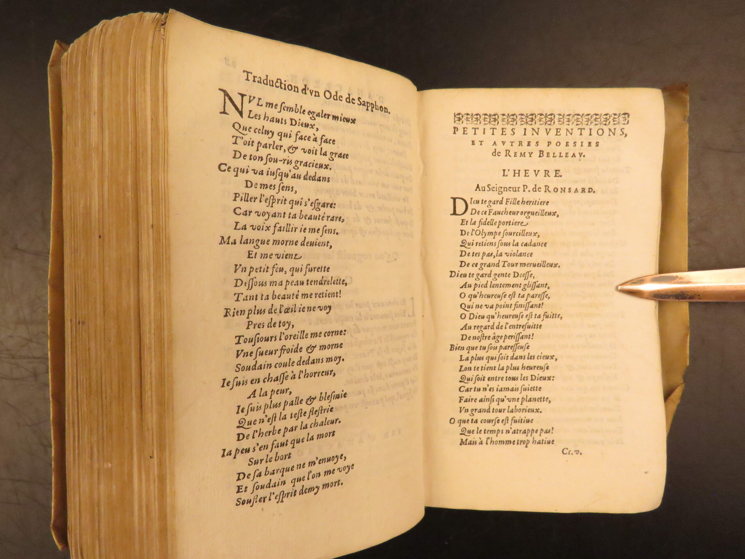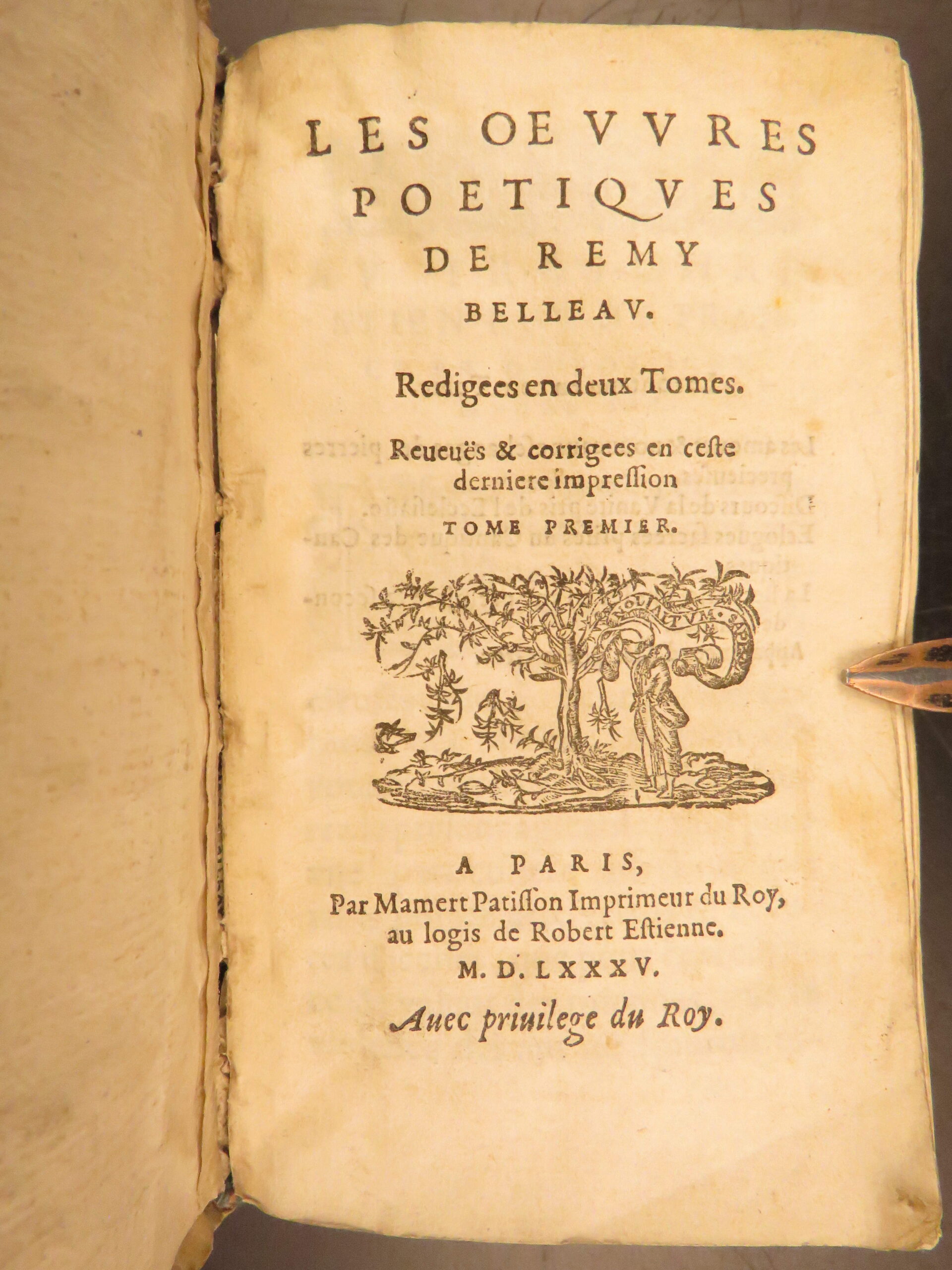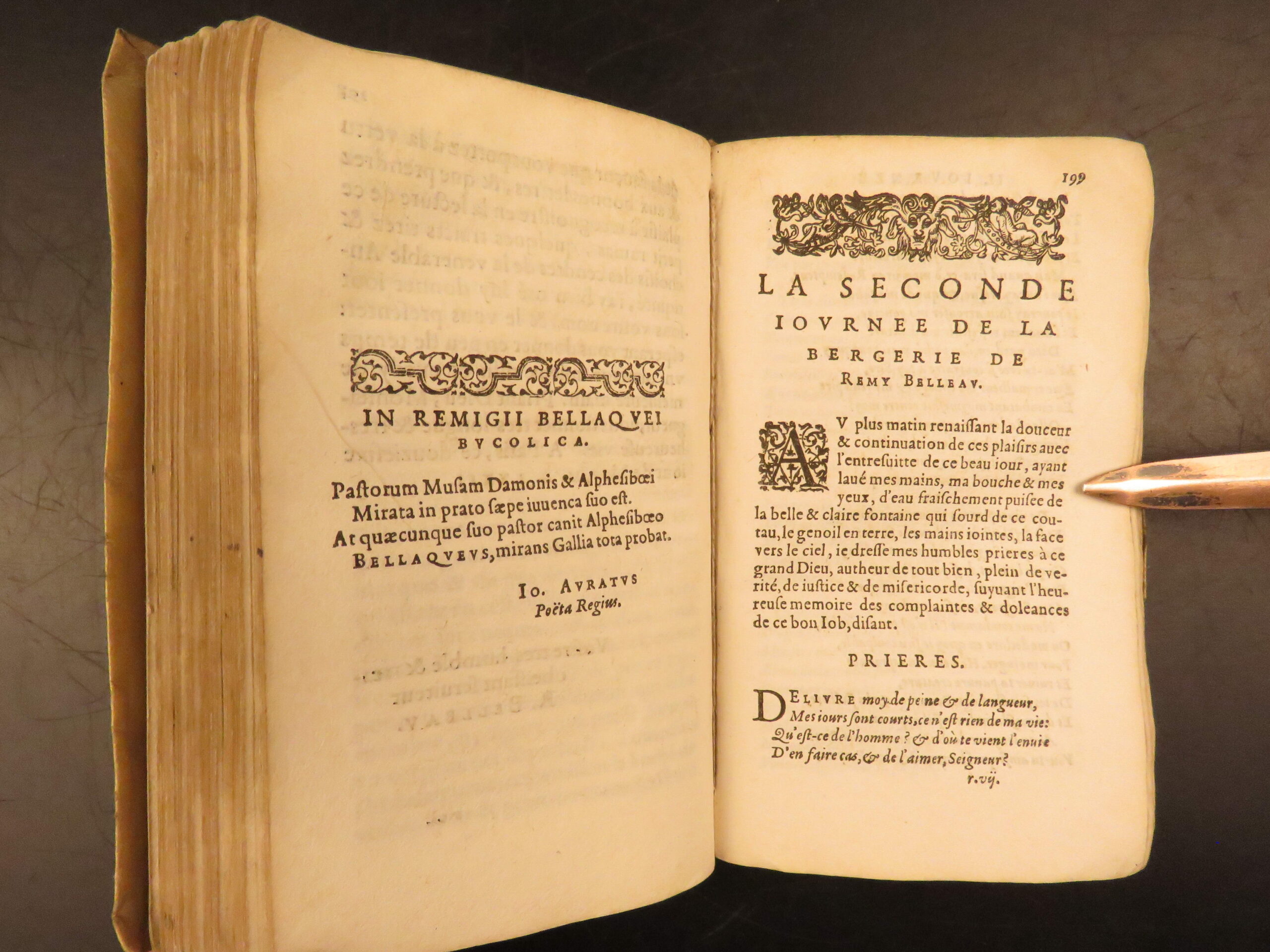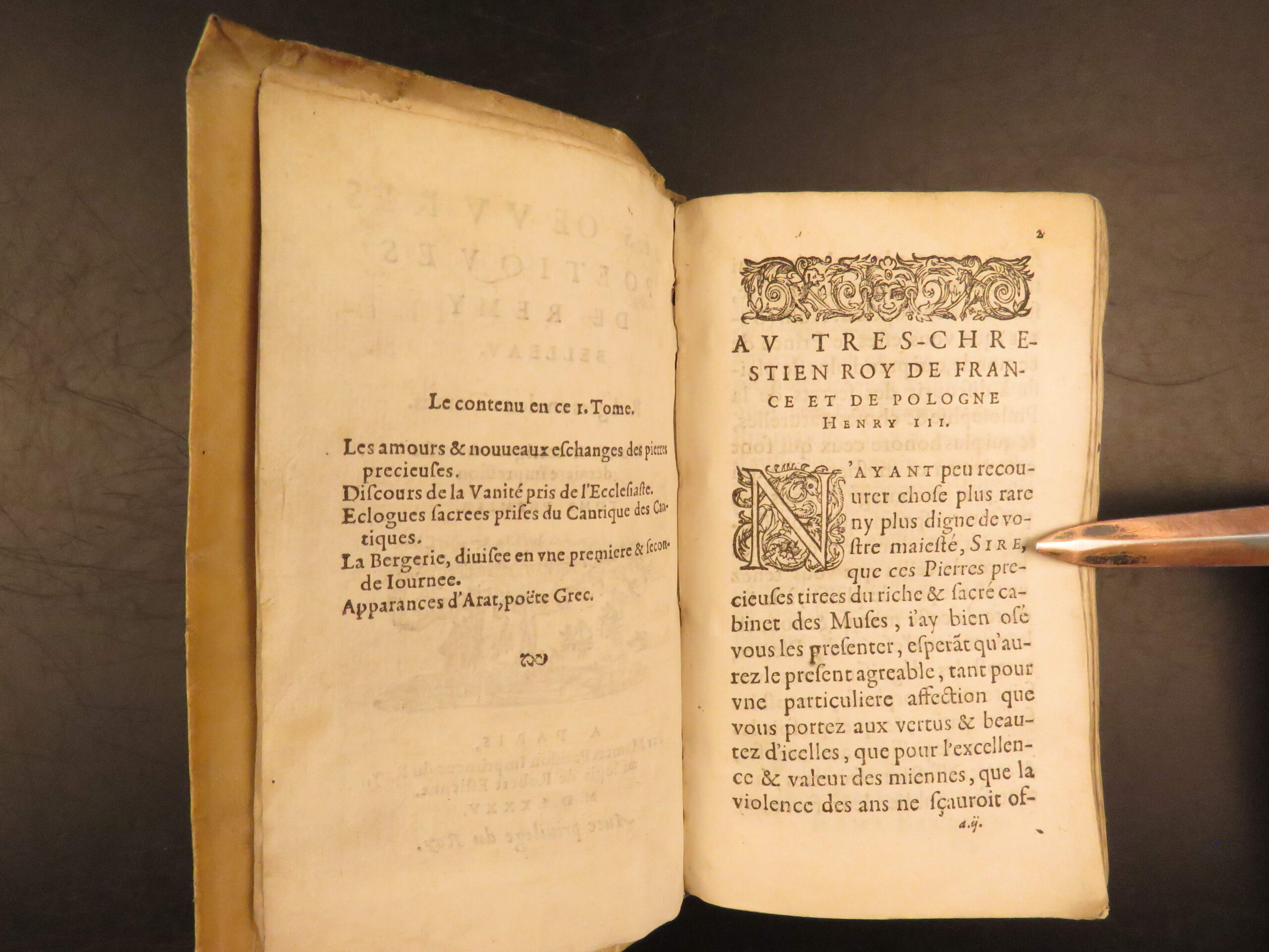 1585 Paris edition of Les Oeuvres Poétiques by Rémy Belleau, La Pléiade poet, including Les Amours et nouveaux eschanges des pierres précieuses and La Bergerie, two parts in one vellum volume.