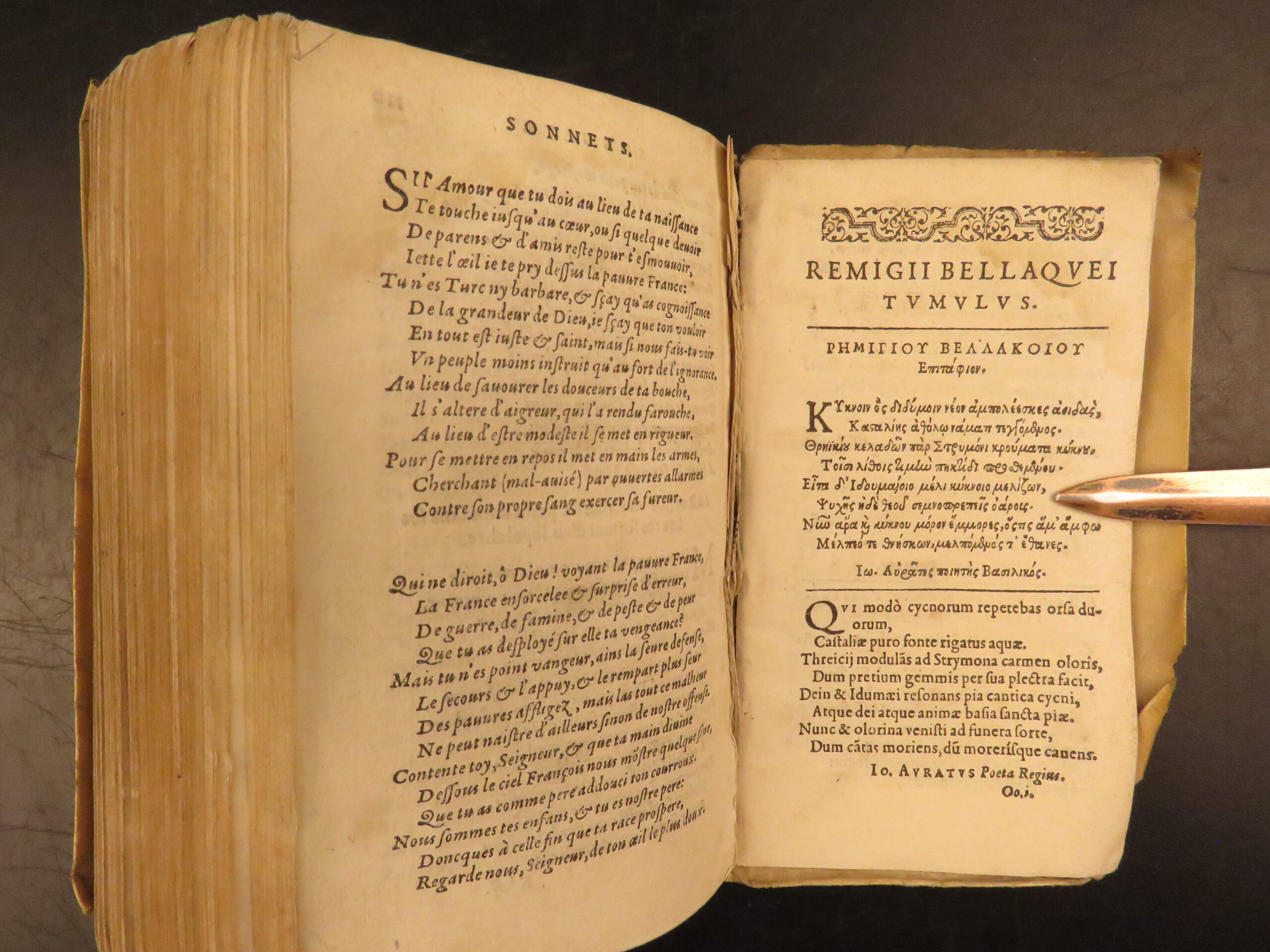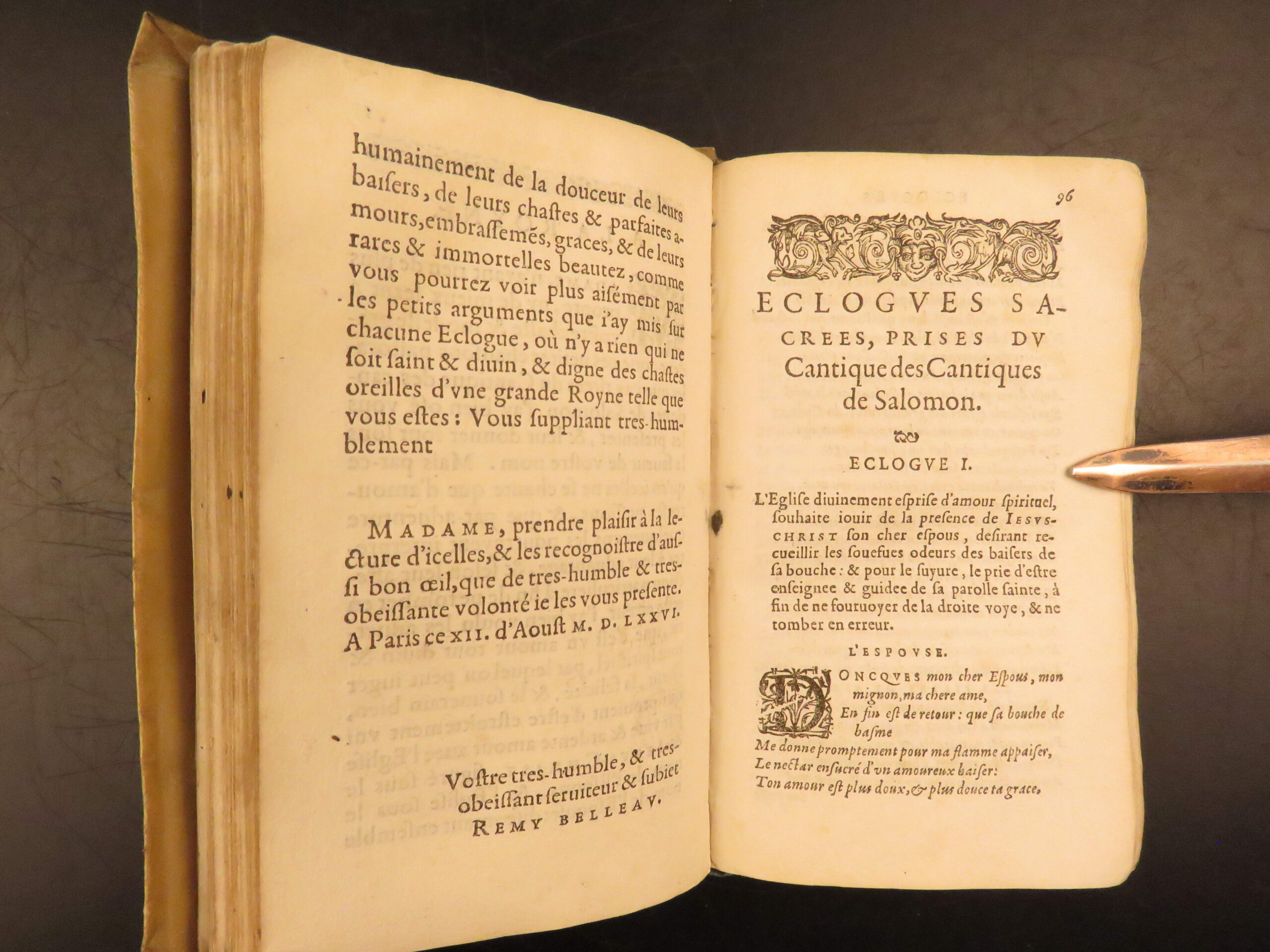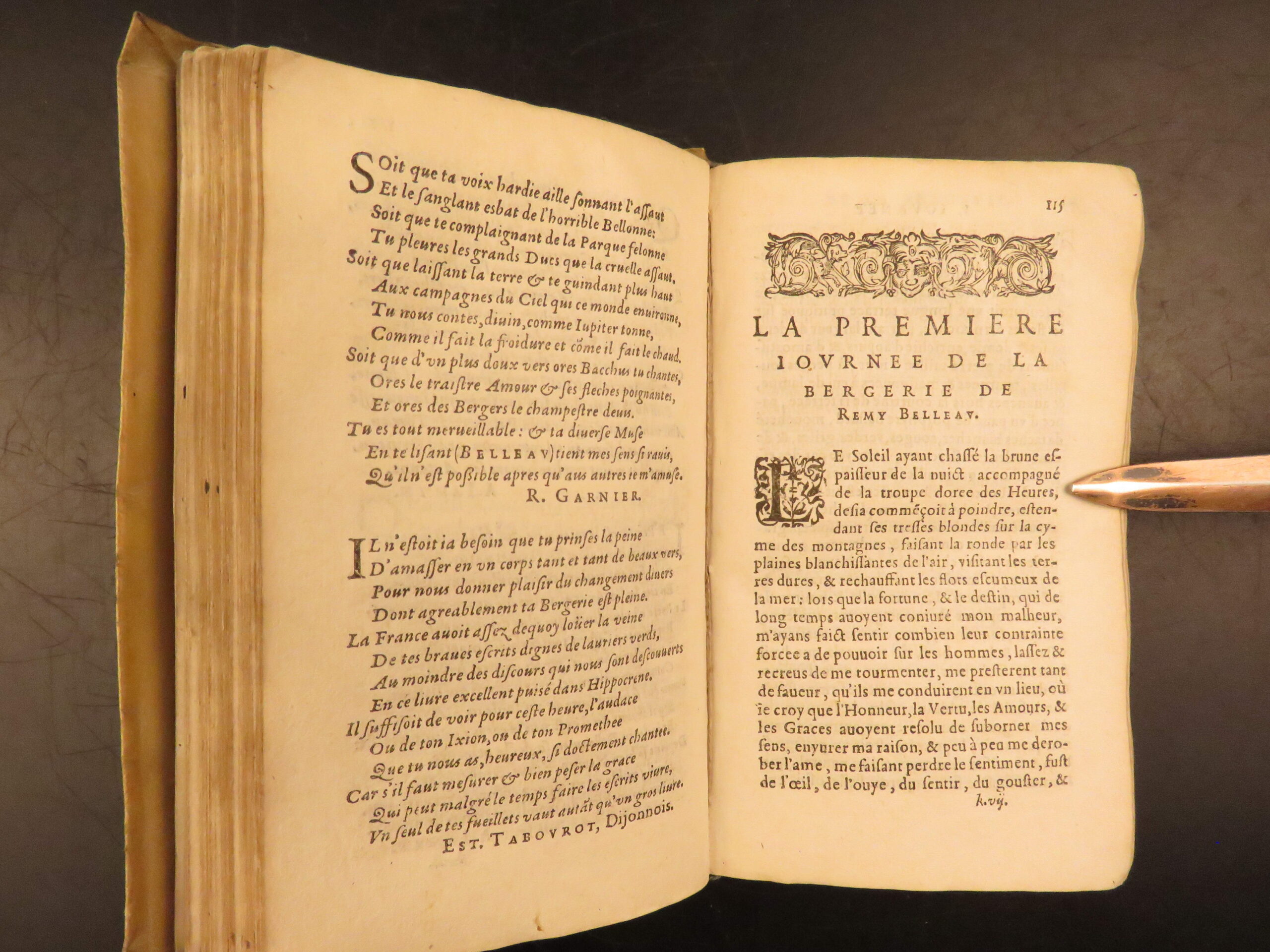 1585 Paris edition of Les Oeuvres Poétiques by Rémy Belleau, La Pléiade poet, including Les Amours et nouveaux eschanges des pierres précieuses and La Bergerie, two parts in one vellum volume.