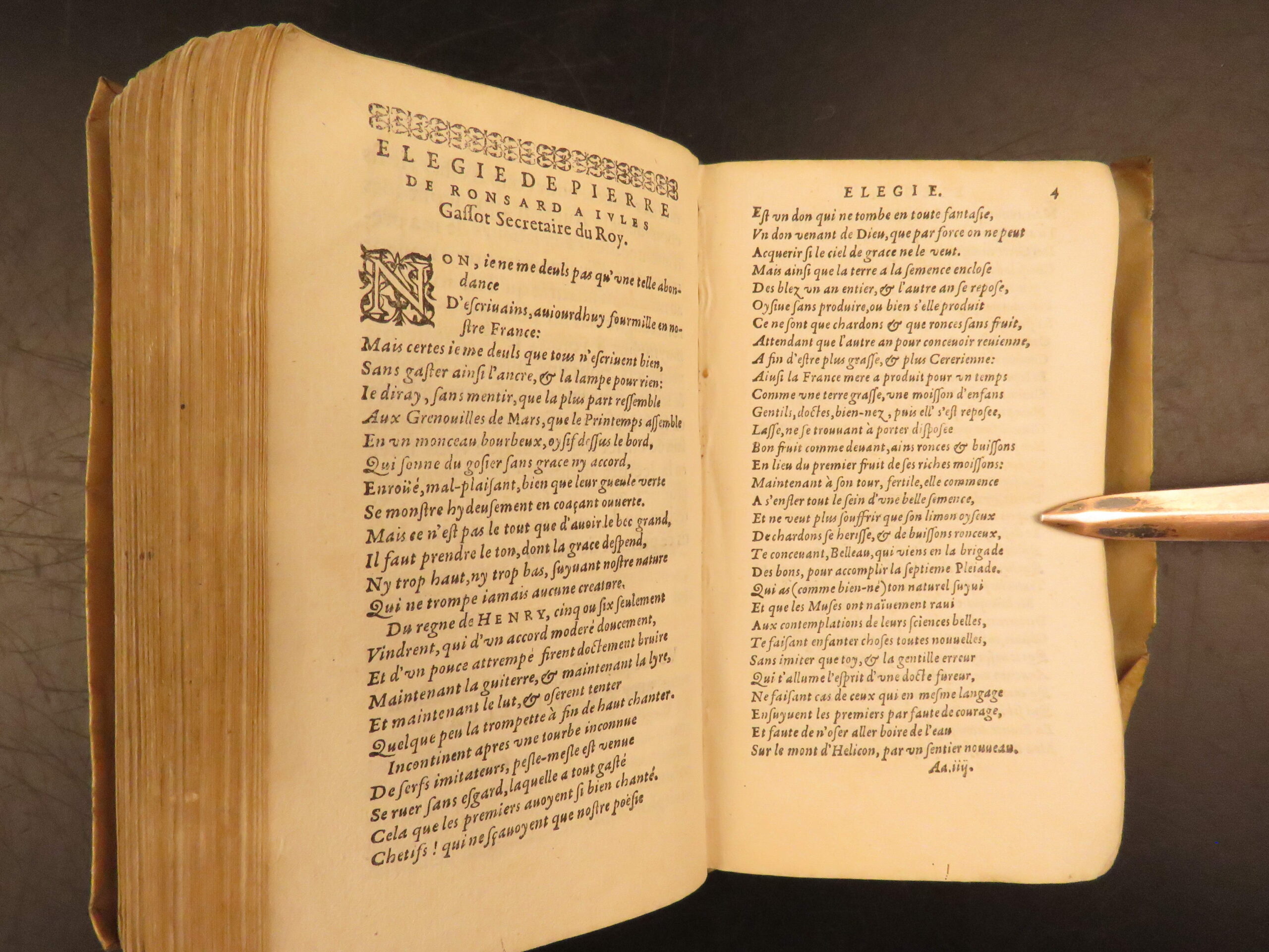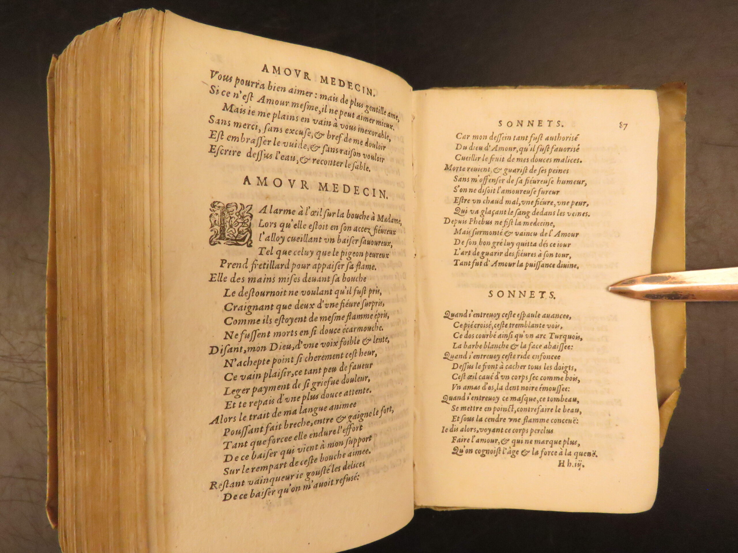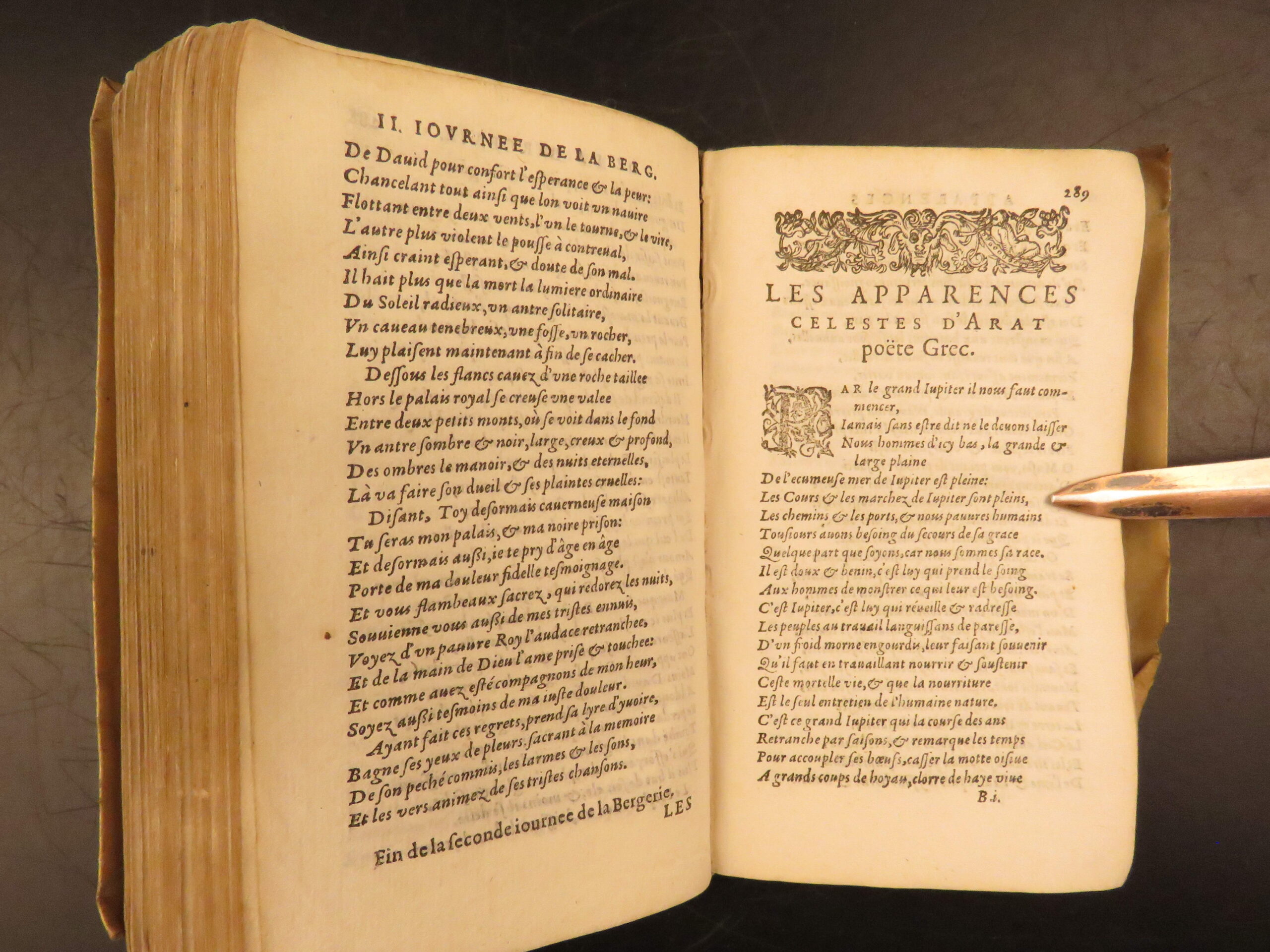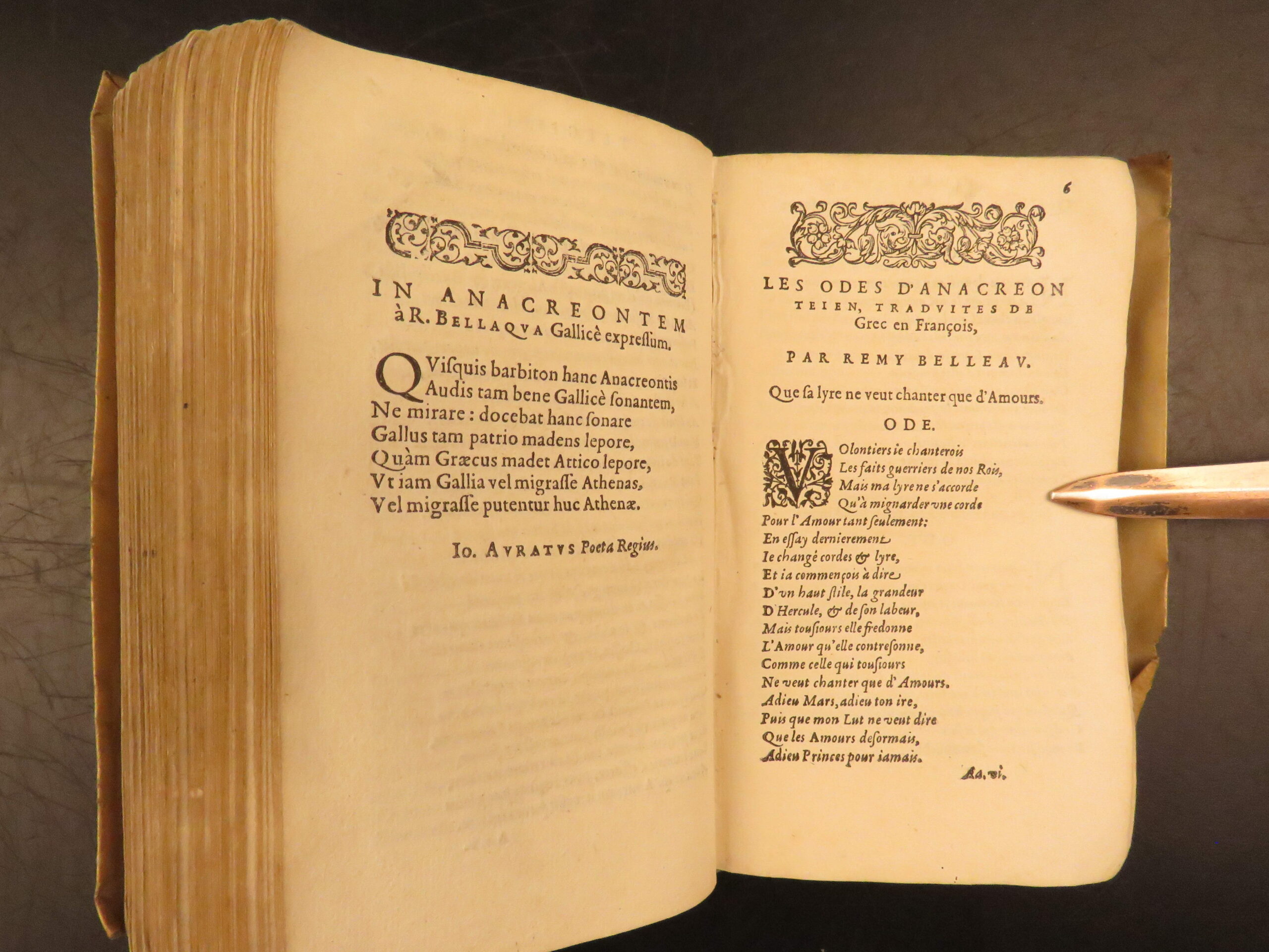 1585 Paris edition of Les Oeuvres Poétiques by Rémy Belleau, La Pléiade poet, including Les Amours et nouveaux eschanges des pierres précieuses and La Bergerie, two parts in one vellum volume.