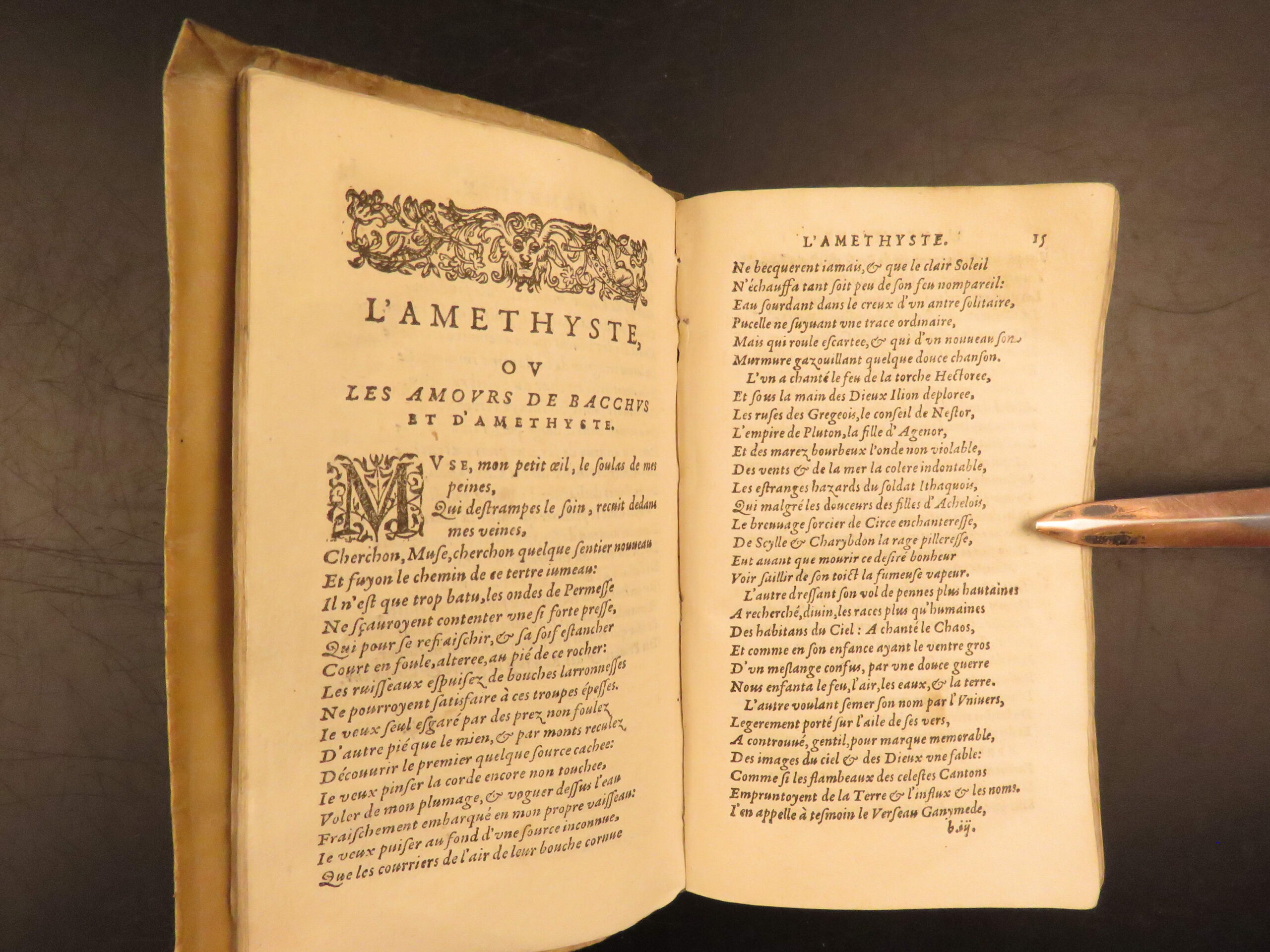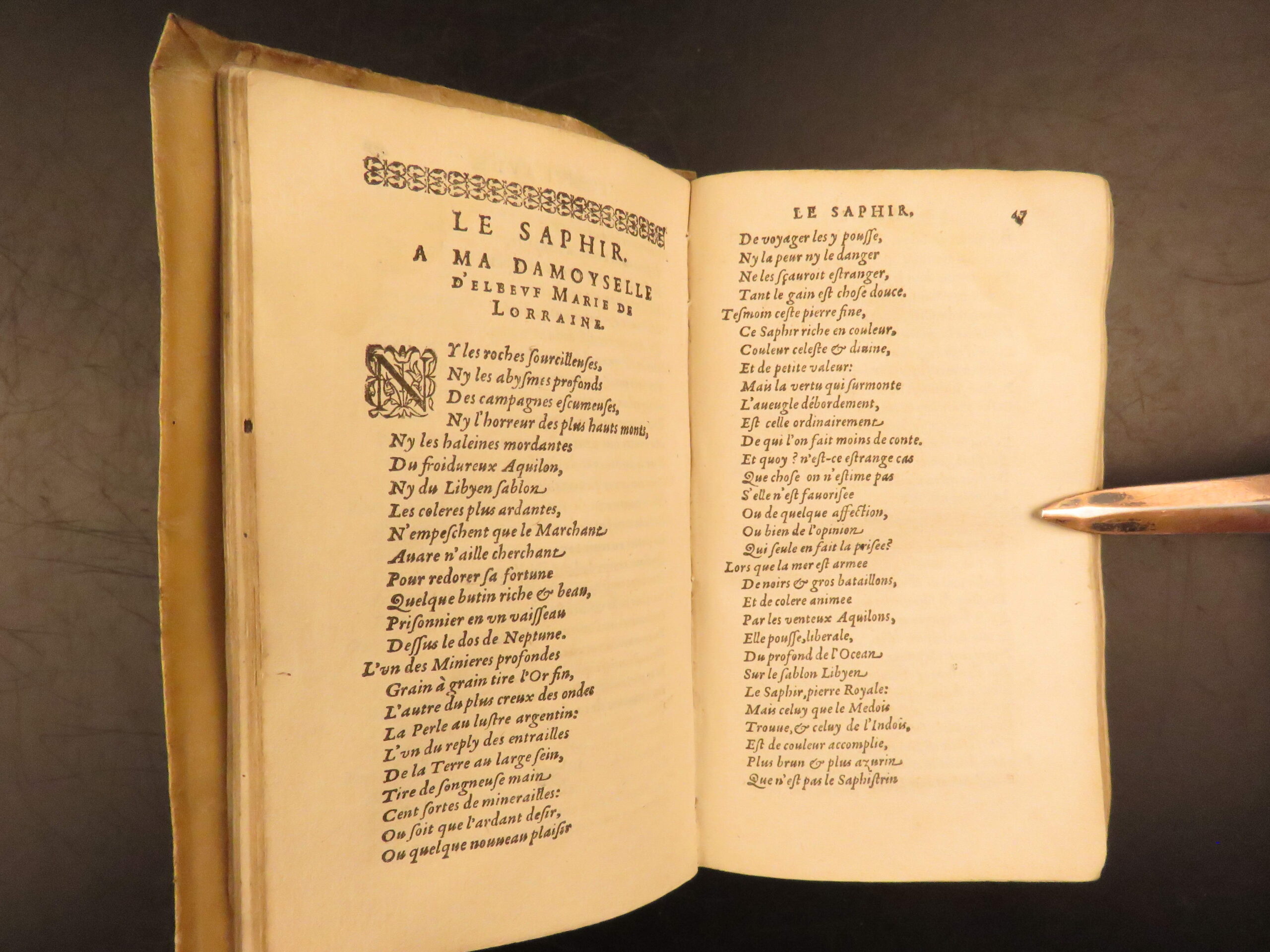 Rémy Belleau was a 16th-century French Renaissance poet who is primarily remembered for being a leading member of La Pléiade. This remarkable 1585, vellum-bound printing of the works of Belleau includes his most iconic work, Les Amours et nouveaux eschanges des pierres précieuses – a cycle of poems centered on gemstones, each poem focuses on a specific stone such as ruby, pearl, or emerald.