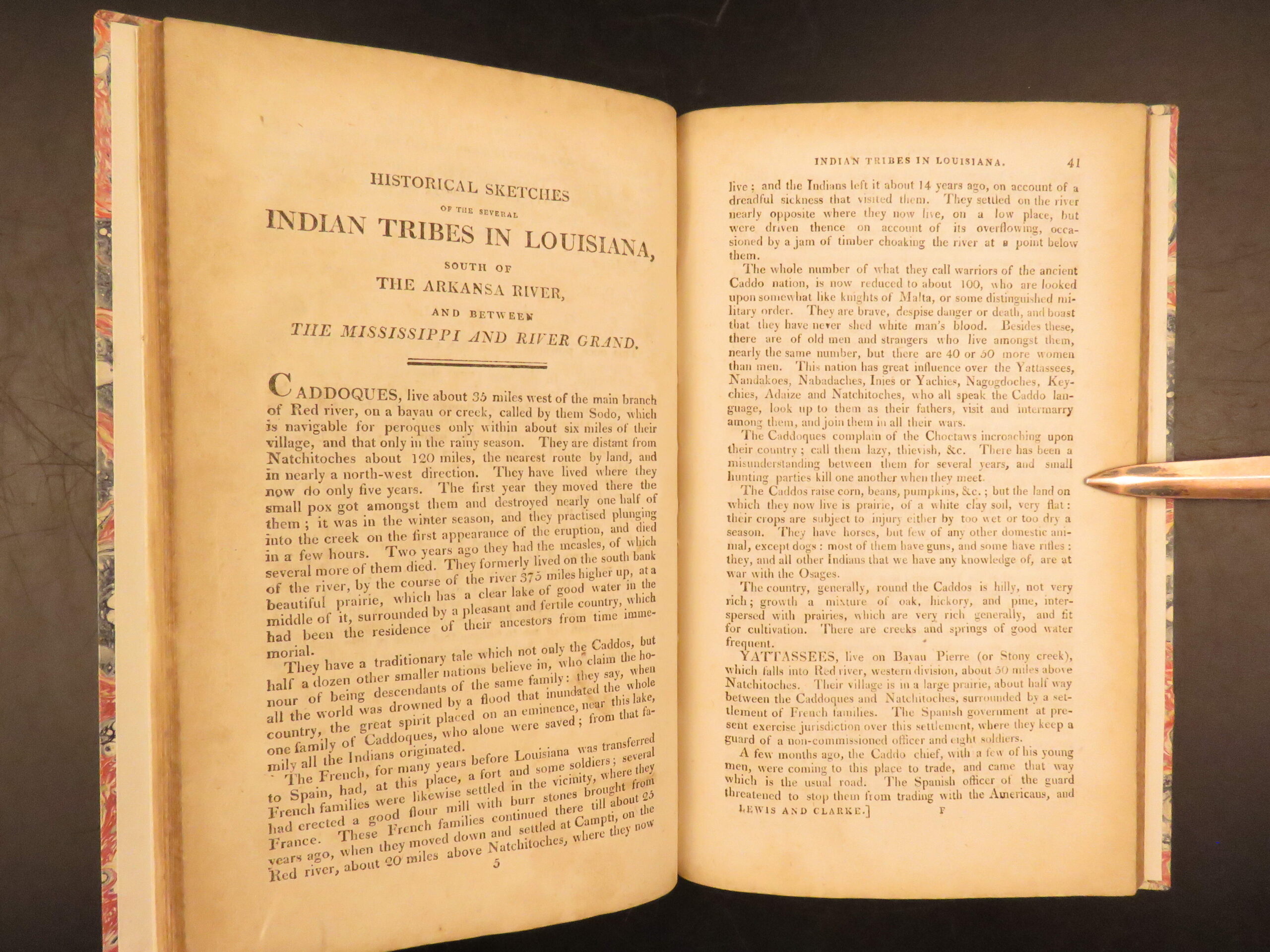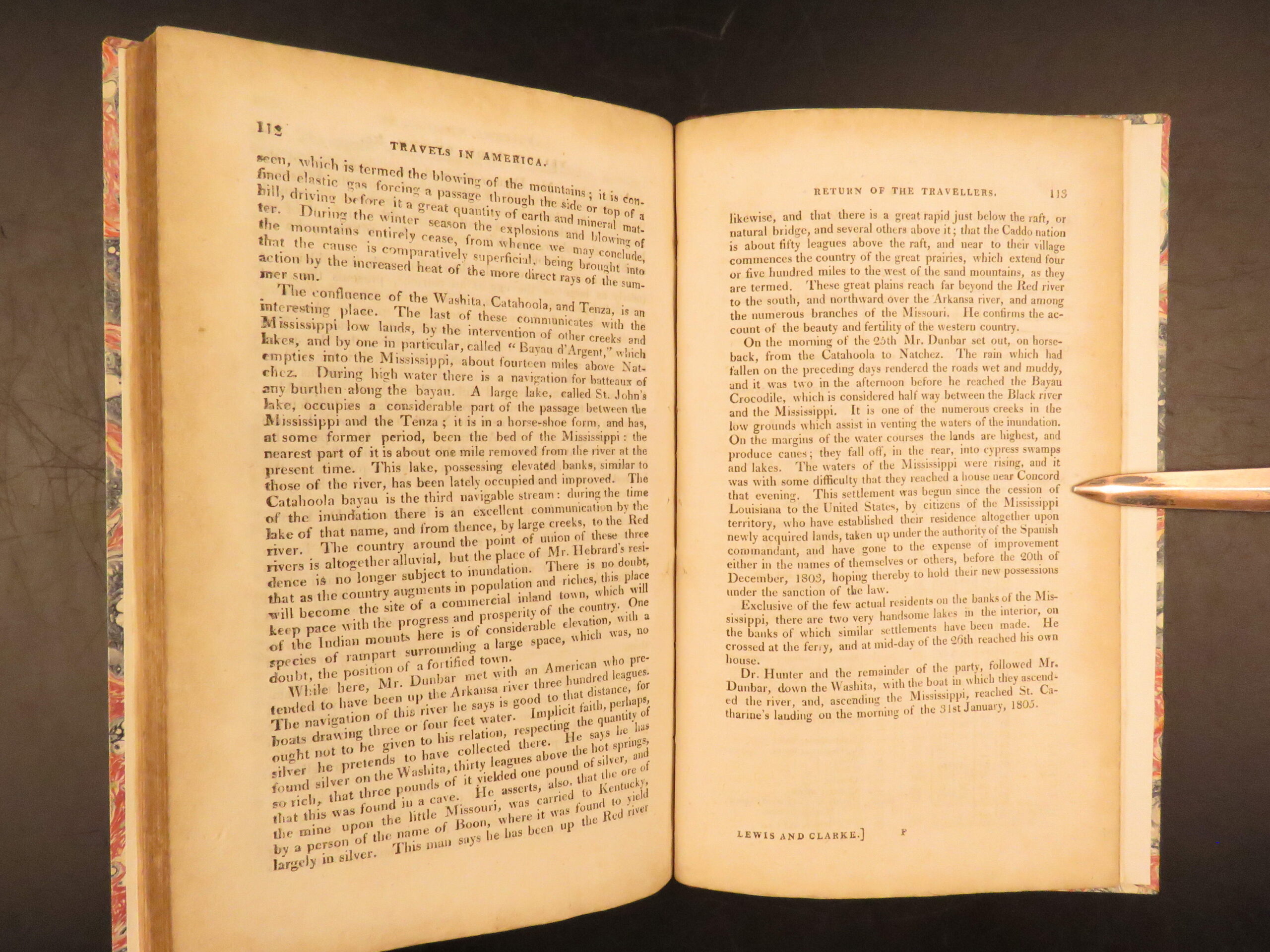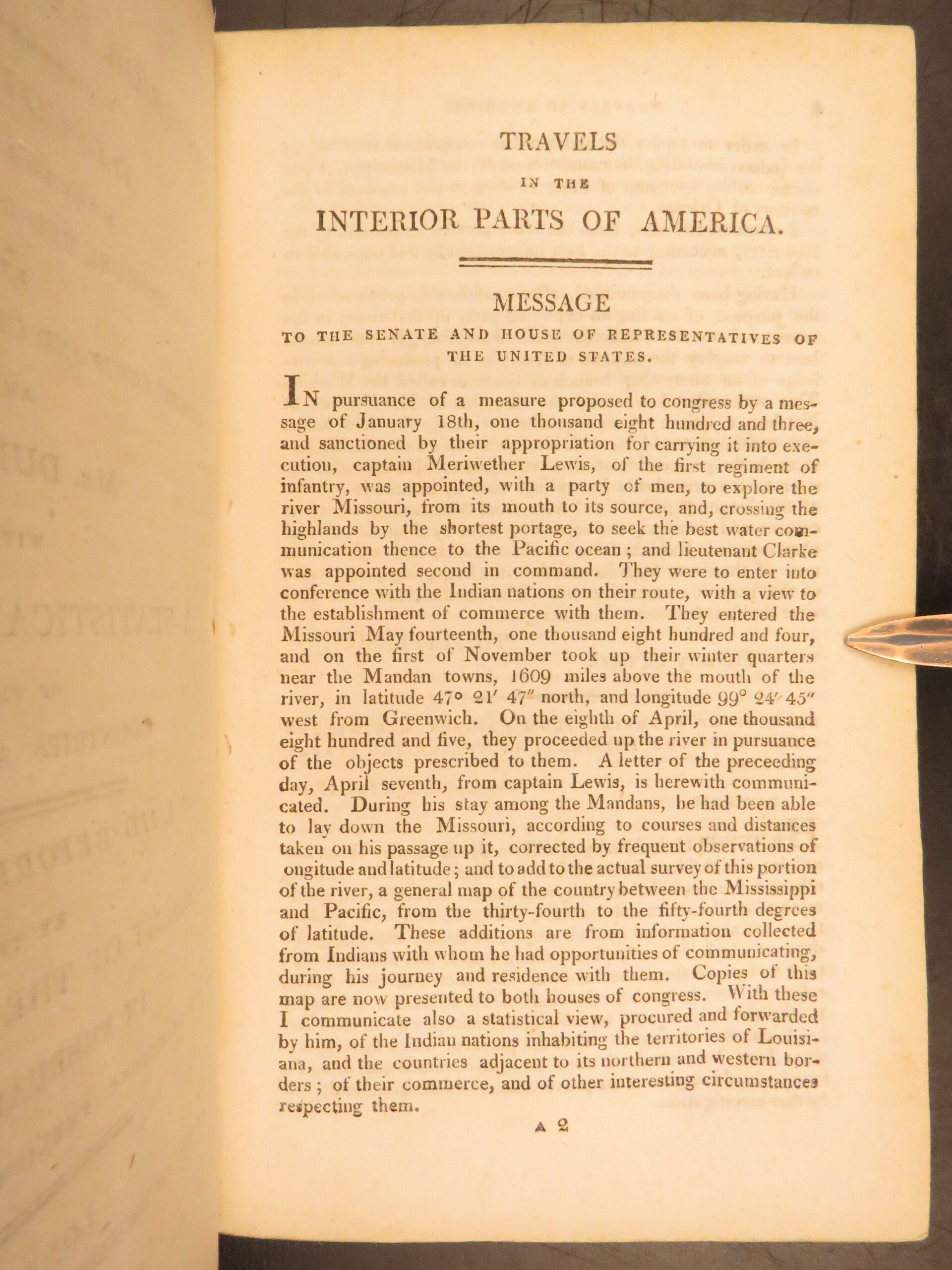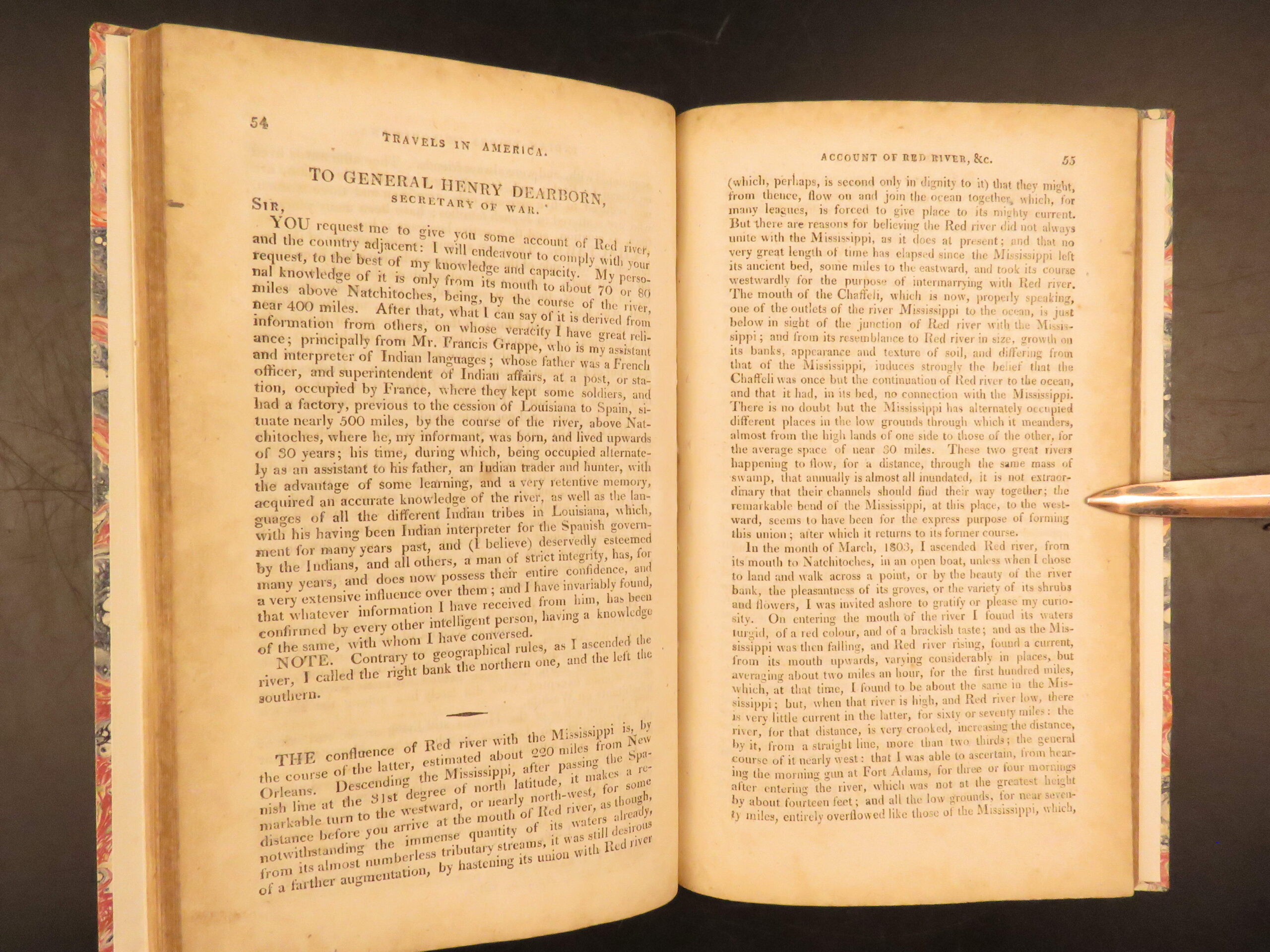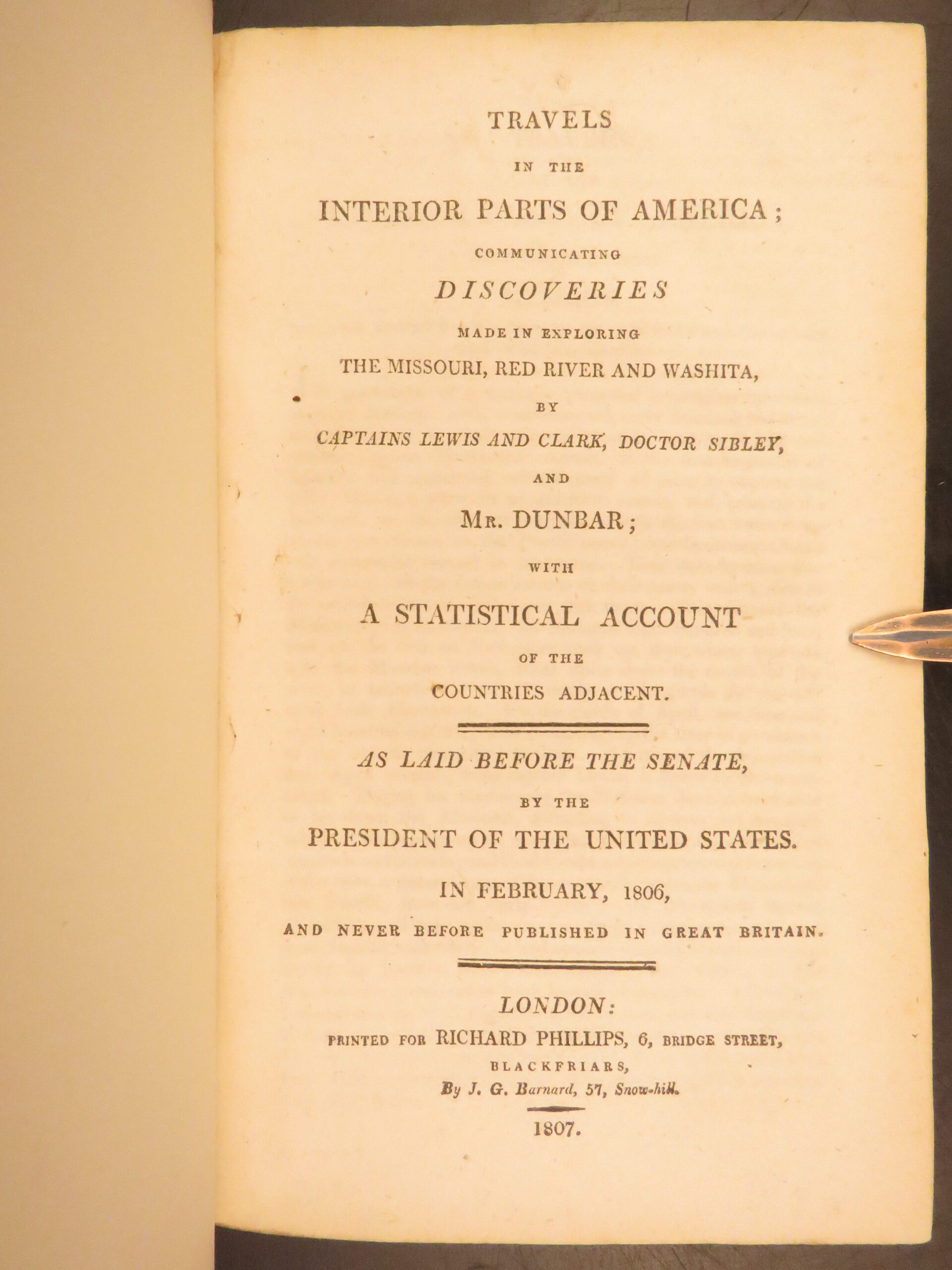 First edition of Lewis and Dunbar’s 1807 Travels in America, documenting Missouri and Red River exploration with Jefferson’s message, Native tribe accounts, and a folding table.