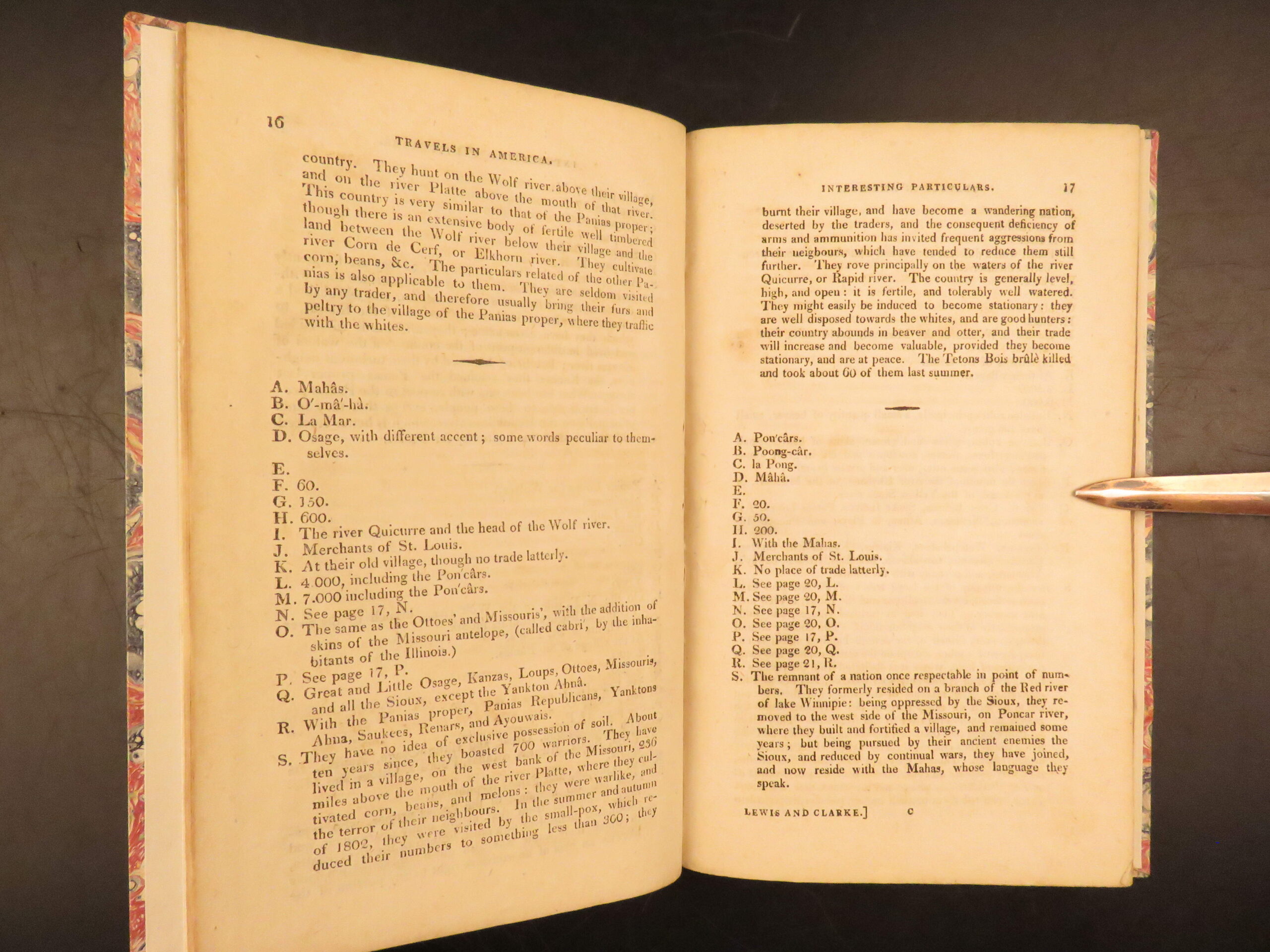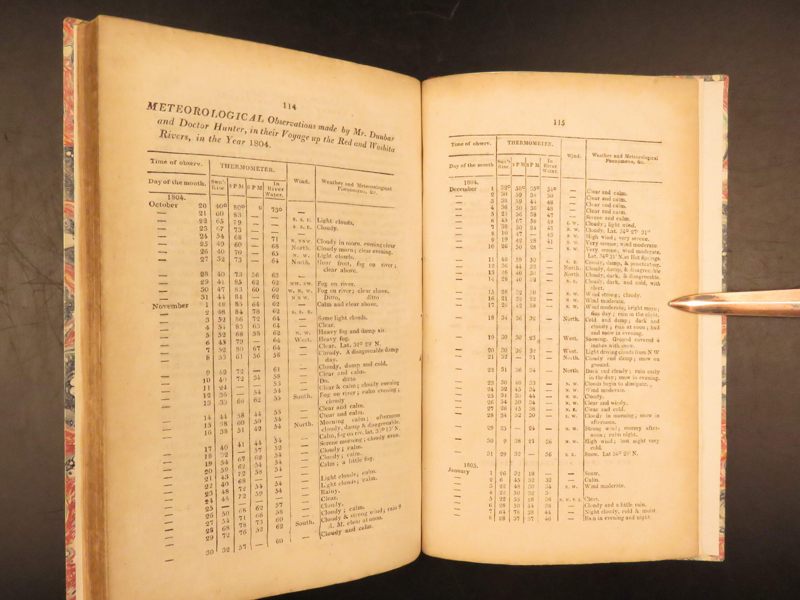 In 1807, the Sibley and Dunbar reports of Lewis and Clark’s expedition was the first published instance of the now famous American exploration journey. Travels In The Interior Parts Of America, although shorter than the official Journal, includes extensive reports of Native American Indian tribes (see below), as well as correspondence concerning the expedition – most notably a letter from Thomas Jefferson! This work proved to be one of the earliest known works to describe the Louisiana Purchase including indigenous people, scientific observations, and meteorological phenomena.