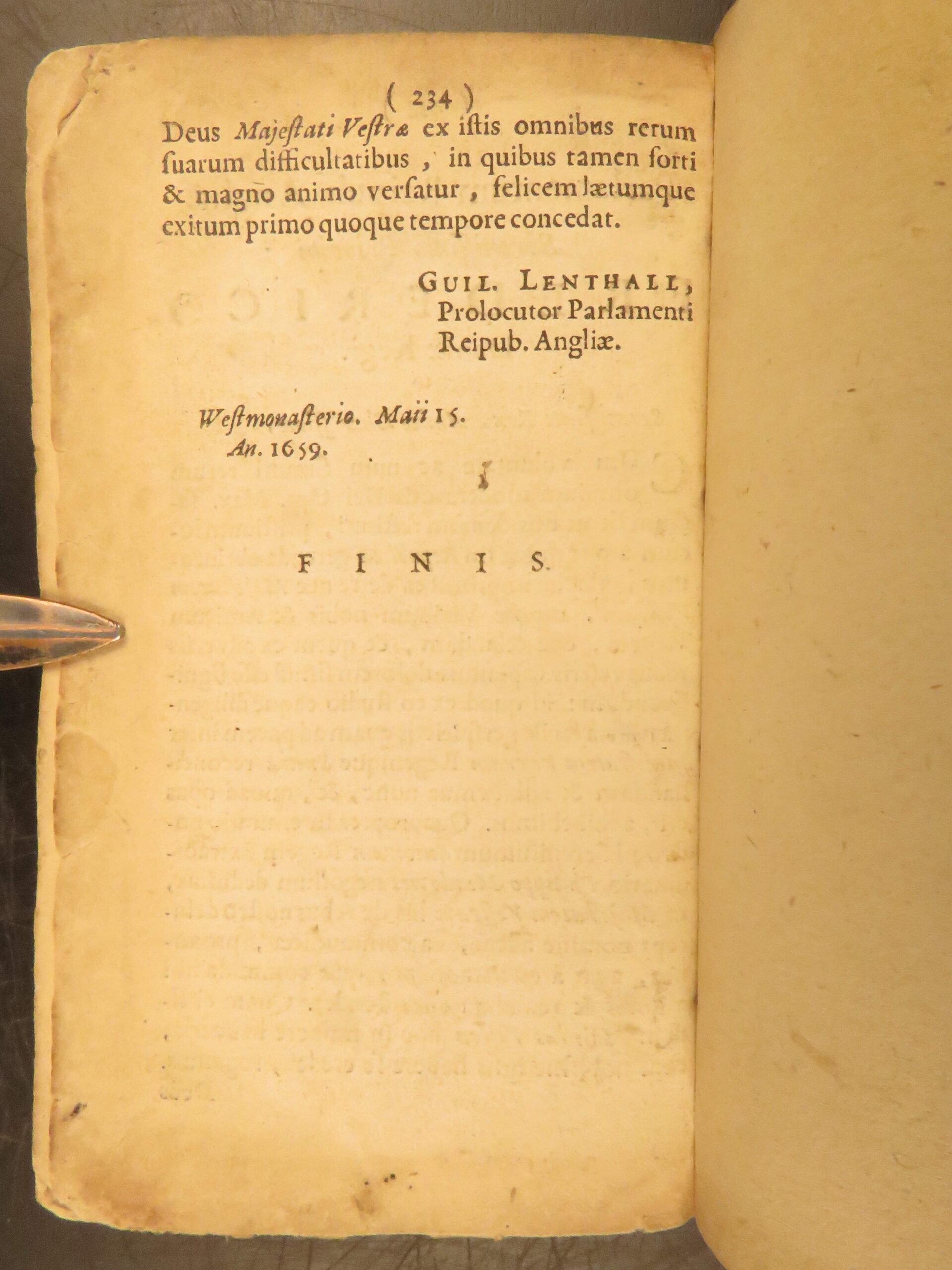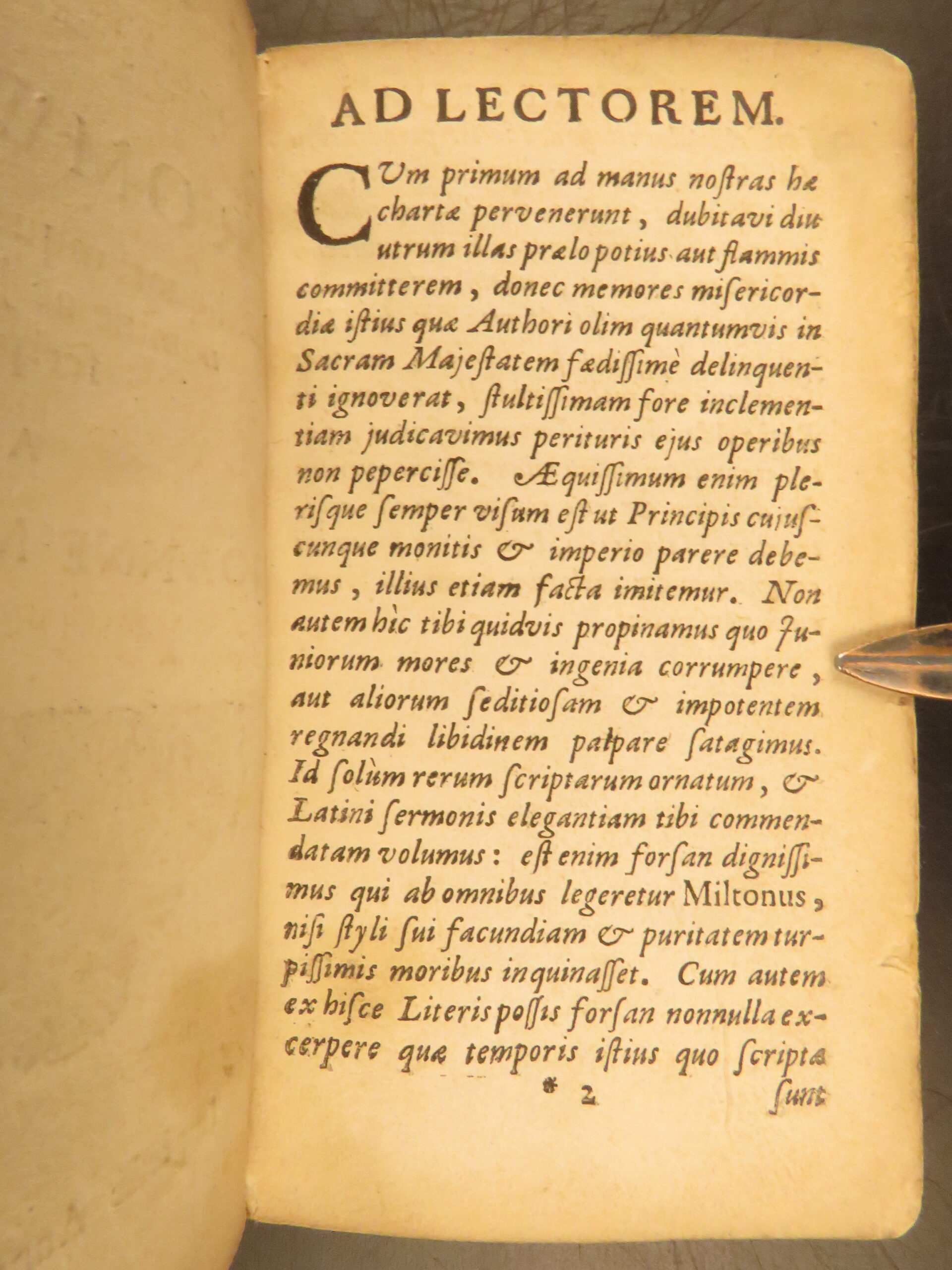 In 1676, the year of the first printing, two editions of Literae Pseudo-senatus by John Milton were published by Fricx. They are identifiable by the printer’s device on the title page – the ‘face edition’ and the ‘basket of fruit’ edition. The first printing had an image of a basket of fruit, while the second printing featured a decorative face above the imprint. (Hunter, A Milton Encyclopedia). The present edition is the latter, which Milton attempted to duplicate the first edition. This book is a collection of 136 state-papers or dispatches written by John Milton to the Council of State on his views of republicanism.