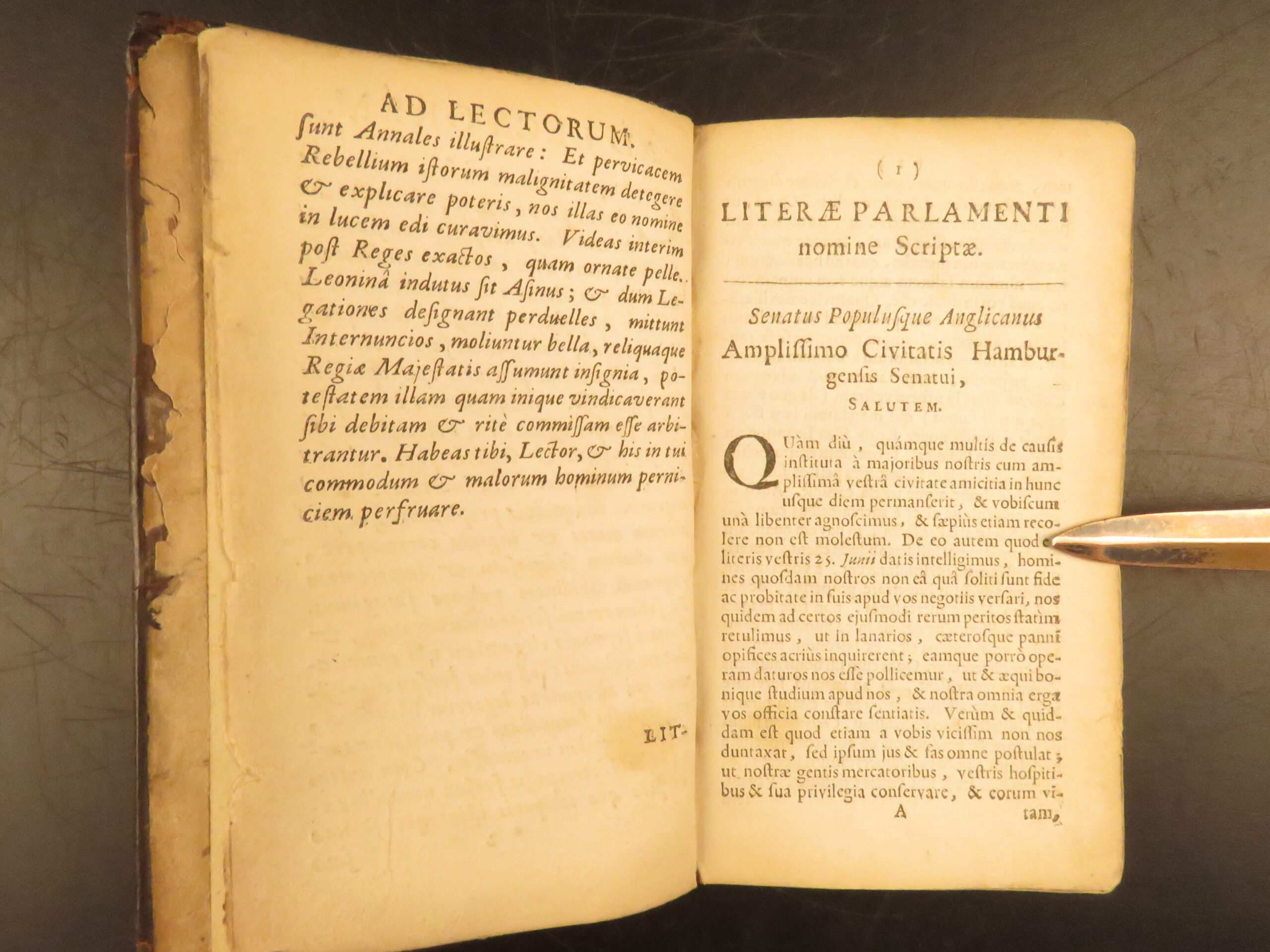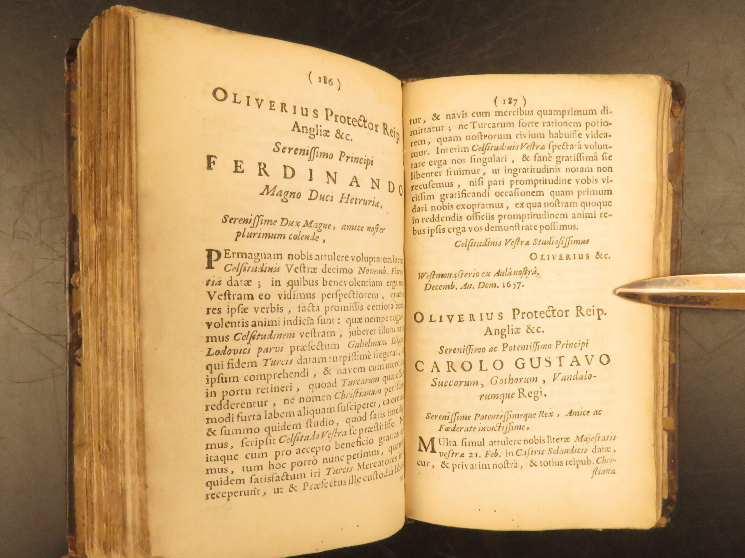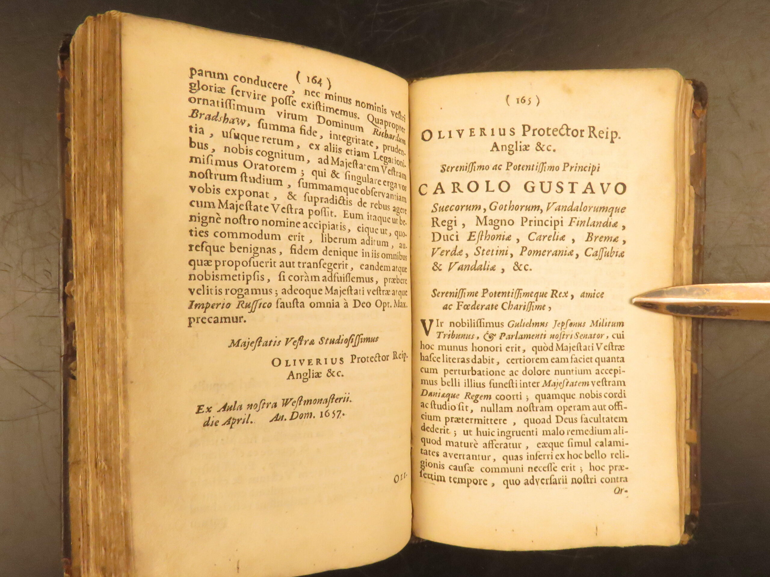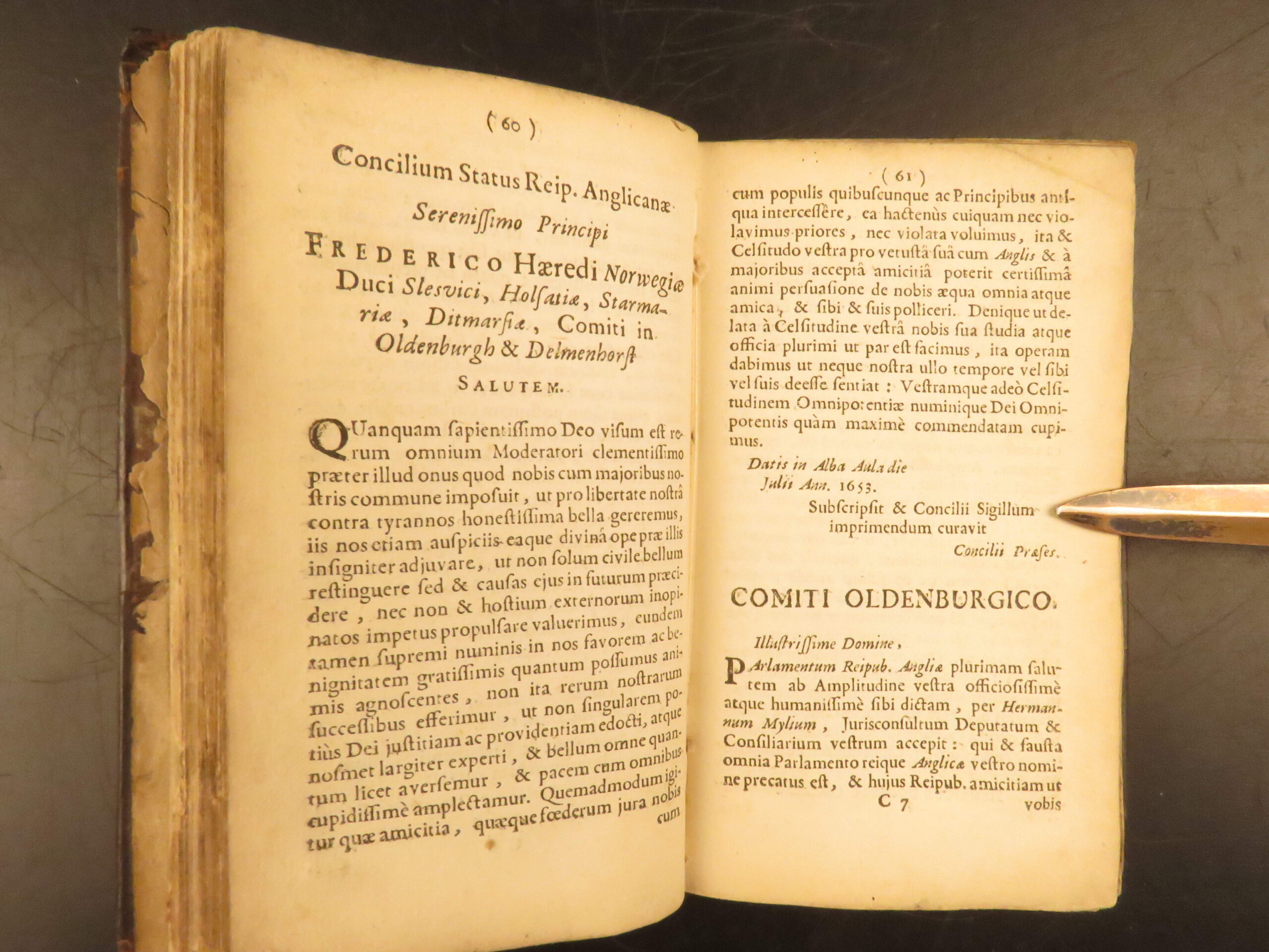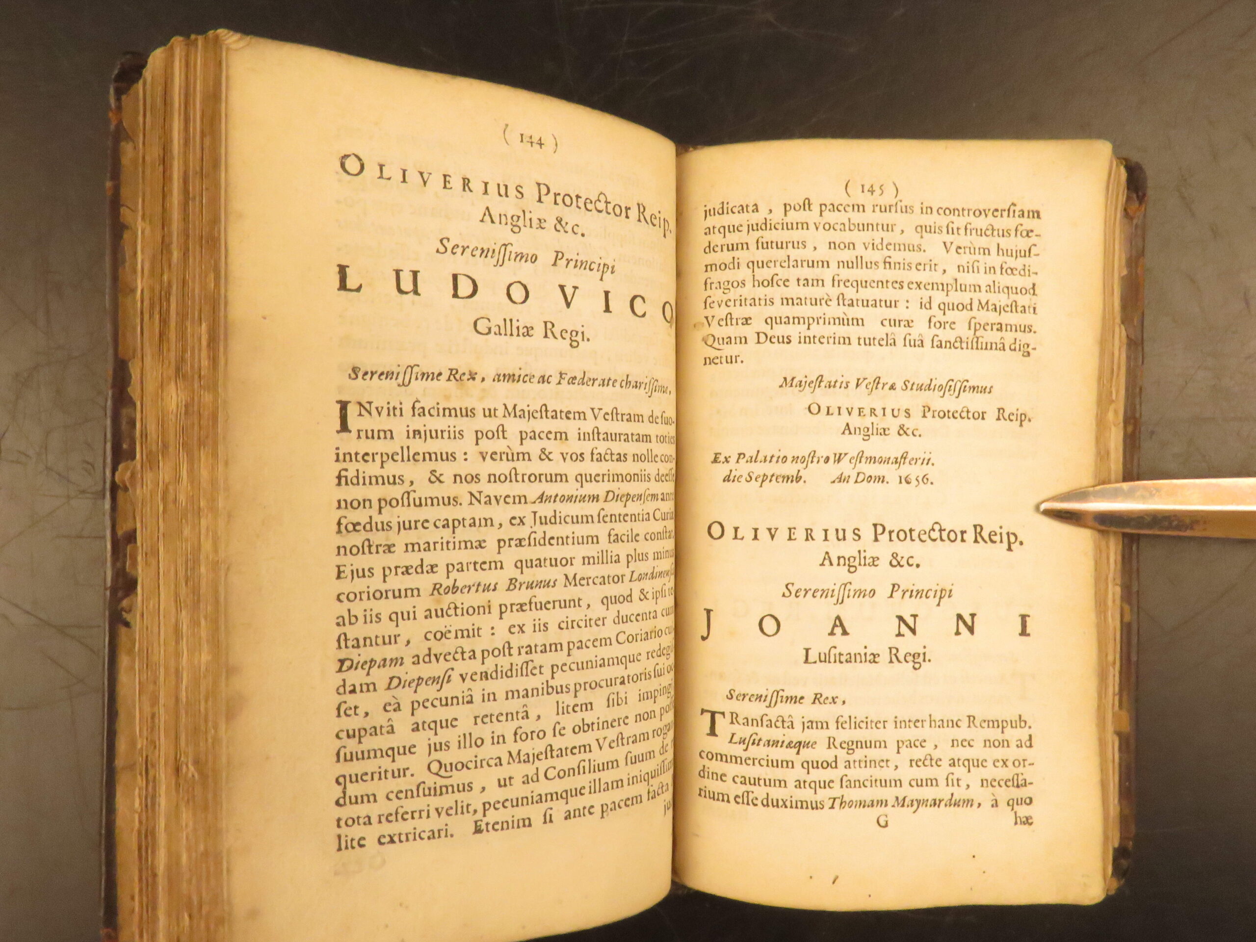 Milton’s 1676 Literæ Pseudo-senatûs first printing in Brussels with the original “basket of fruit” device, containing 136 Latin political dispatches opposing Cromwell’s rule.