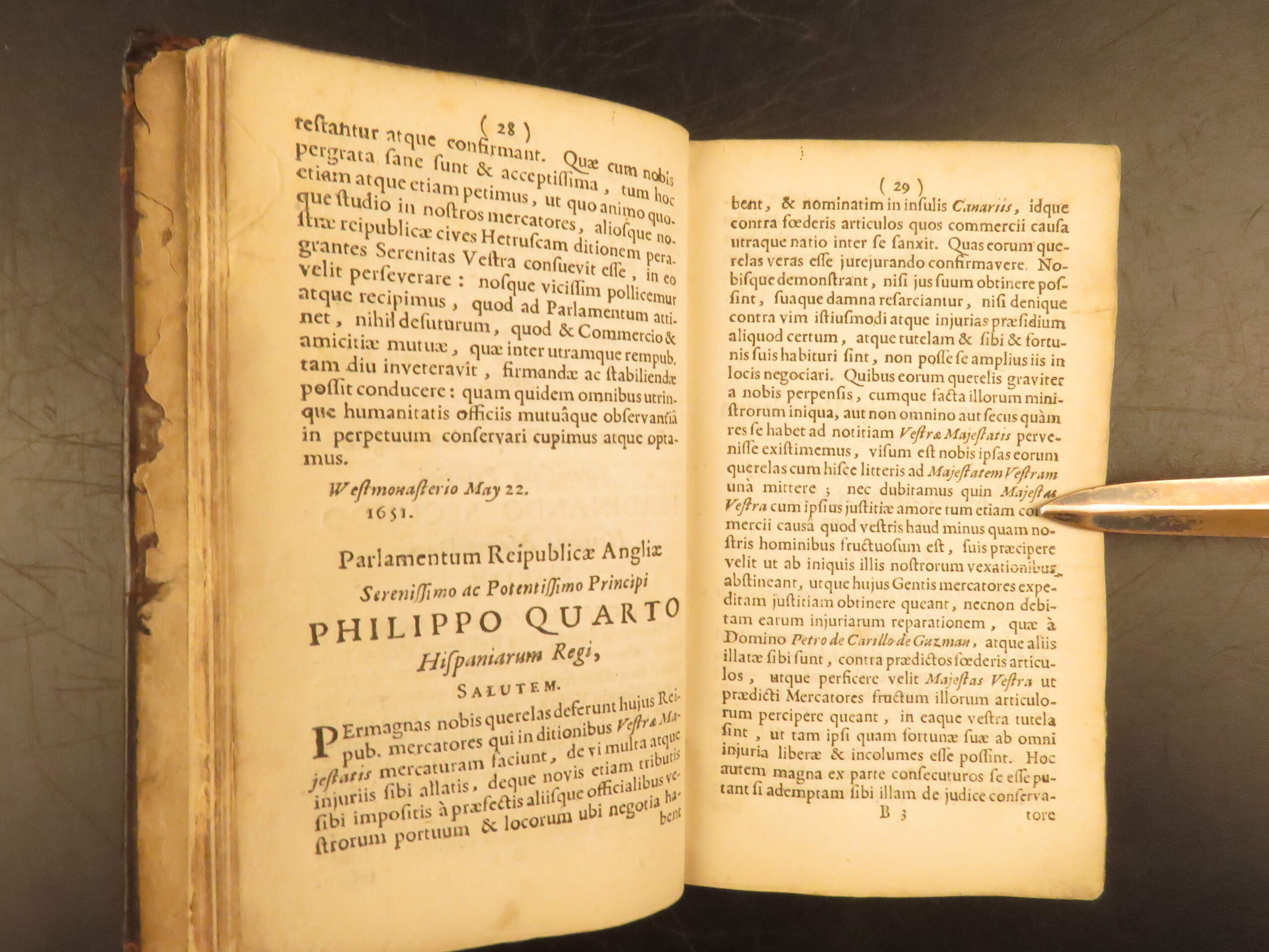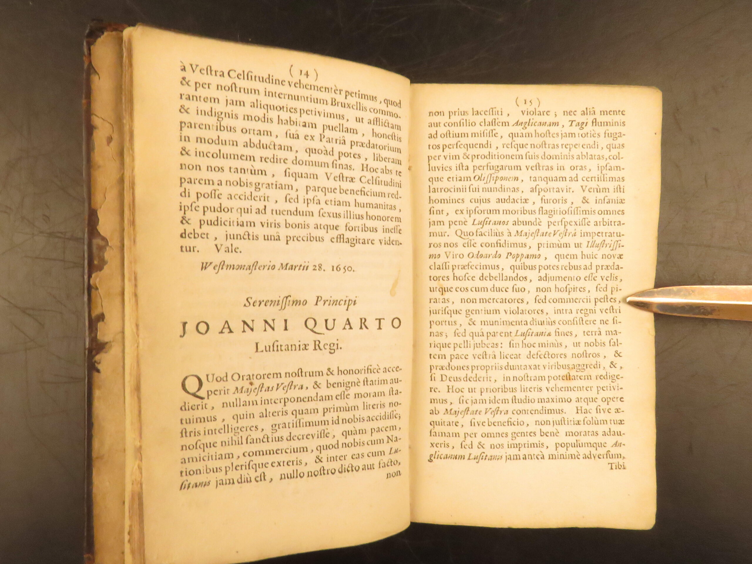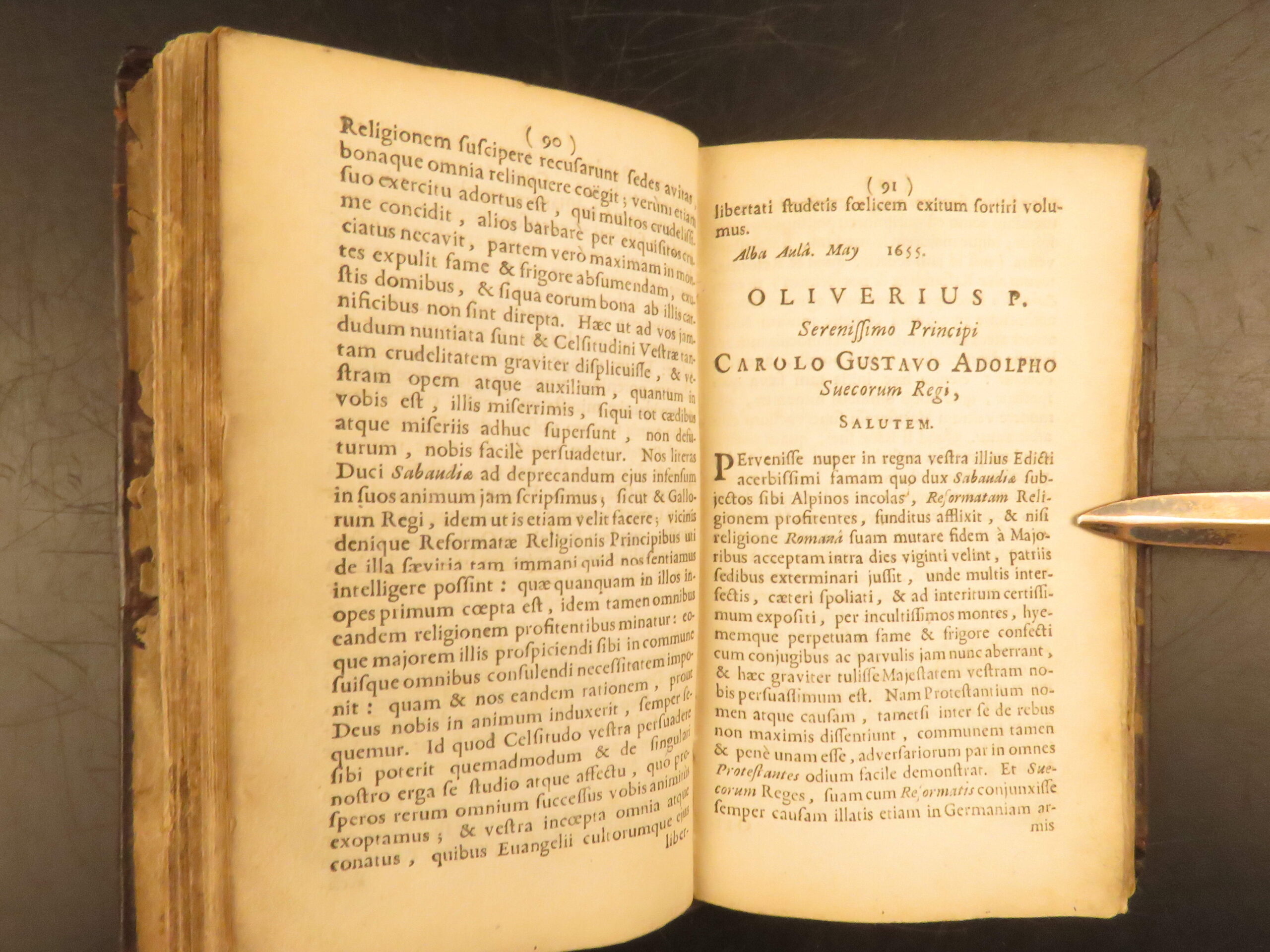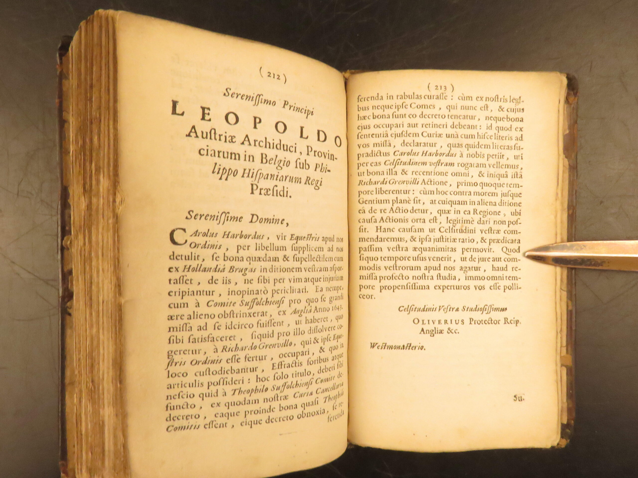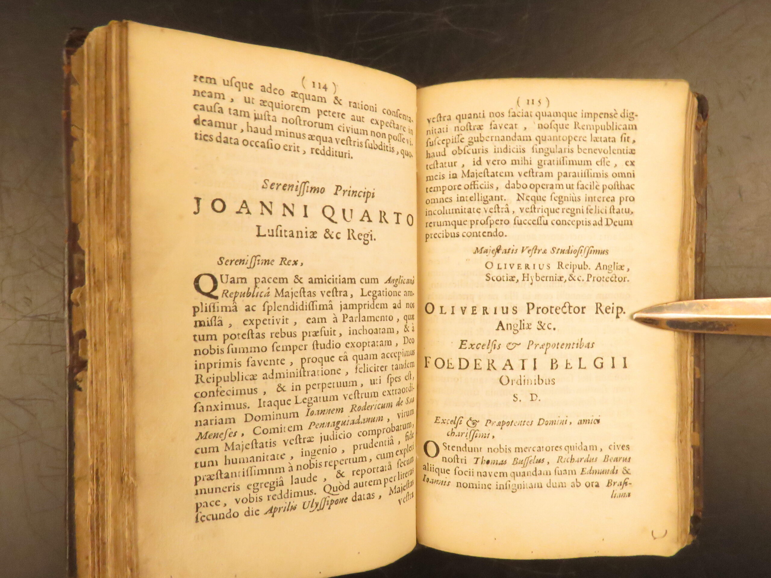 Milton’s 1676 Literæ Pseudo-senatûs first printing in Brussels with the original “basket of fruit” device, containing 136 Latin political dispatches opposing Cromwell’s rule.