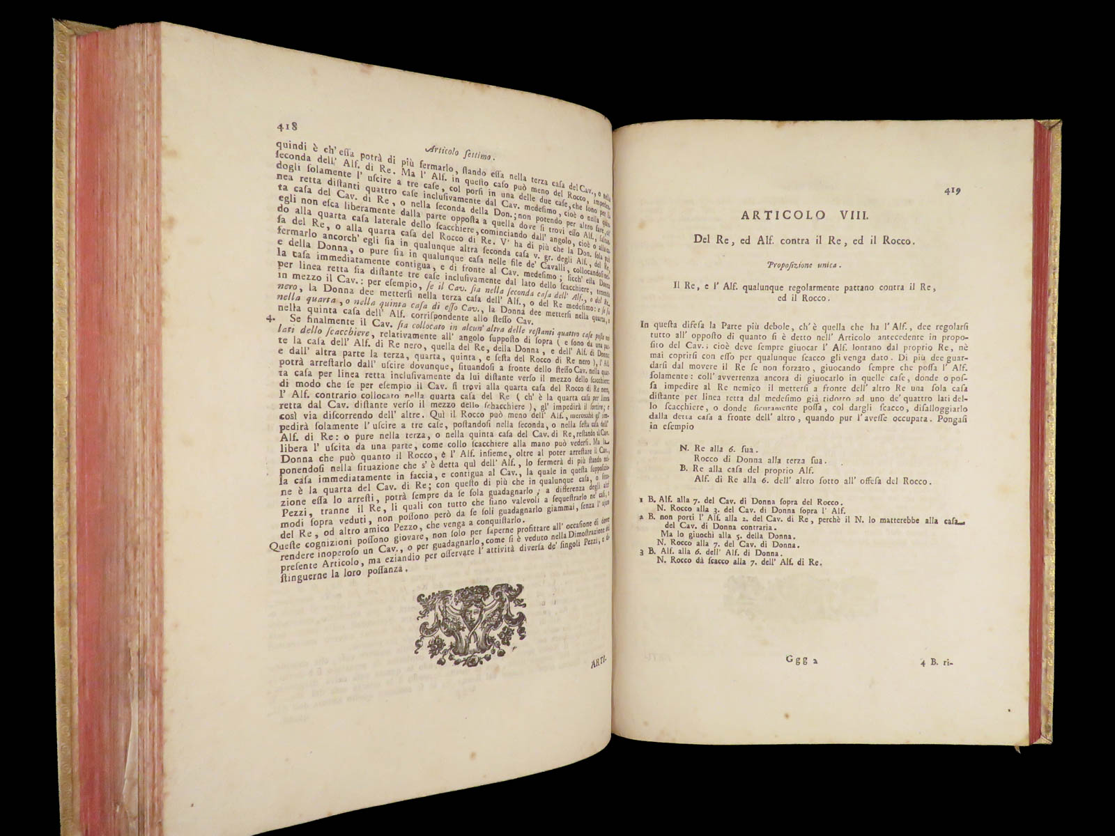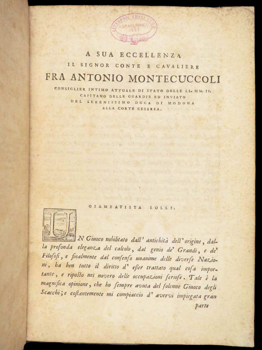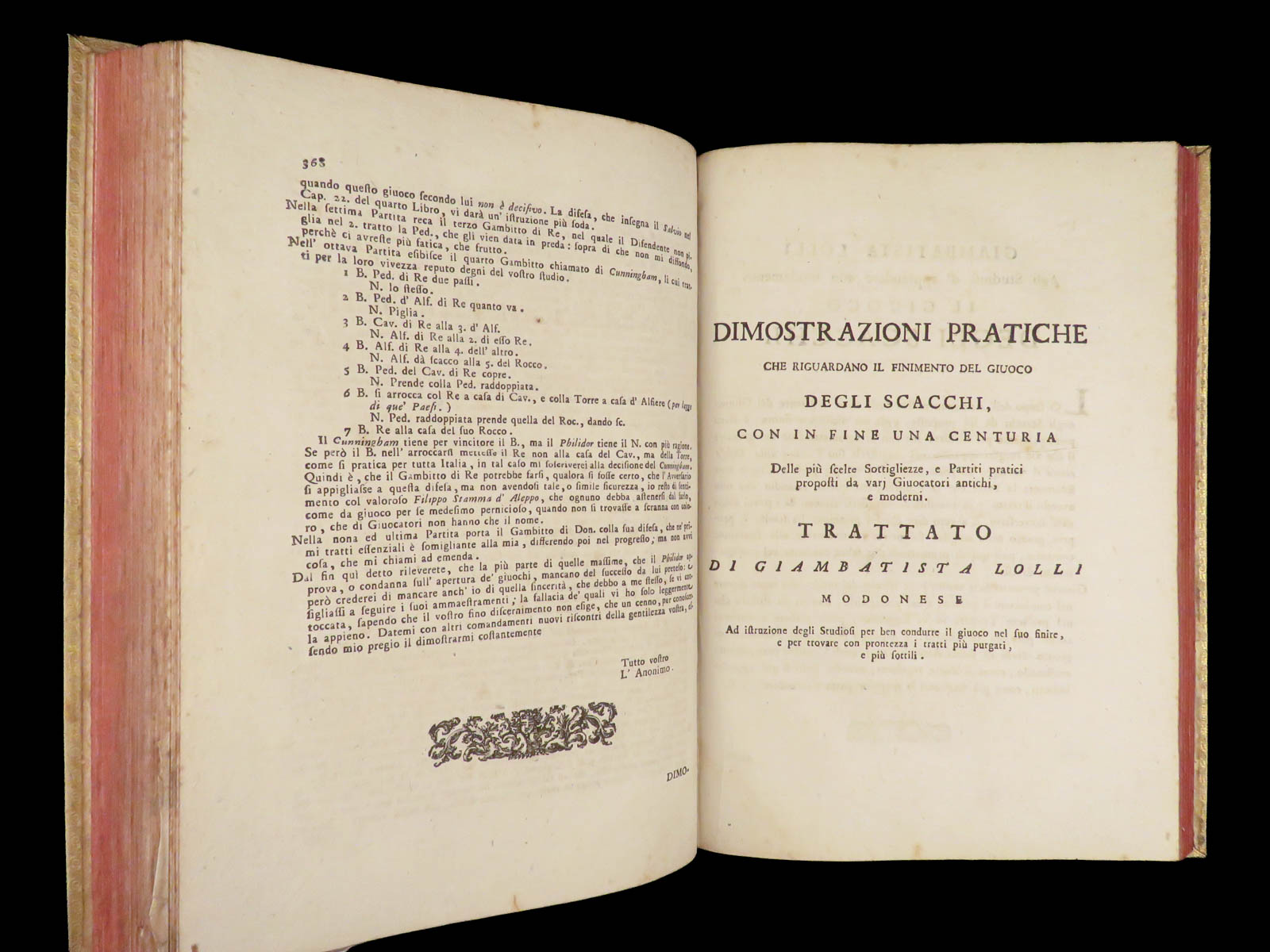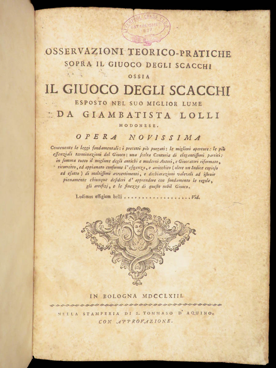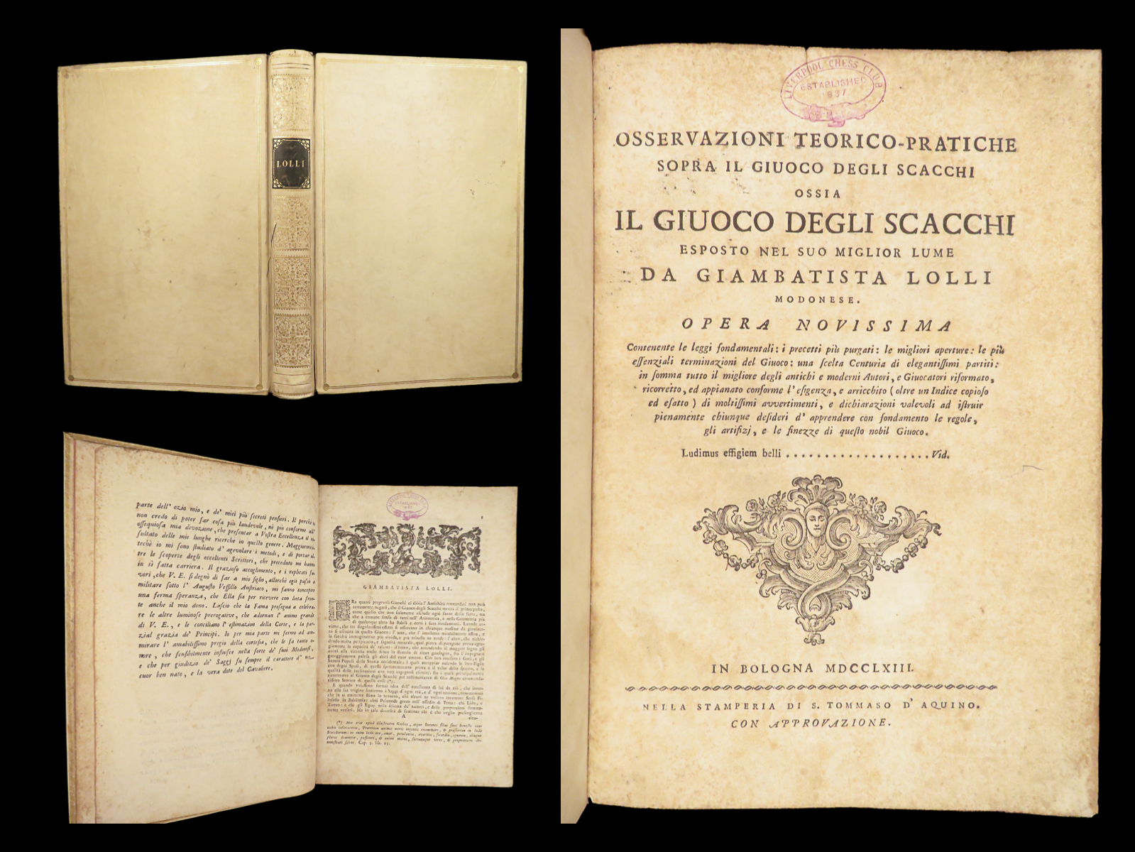 Osservazioni teorico-pratiche sopra il giuoco degli scacchi by Giovanni Battista Lolli is a 1763 chess manual. This folio was the only edition of Lolli’s work, a work that covers major classical openings such as the King’s Gambit, Giuoco Piano, and the Two Knights Defense. It also contains one hundred endgame problems, one of which later appeared in Wilhelm Heinse’s novel Anastasia und das Schachspiel. It is known to have the first printed record “Lolli’s Mate”, a tactical queen-and-pawn checkmate sequence still studied today, that was named after Lolli himself.