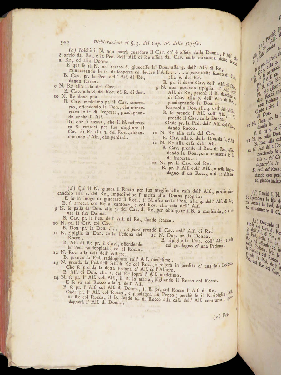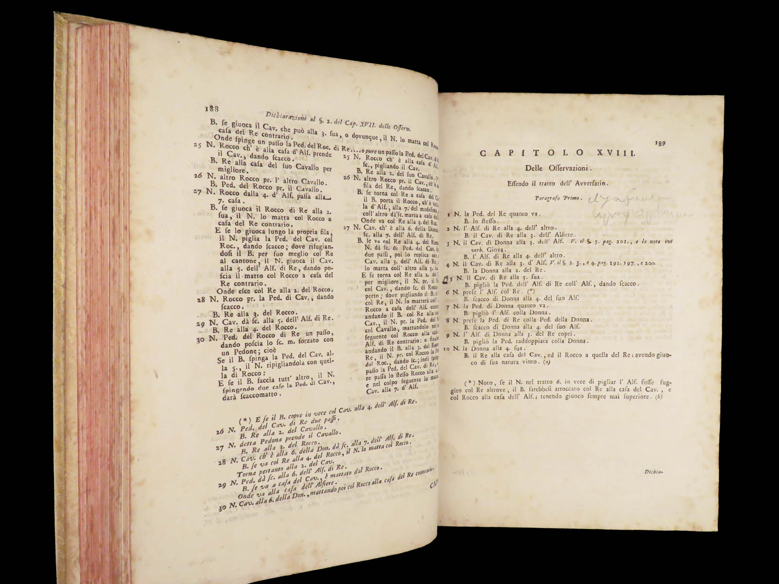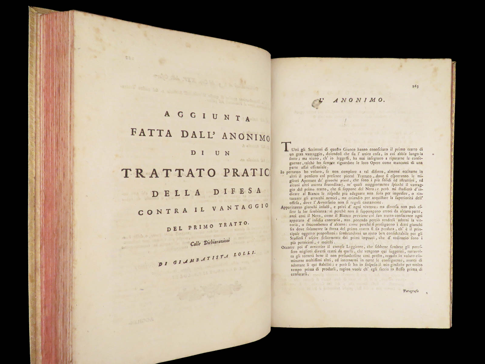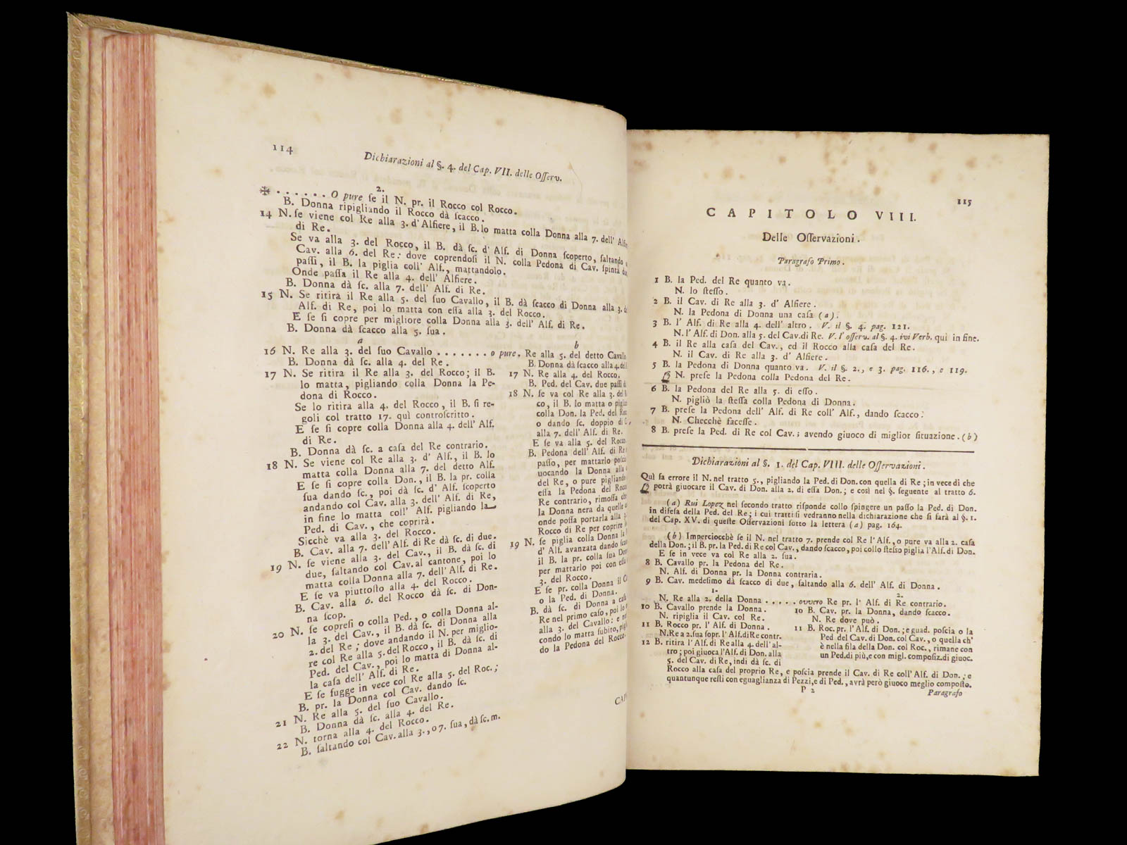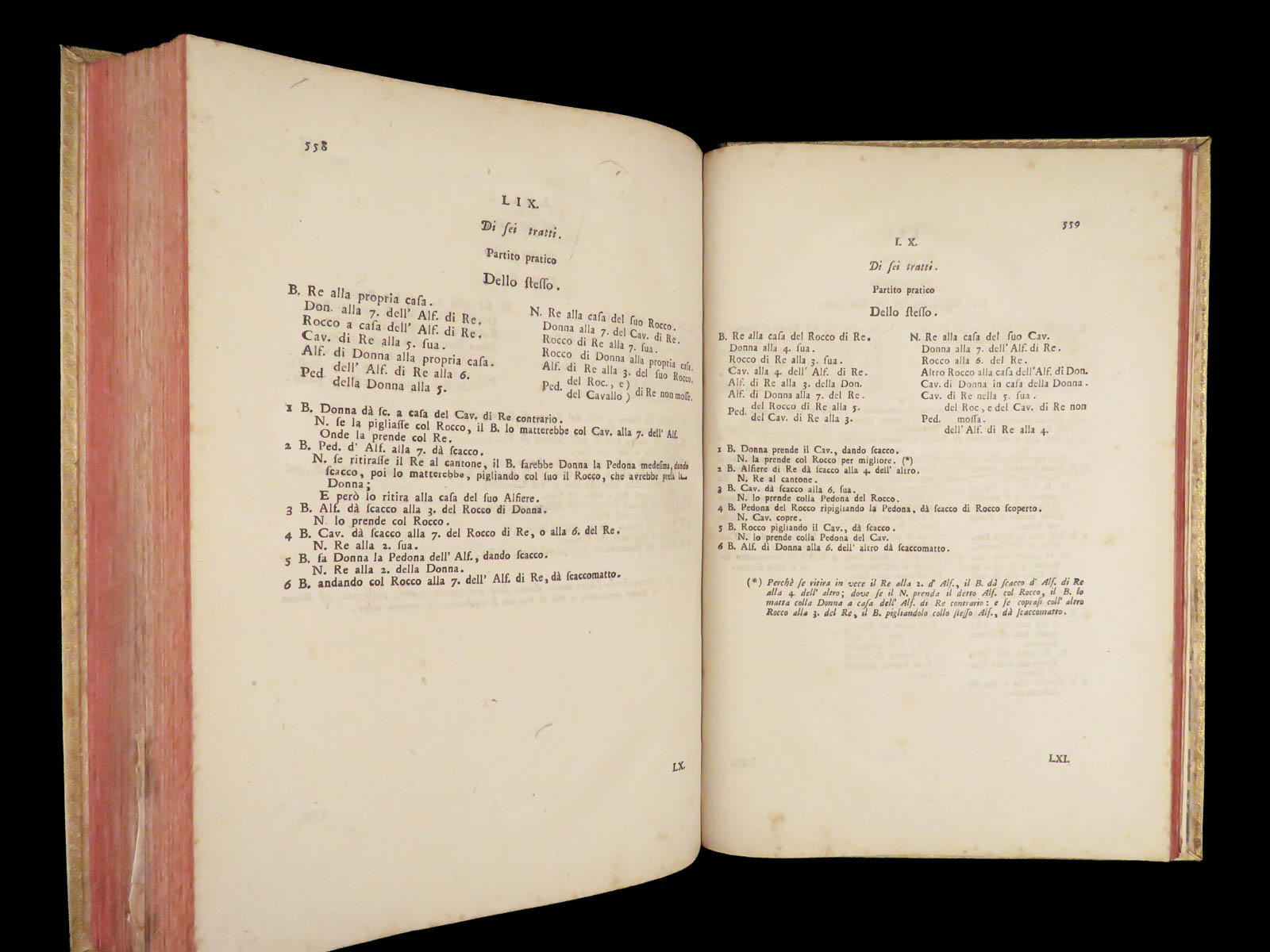 Osservazioni teorico-pratiche sopra il giuoco degli scacchi by Giovanni Battista Lolli is a 1763 chess manual. This folio was the only edition of Lolli’s work, a work that covers major classical openings such as the King’s Gambit, Giuoco Piano, and the Two Knights Defense. It also contains one hundred endgame problems, one of which later appeared in Wilhelm Heinse’s novel Anastasia und das Schachspiel. It is known to have the first printed record “Lolli’s Mate”, a tactical queen-and-pawn checkmate sequence still studied today, that was named after Lolli himself.