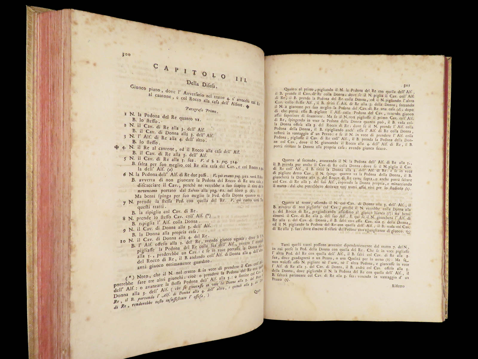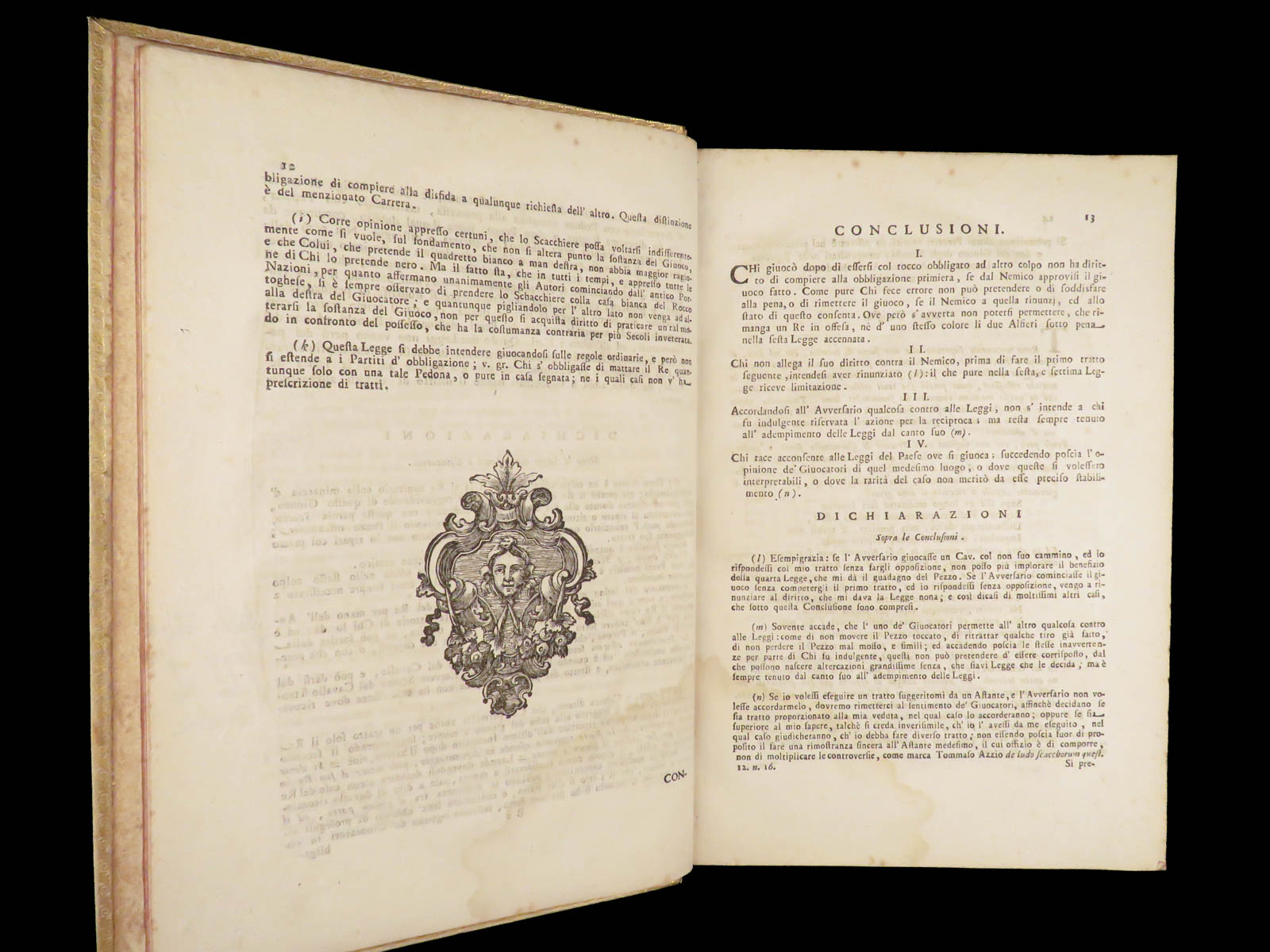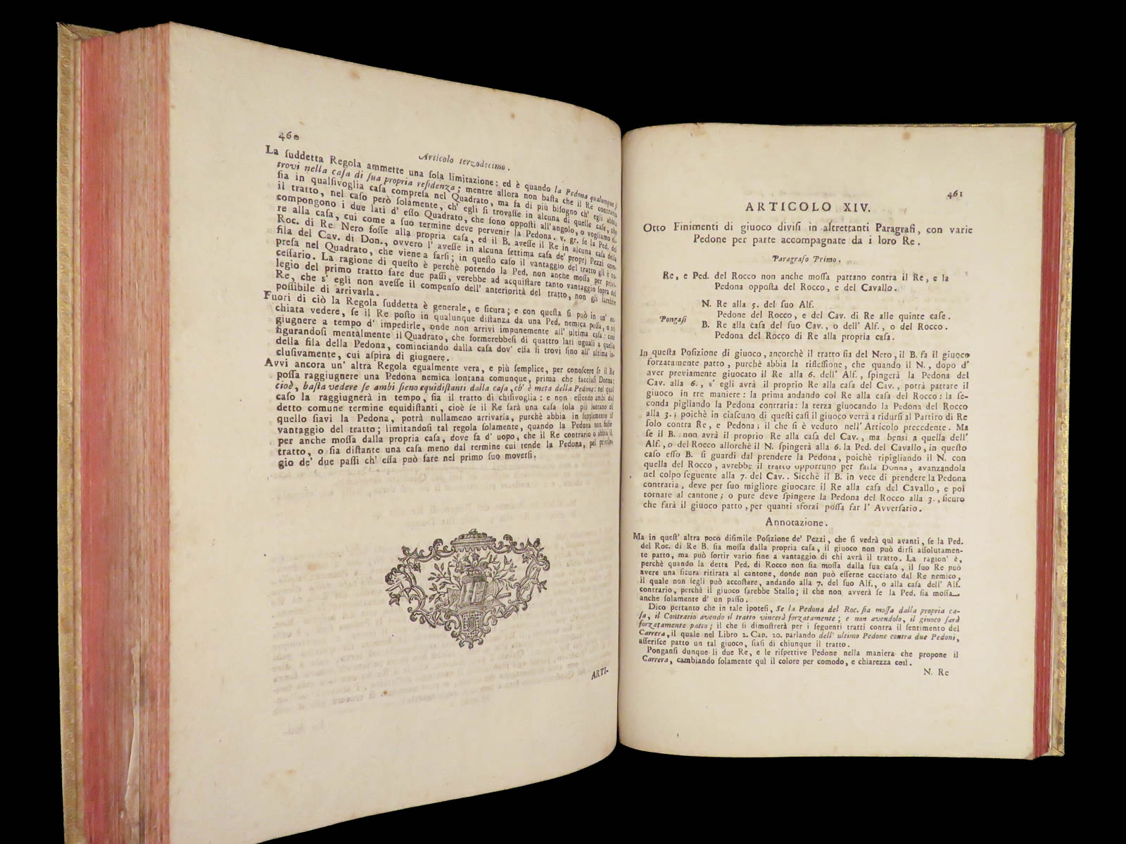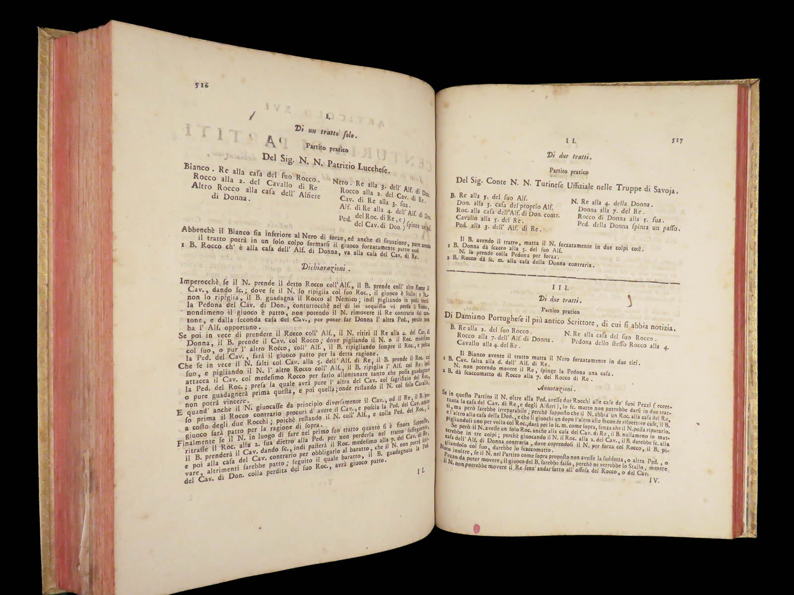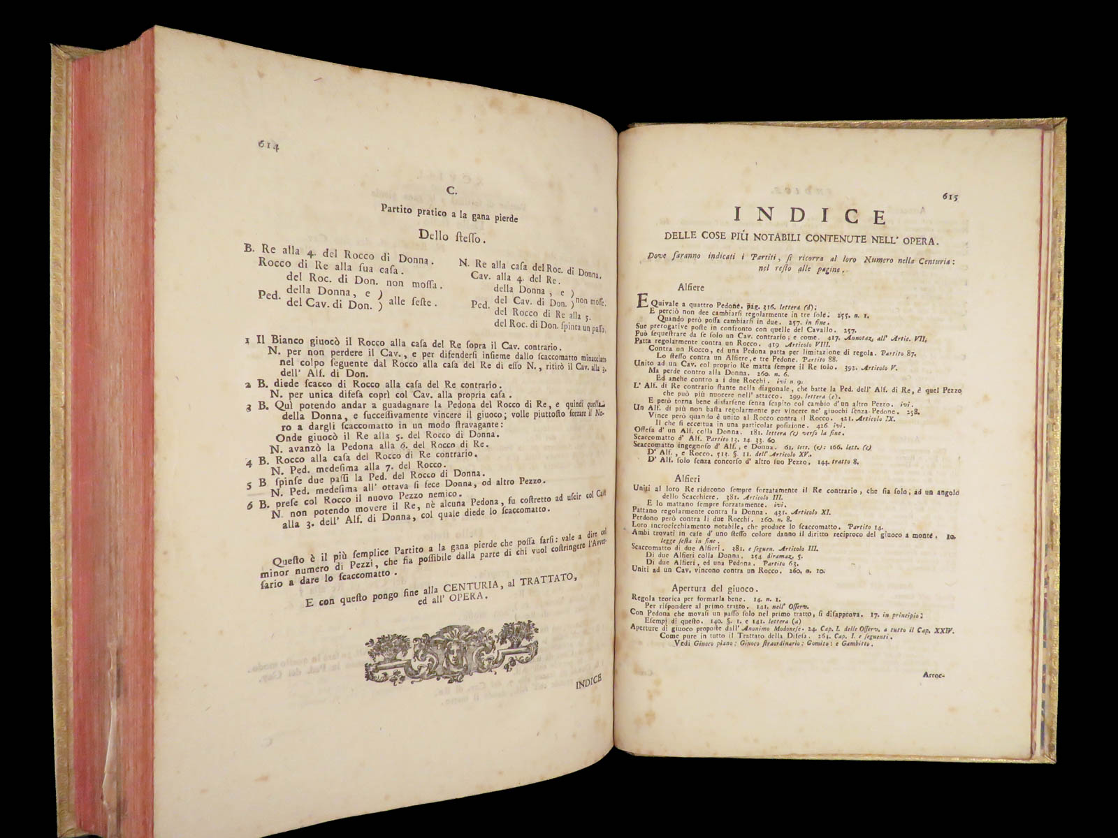 Osservazioni teorico-pratiche sopra il giuoco degli scacchi by Giovanni Battista Lolli is a 1763 chess manual. This folio was the only edition of Lolli’s work, a work that covers major classical openings such as the King’s Gambit, Giuoco Piano, and the Two Knights Defense. It also contains one hundred endgame problems, one of which later appeared in Wilhelm Heinse’s novel Anastasia und das Schachspiel. It is known to have the first printed record “Lolli’s Mate”, a tactical queen-and-pawn checkmate sequence still studied today, that was named after Lolli himself.