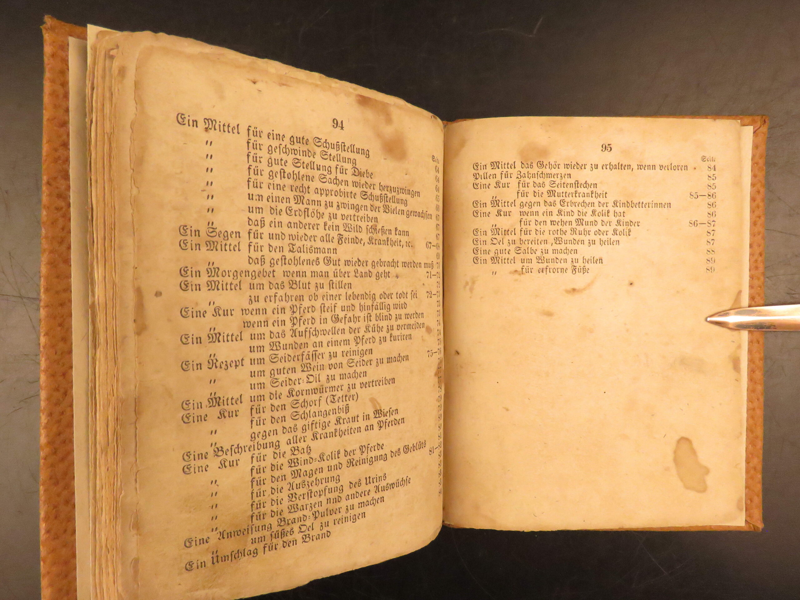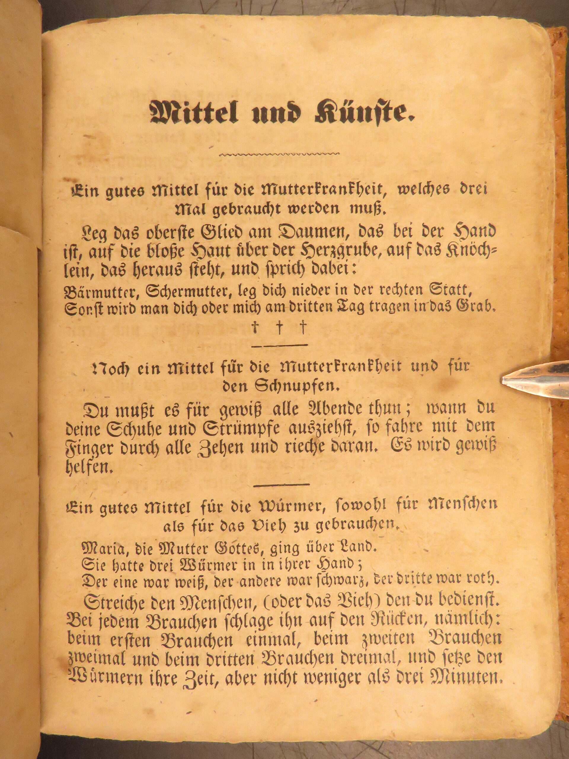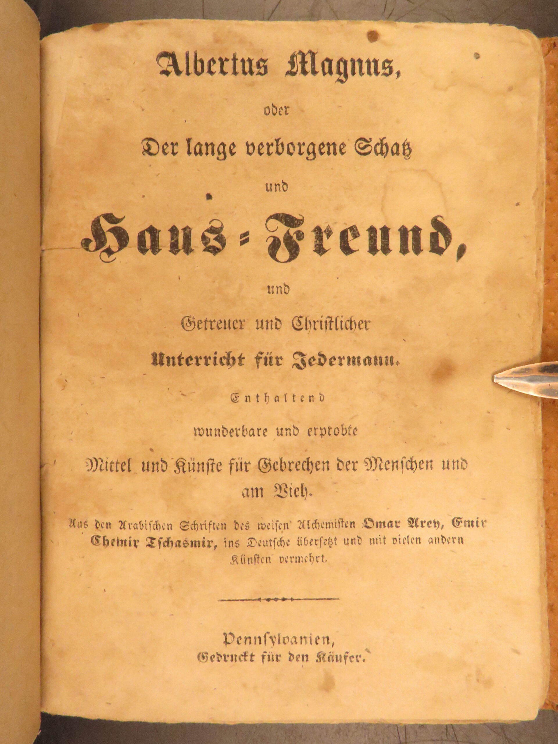 Der lange verborgene Freund, known in English as The Long Lost Friend, is one of the most commonly cited manuals of folk practice printed for the Pennsylvania German population. This 1839 printing, produced in Pennsylvania and issued directly for buyers, contains spells, prayers, and healing remedies designed for rural life. The text addresses both people and livestock, with entries for illness, injury, misfortune, and daily care. Its presence in farm households was widespread among German-speaking communities during the early 19th century.