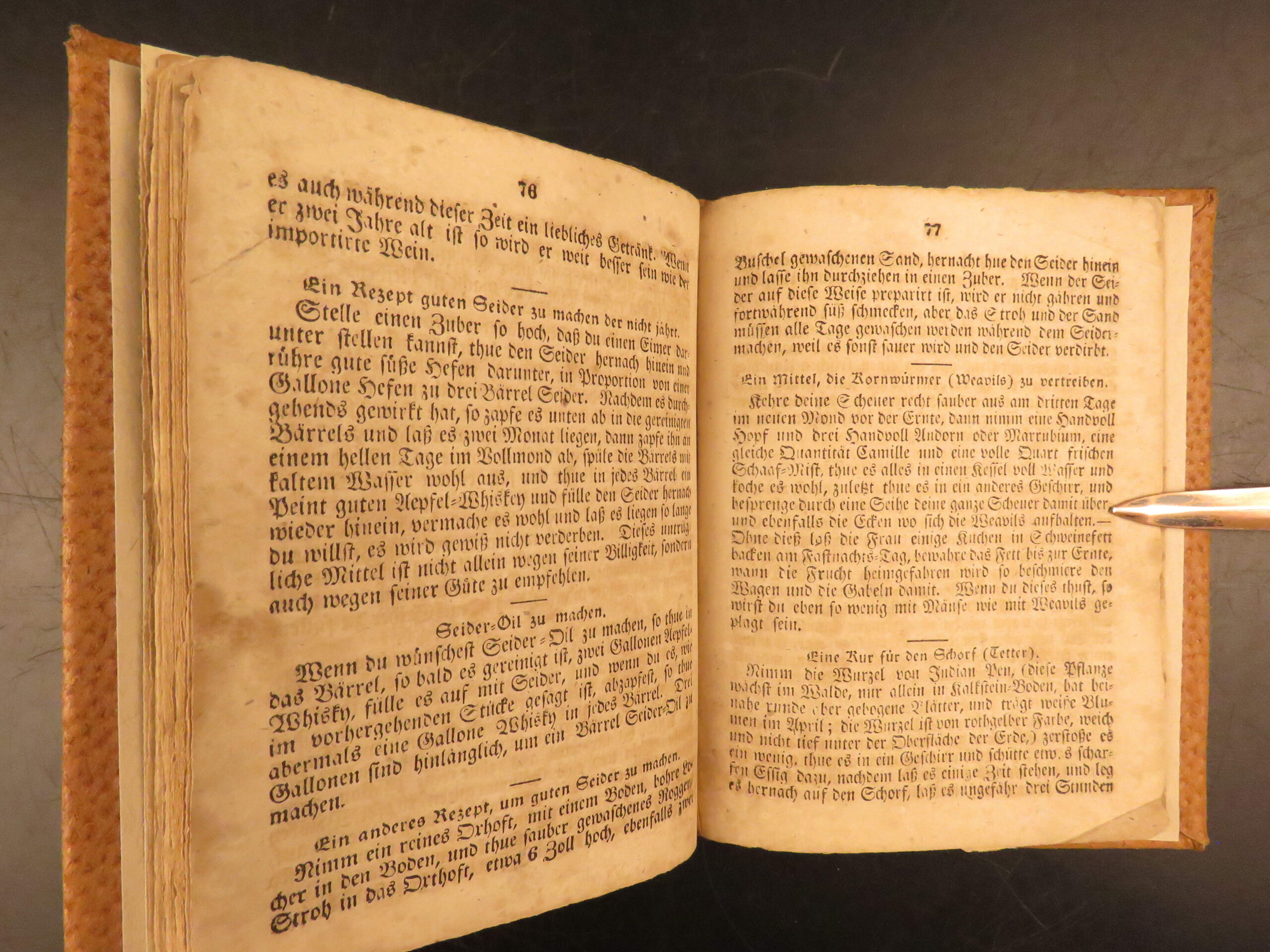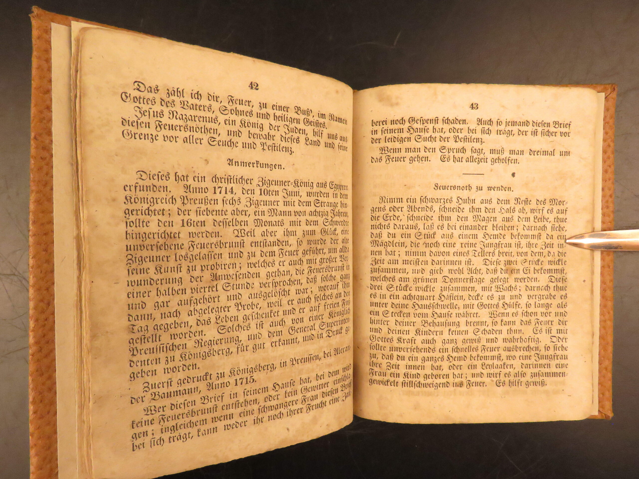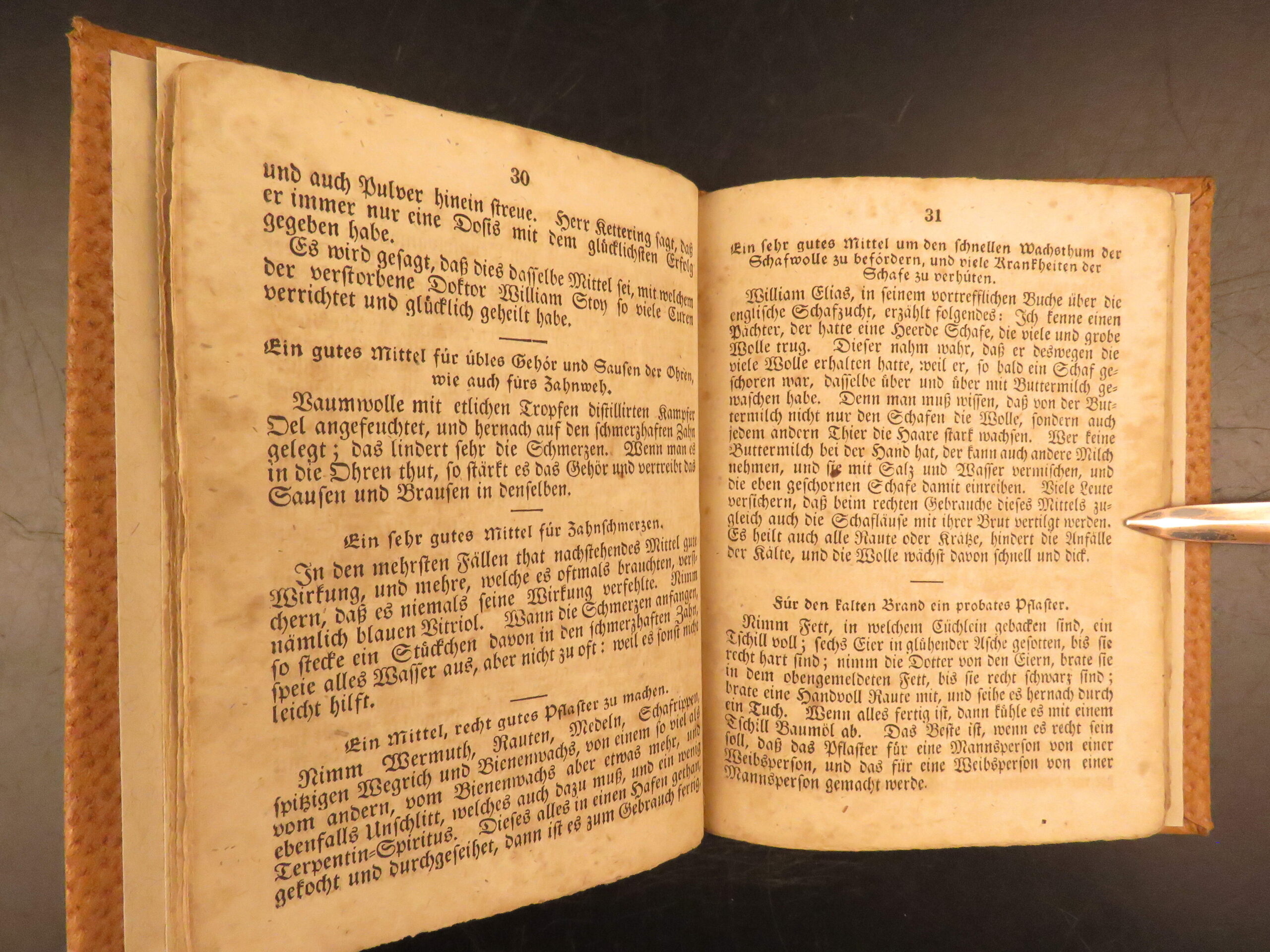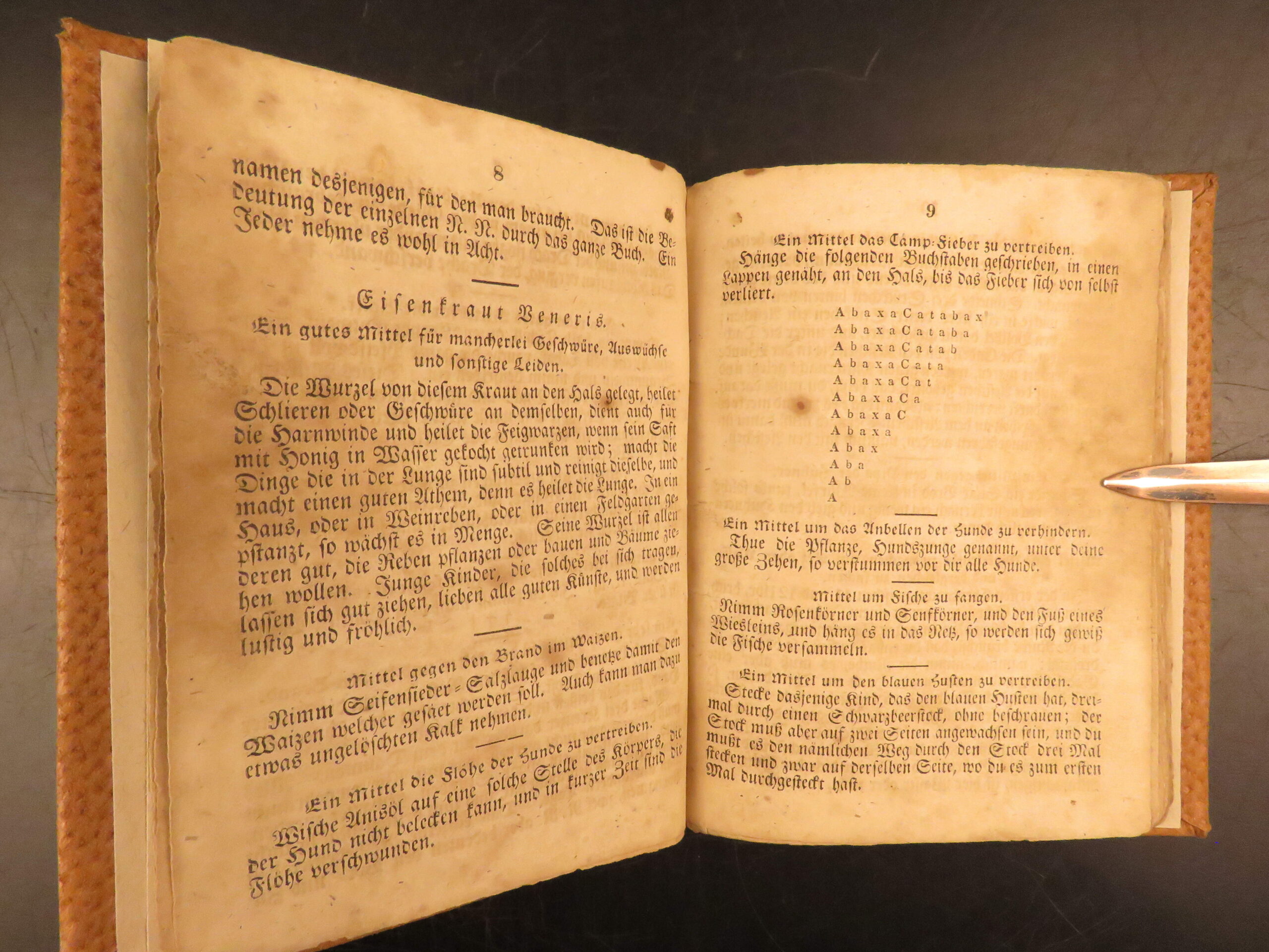Der lange verborgene Freund, known in English as The Long Lost Friend, is one of the most commonly cited manuals of folk practice printed for the Pennsylvania German population. This 1839 printing, produced in Pennsylvania and issued directly for buyers, contains spells, prayers, and healing remedies designed for rural life. The text addresses both people and livestock, with entries for illness, injury, misfortune, and daily care. Its presence in farm households was widespread among German-speaking communities during the early 19th century.