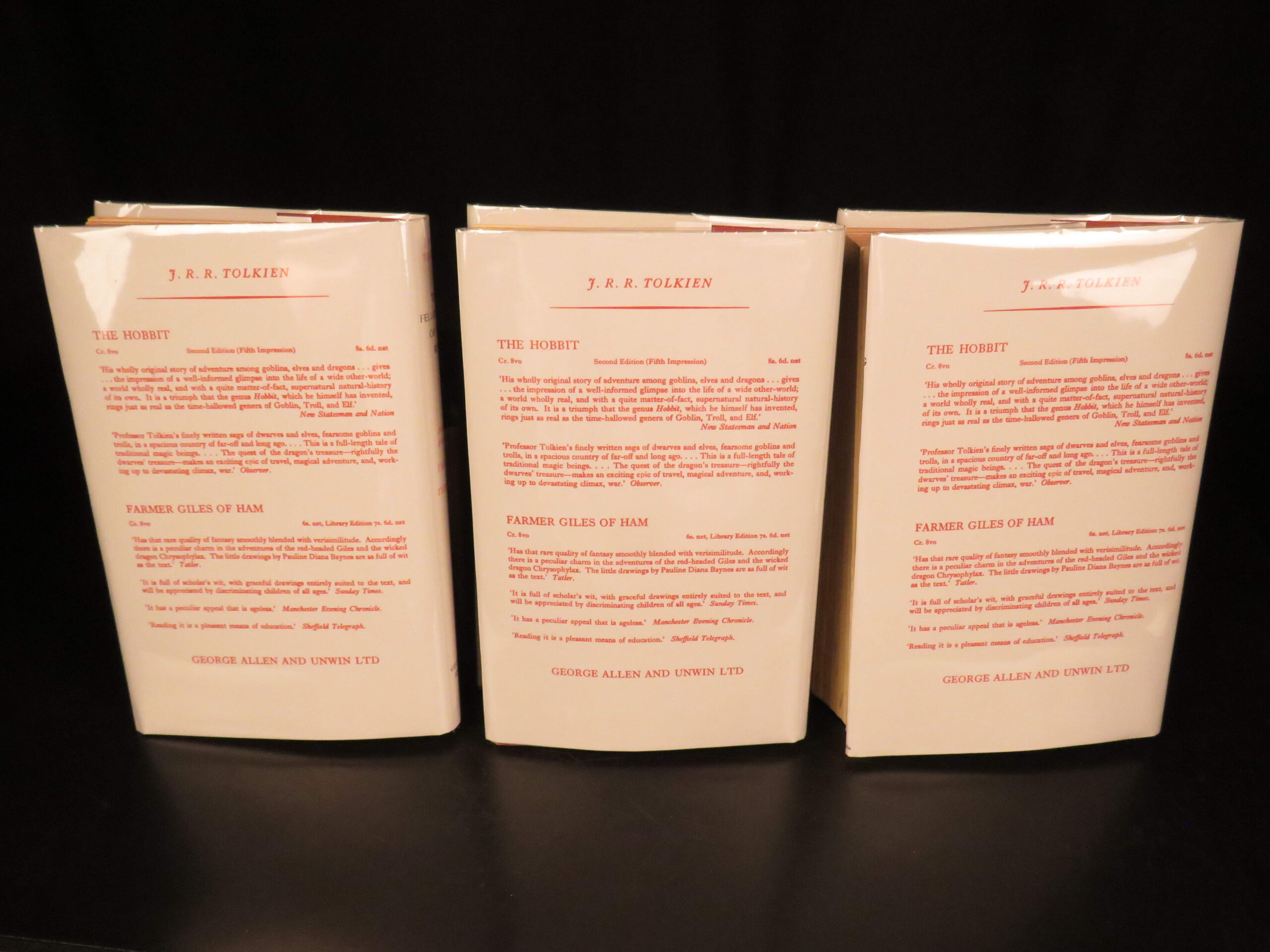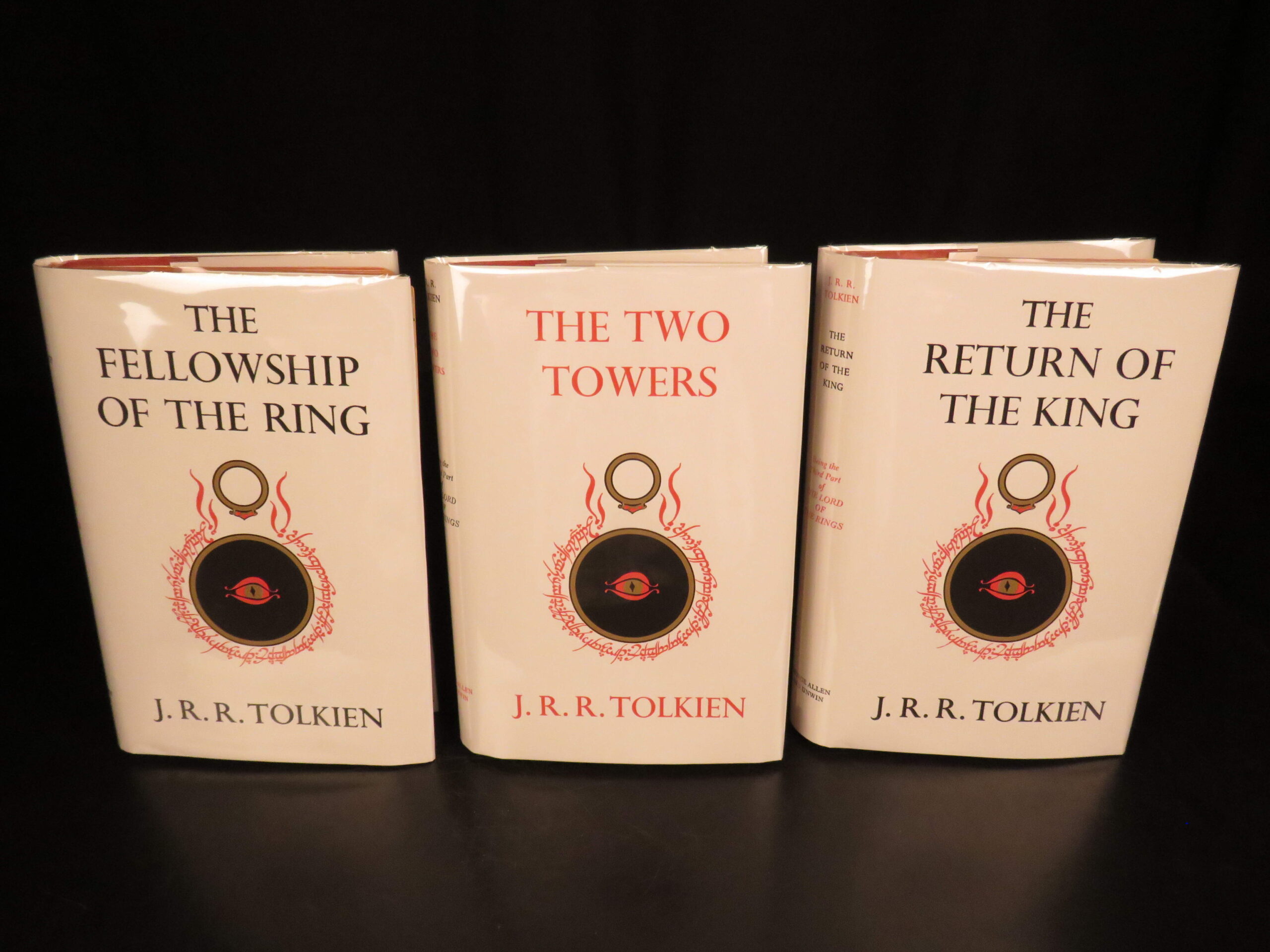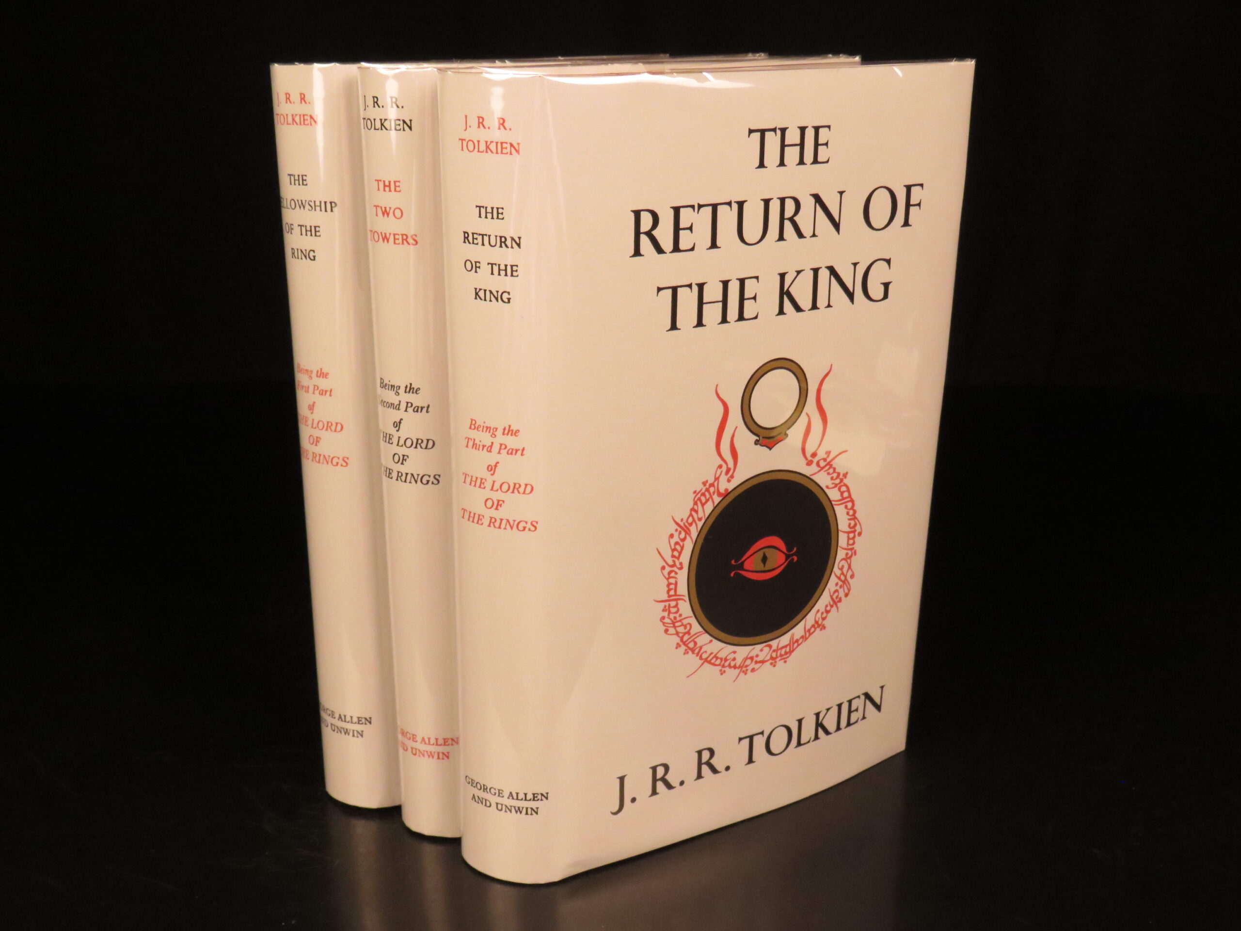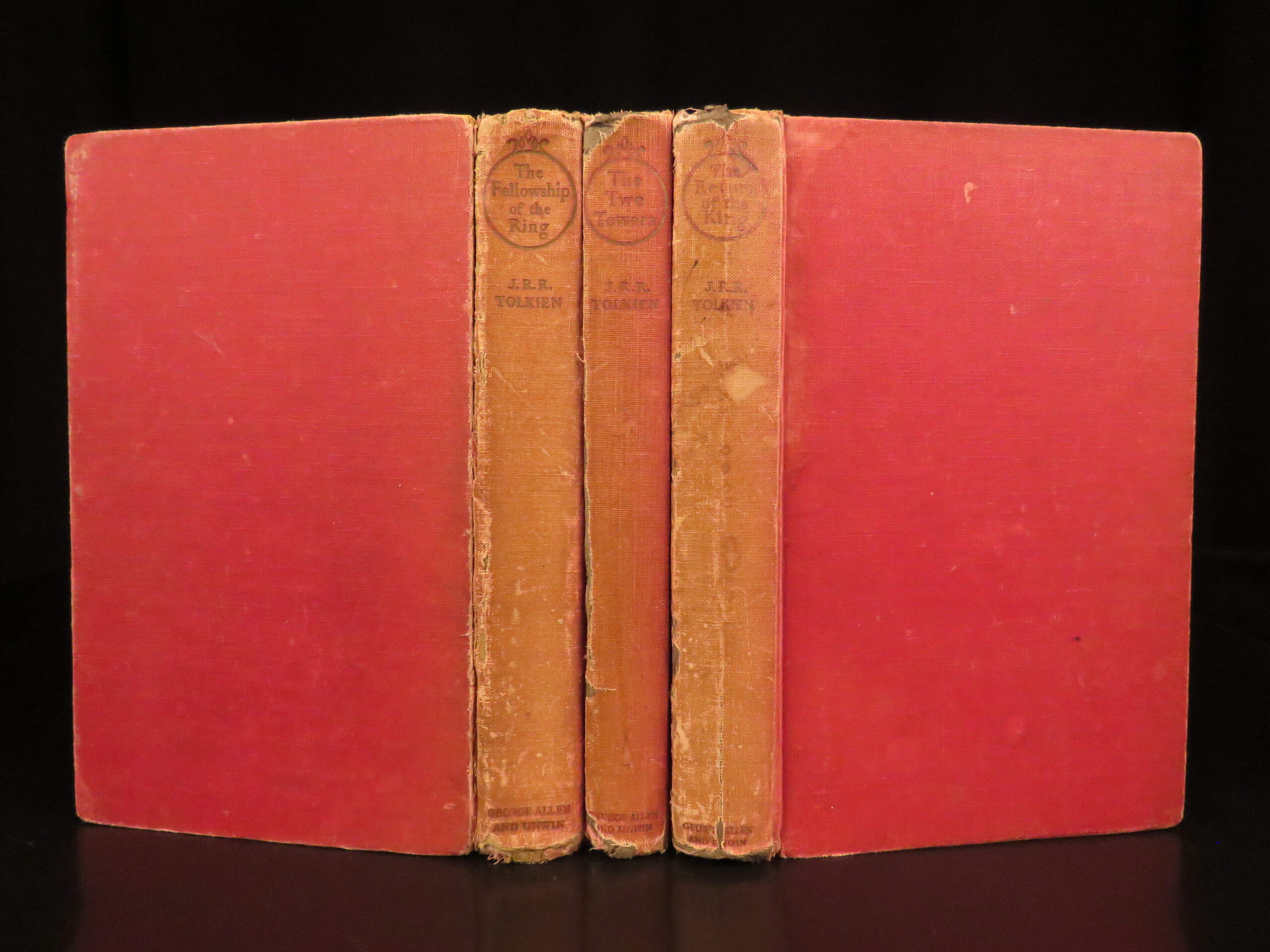 Fair. The original red cloth bindings show moderate edgewear and rubbing, with significant fraying and fading on the spines. Text blocks in Fellowship and Two Towers are tight, while Return of the King is somewhat looser but intact. The hinges are secure after repair. Fellowship and Towers wanting the folding maps. Endpapers are browned and somewhat foxed, though overall the text is clean. Each volume includes a professionally produced facsimile dust jacket, all in Excellent condition.