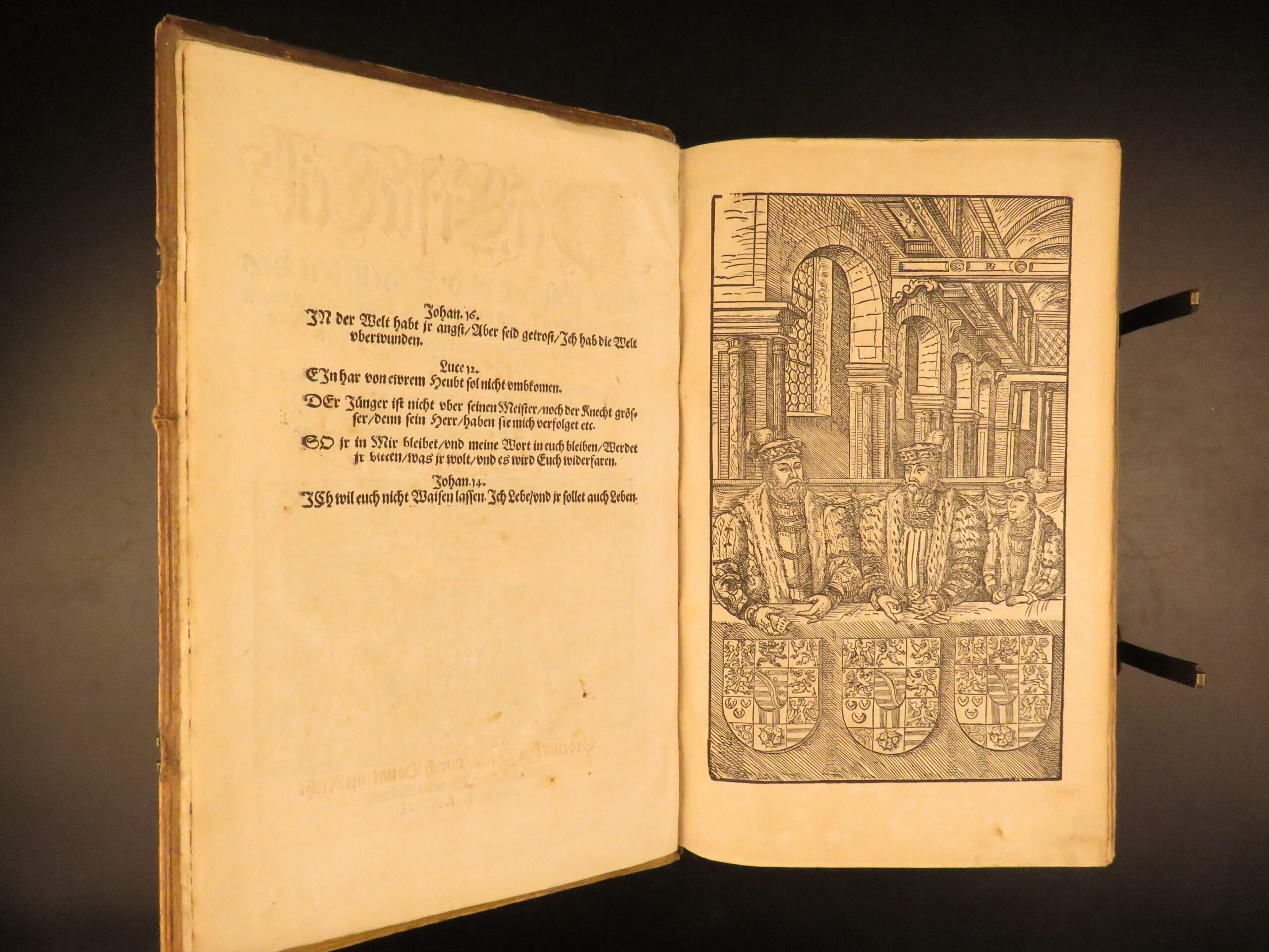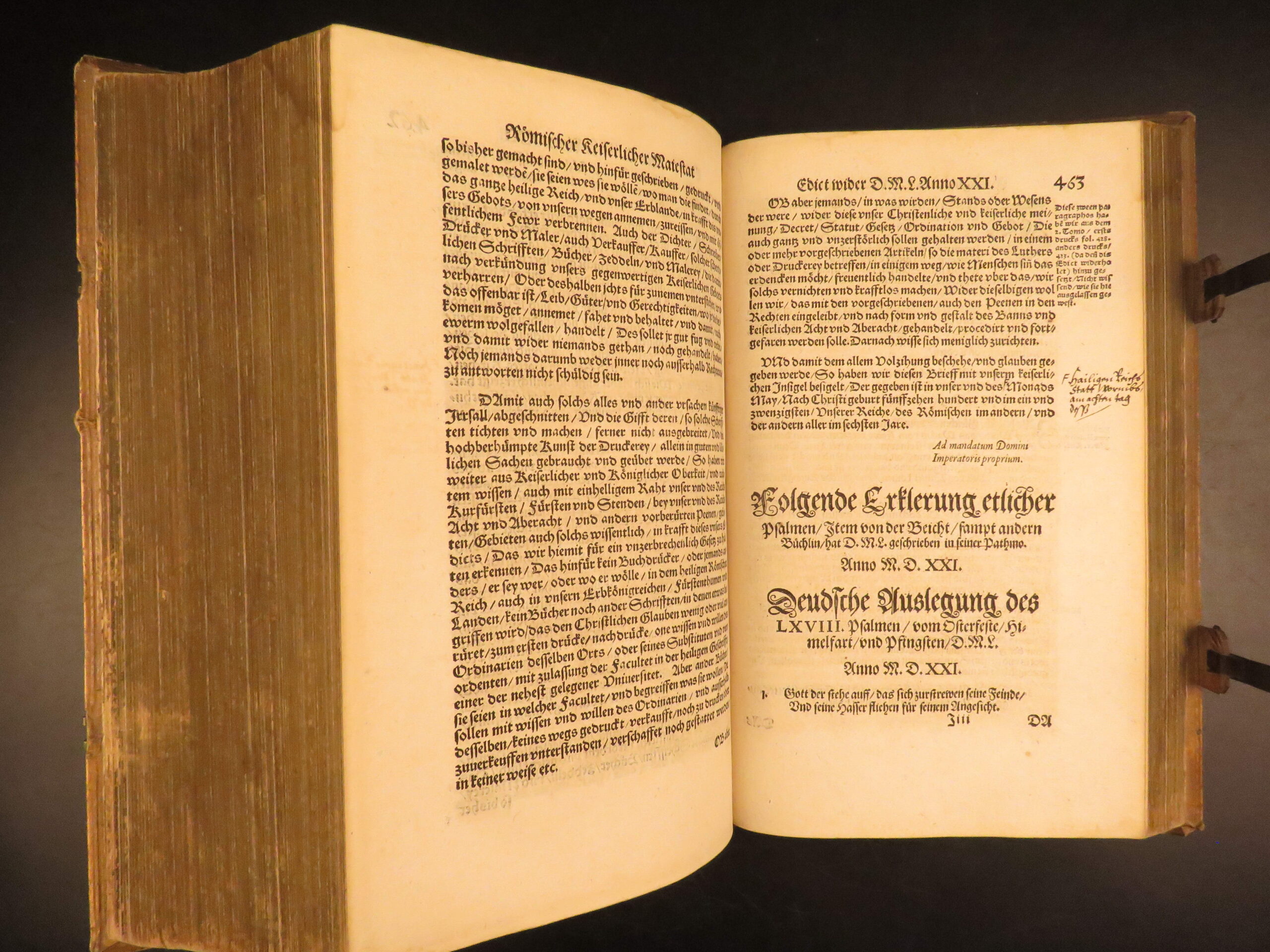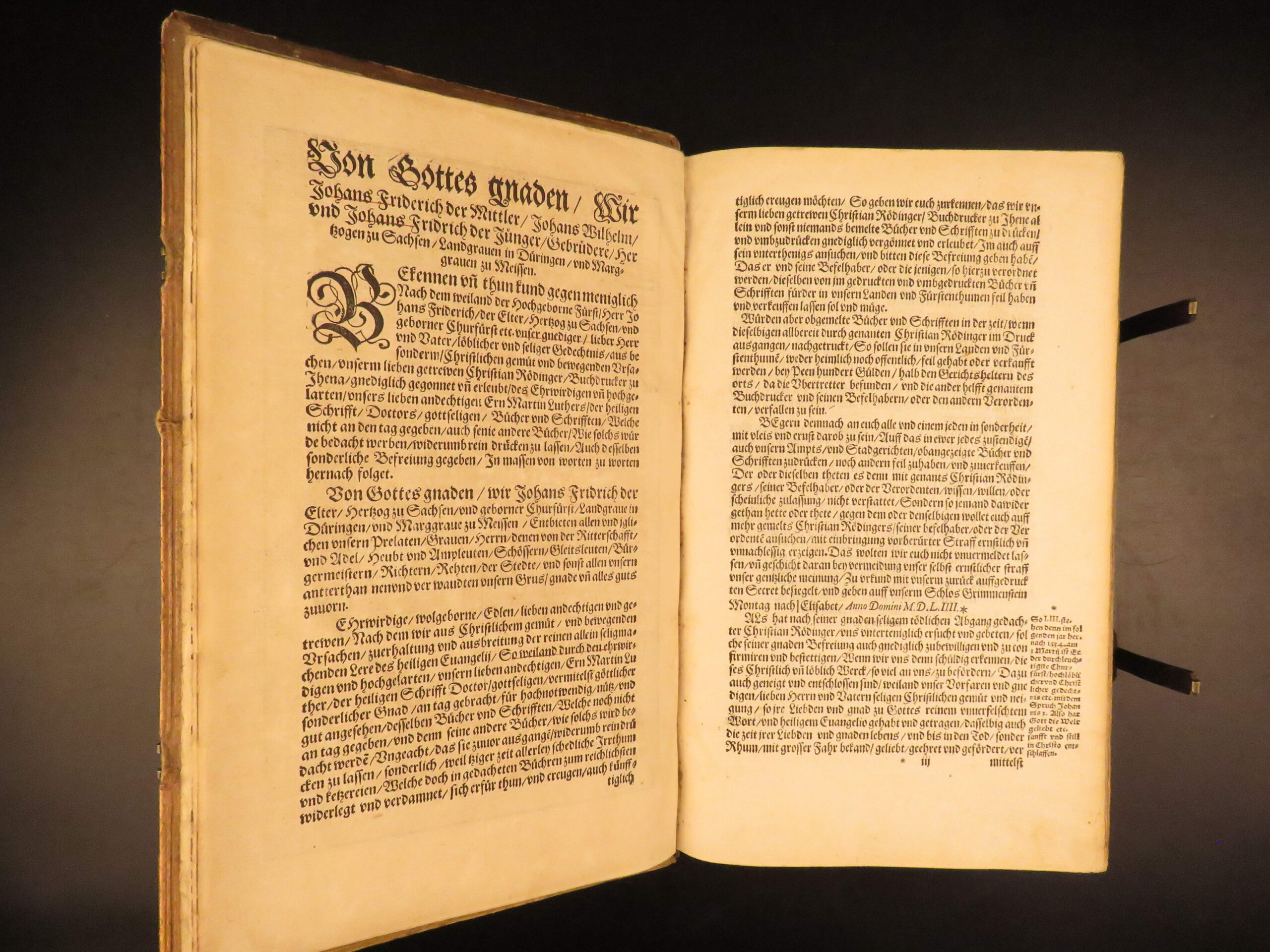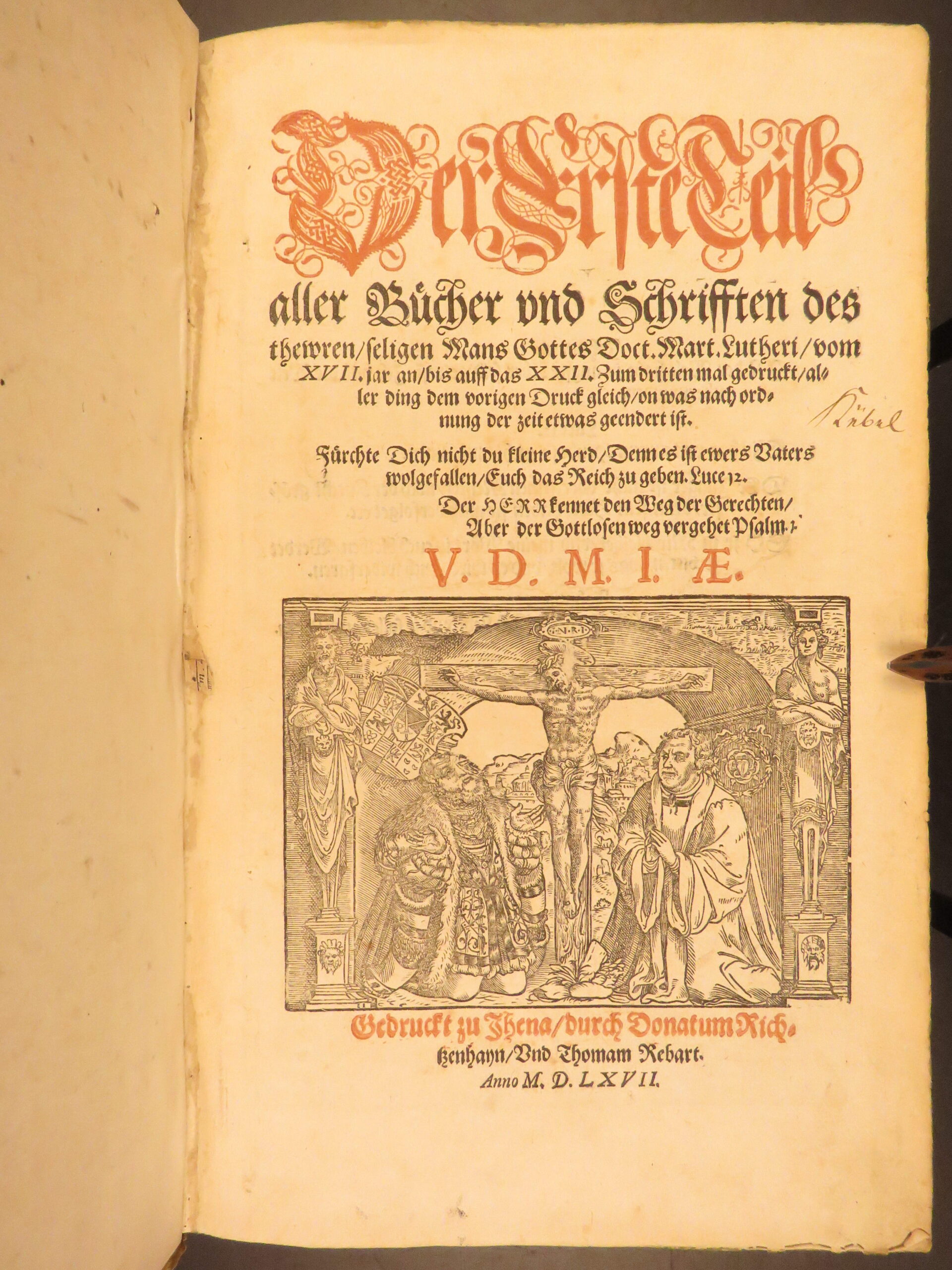 1567 Jena folio of Martin Luther’s collected writings, including sermons, Psalms commentary, and the Magnificat, edited by Amsdorff and Kirchner with engraving and original vellum binding.