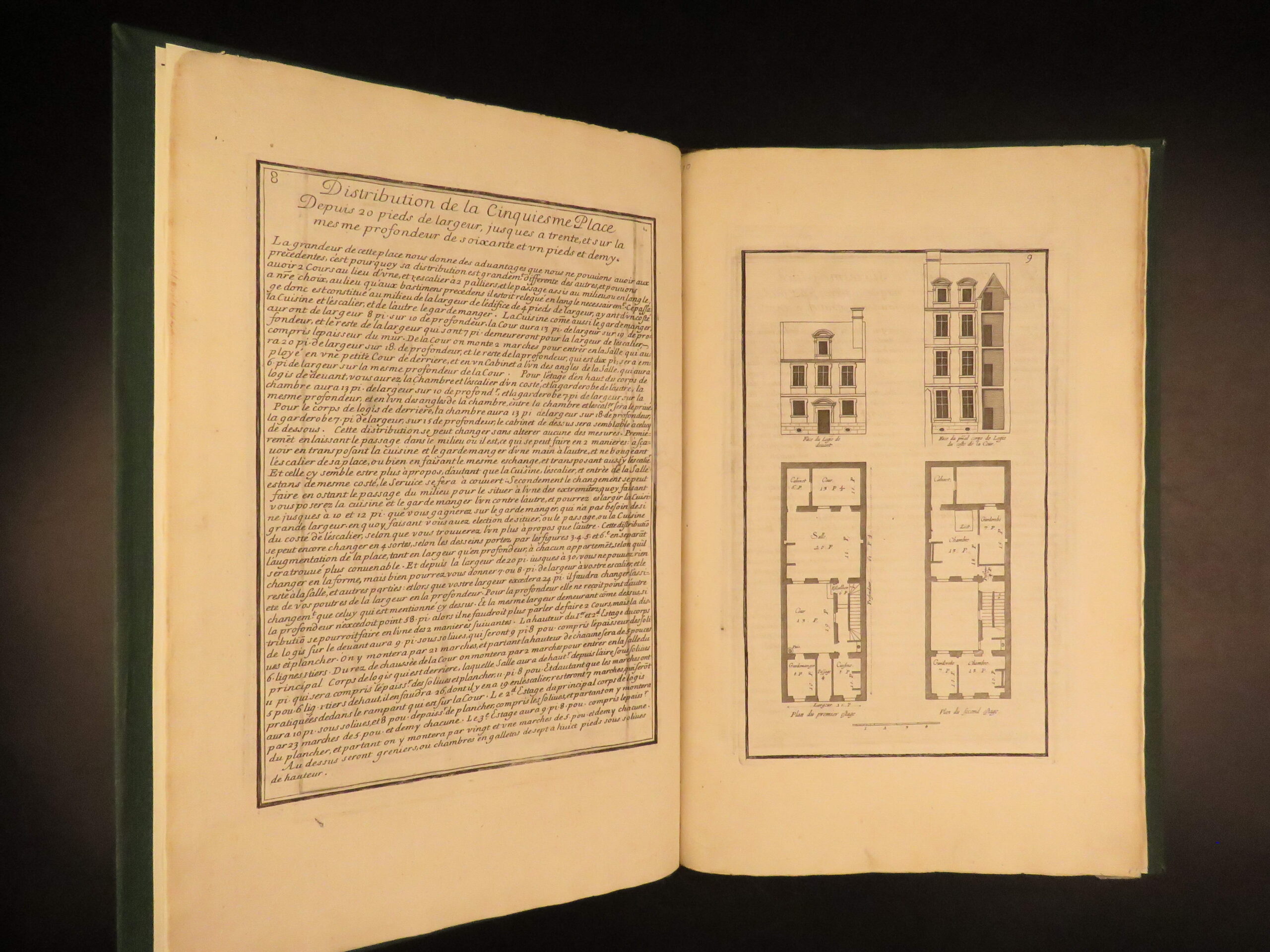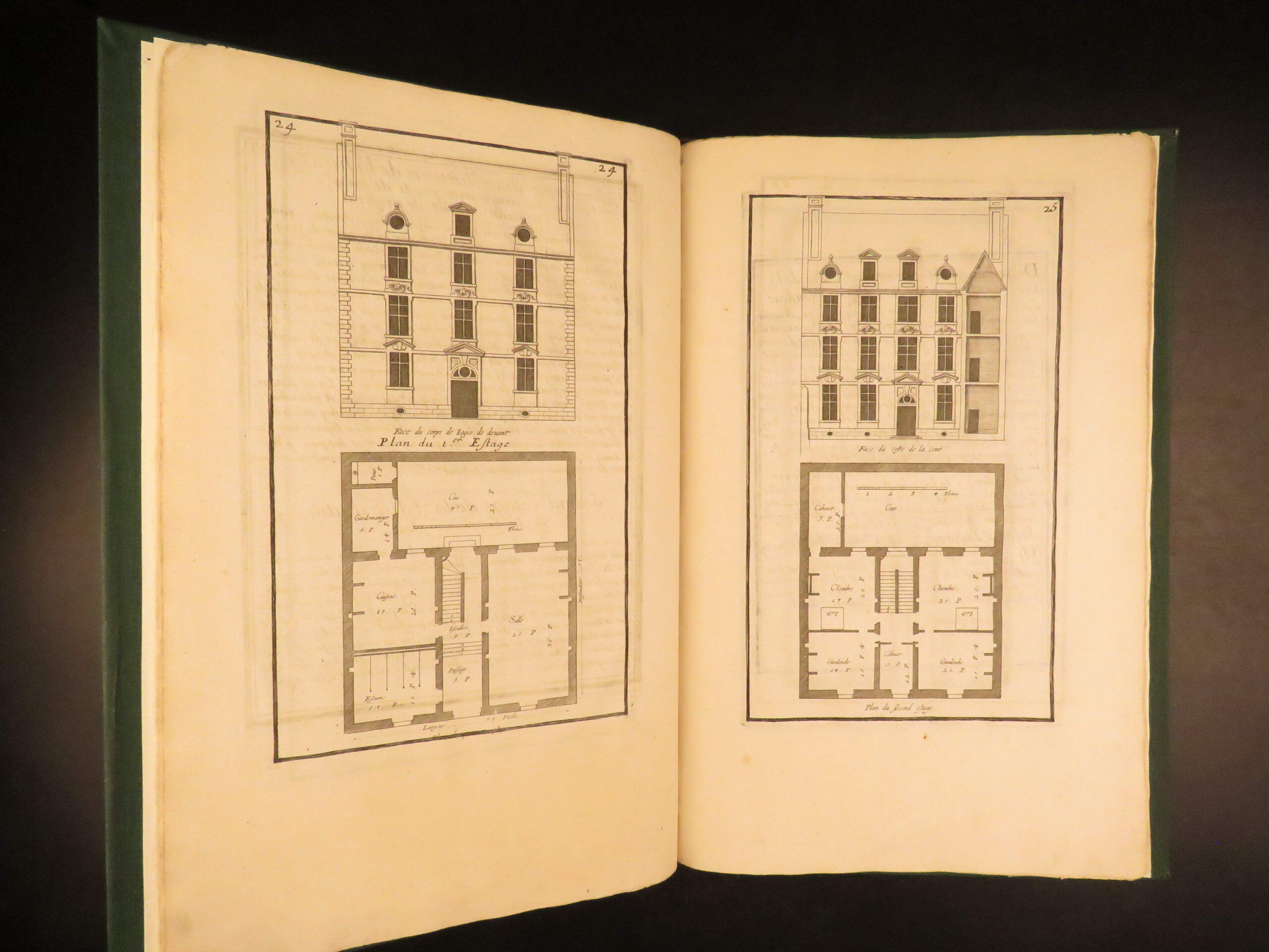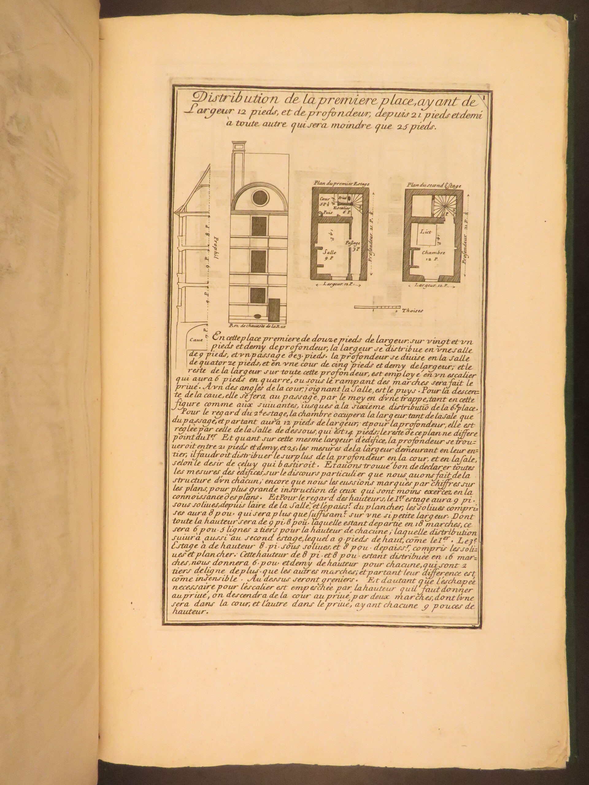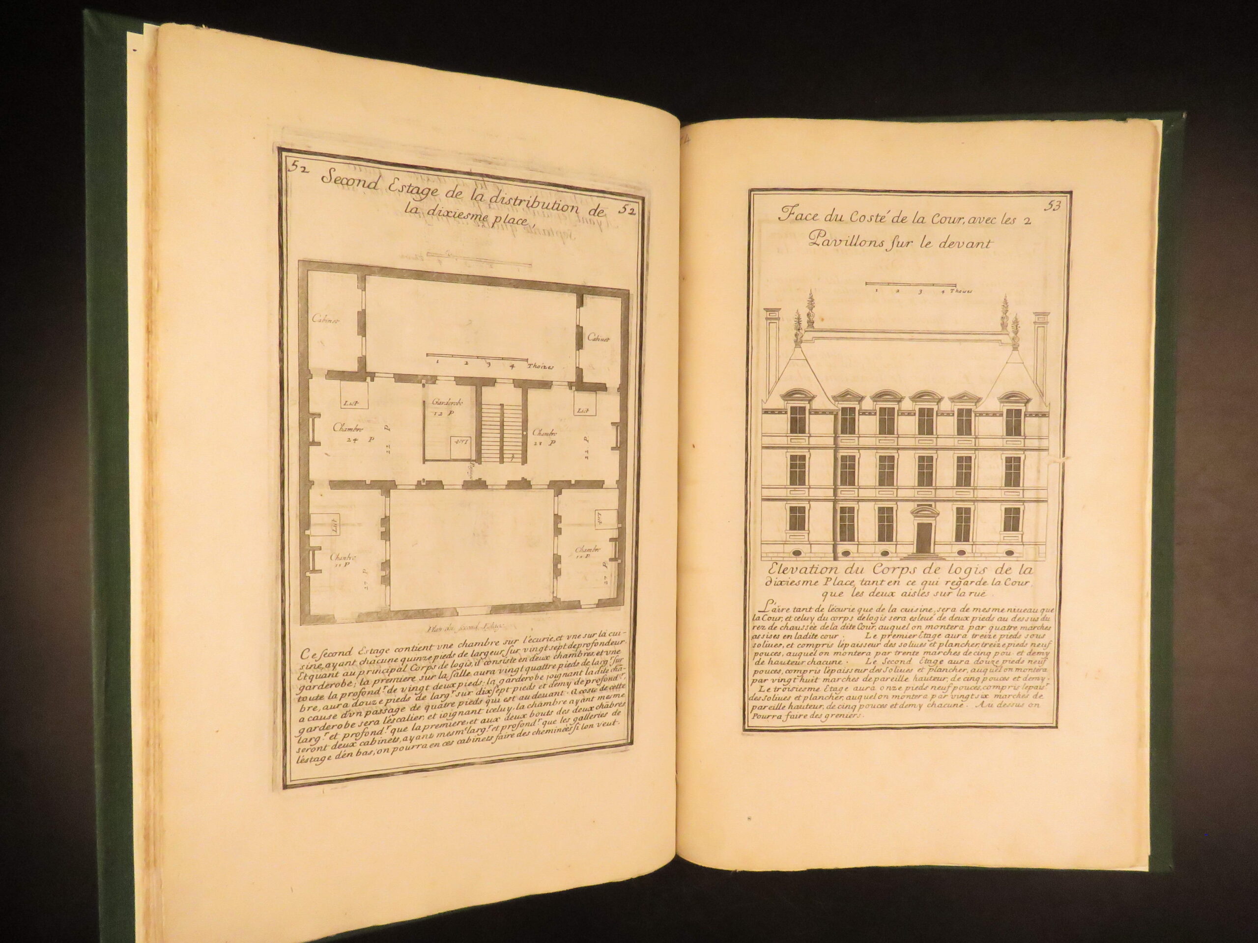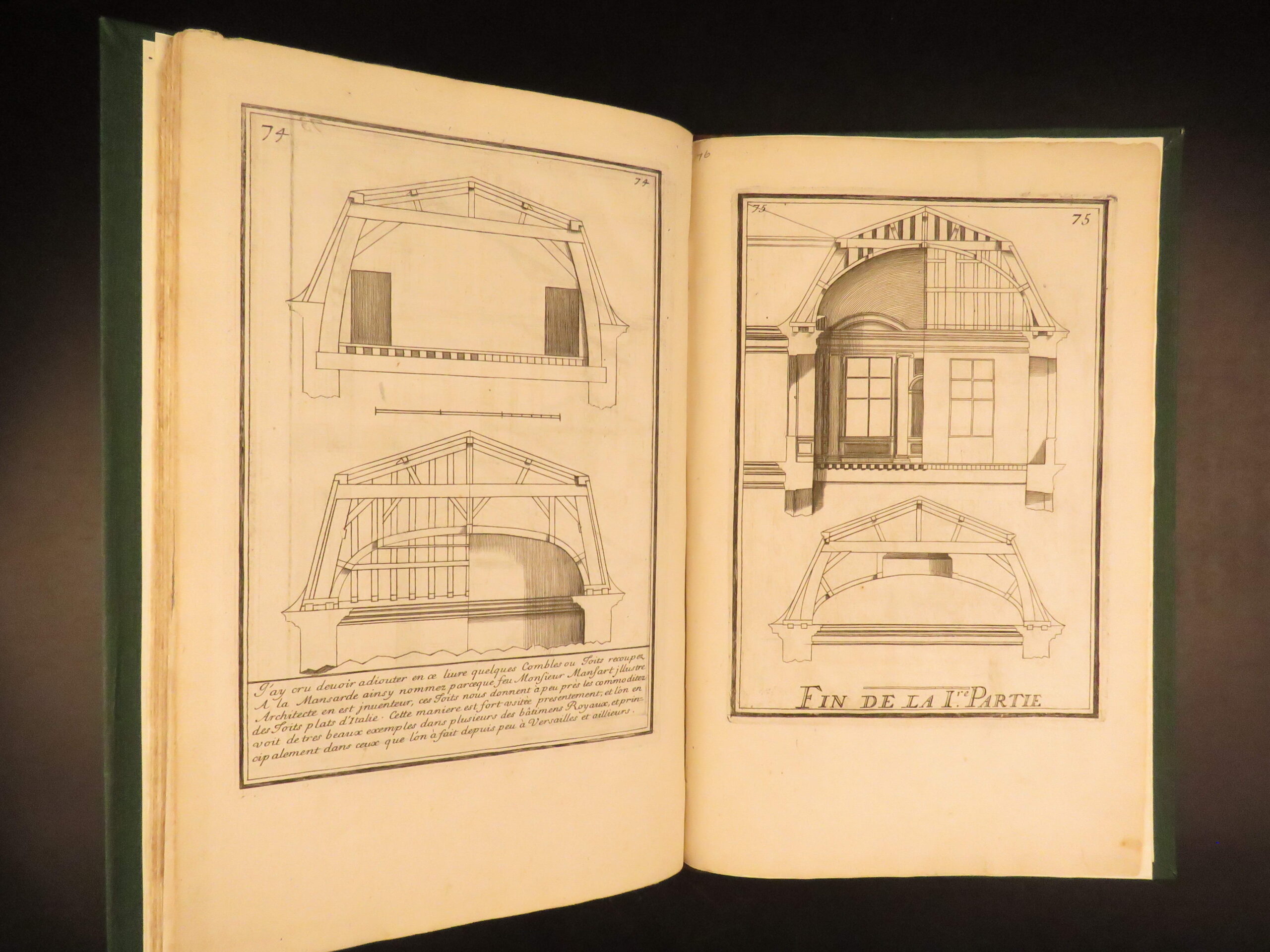 Maniere de Bastir is one of the most famous 17th-century French architectural works. Pierre Le Muet served as the royal architect to King Louis XIII of France and published this work for builders and patrons seeking practical home-building models with a distinct French design. This enlarged second edition wasn’t published until much later, around 1725, but features 75 engraved pages showcasing house facades and floor plans. Each page contains an engraved border, all of which are beautifully bound in a modern leather binding. A truly remarkable work of French architecture describing windows and doors, staircases, and other construction elements.