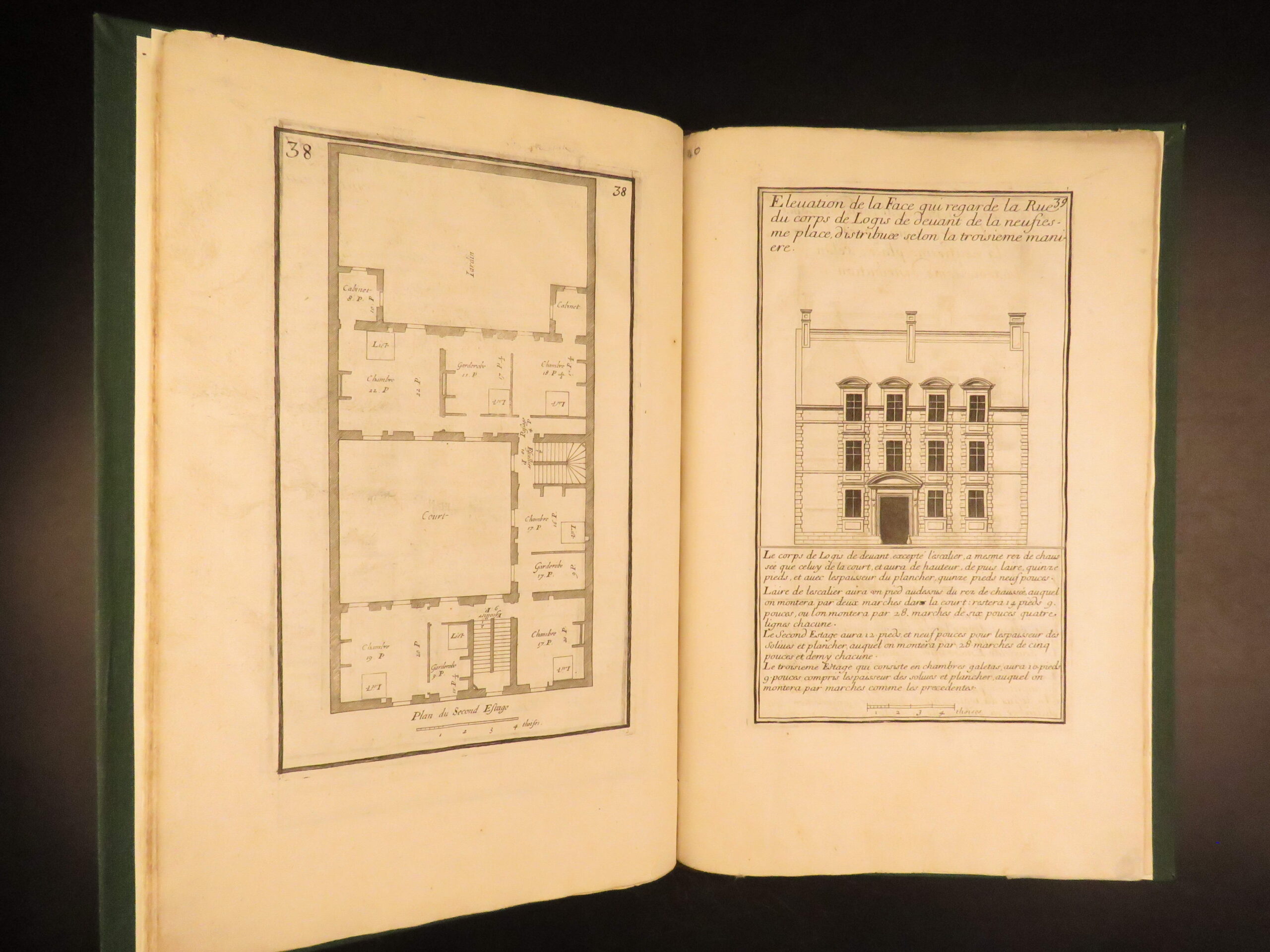 Maniere de Bastir pour Touttes Sortes de Personnes by Pierre Le Muet, circa 1725, features engraved architectural plans, façades, and construction designs from early modern France.