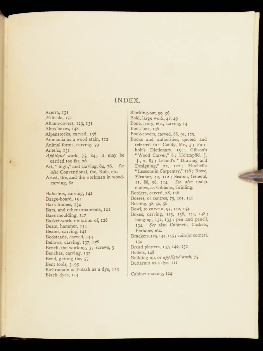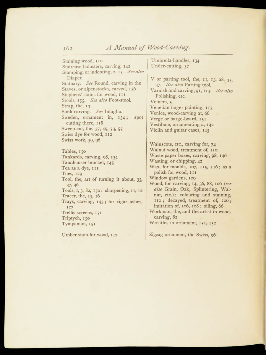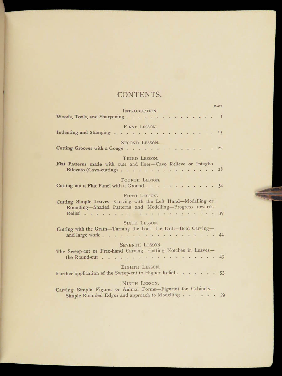 He describes step-by-step instruction for tool care, gouge work, laying grooves, Cavo Relievo patterns with guidance on depth and spacing, notes on cutting flat panels, and even sections on how to carve animals and leaves. Other topics include dying and staining wood and ivory, wood-turning knobs and bars and other furniture fittings, as well as how and when to use a saw for carving.
