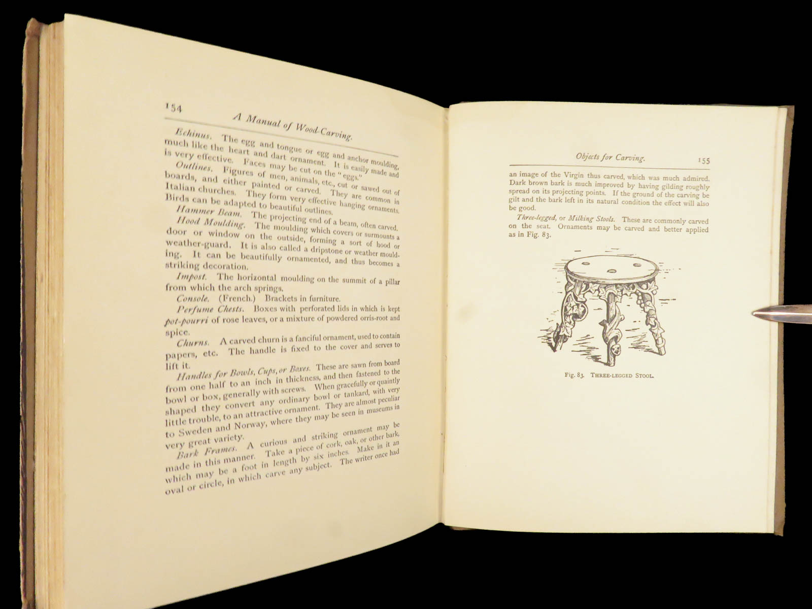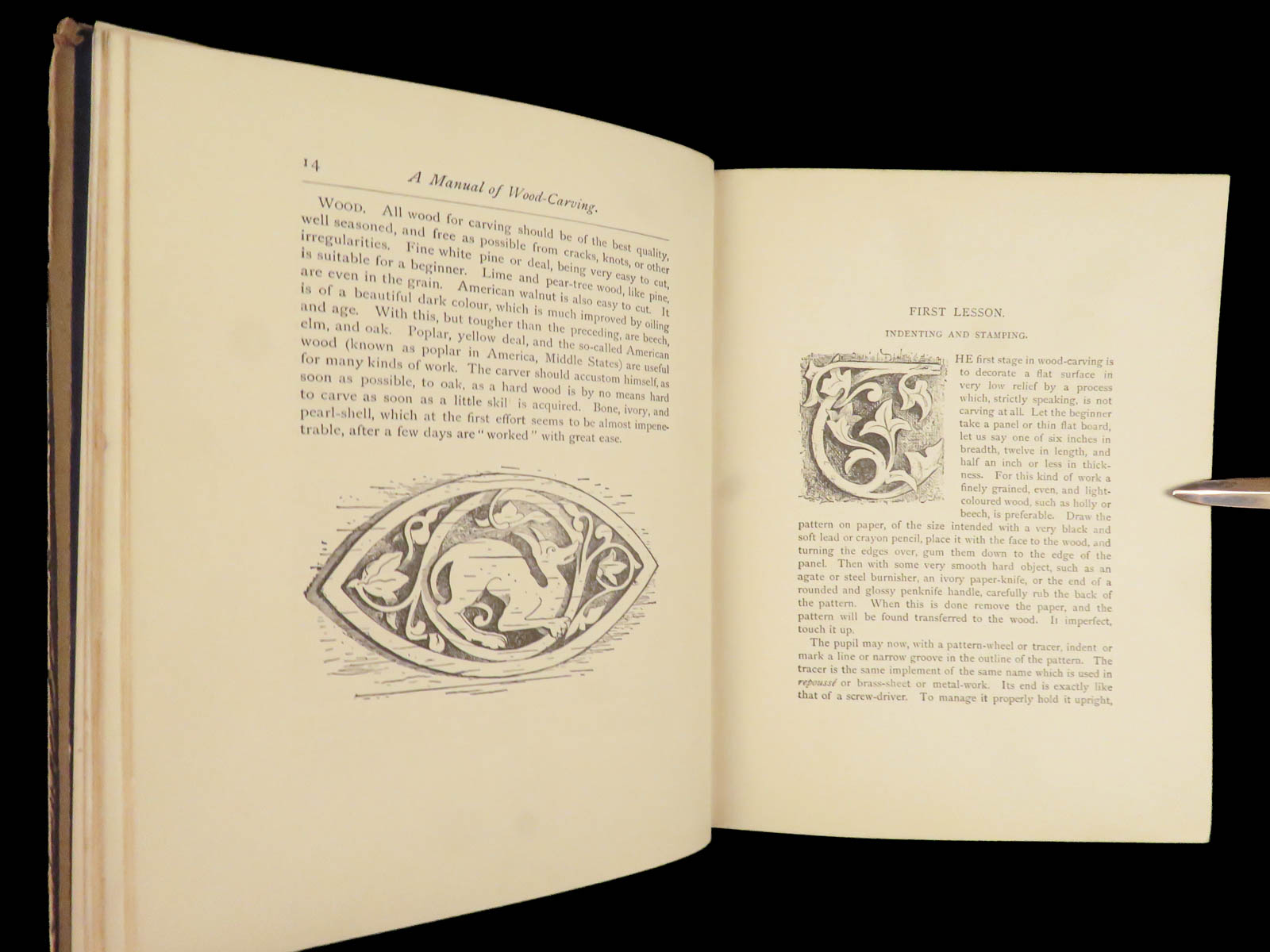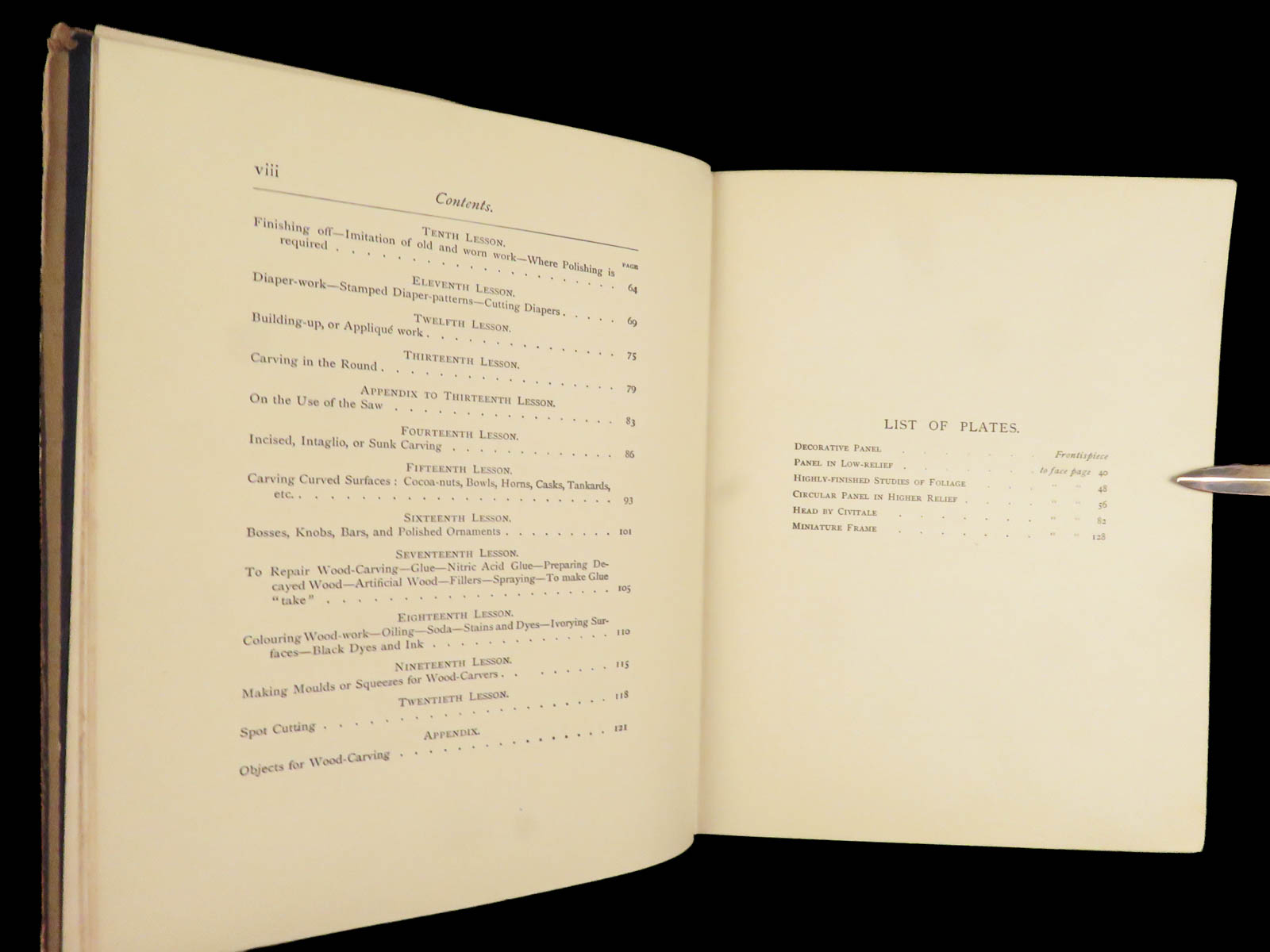 He describes step-by-step instruction for tool care, gouge work, laying grooves, Cavo Relievo patterns with guidance on depth and spacing, notes on cutting flat panels, and even sections on how to carve animals and leaves. Other topics include dying and staining wood and ivory, wood-turning knobs and bars and other furniture fittings, as well as how and when to use a saw for carving.