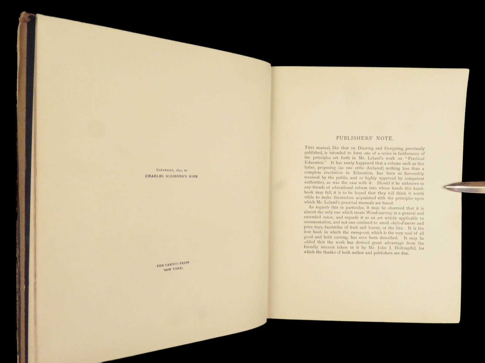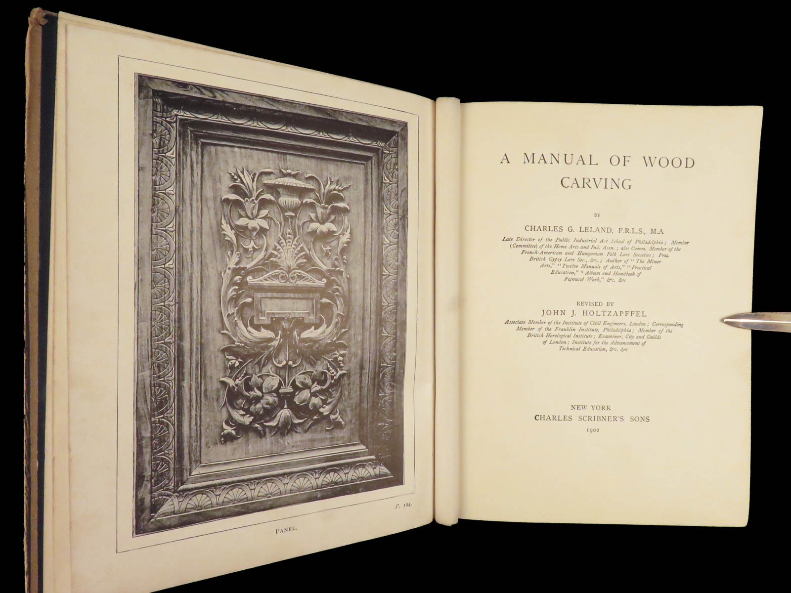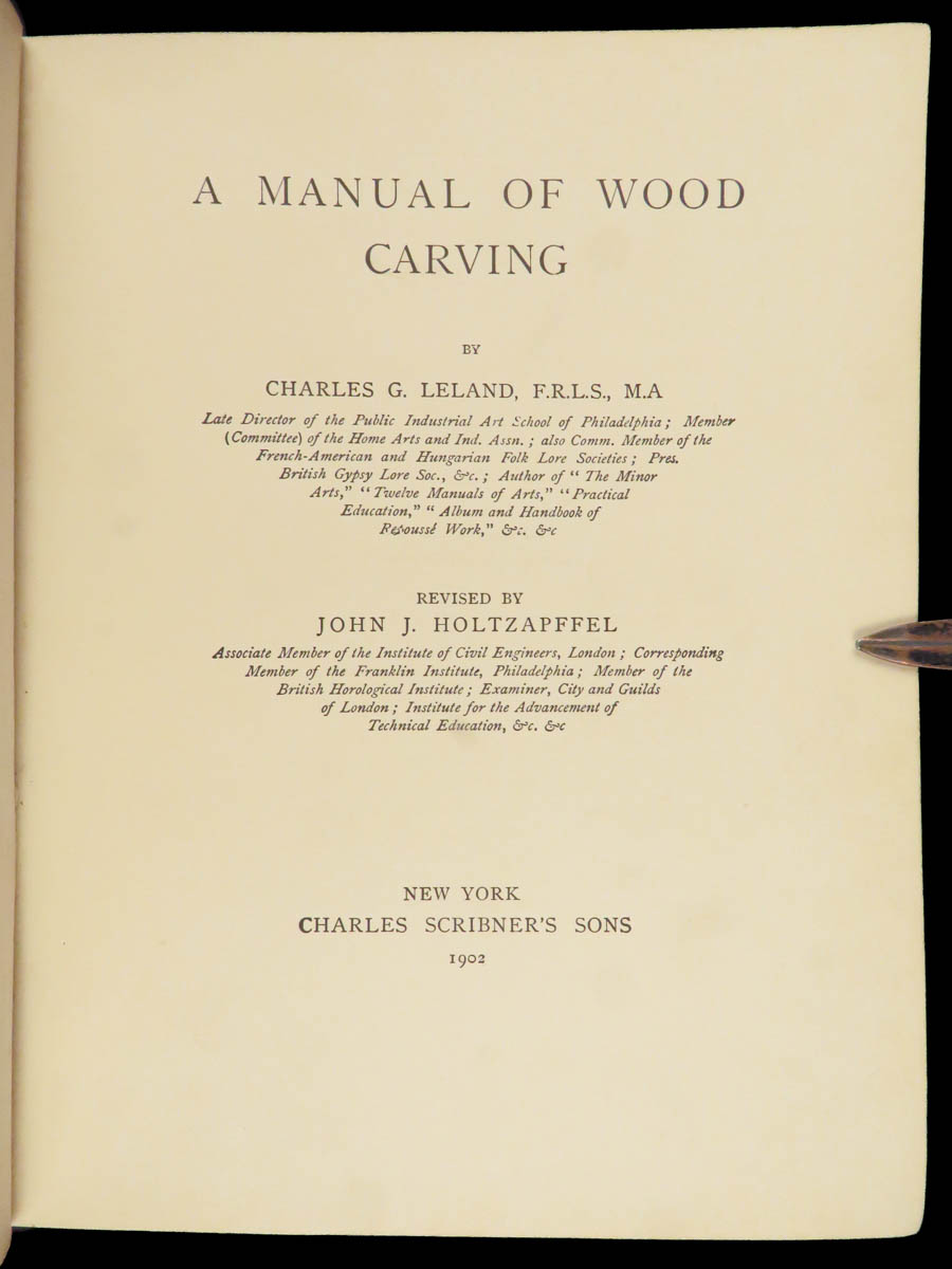 Charles G. Leland’s 1902 Manual of Wood Carving, updated by John J. Holtzapffel, covers tool care, gouge work, Cavo Relievo, leaves, animals, sunk carving, staining, and fittings, with in-text figures and six plates.
