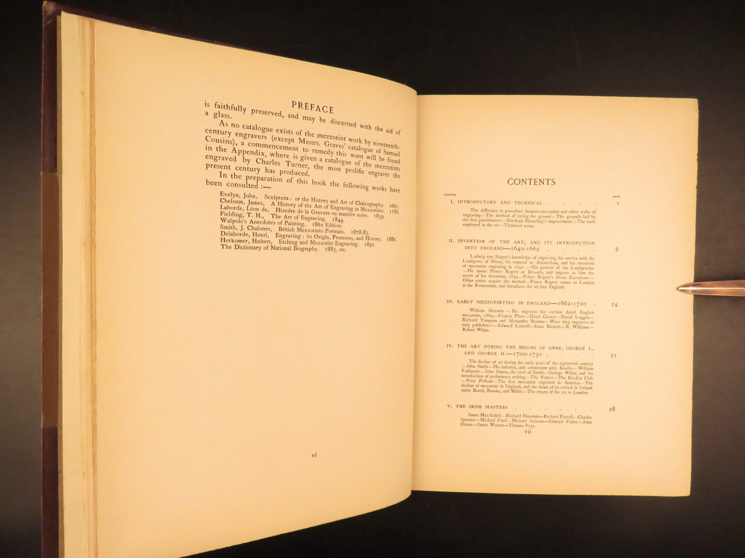 The Masters of Mezzotint; The Men and Their Work by Alfred Whitman is a survey of the development of mezzotint engraving in England and Ireland from its earliest adoption through the 19th-century. This limited print run edition discusses early engravers such as William Sherwin and Francis Place, followed by chapters on art production during the reigns of Queen Anne, George I, and George II. It is the 60 plates throughout this book that make it so desirable.